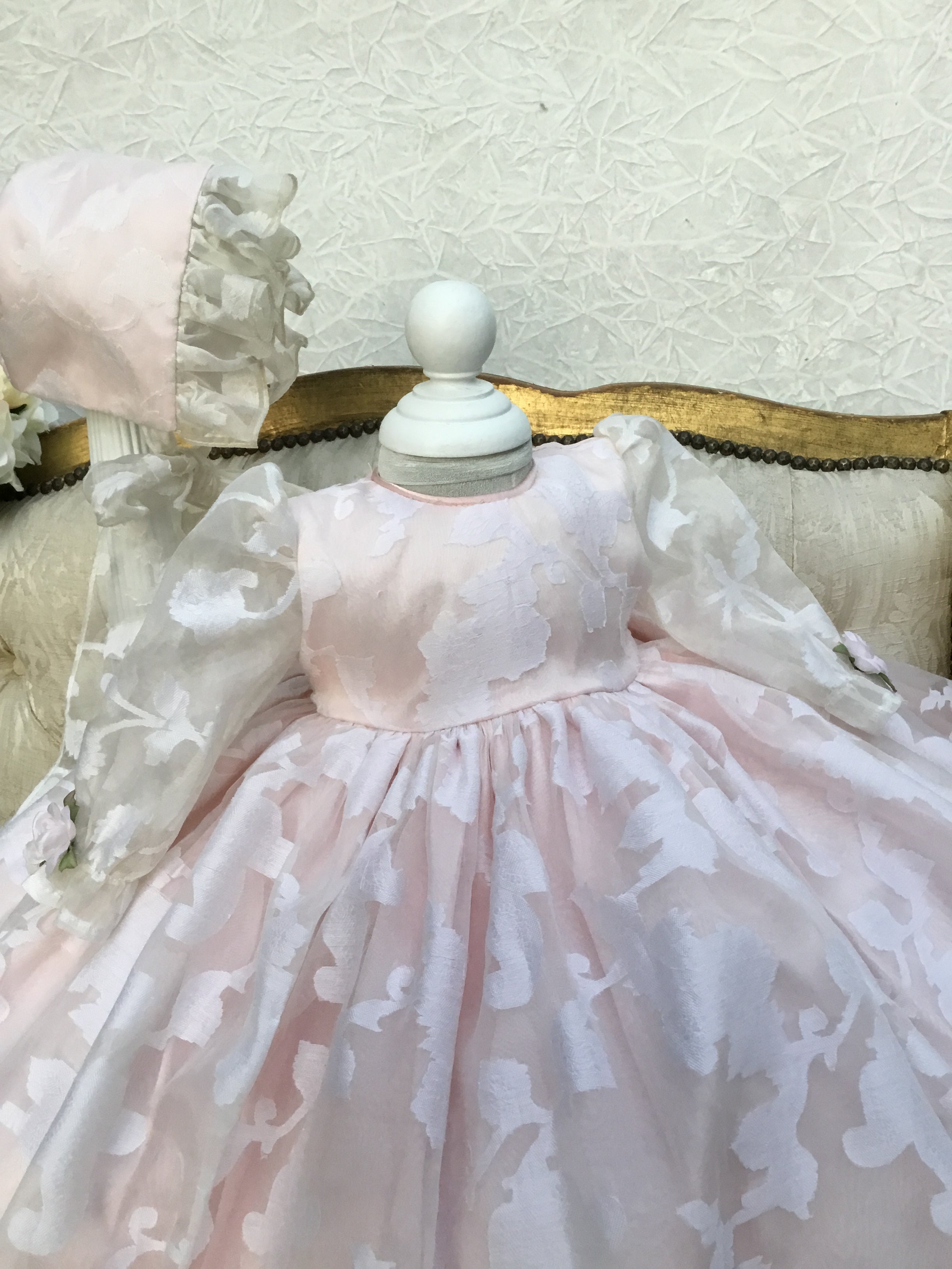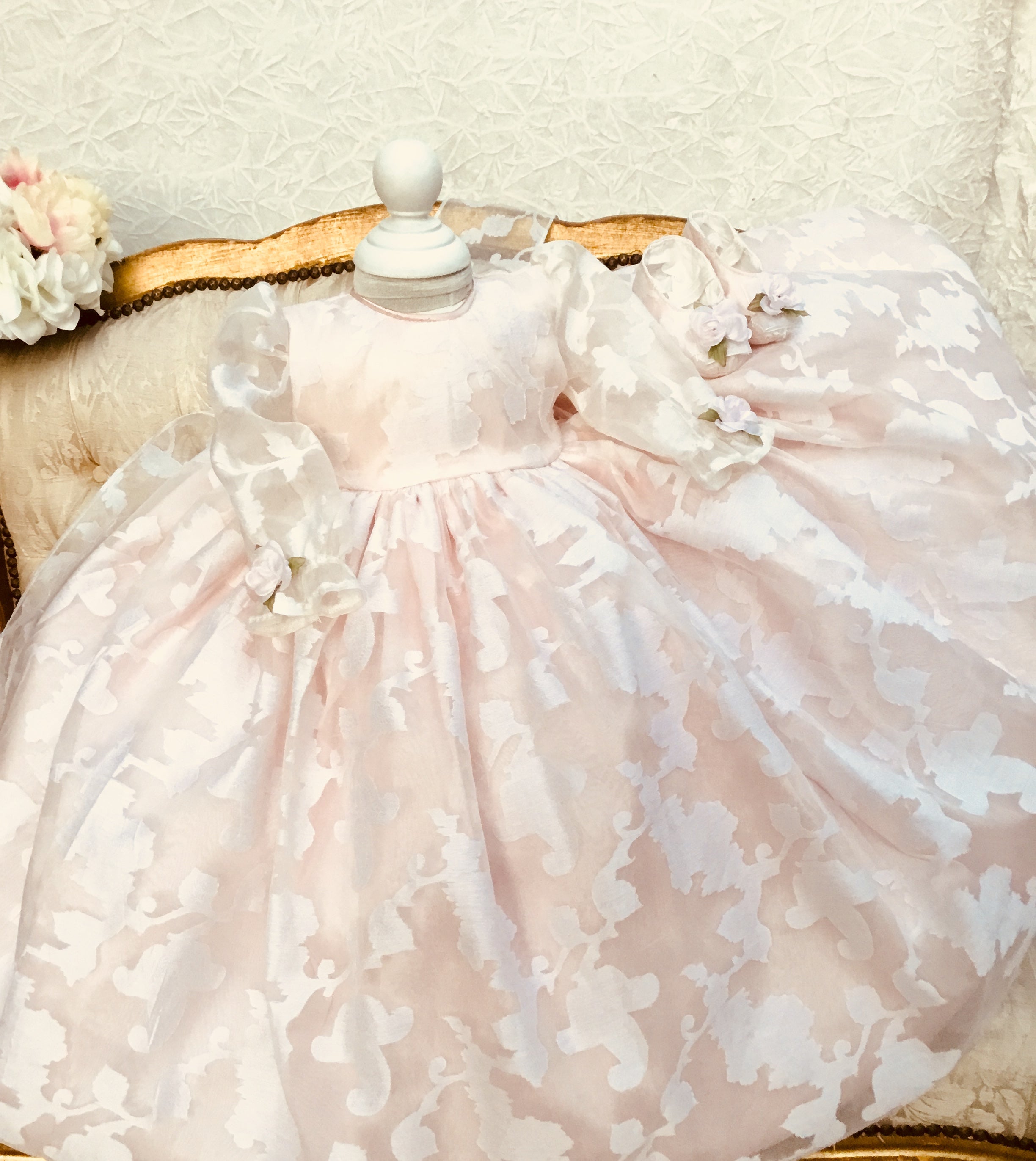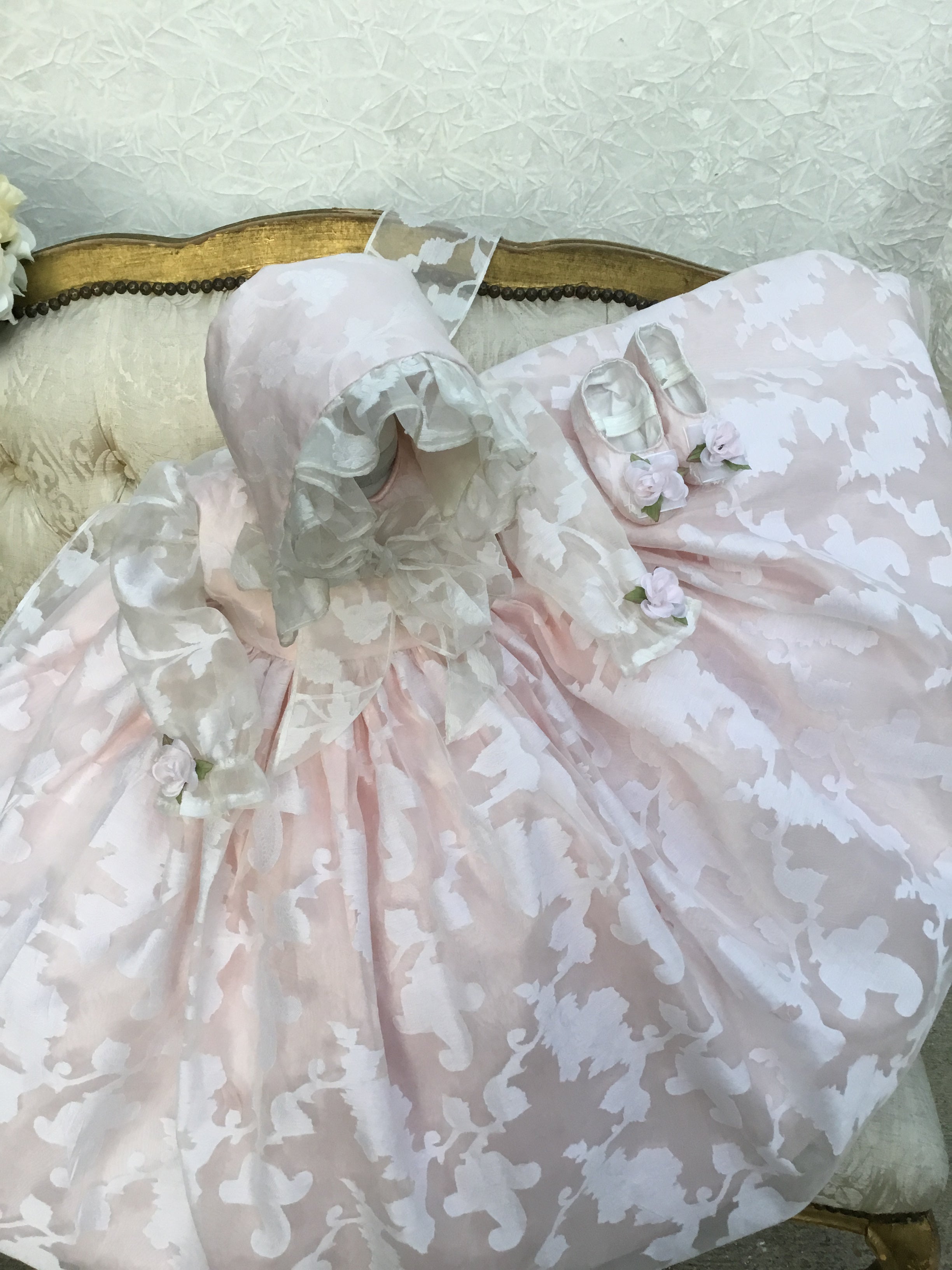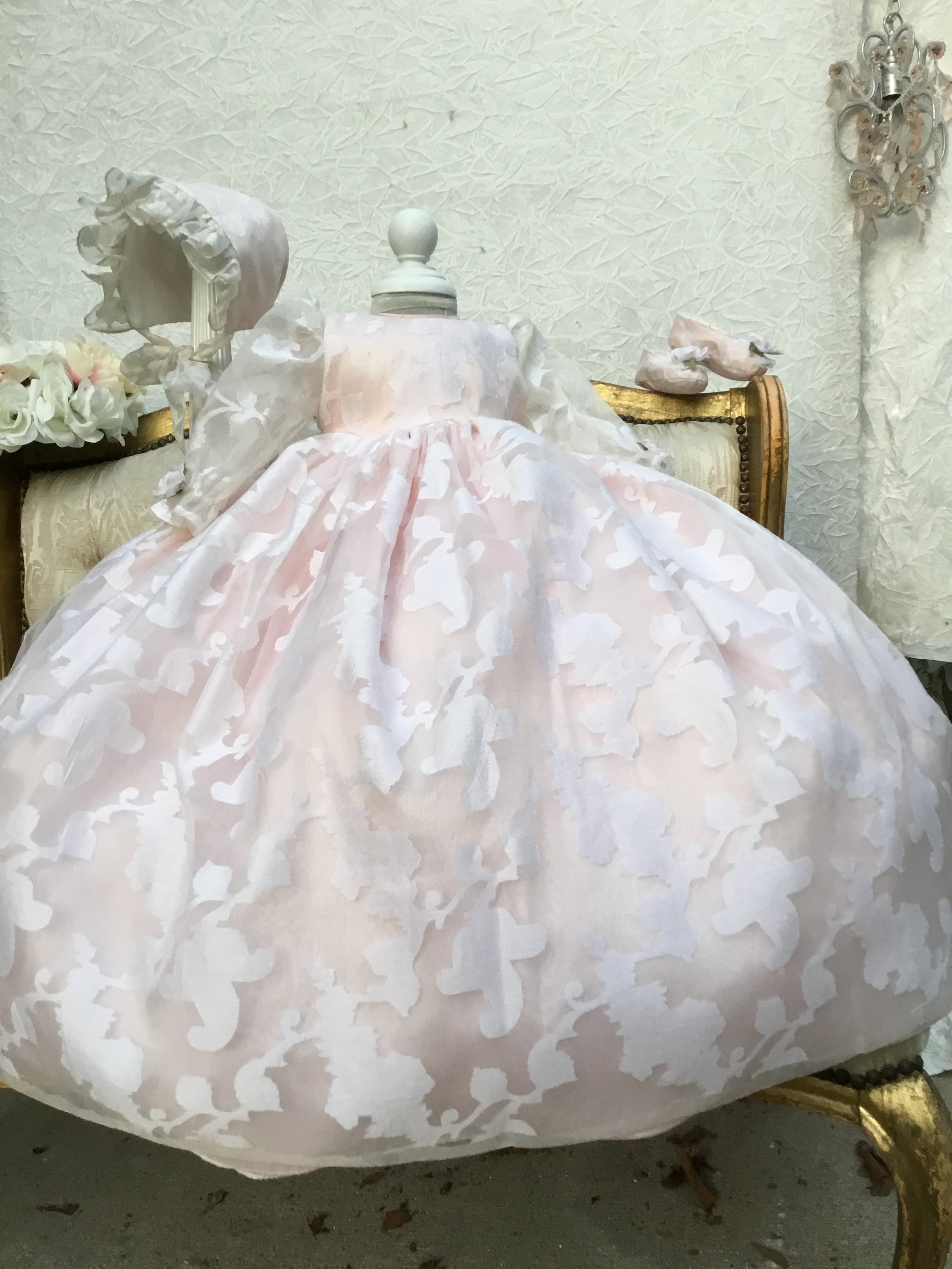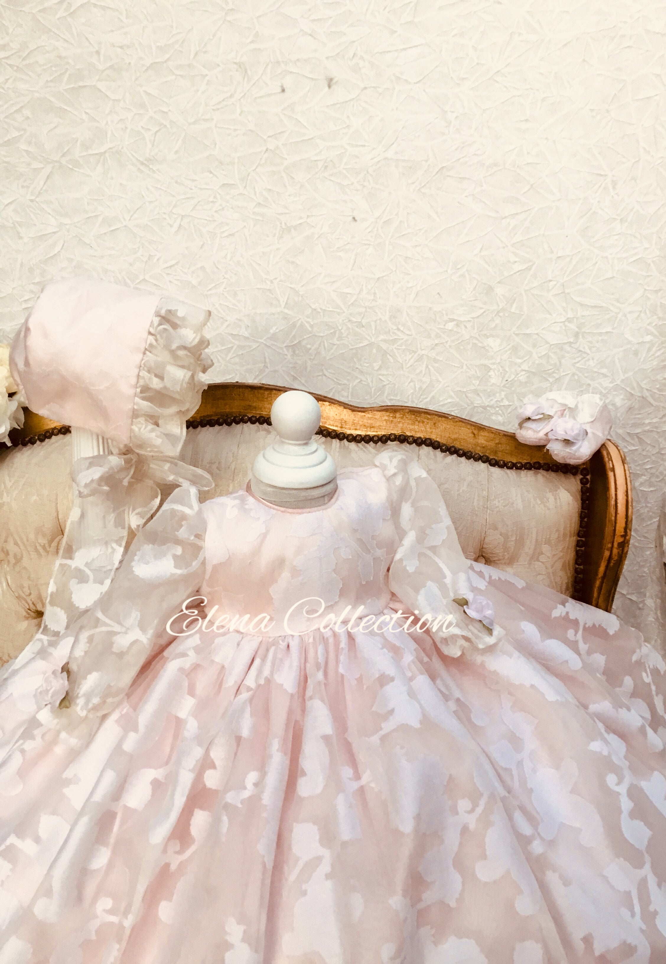 Eleanor Baptism Gown is a luxurious silk organza heirloom piece designed for lasting memories. It features a voluminous silhouette with delicate floral jacquard and romantic puff sleeves. The gown comes with a matching ruffled bonnet and soft shoes for a complete ceremonial look, with an open-back closure for easy dressing. A short-sleeve option is available upon request. Fully lined for baby’s comfort, this made-to-order gown is crafted with exquisite fabrics: - Vintage silk embroidery damask organza - Floral jacquard patterns - Antique white lining (optional) Handcrafted with timeless detail and elegance.
