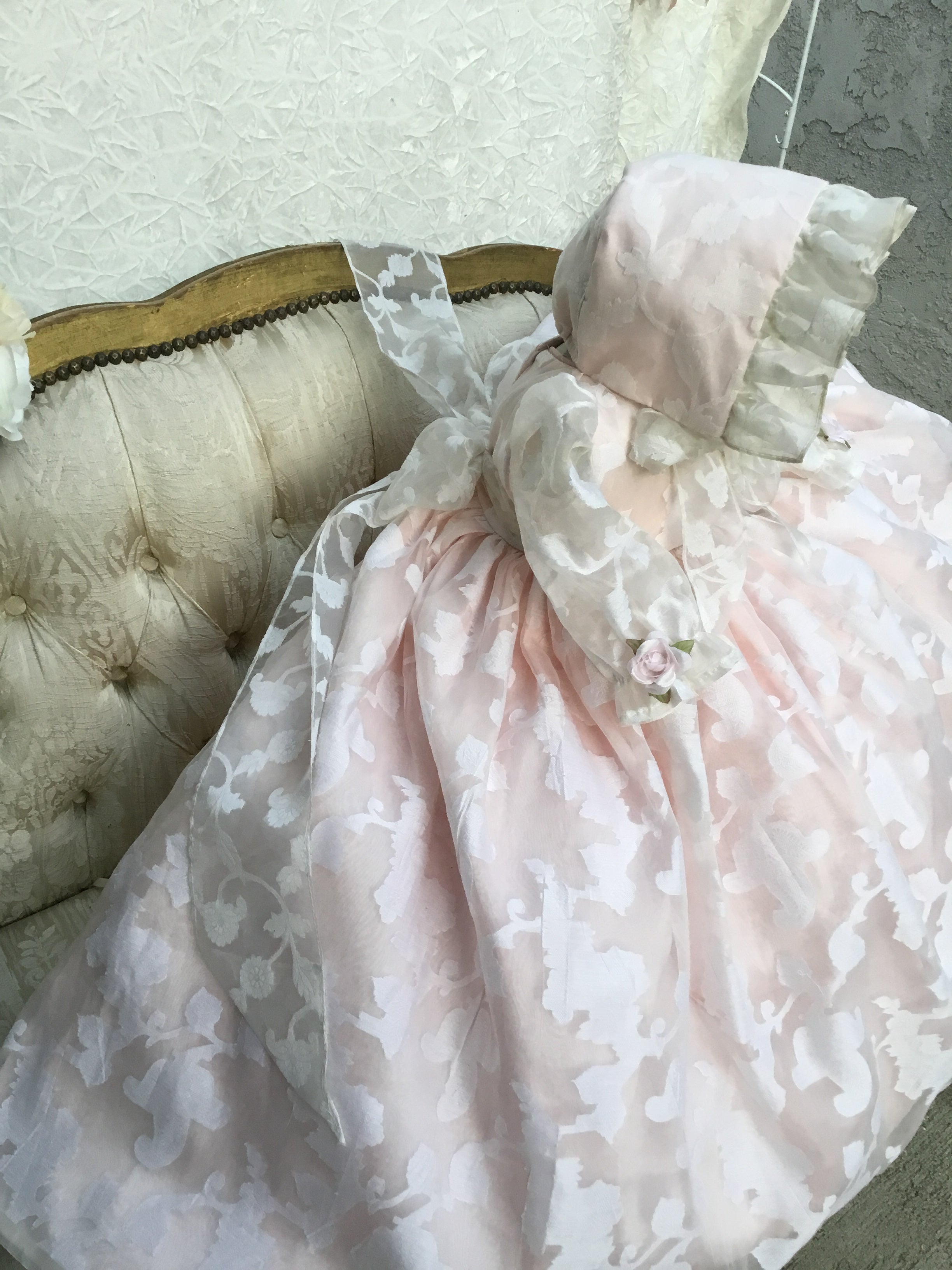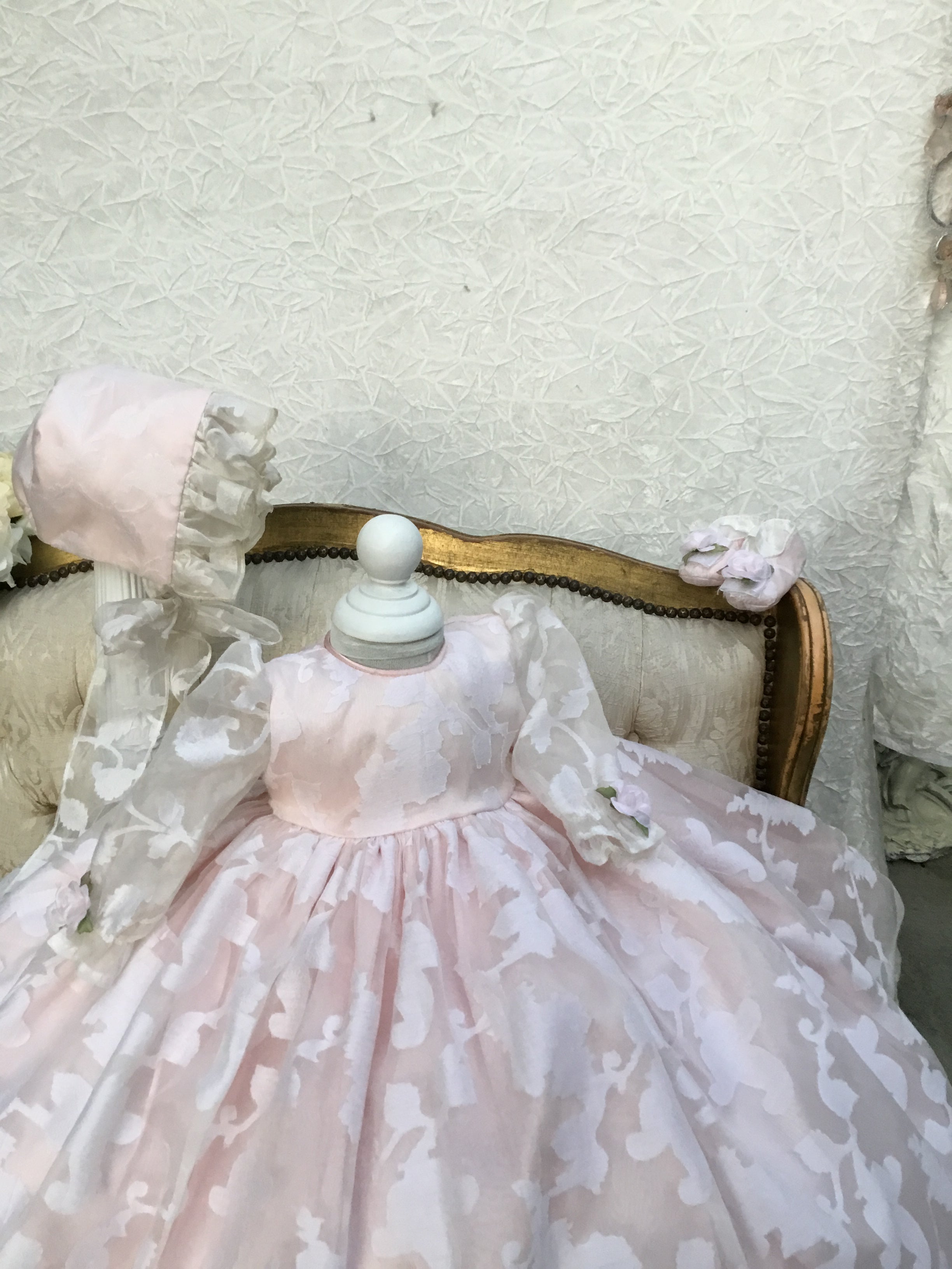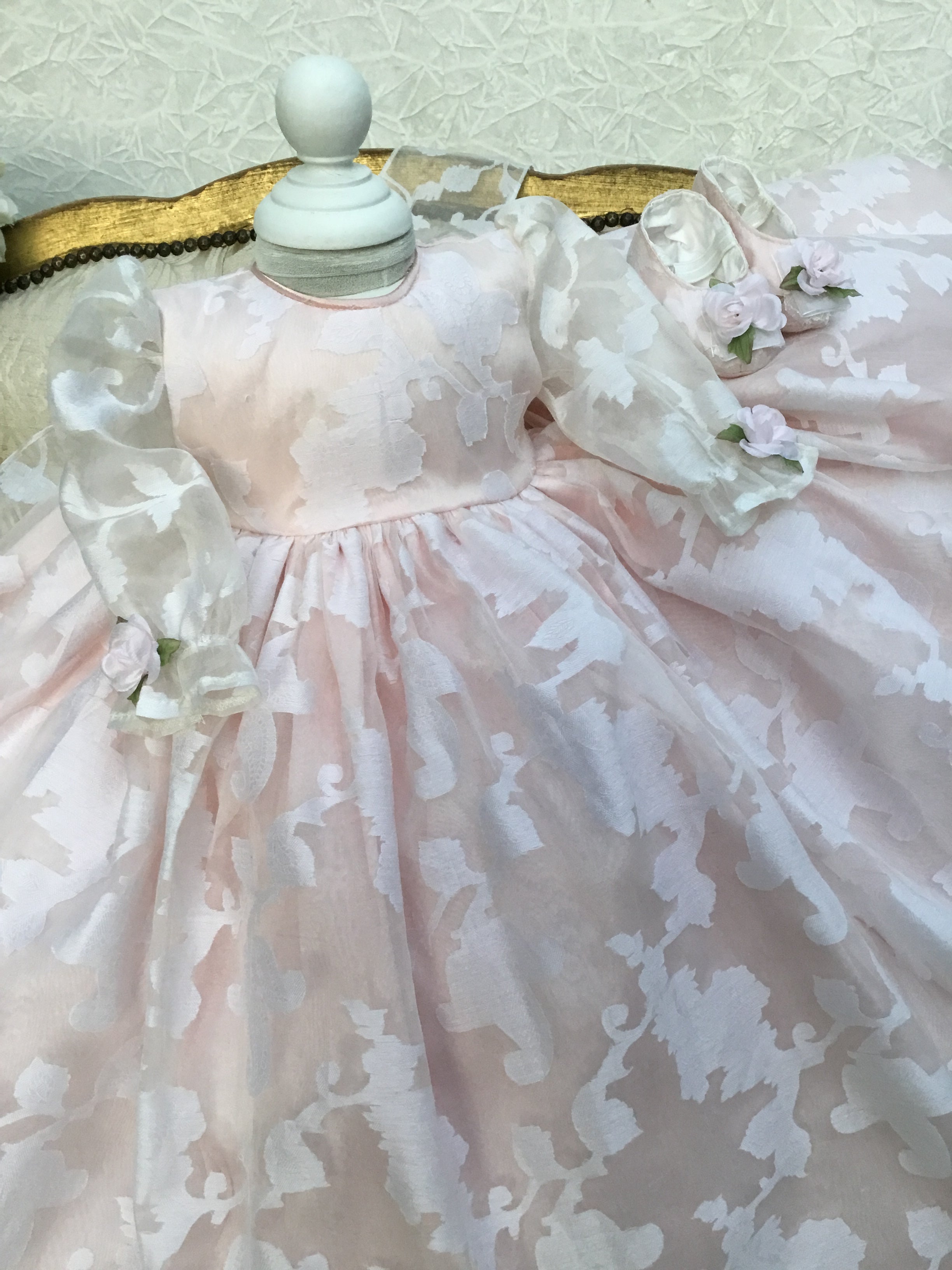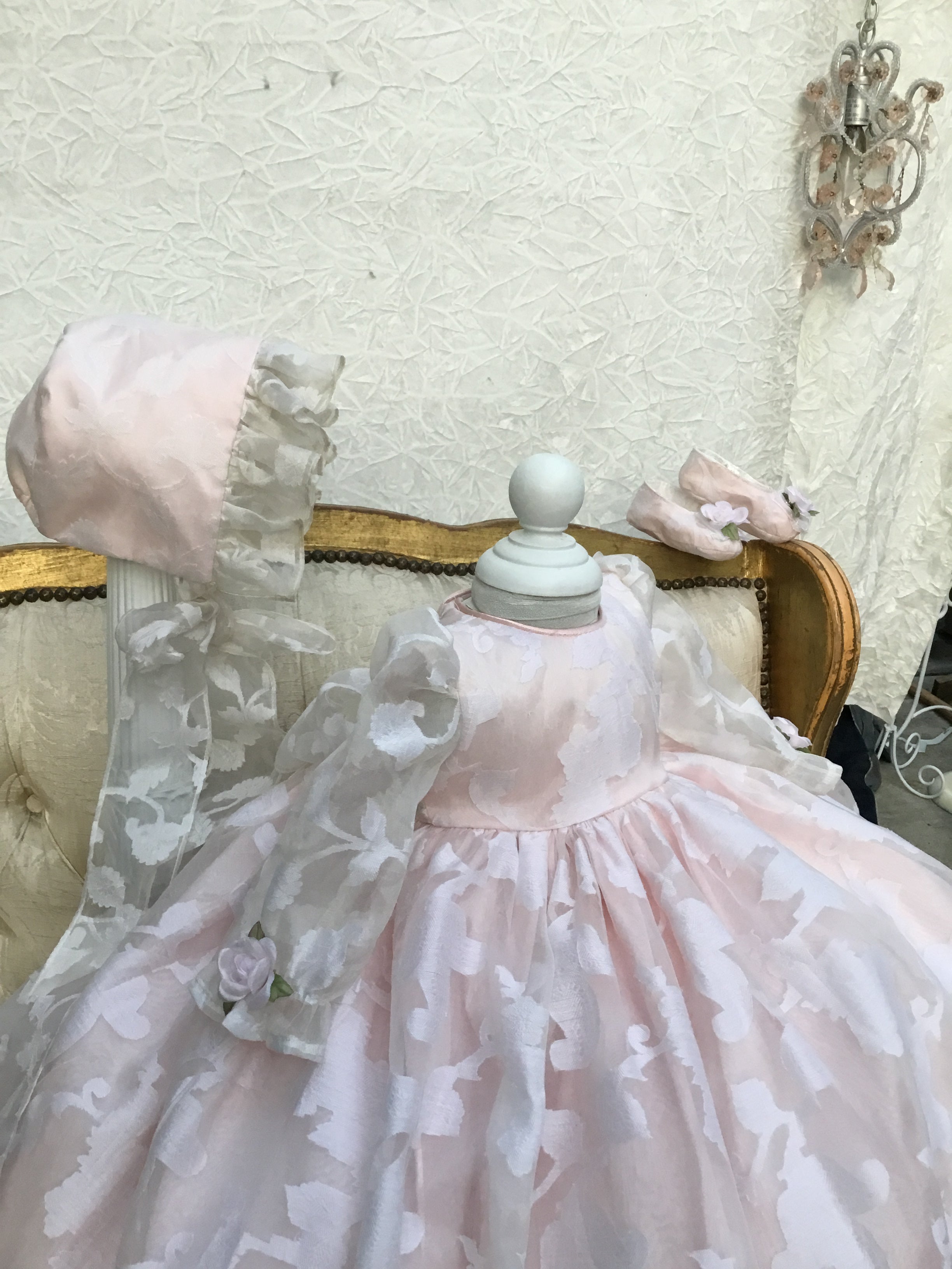 Eleanor Baptism Gown is a luxurious silk organza heirloom piece designed for lasting memories. It features a voluminous silhouette with delicate floral jacquard and romantic puff sleeves. The gown comes with a matching ruffled bonnet and soft shoes for a complete ceremonial look, with an open-back closure for easy dressing. A short-sleeve option is available upon request. Fully lined for baby’s comfort, this made-to-order gown is crafted with exquisite fabrics: - Vintage silk embroidery damask organza - Floral jacquard patterns - Antique white lining (optional) Handcrafted with timeless detail and elegance.