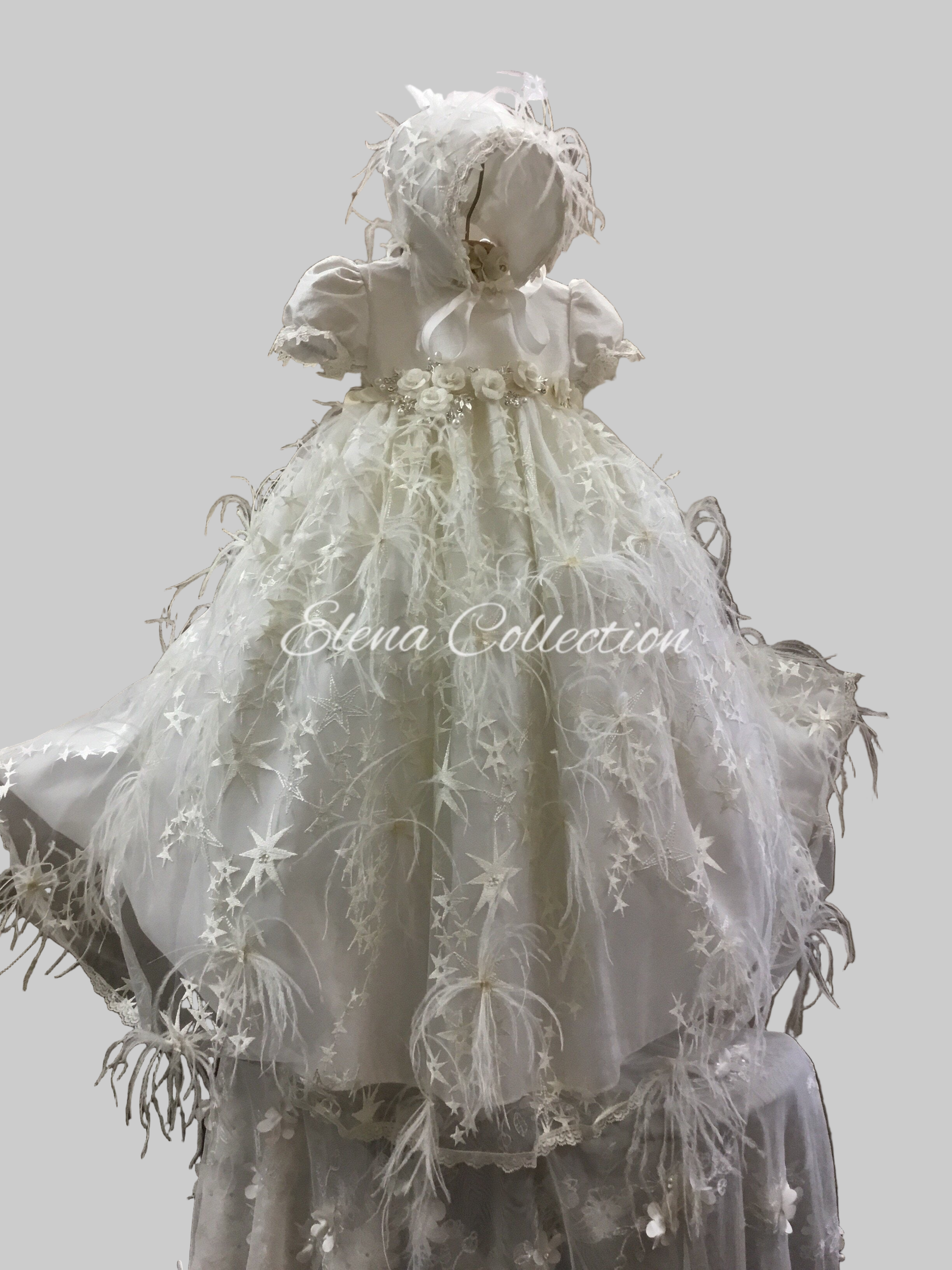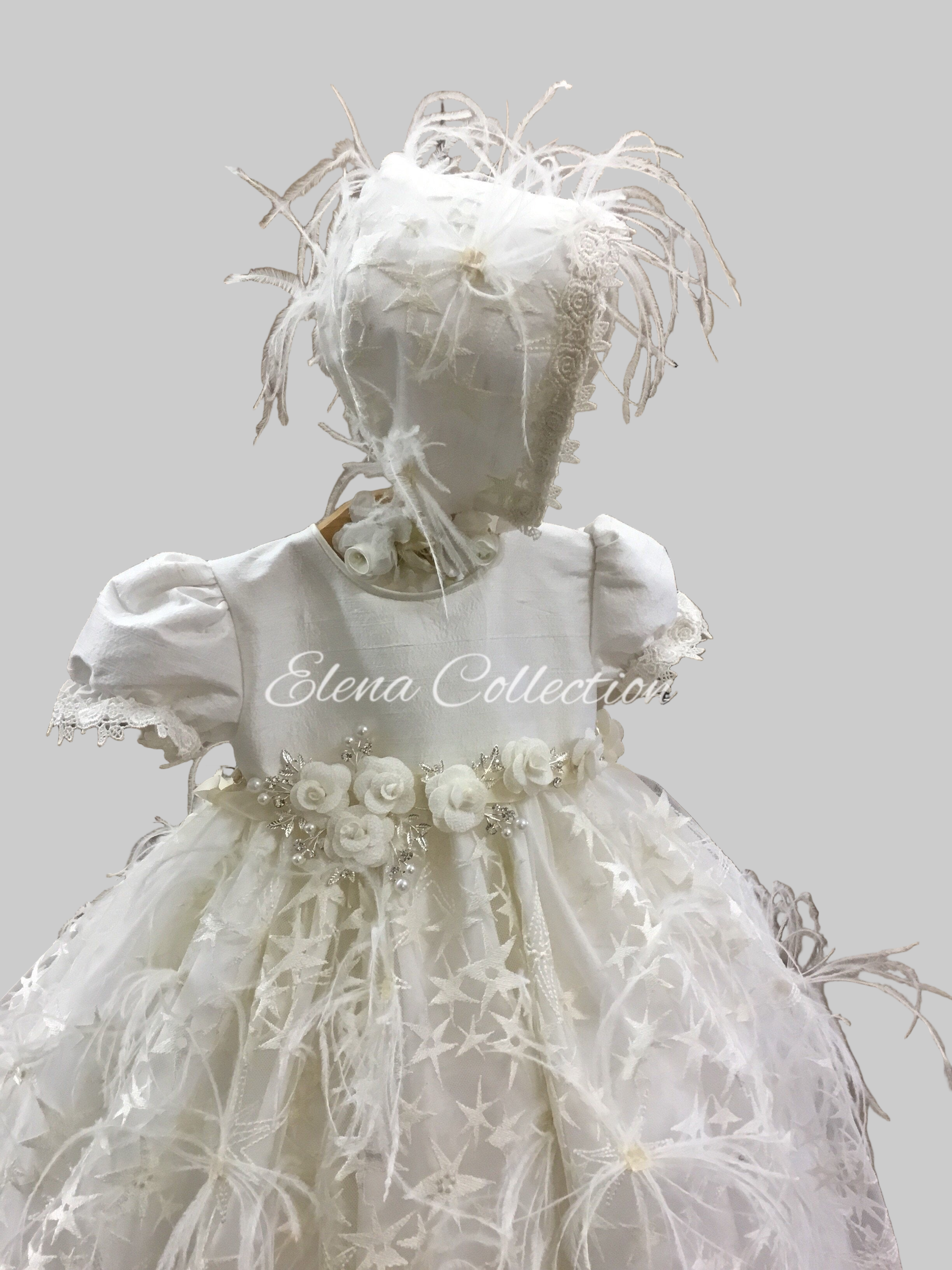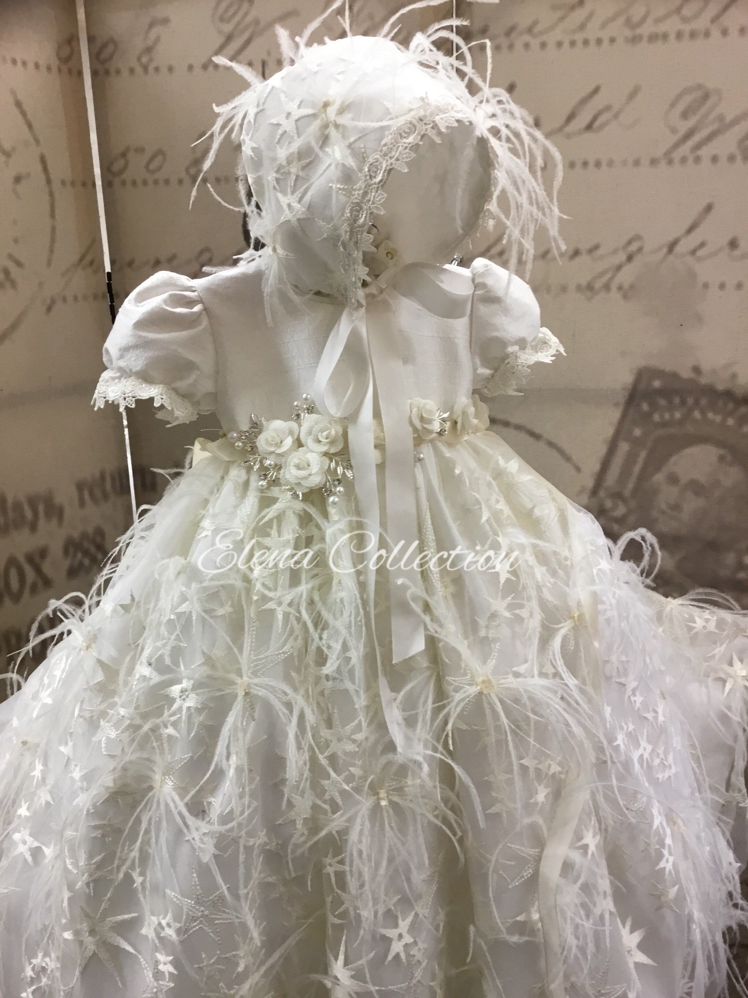 This luxurious Feather Christening Gown and Silk bodice with bonnet features delicate embroidery mesh and a full lining with an attached petticoat for added volume.