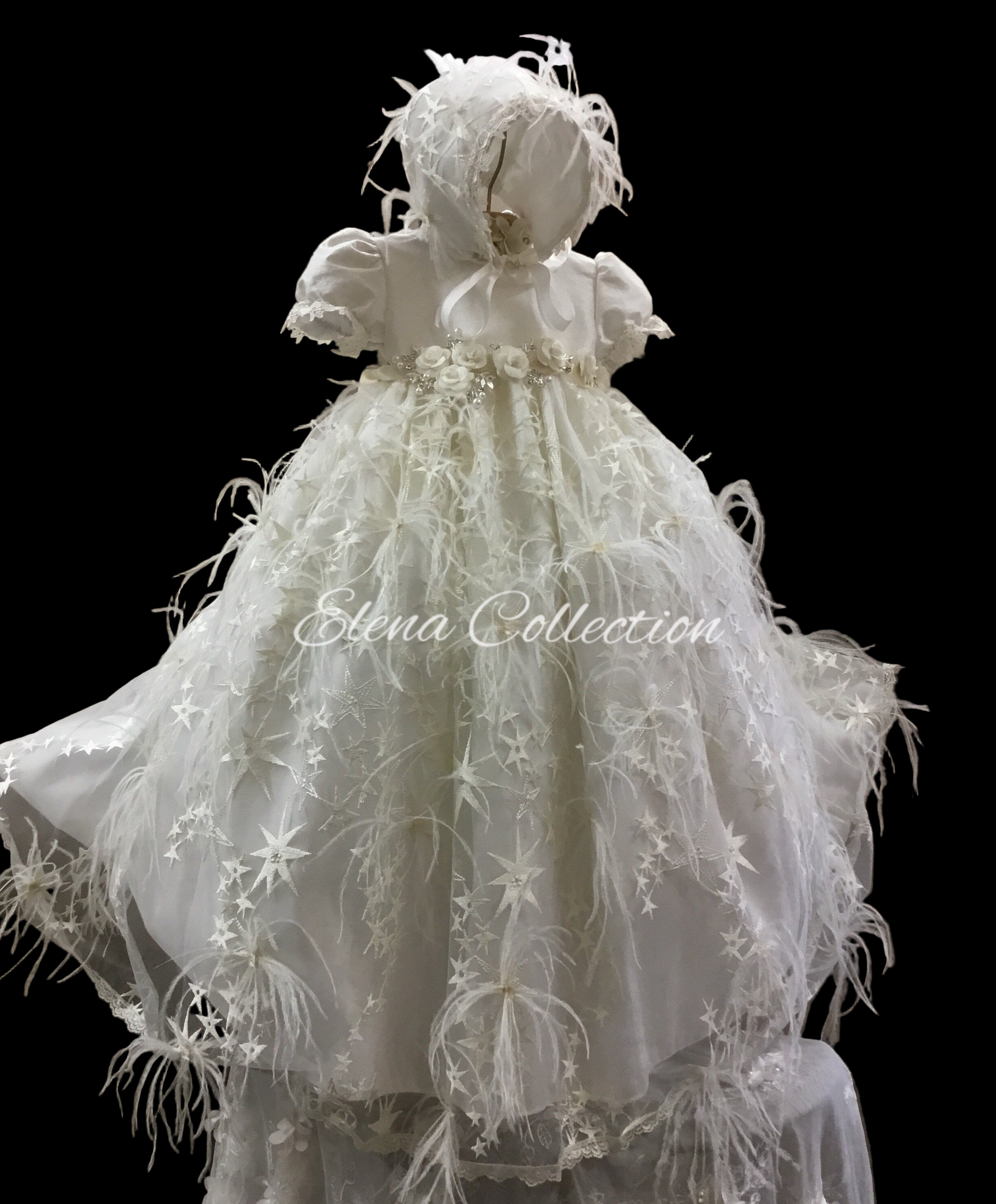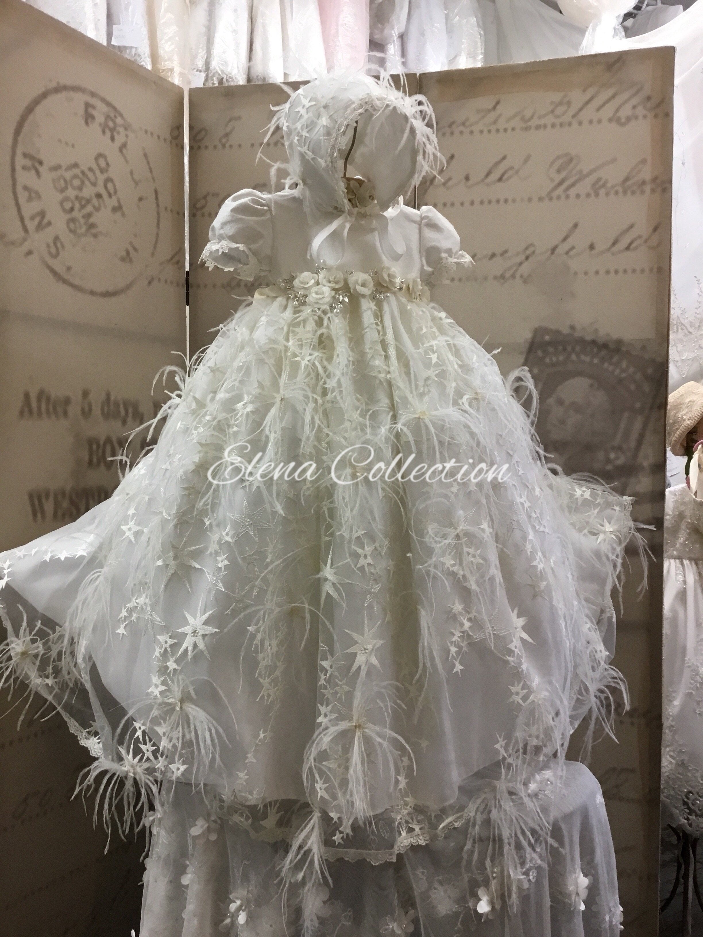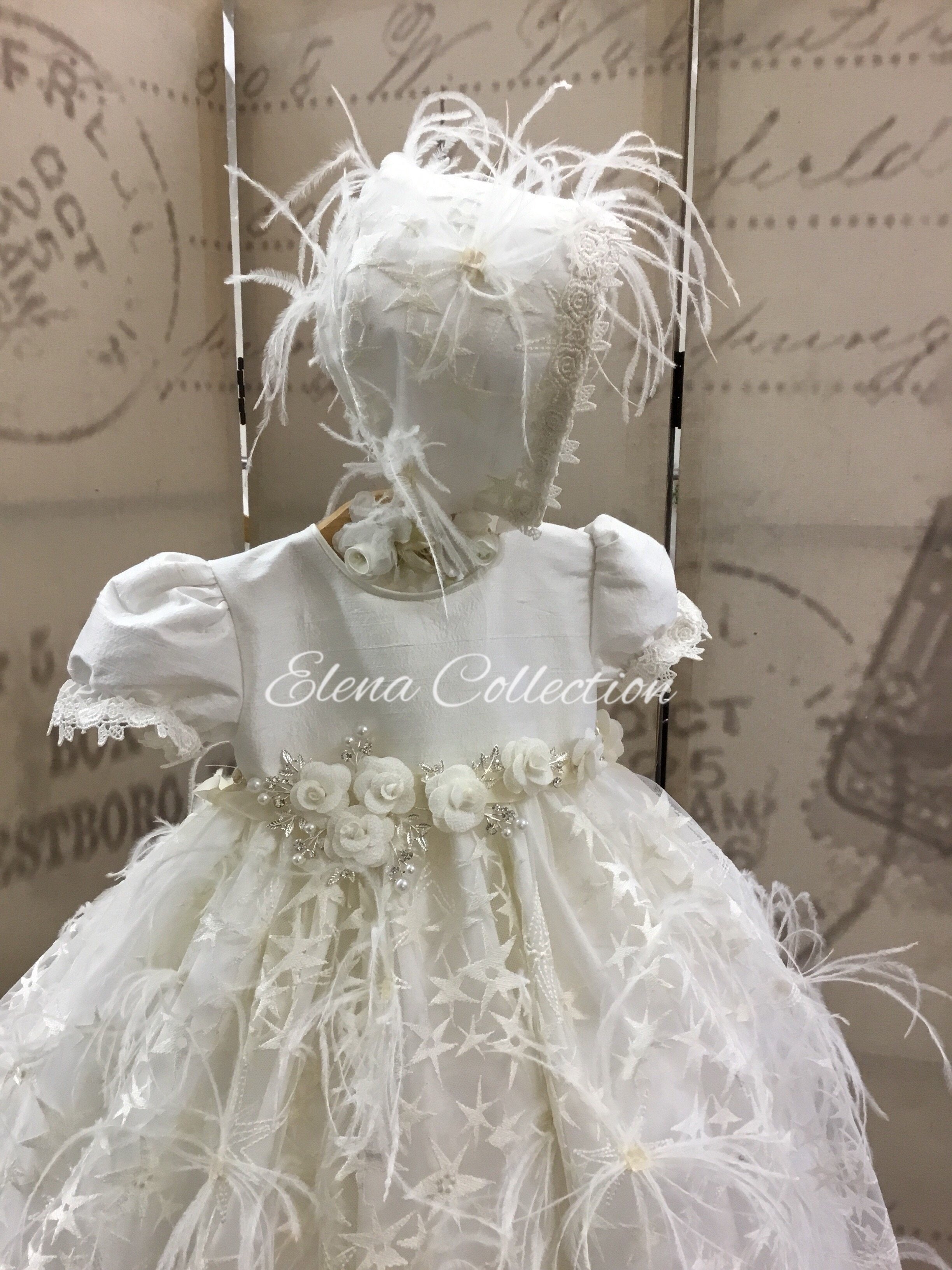 This luxurious Feather Christening Gown and Silk bodice with bonnet features delicate embroidery mesh and a full lining with an attached petticoat for added volume.