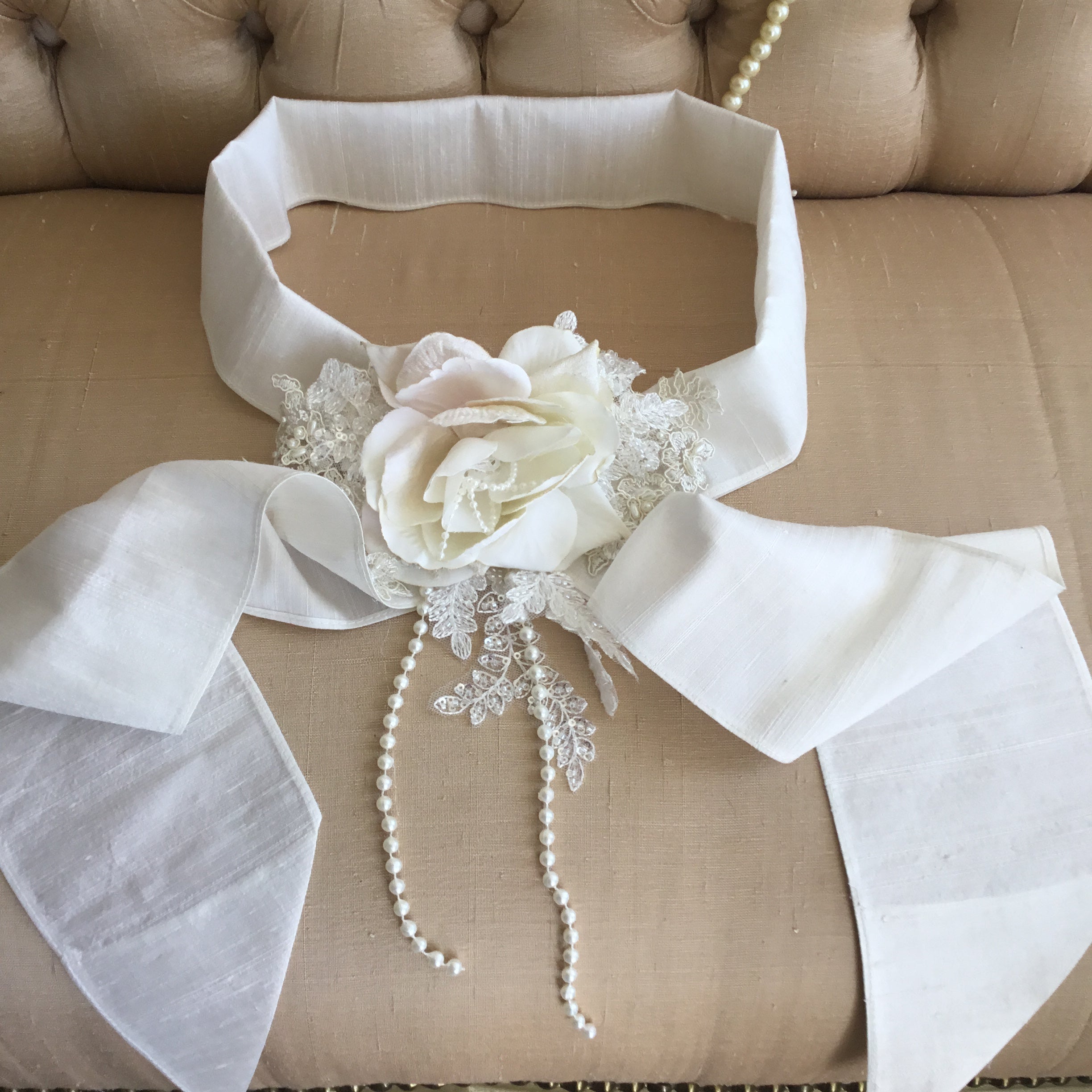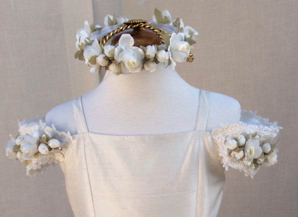 This beautiful handmade first communion dress is perfect for flower girls, comuniones, birthdays, or any special occasion. Hand made flower accessories adorn the waist and shoulders zipper closure and a tie back silk bow, gathered lace overlay on the back of the dress show the fine detailing that has gone into this special event dress. Attached crinoline for fullness like couture gown.