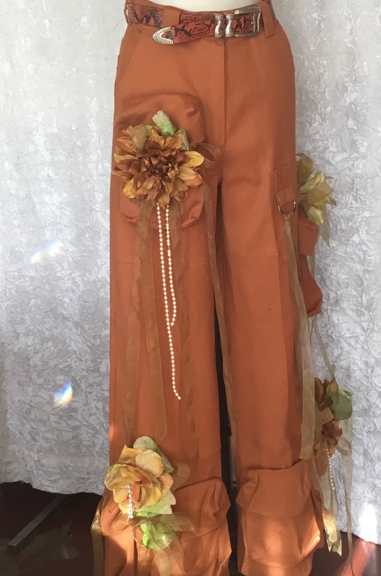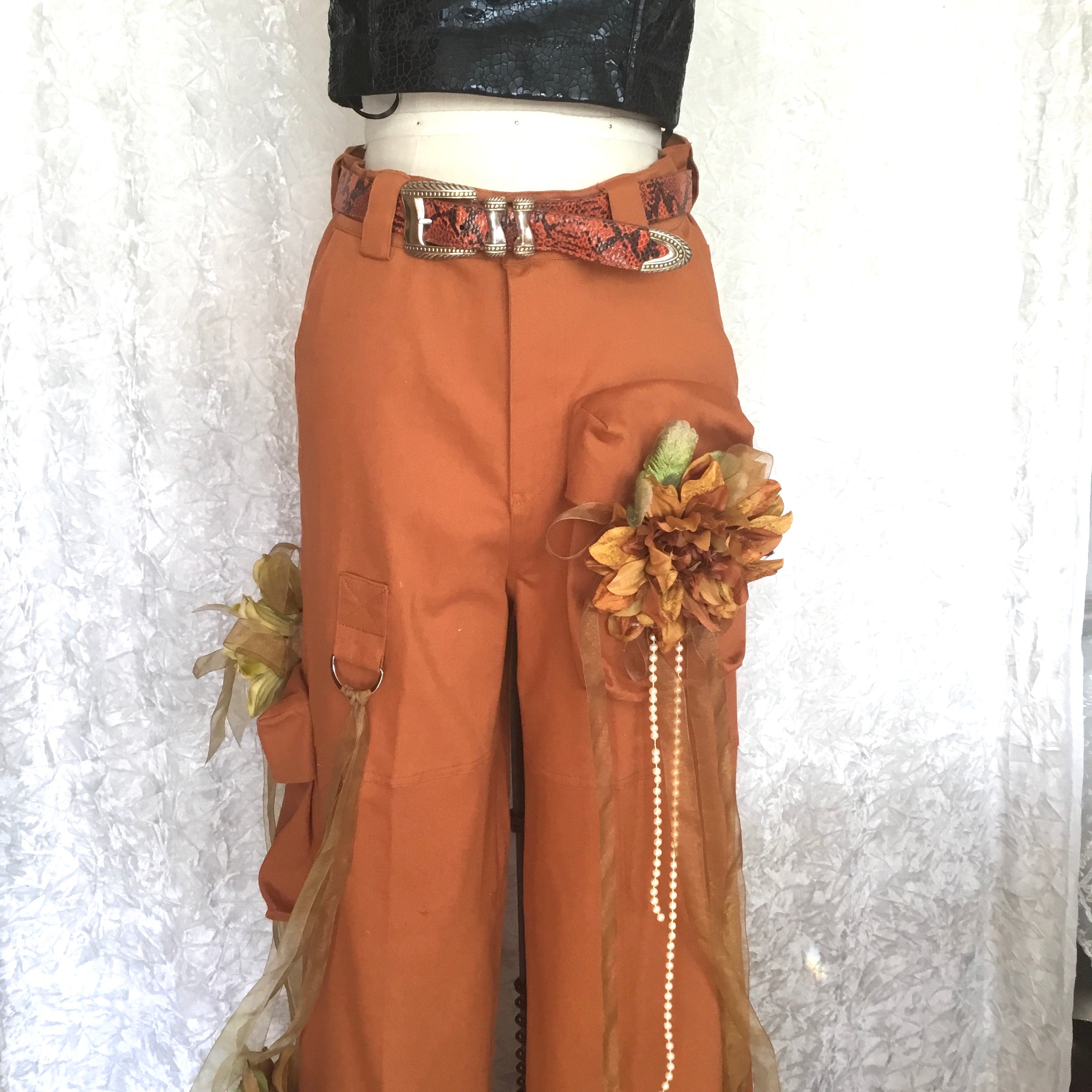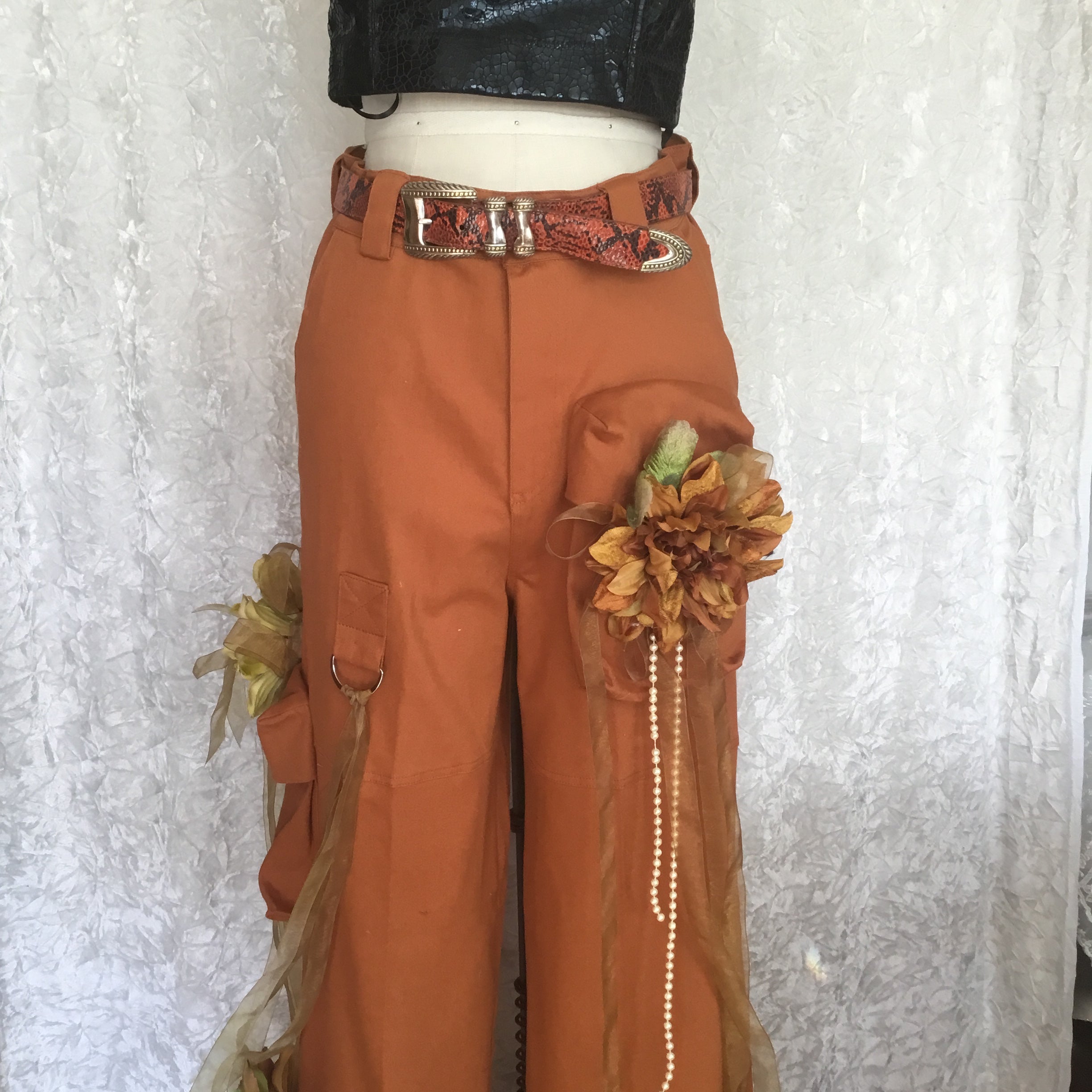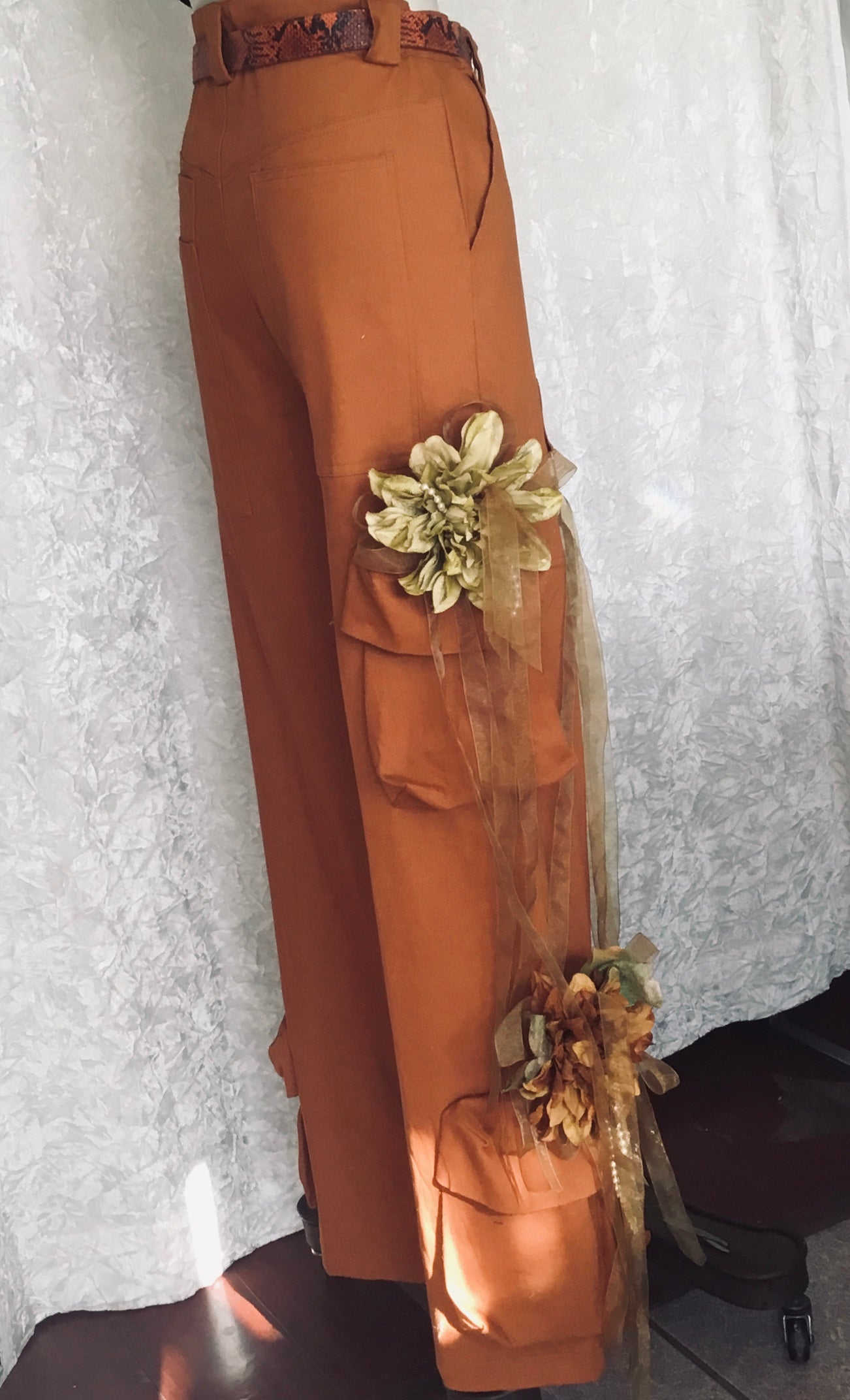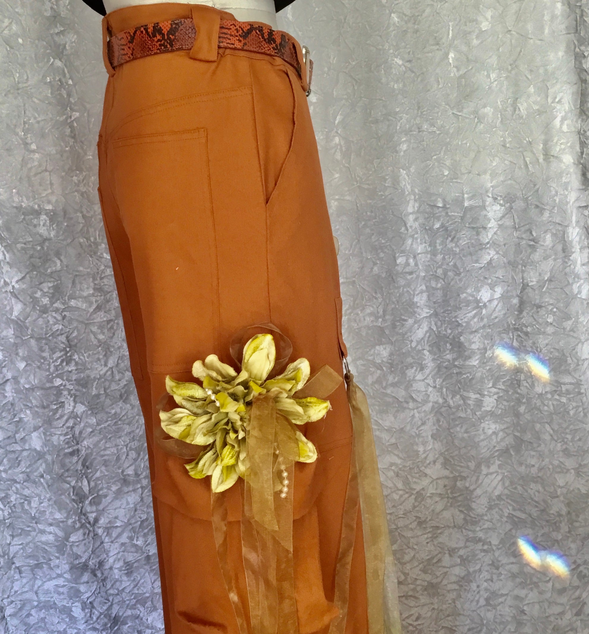 High-rise, long cotton cargo pants with multiple-pockets cargo embellished with velvet millinery quality 3d floral decorations down the sides of the legs and pockets for a modern flare. All detachable floral decorations. A new vintage leather belt to compliment the look.( sells separately)