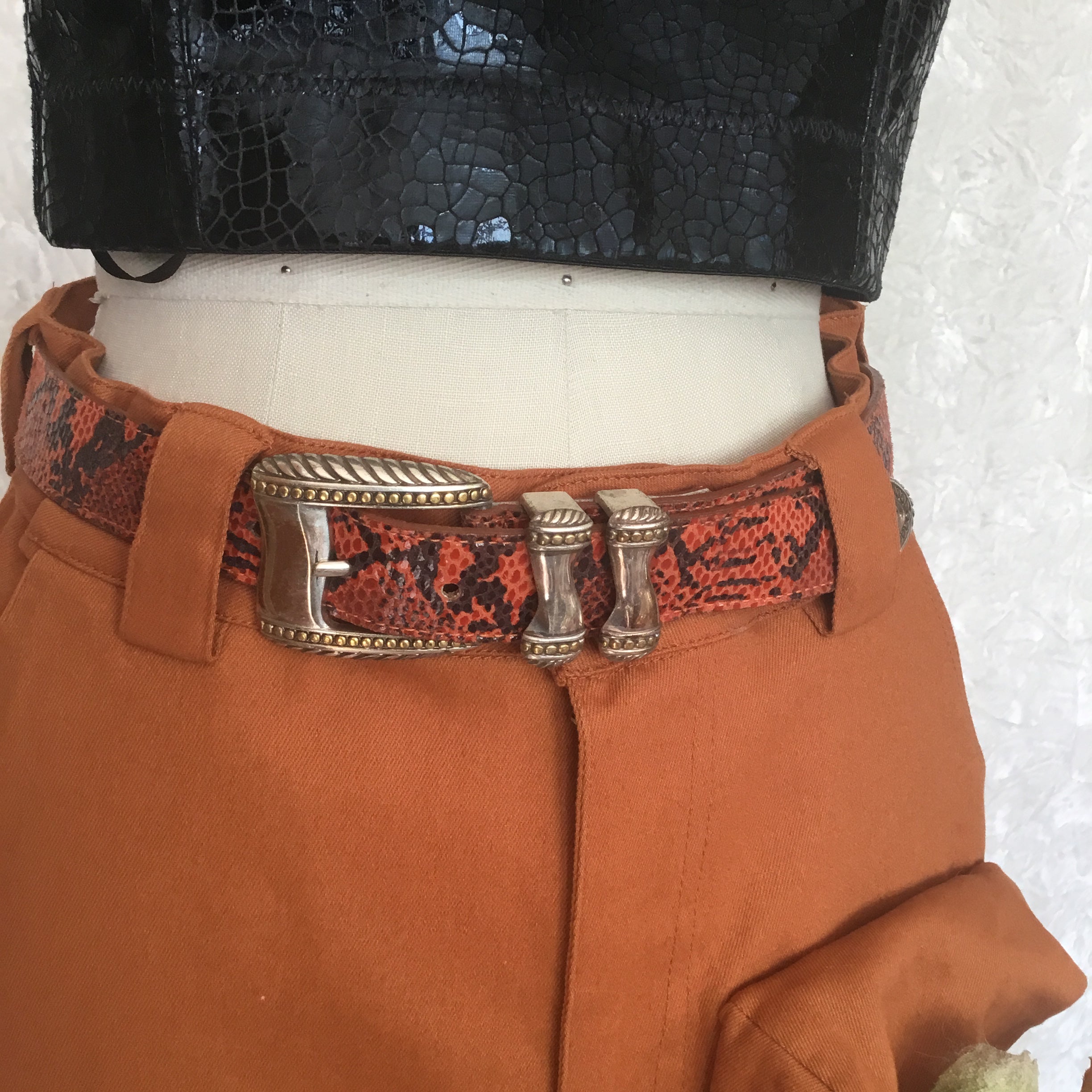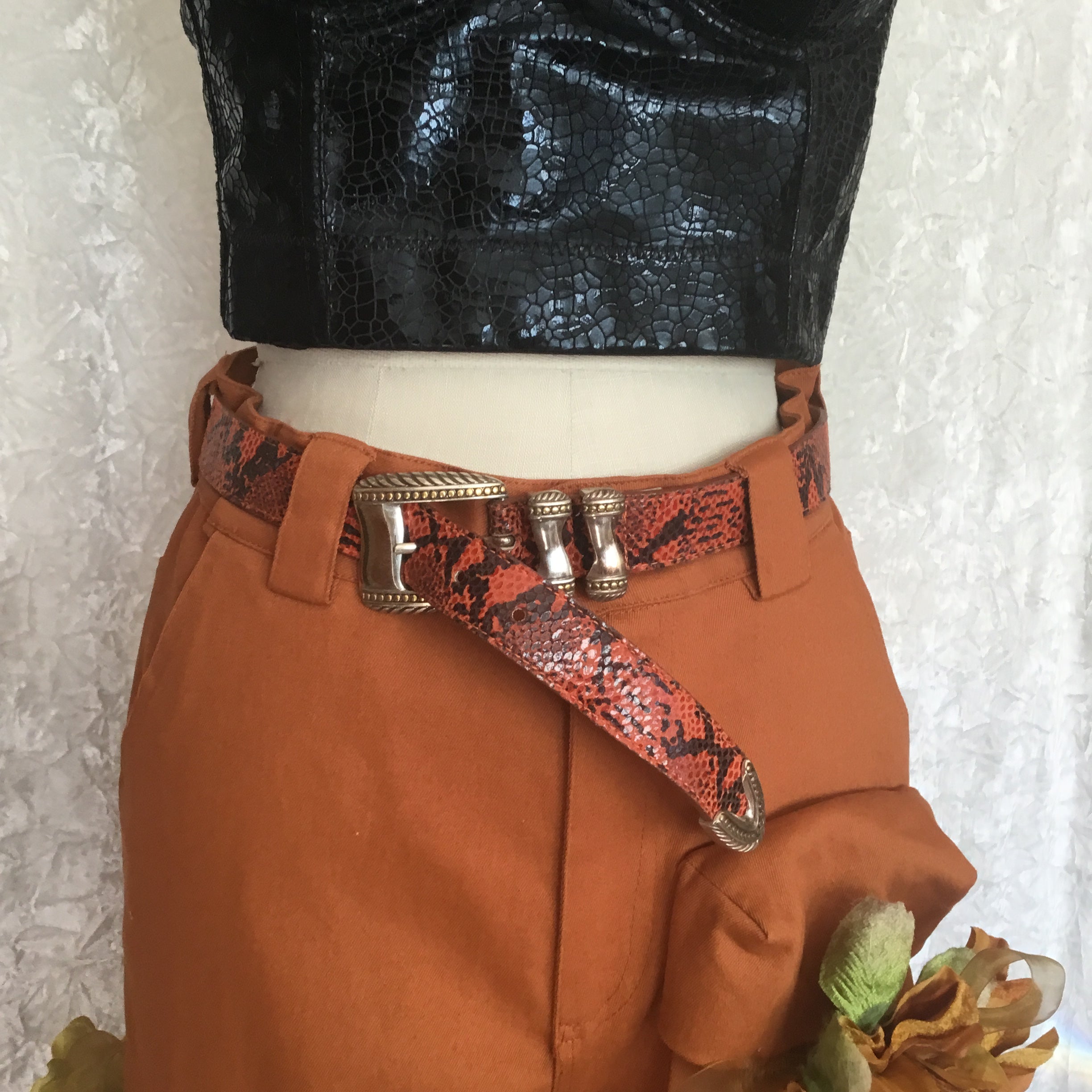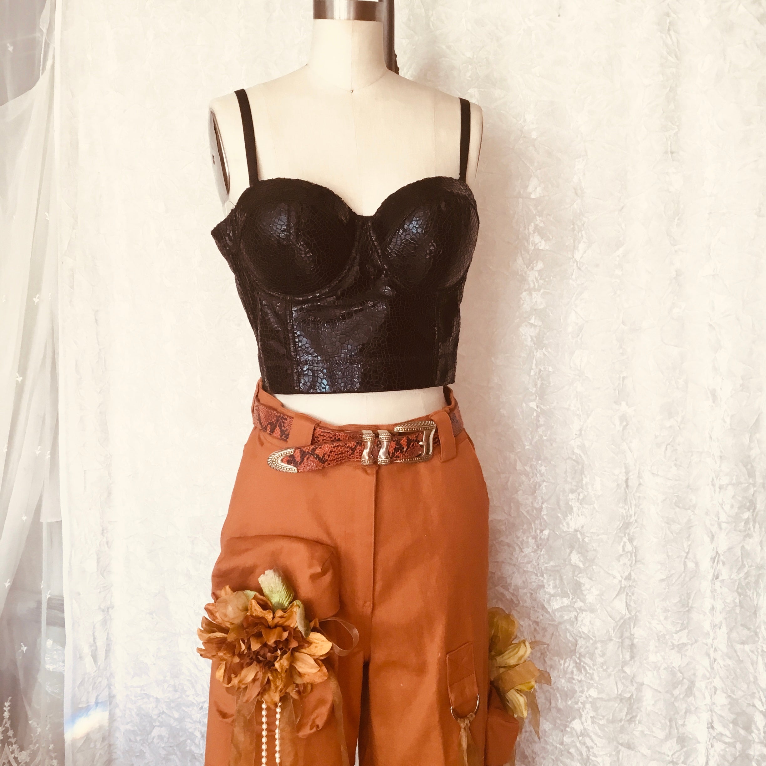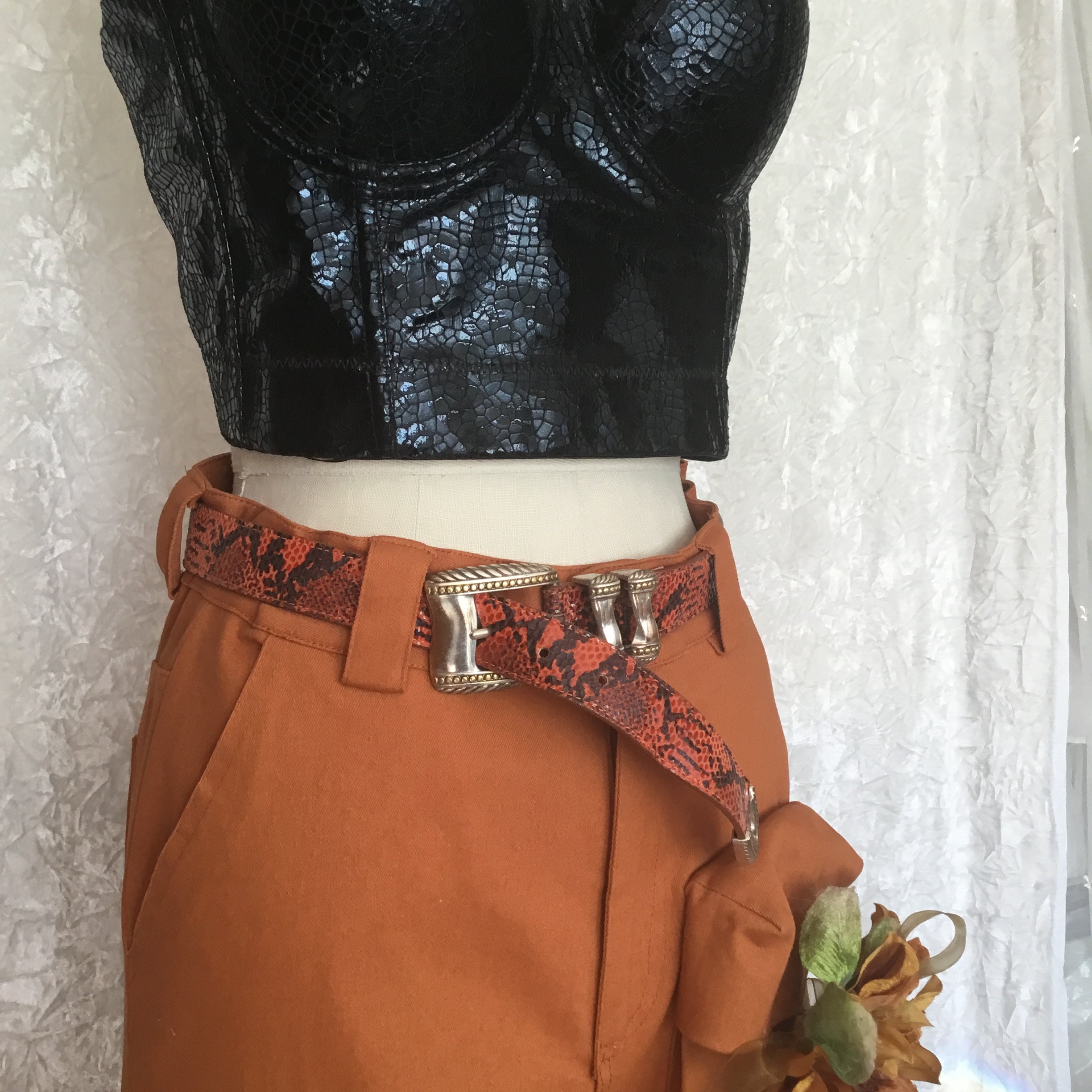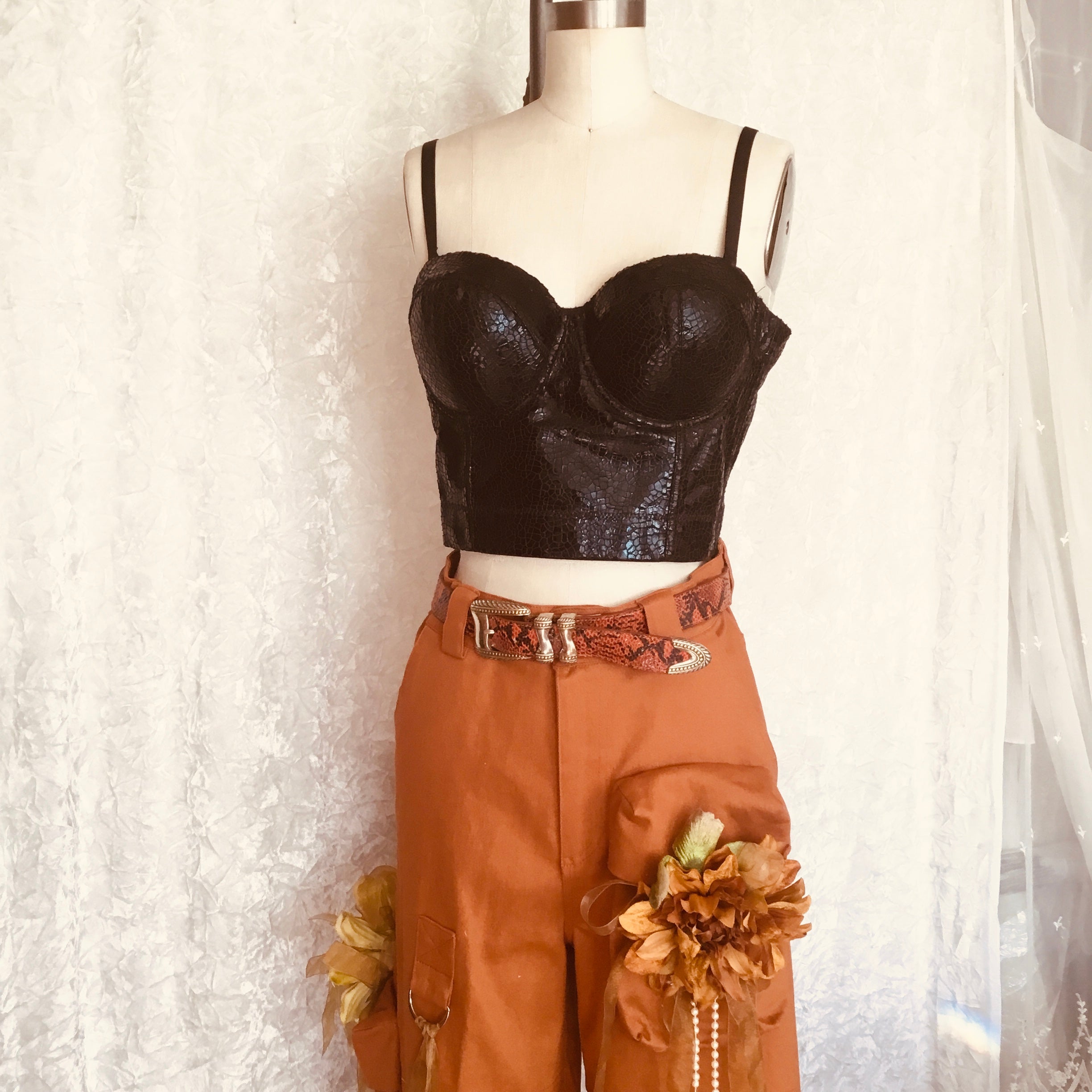 High-rise, long cotton cargo pants with multiple-pockets cargo embellished with velvet millinery quality 3d floral decorations down the sides of the legs and pockets for a modern flare. All detachable floral decorations. A new vintage leather belt to compliment the look.( sells separately)