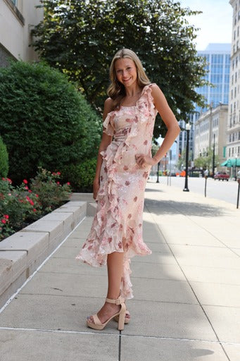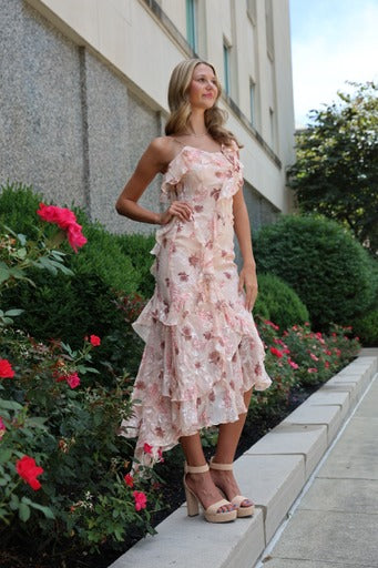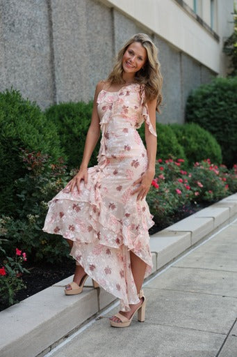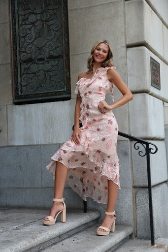 This timeless design features gathered tiers around the full-length skirt, a romantically fitting bodice, and the sweetest detachable off-shoulder ruffle sleeves. Wear this delicate bohemian inspired dress for any special occasion.