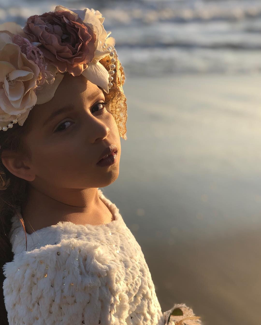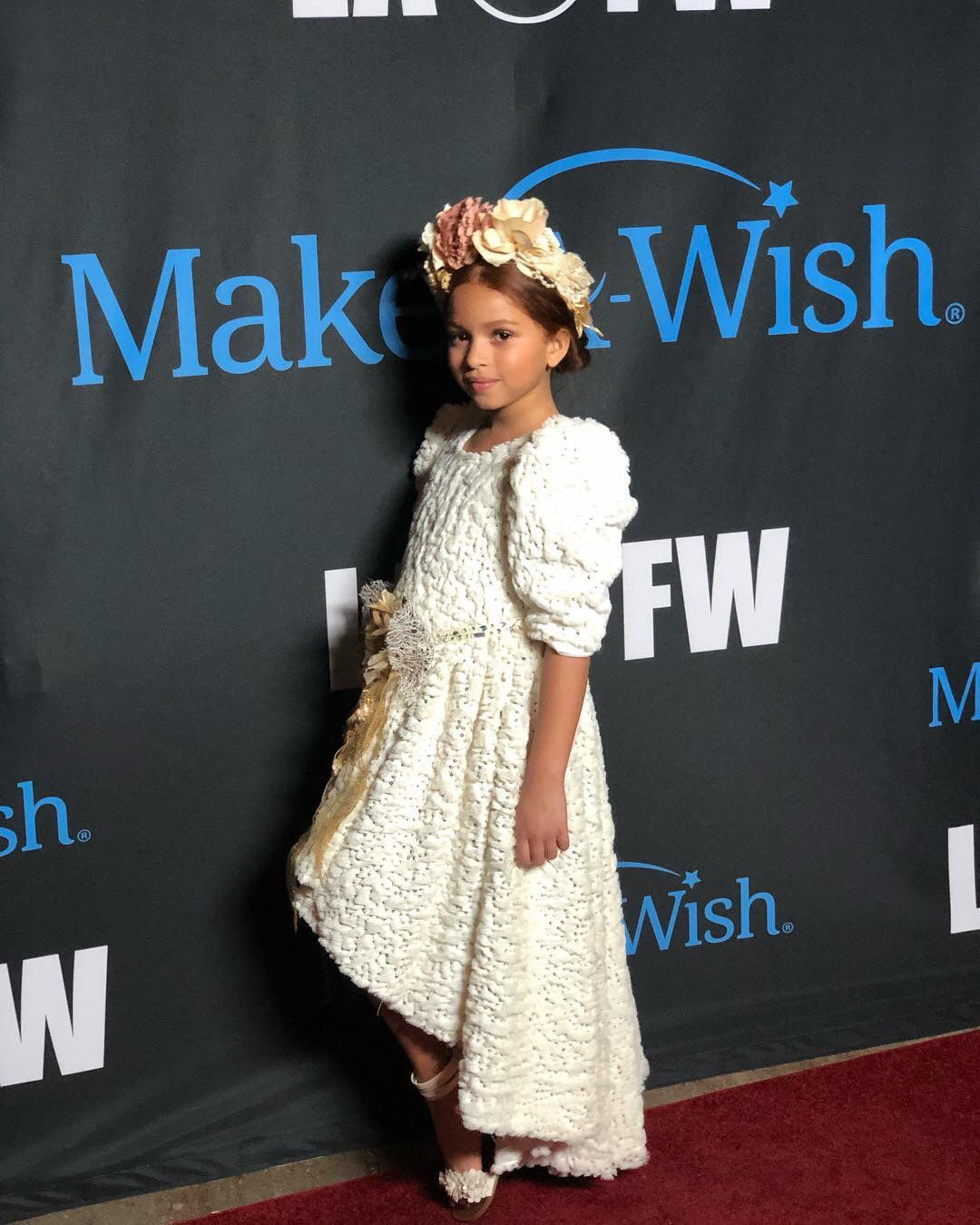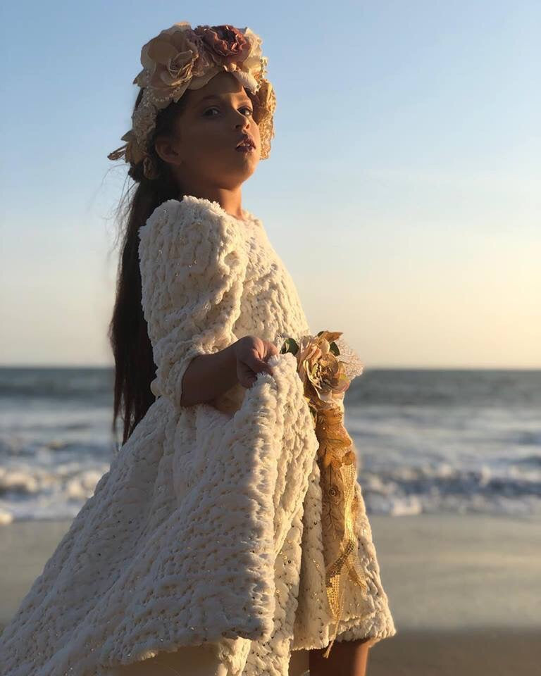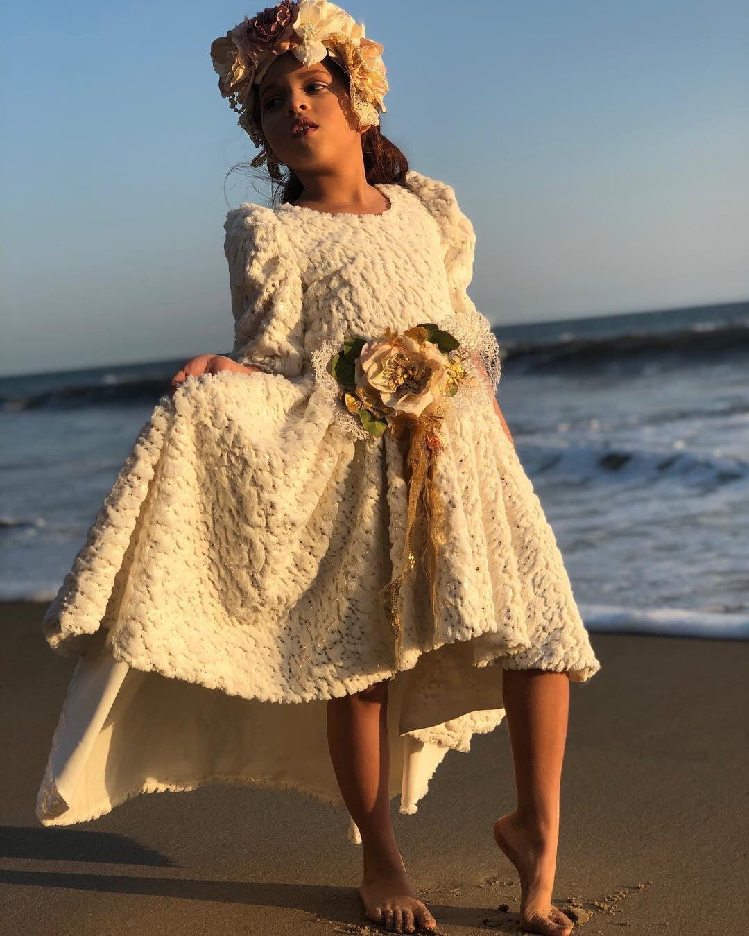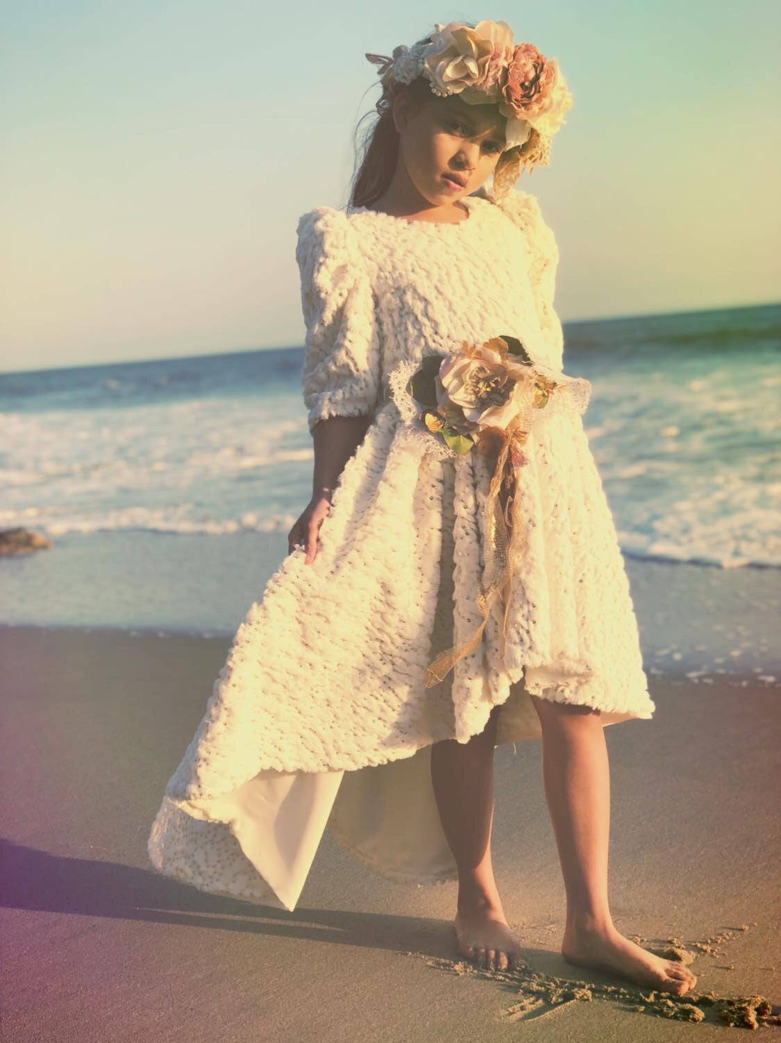 Our beautiful and unique winter high low dress straight for our runway featuring a detachable flower brooch included and a matching head band (sells separately).