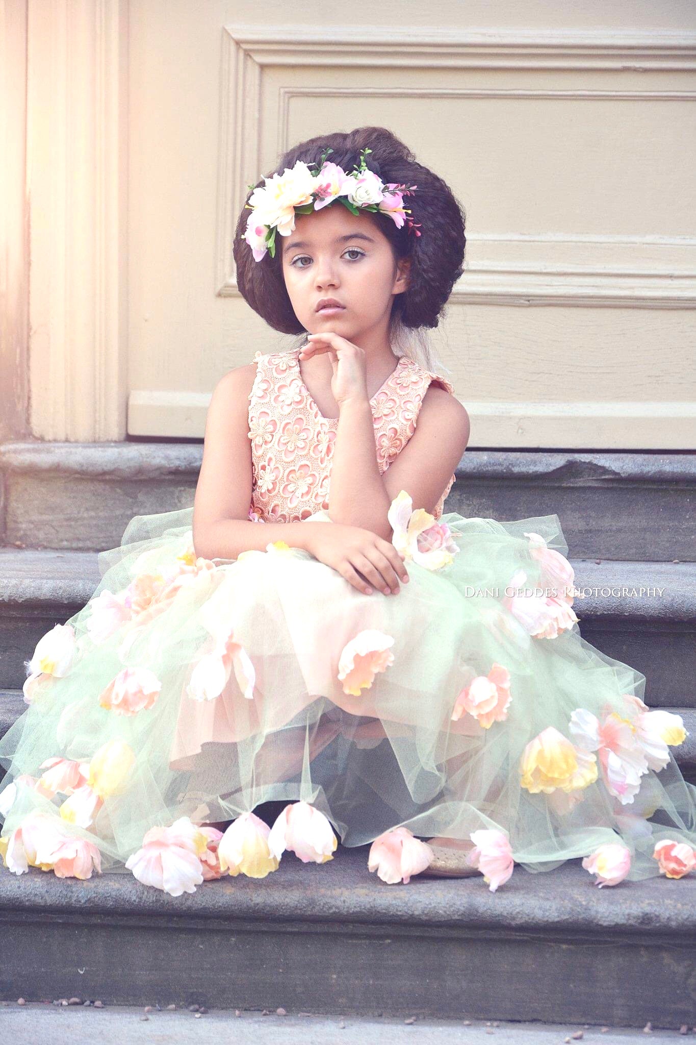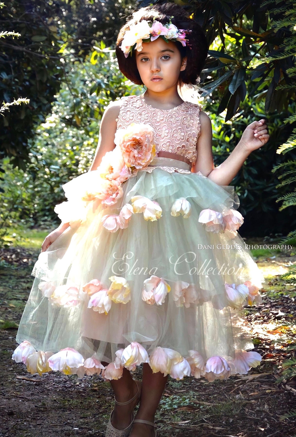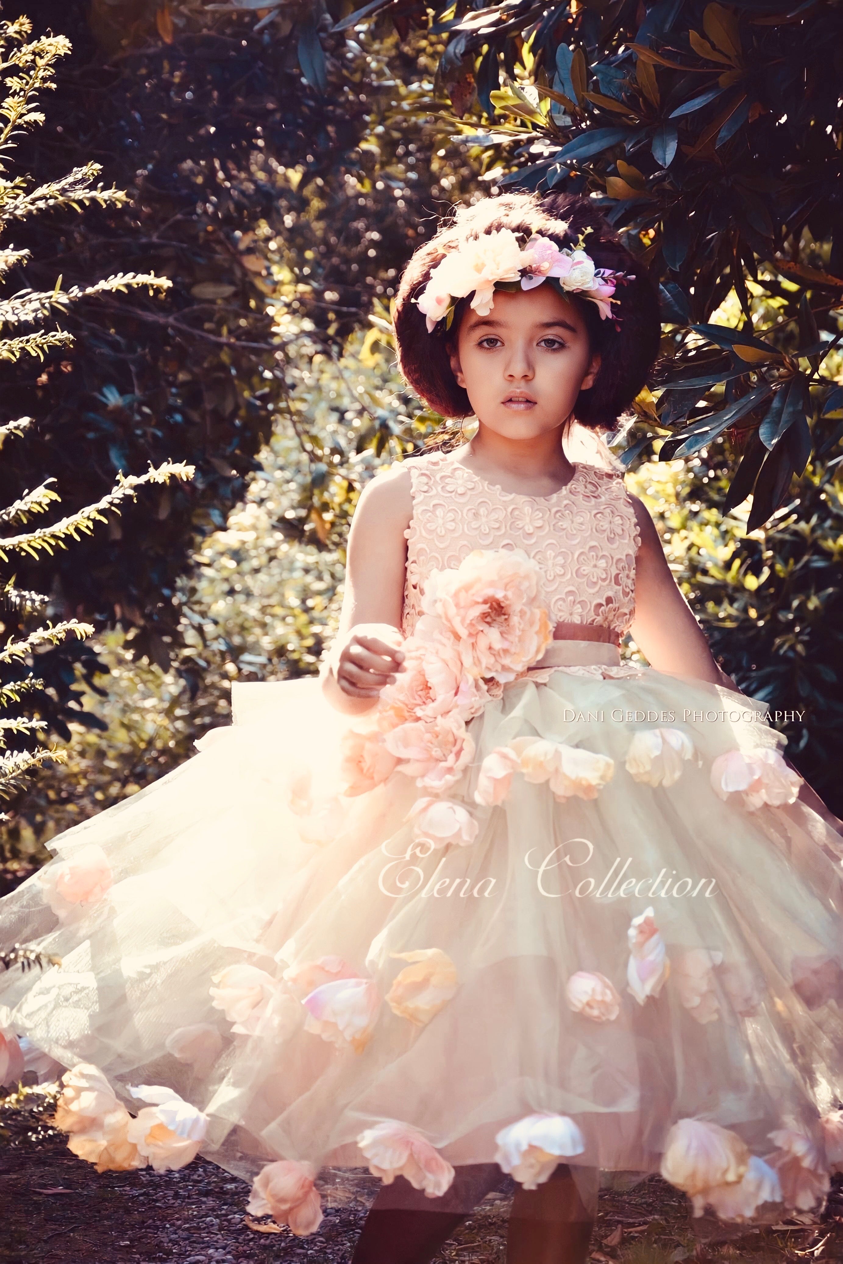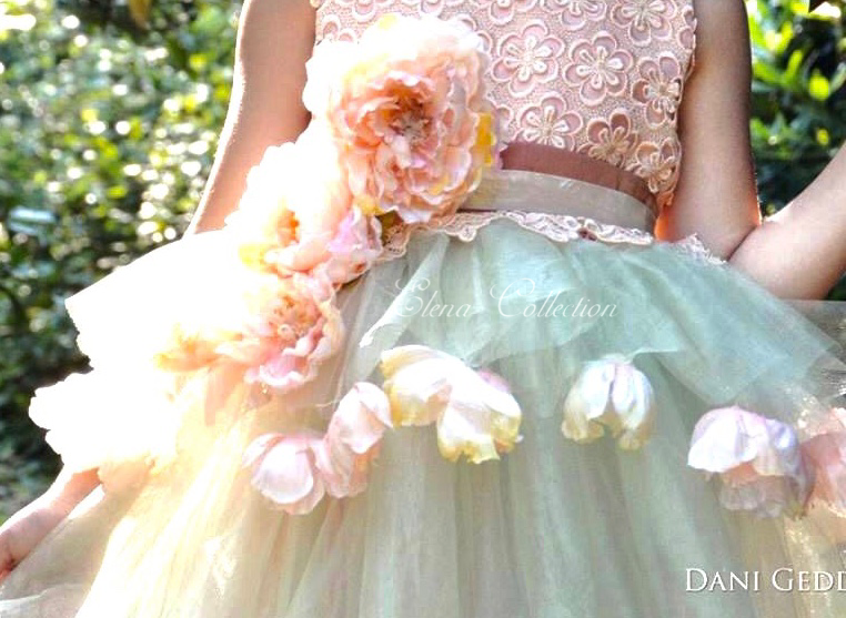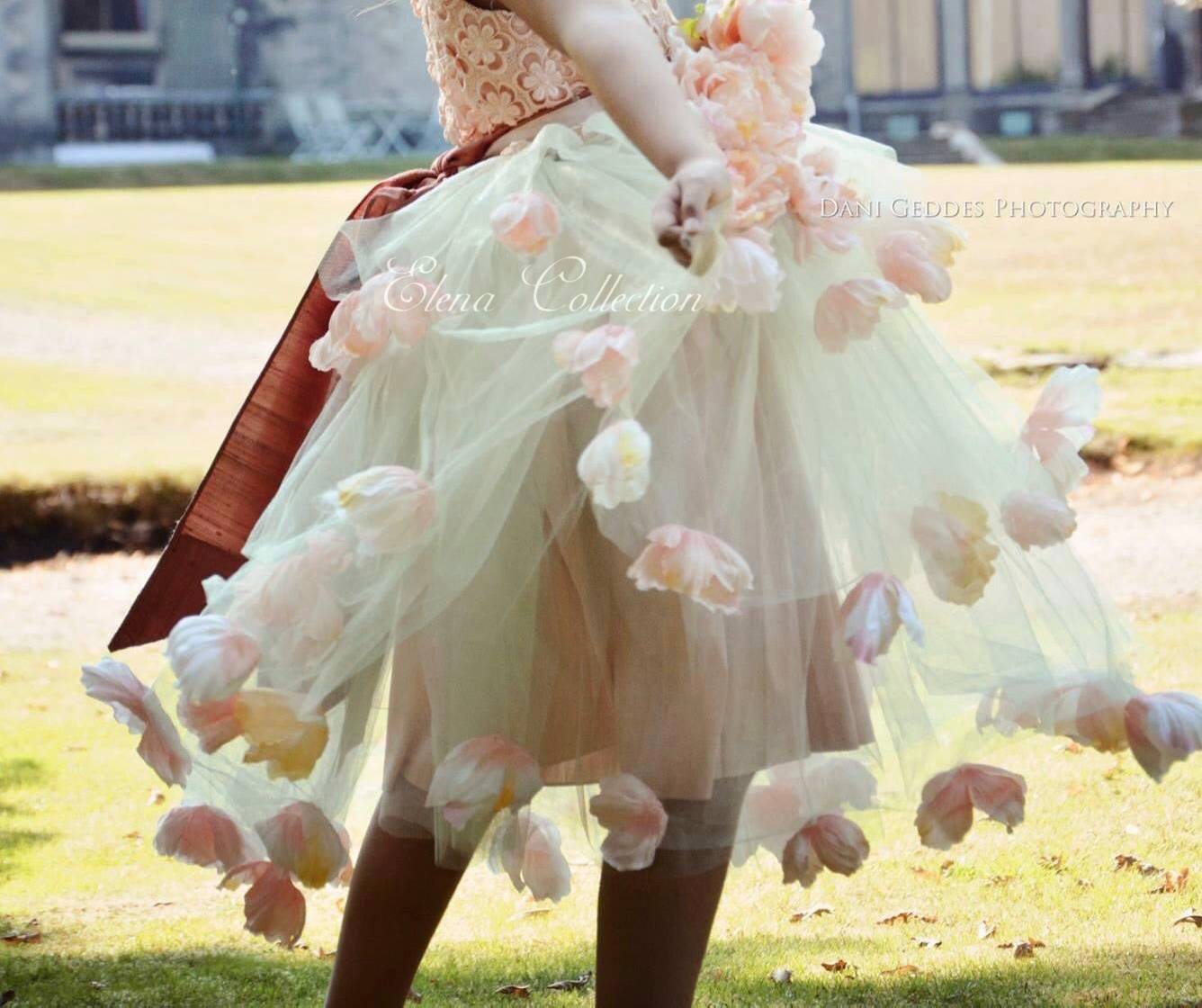 This beautiful tulle dress features a with a tiered skirt and gorgeous flowers all around each tier makes this gorgeous dress unique and different. It is perfect for a garden wedding, photo shoot or any special occasion.