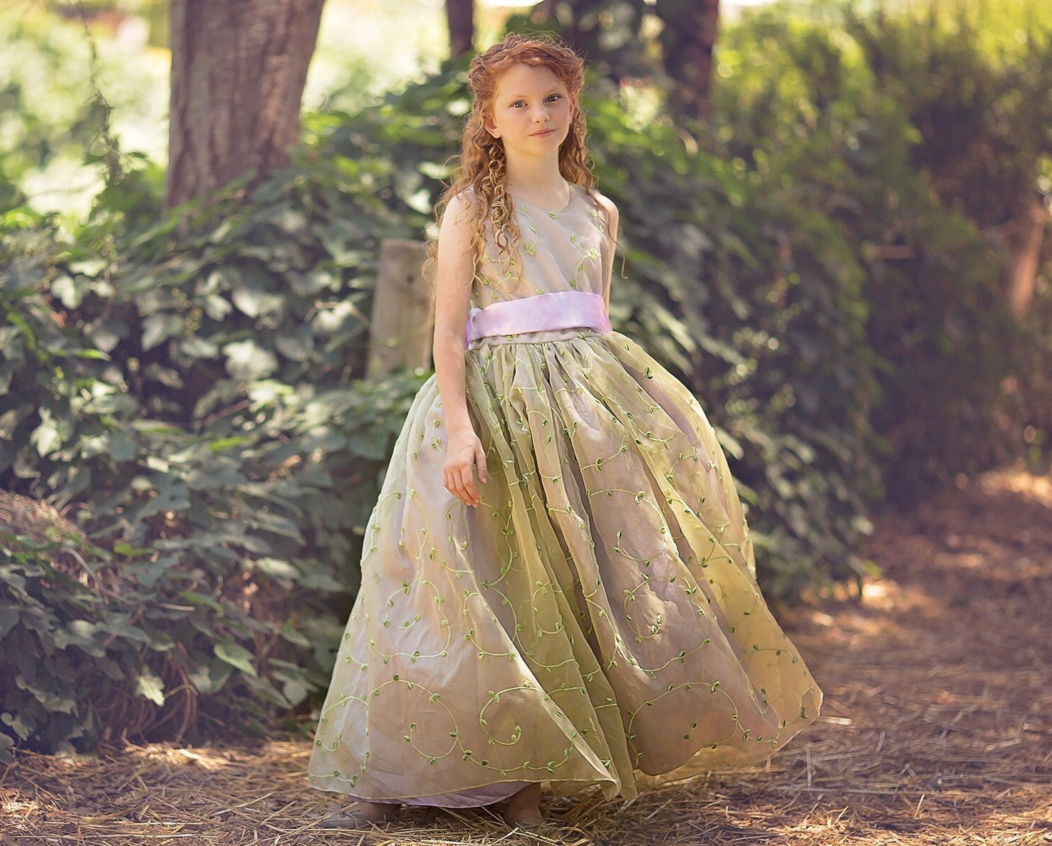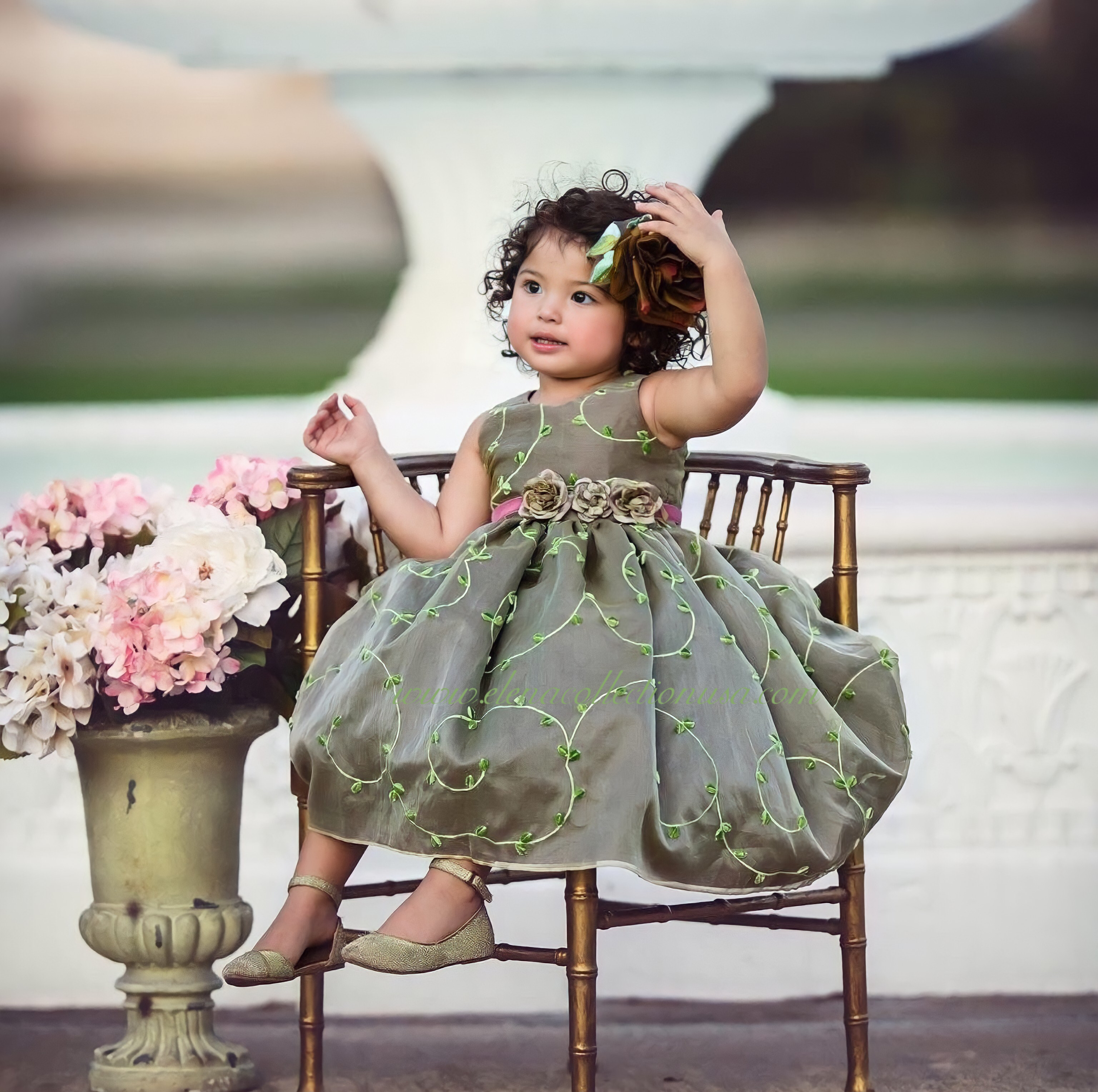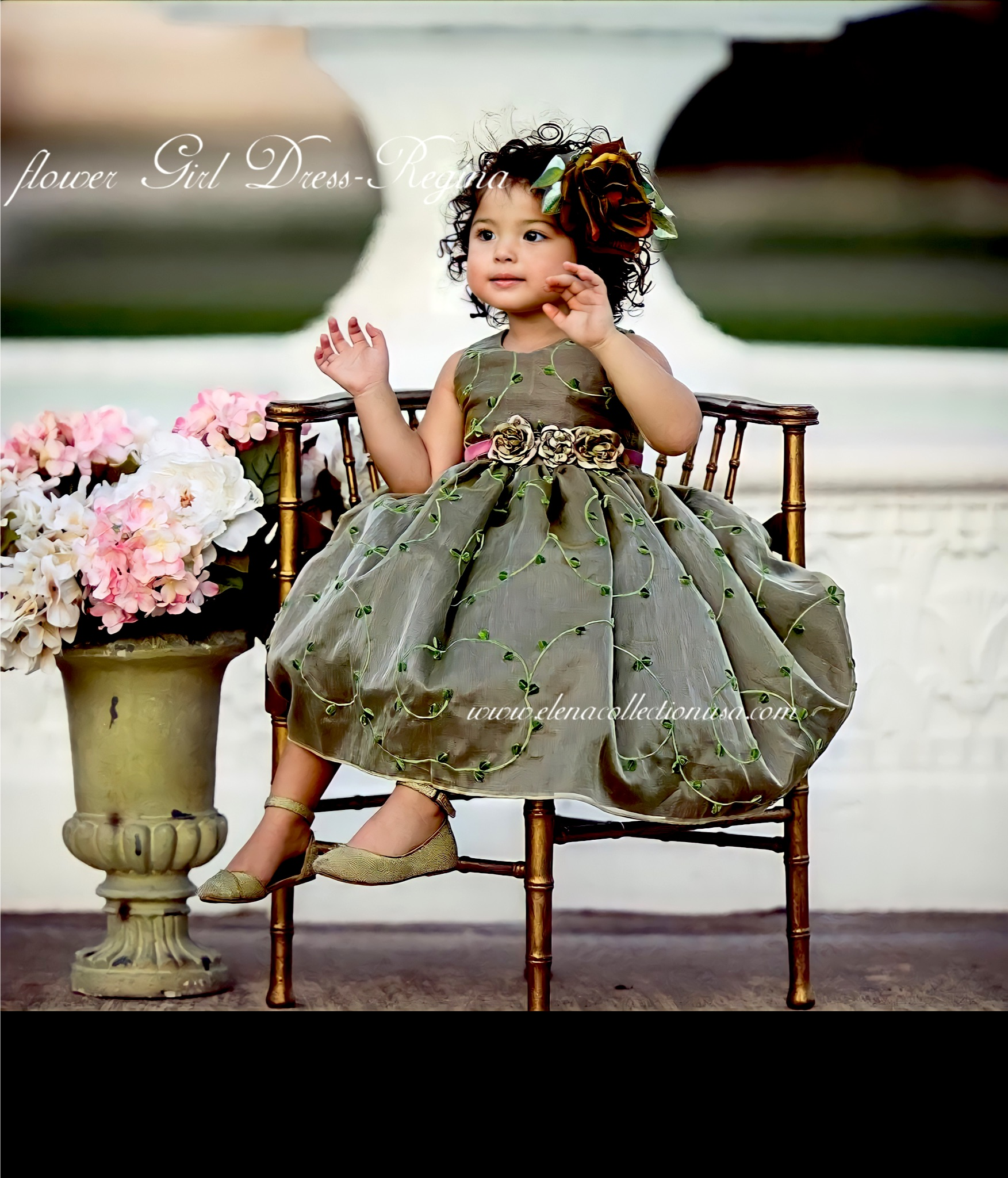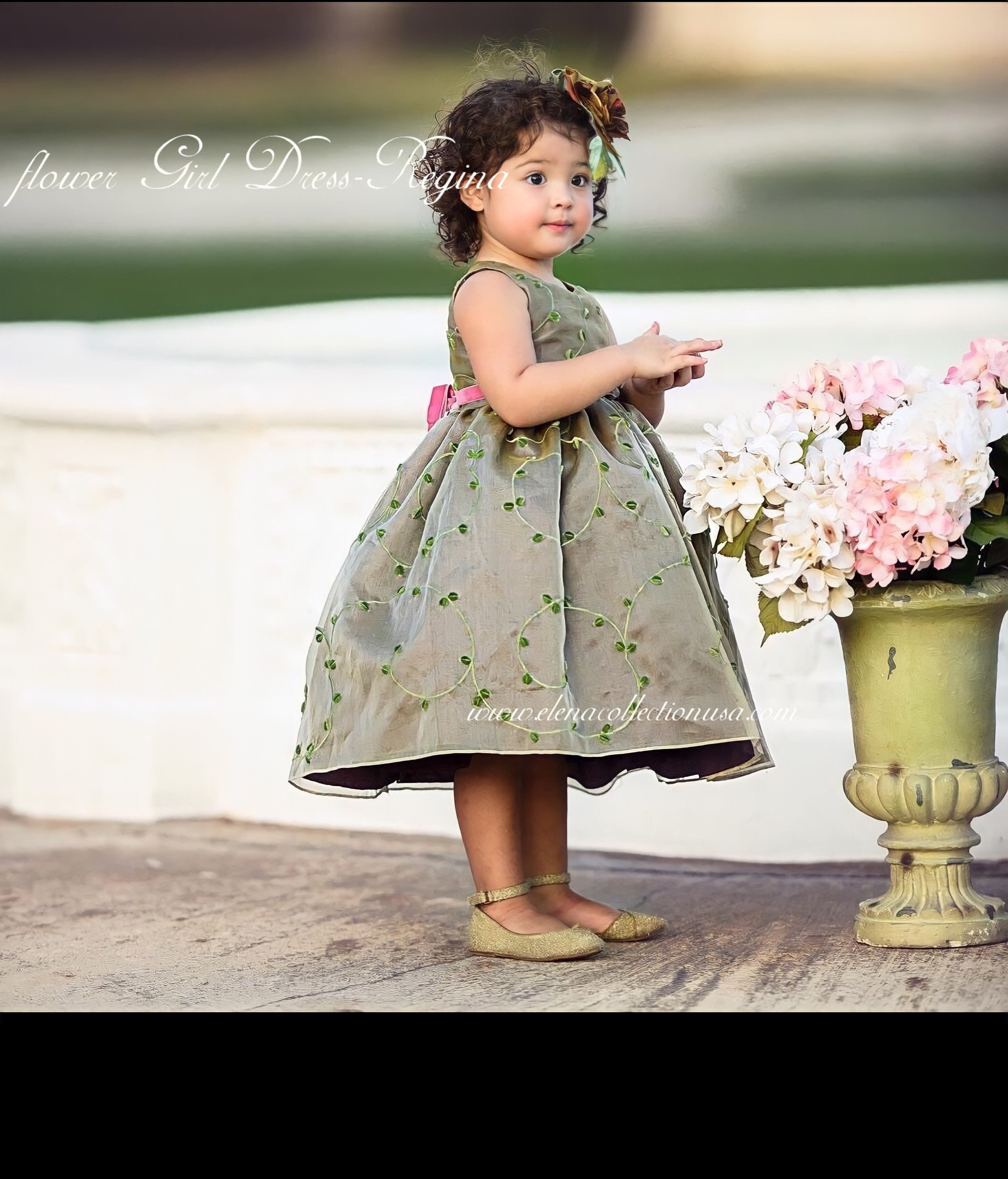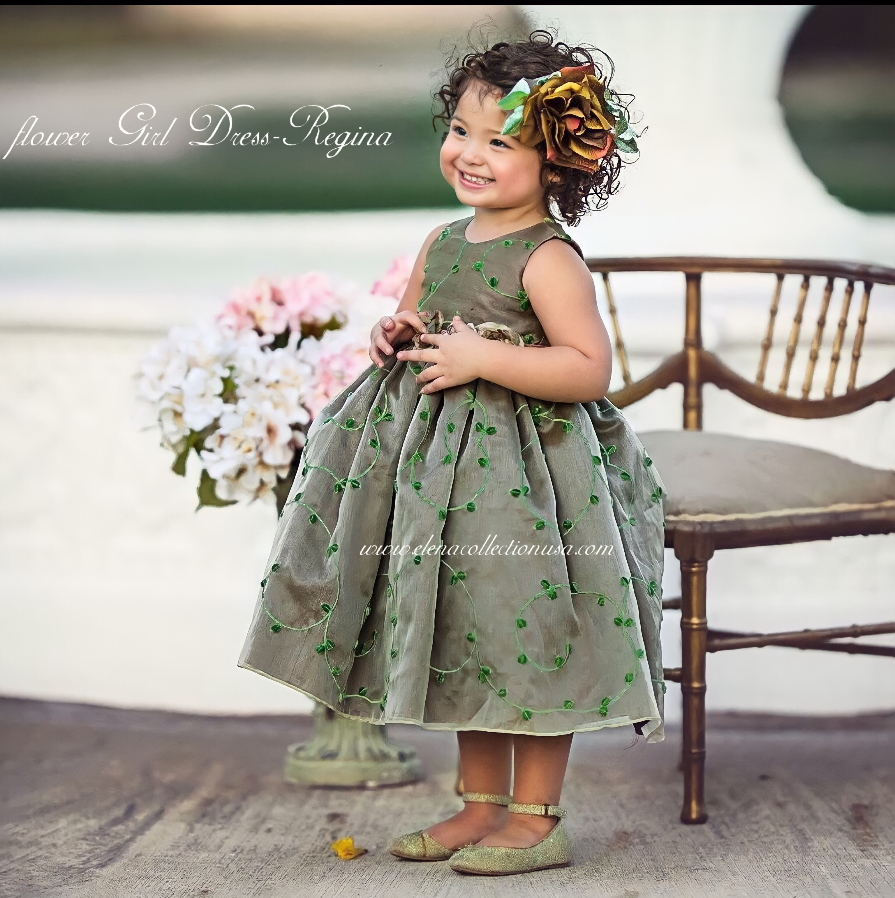 Let your little one blossom in timeless elegance with our “Regina” Flower Girl Dress — a couture creation from the Elena Collection. Made from luxurious silk organza in a unique olive-gold tone, this enchanting dress features delicate green vine embroidery and a full gathered skirt that sways with every step.