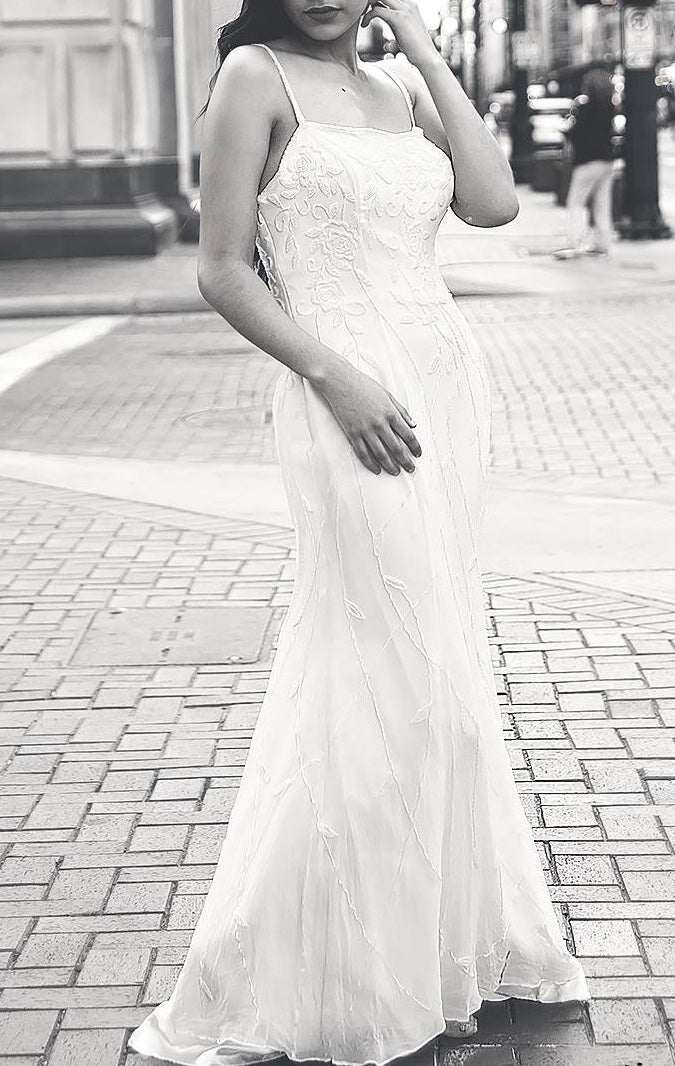 Wedding fluted silk chiffon beaded long dress with beaded straps.