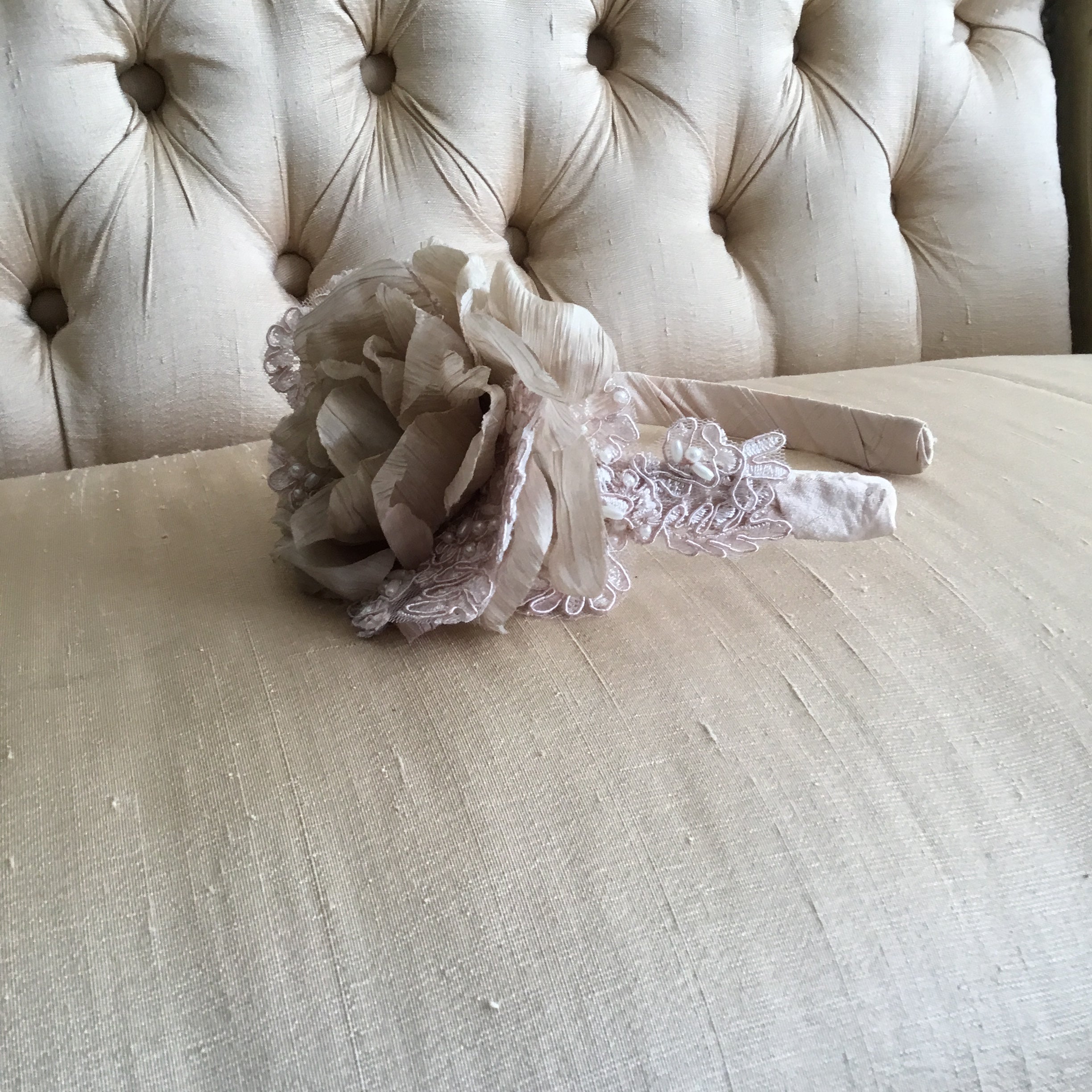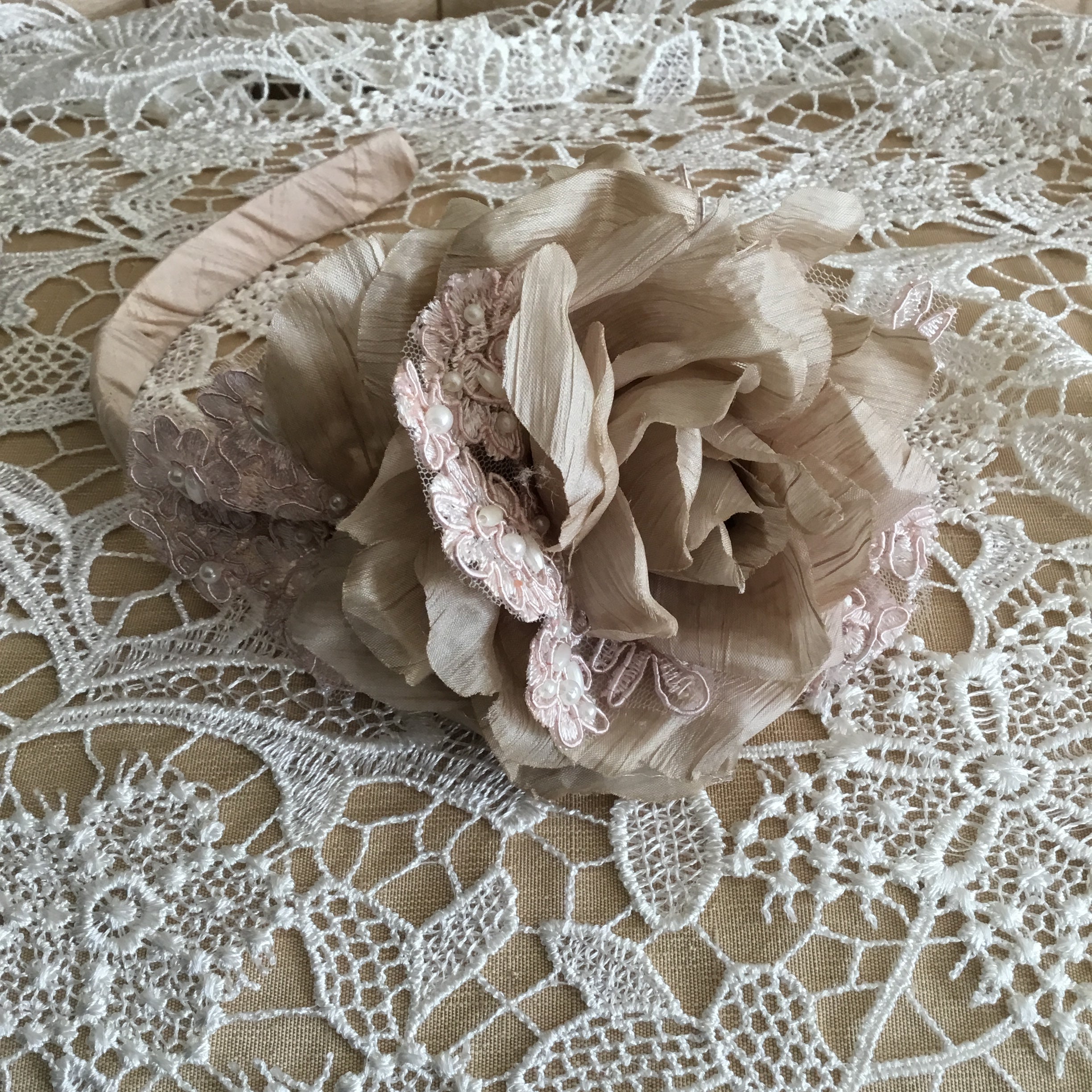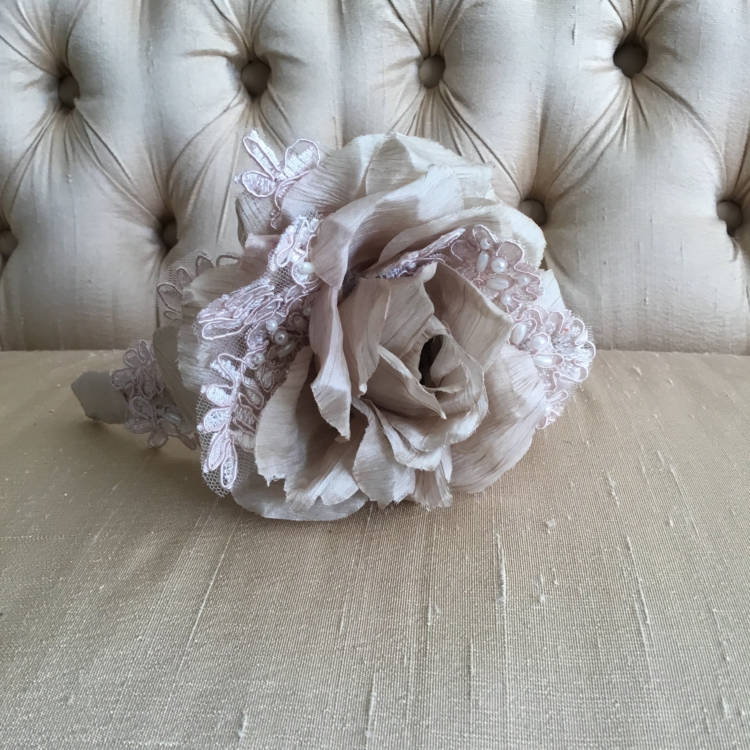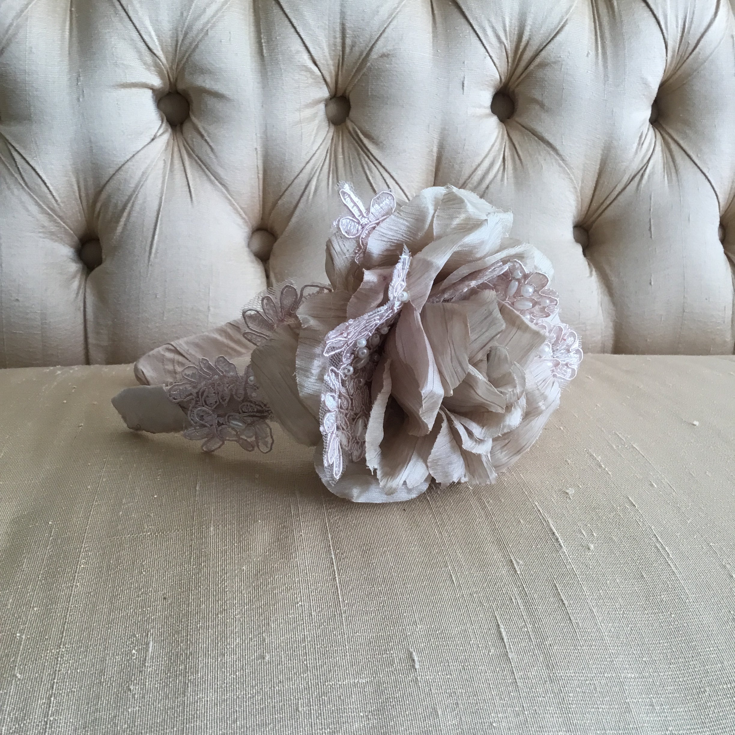 . Flower is secure attached with adhesive to an 1” wide plastic base headband. Headband will fit most 5 year olds and adults.