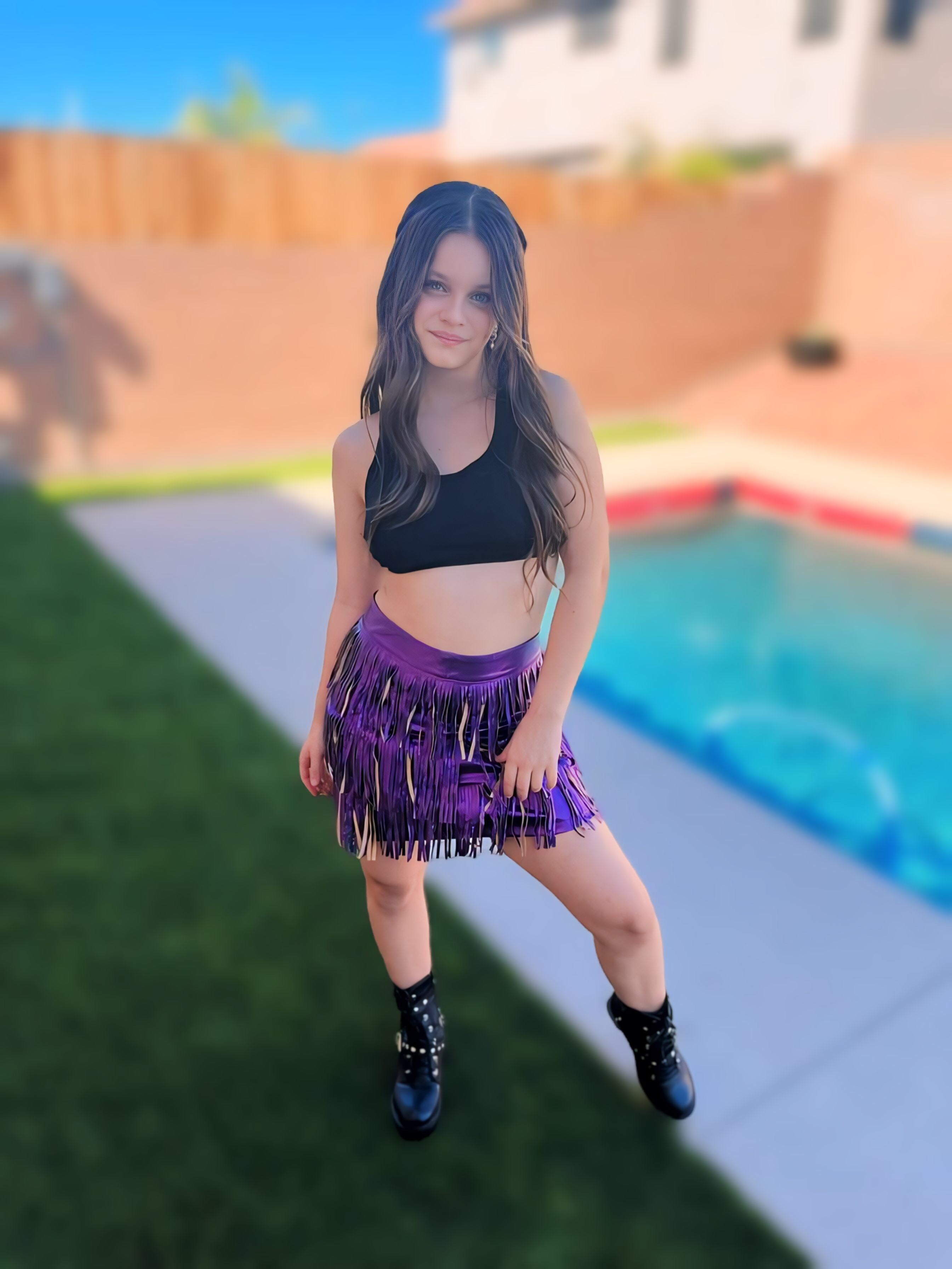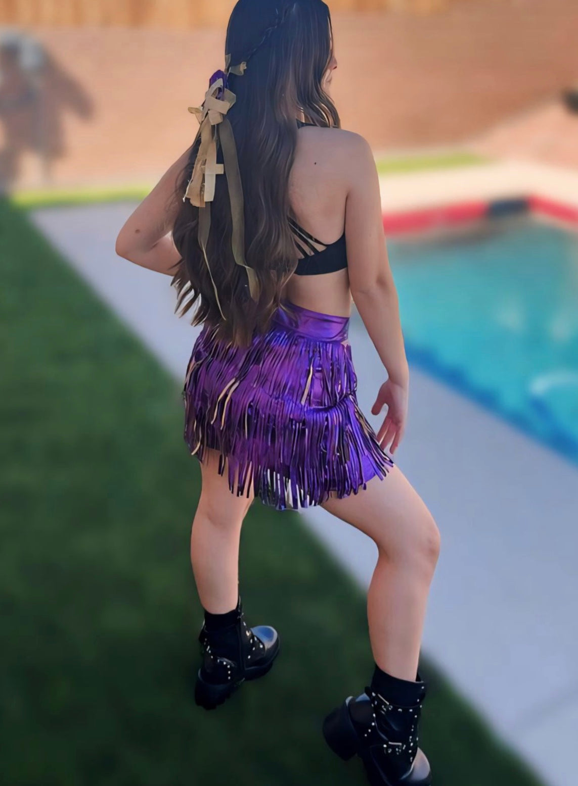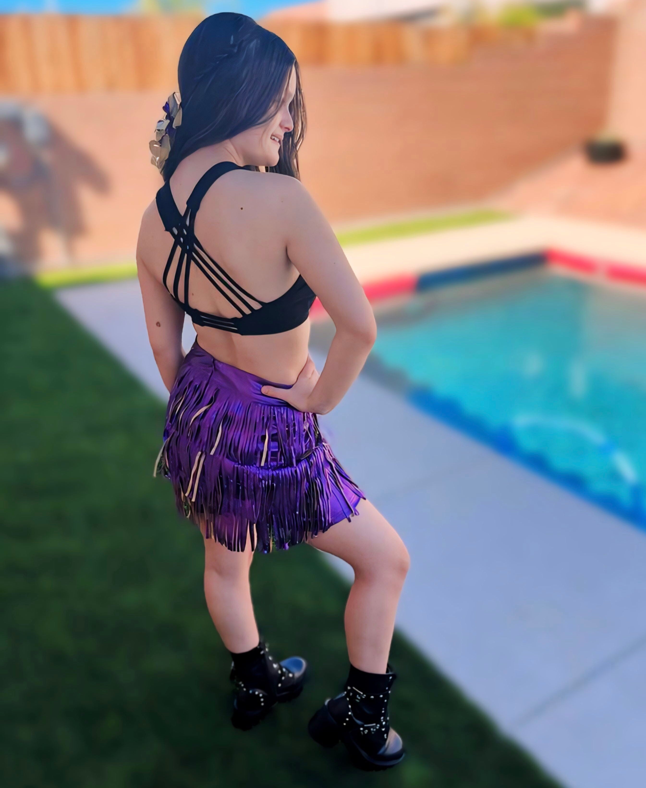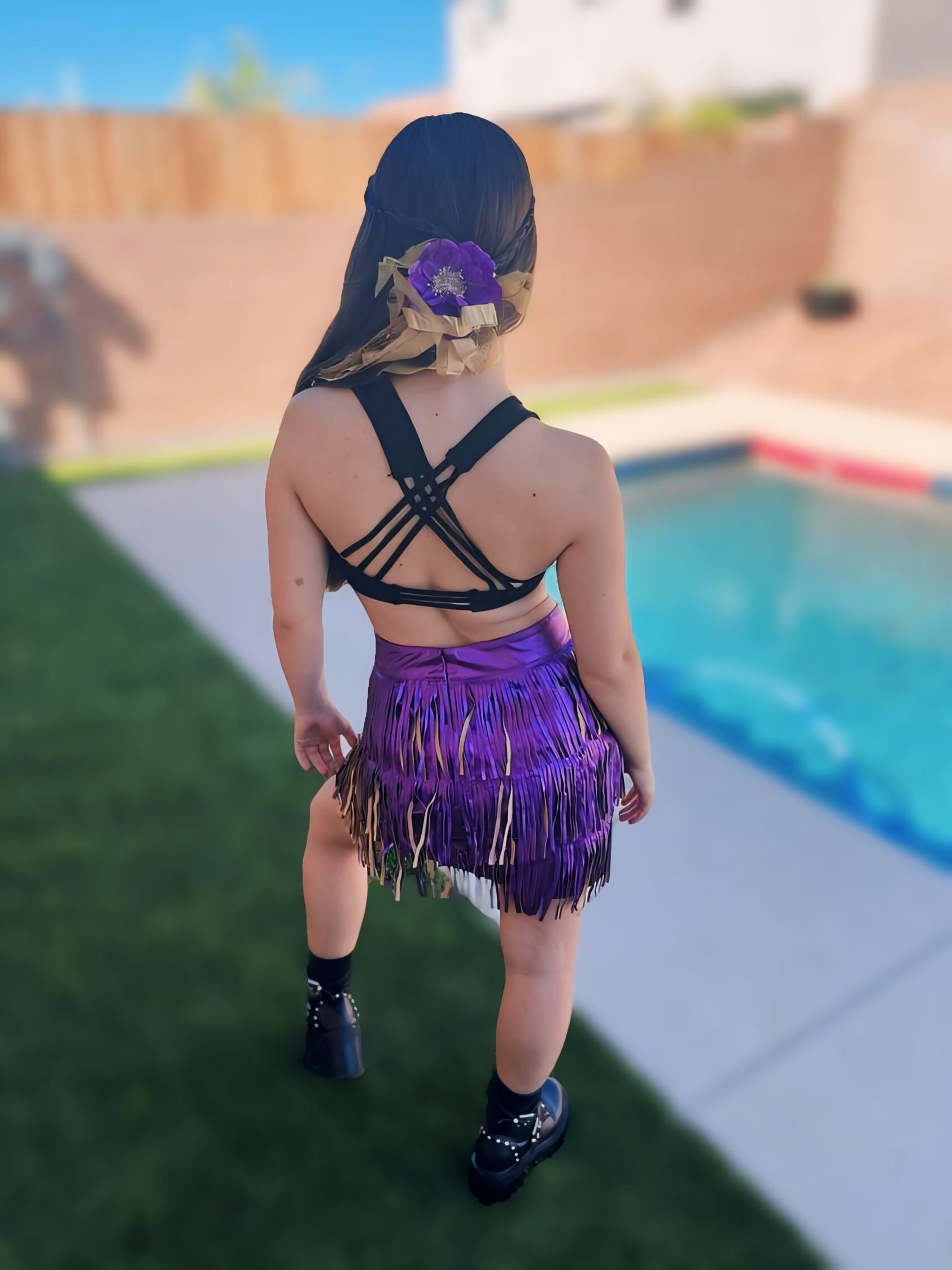 Turn heads with our Fringes cowgirl PU leather skirt that has all the latest trends combined. The PU pearlized shine gives the skirt a trendy look the tiered detailing adds a touch of elegance. Pair it with cowboy boots for a trendy Texas look ( see last pictures) with a yoga top hells and a jacket for a more polished look. The flower hair clip - dress brooch handmade to coordinate with skirt SELLS SEPARATELY.