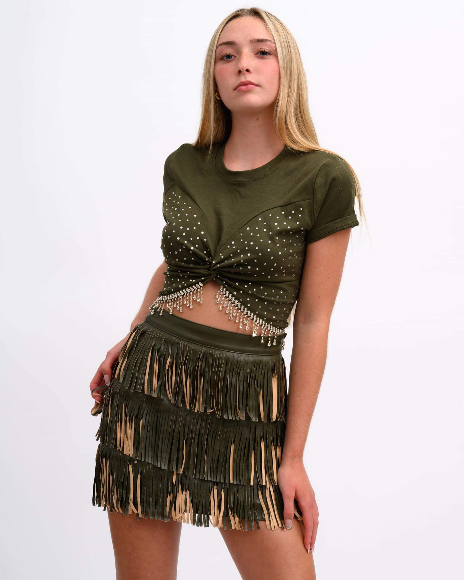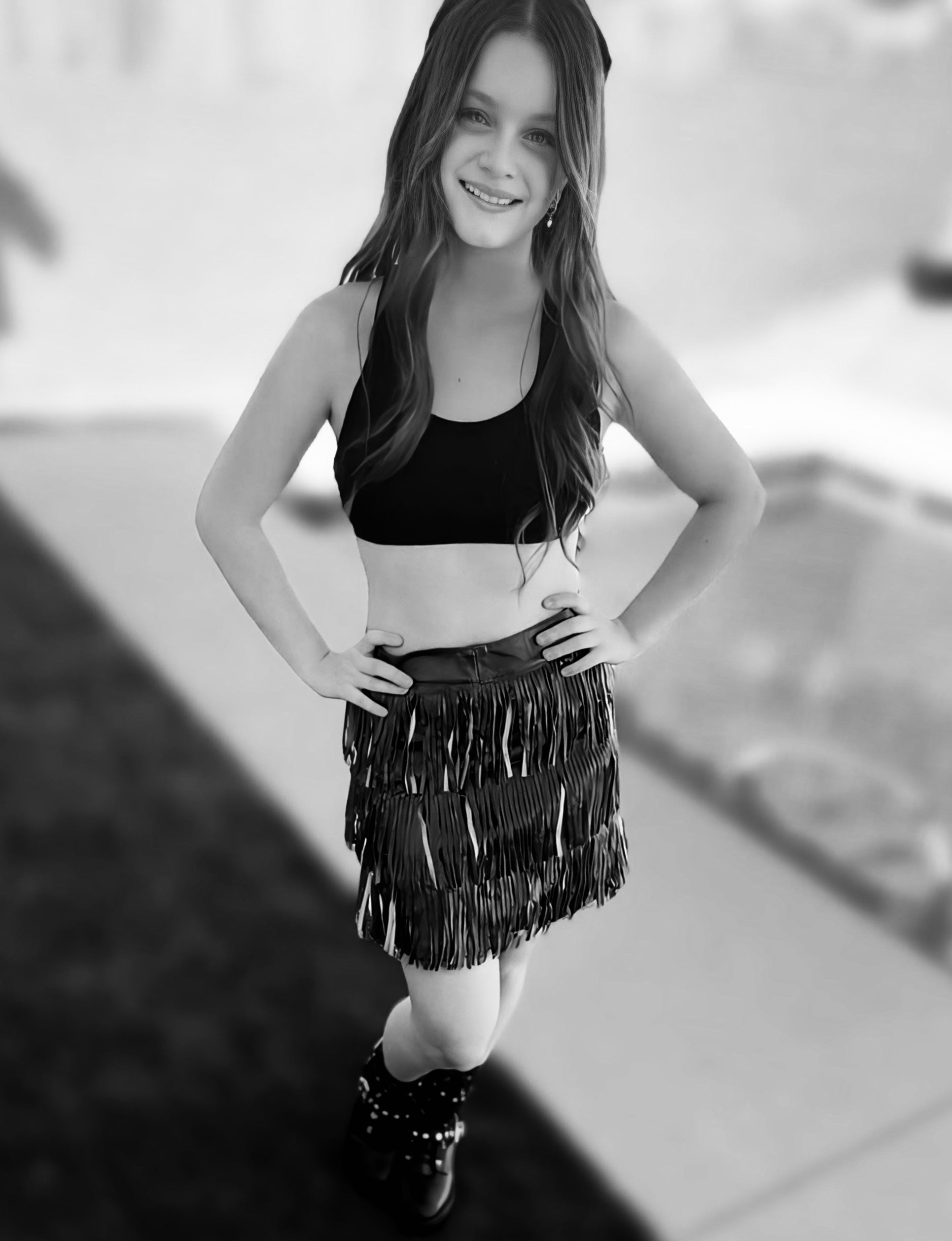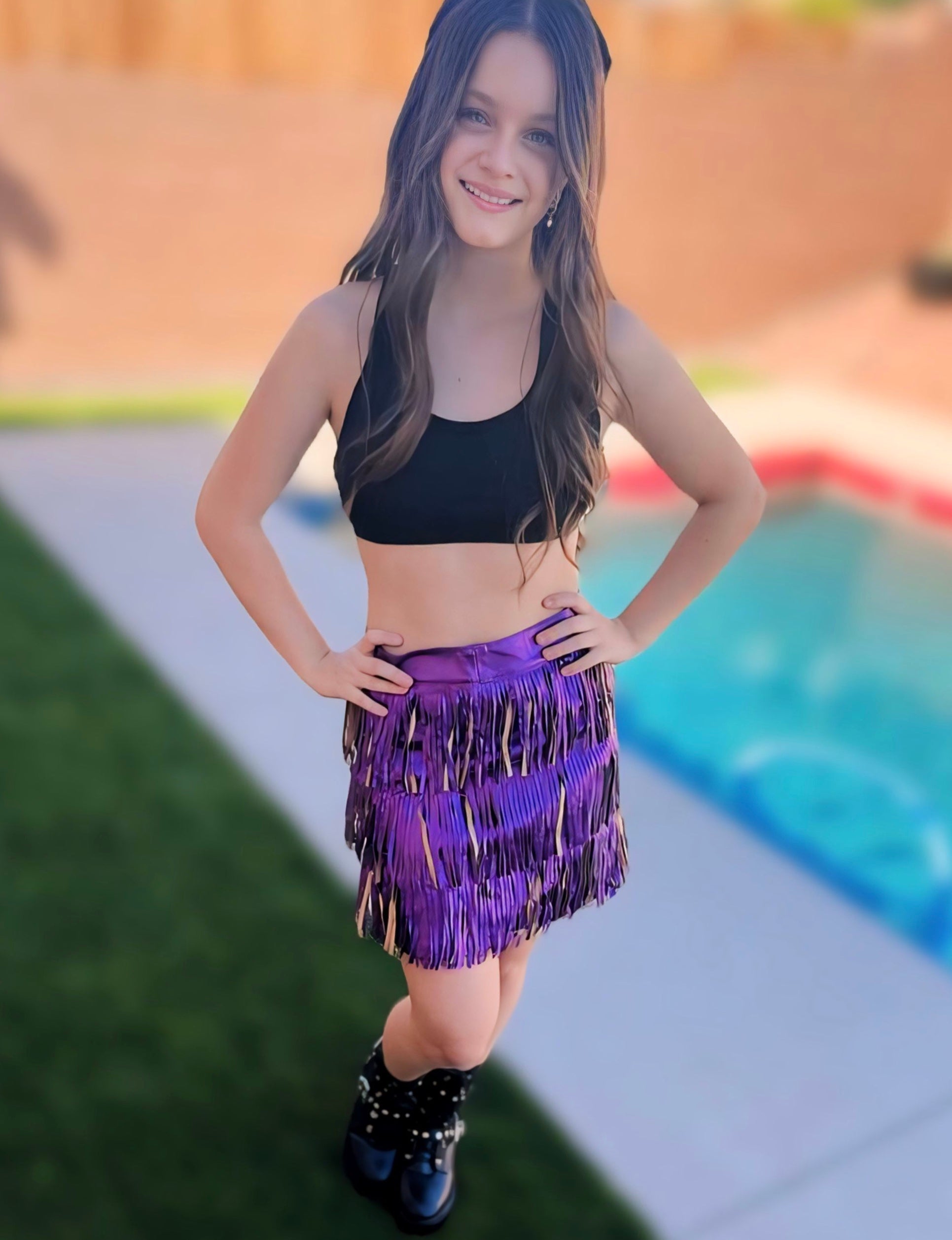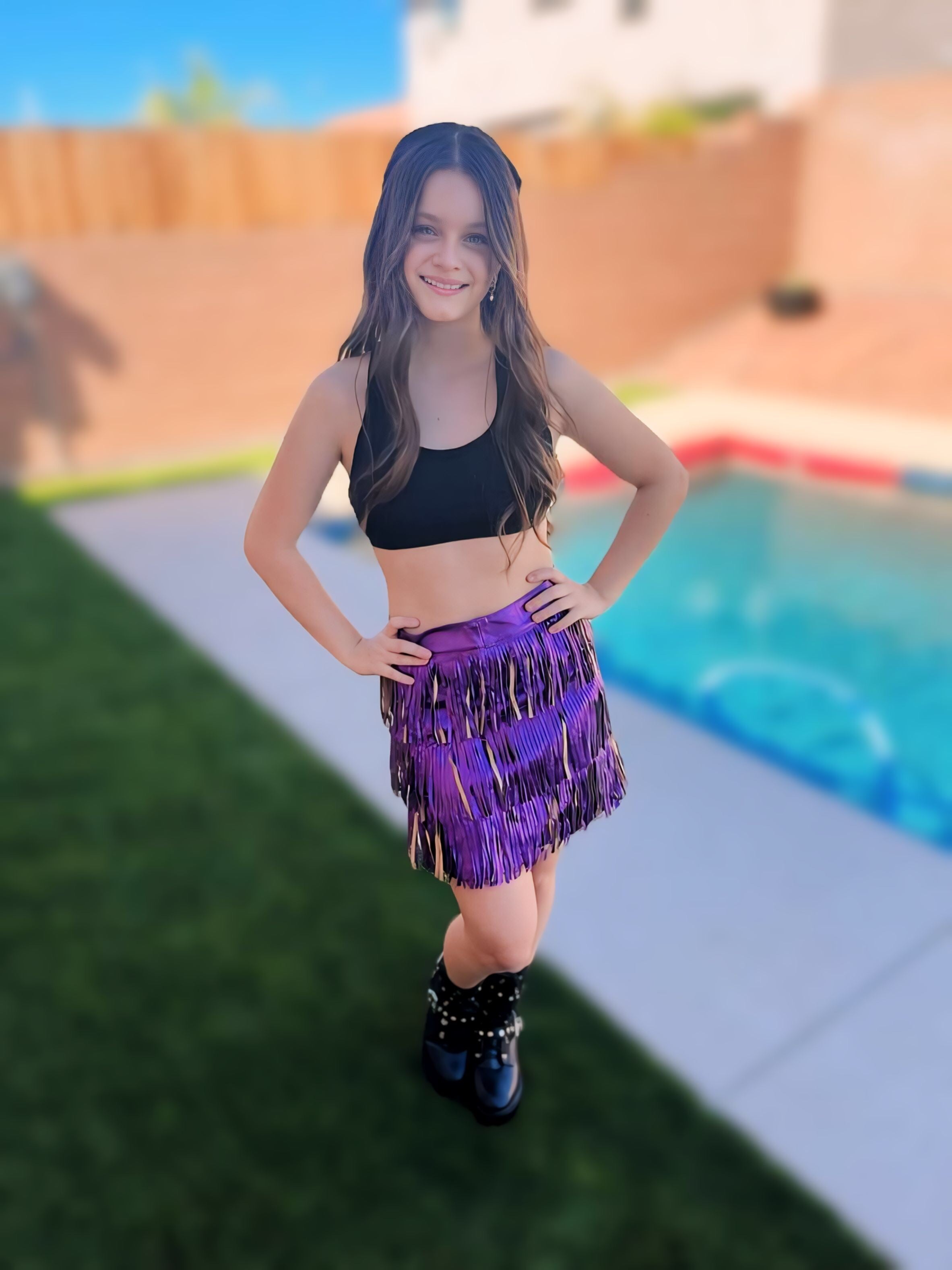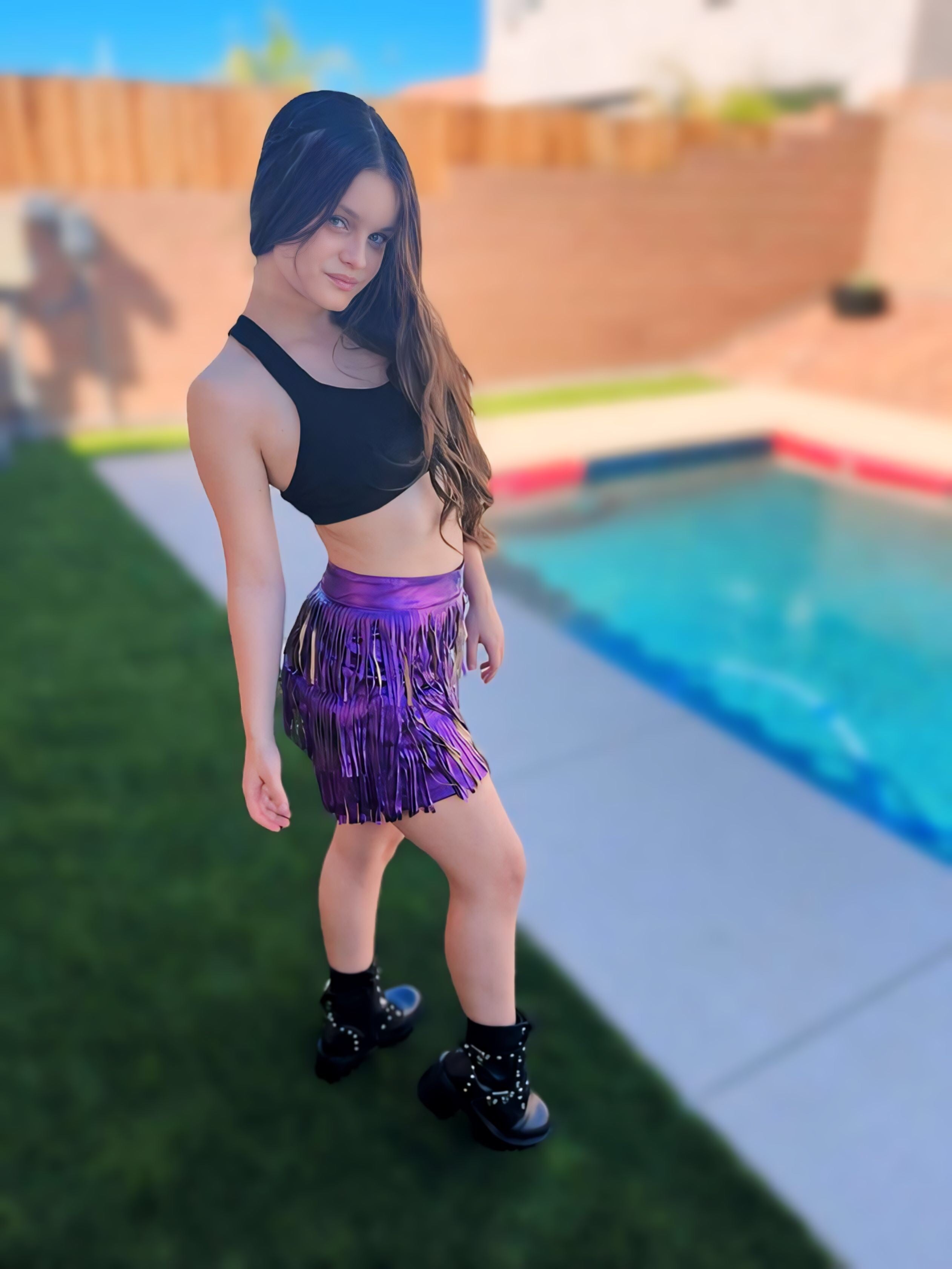 Turn heads with our Fringes cowgirl PU leather skirt that has all the latest trends combined. The PU pearlized shine gives the skirt a trendy look the tiered detailing adds a touch of elegance. Pair it with cowboy boots for a trendy Texas look ( see last pictures) with a yoga top hells and a jacket for a more polished look. The flower hair clip - dress brooch handmade to coordinate with skirt SELLS SEPARATELY.