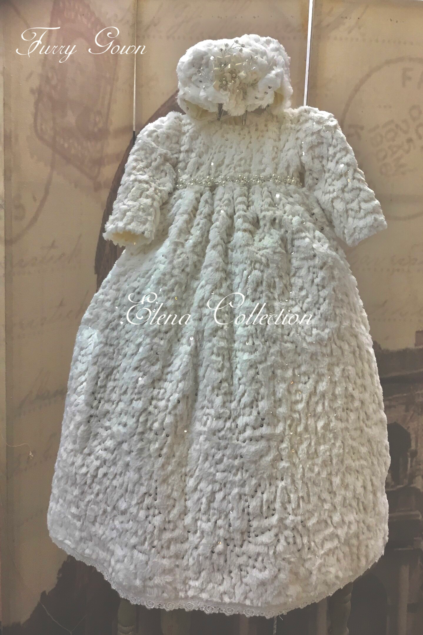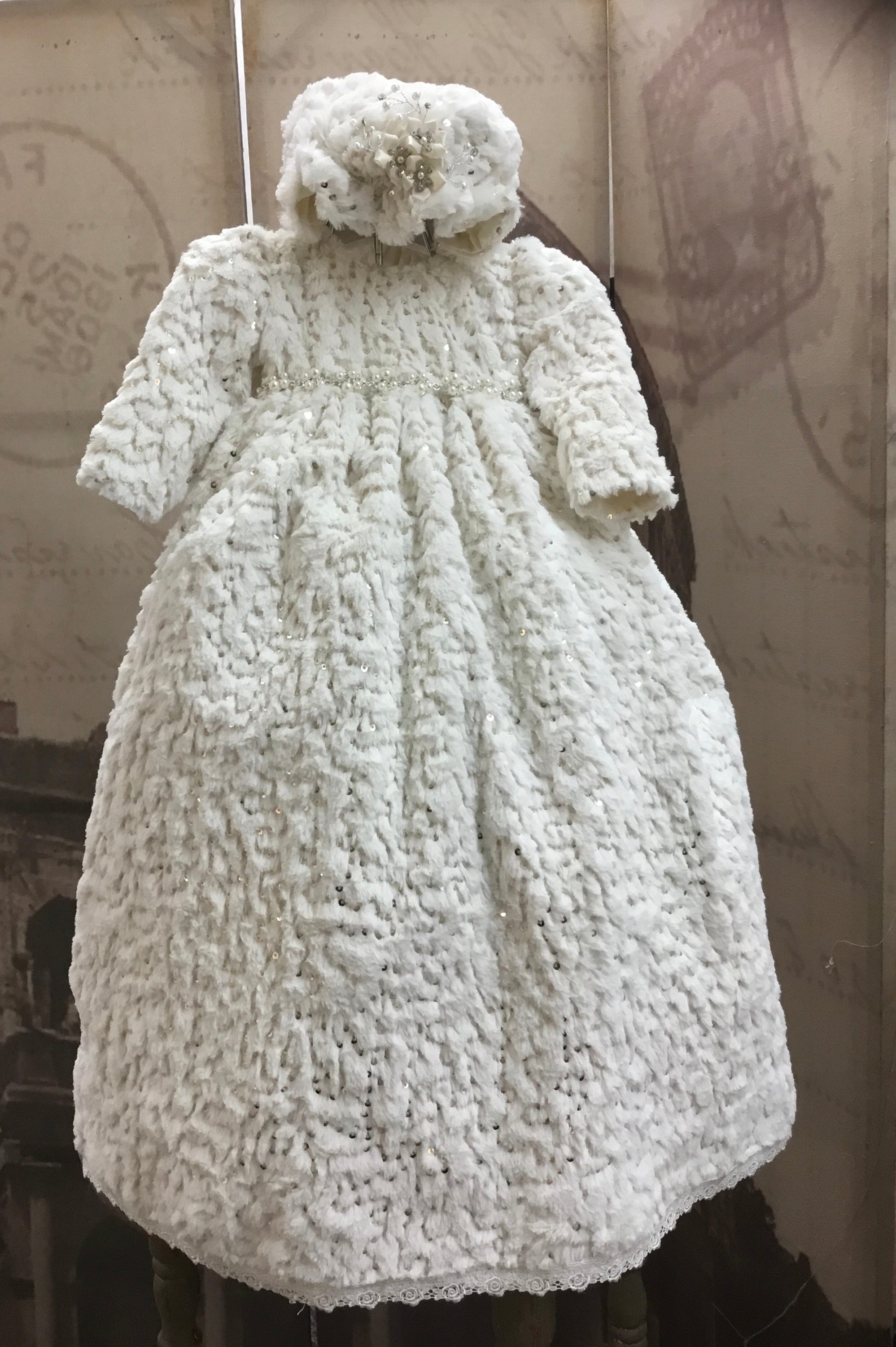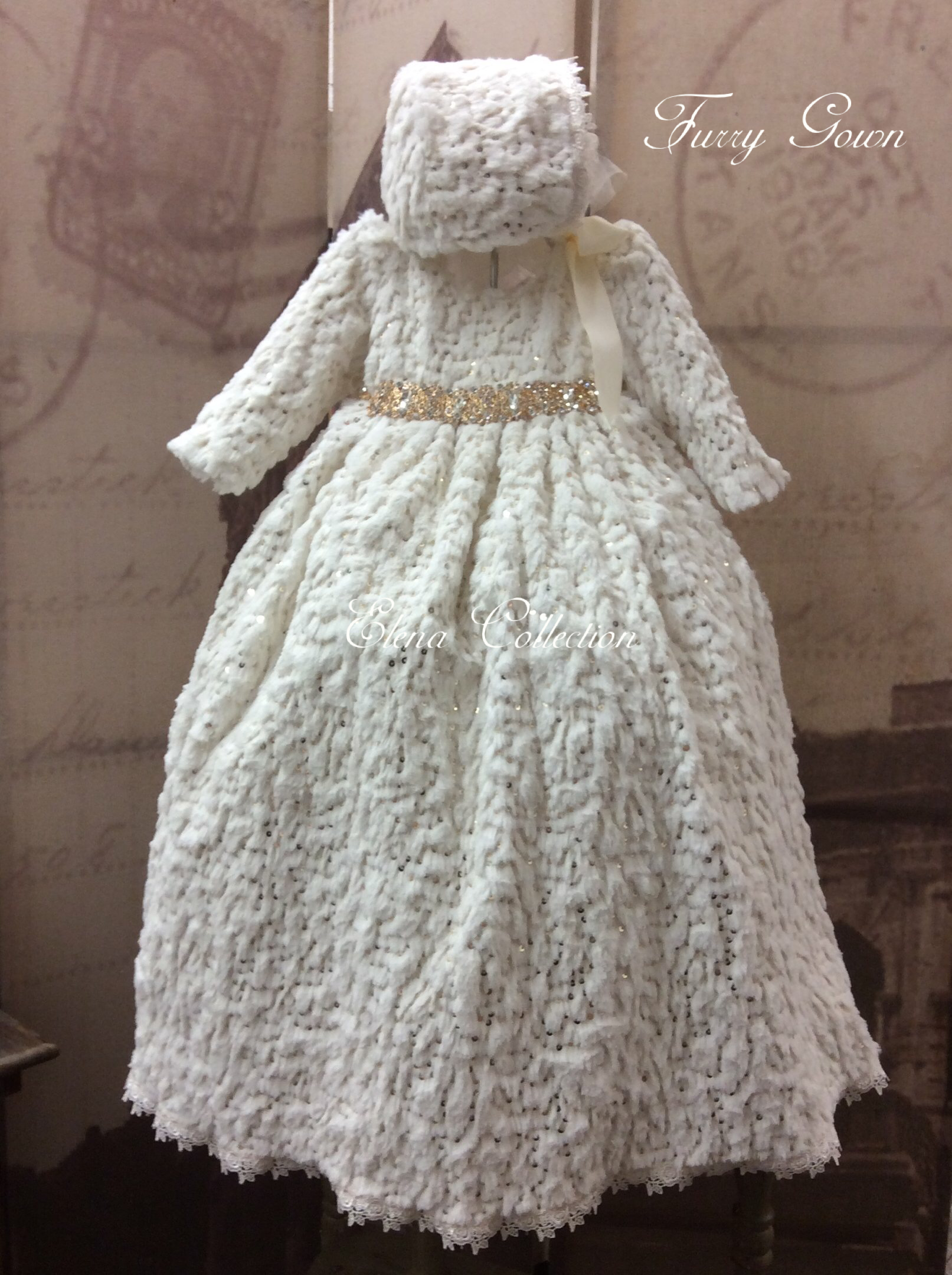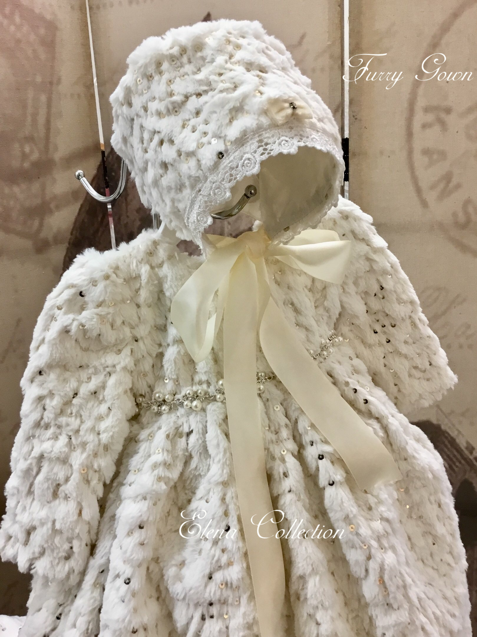 Wrap your baby in luxurious warmth with the Winter Furry Christening Gown. Crafted from soft faux fur and decorated with delicate sequins, this elegant gown features a timeless silhouette and a matching lace-trimmed bonnet with a satin bow. Fully lined and enhanced with a satin sash adorned with pearls and crystals, it’s designed for comfort and lasting heirloom quality. Fabrics and materials: - Ultra-soft faux fur - With gold sequins - Fully lined interior - Lace trim on bonnet - Satin sash with pearl and crystal embellishments Available in sizes newborn to 24 months. Dry clean only to preserve its exquisite details.