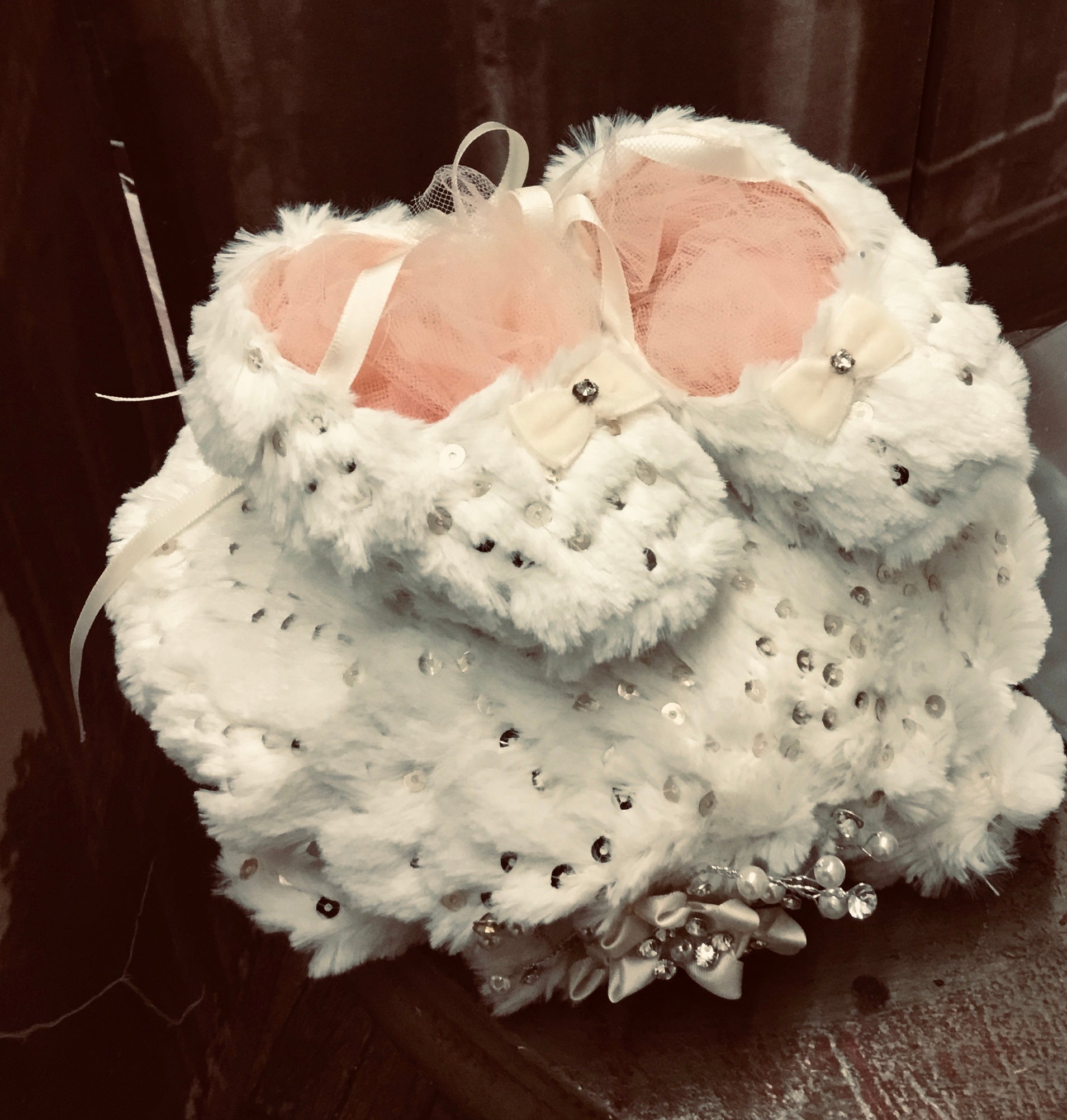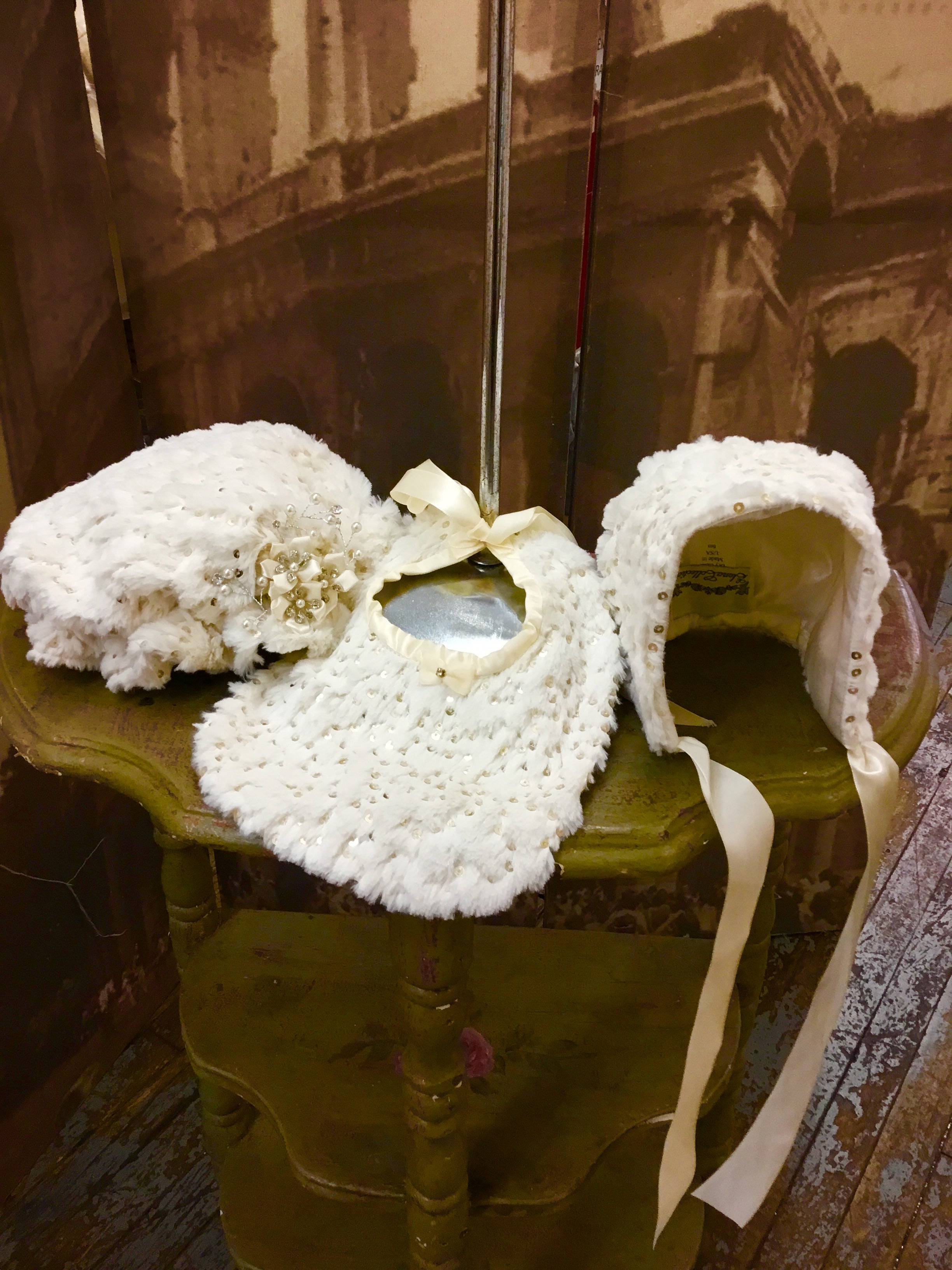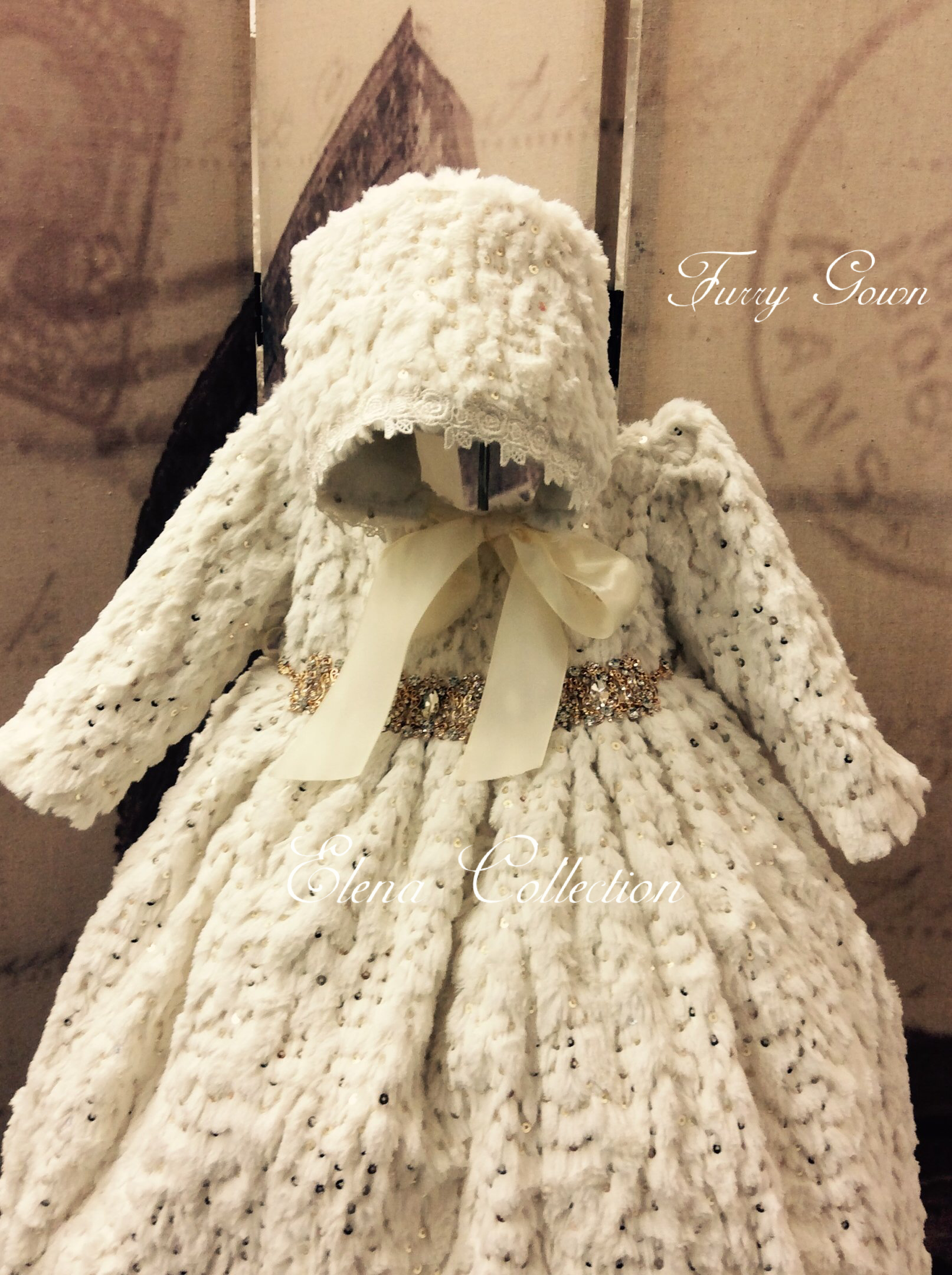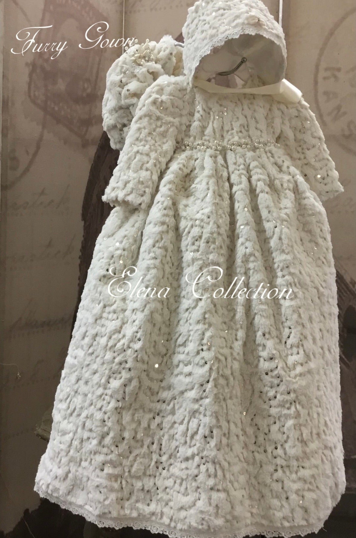 Wrap your baby in luxurious warmth with the Winter Furry Christening Gown. Crafted from soft faux fur and decorated with delicate sequins, this elegant gown features a timeless silhouette and a matching lace-trimmed bonnet with a satin bow. Fully lined and enhanced with a satin sash adorned with pearls and crystals, it’s designed for comfort and lasting heirloom quality. Fabrics and materials: - Ultra-soft faux fur - With gold sequins - Fully lined interior - Lace trim on bonnet - Satin sash with pearl and crystal embellishments Available in sizes newborn to 24 months. Dry clean only to preserve its exquisite details.