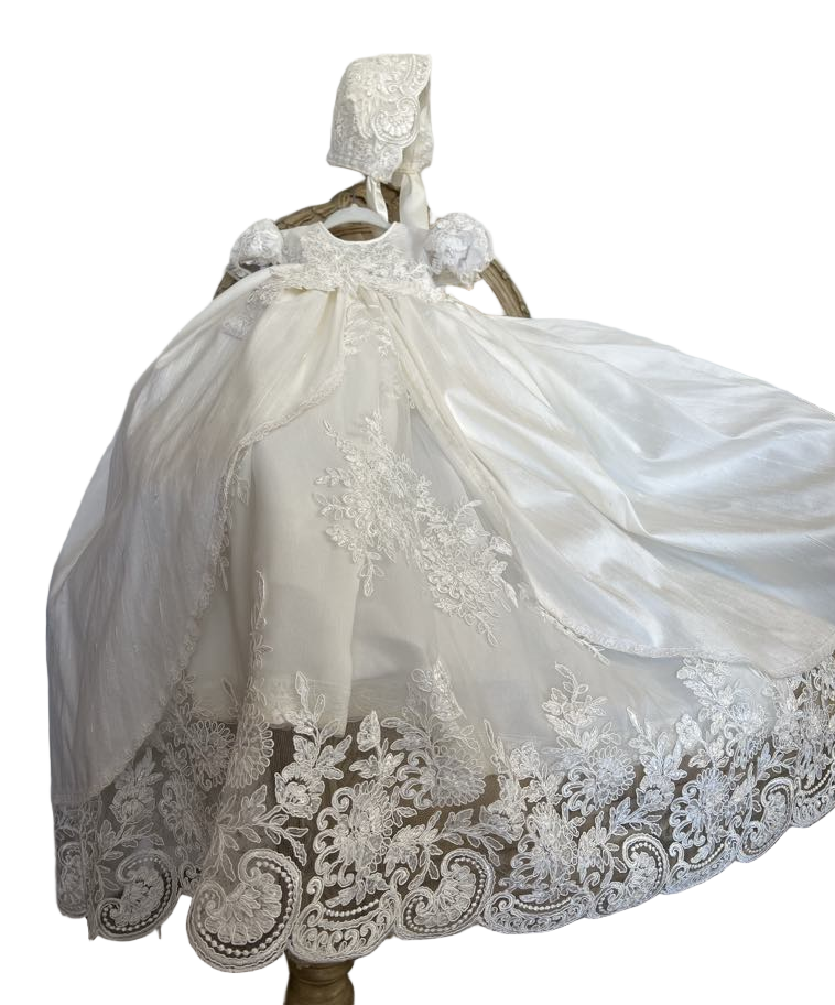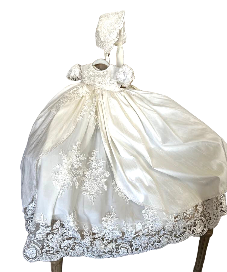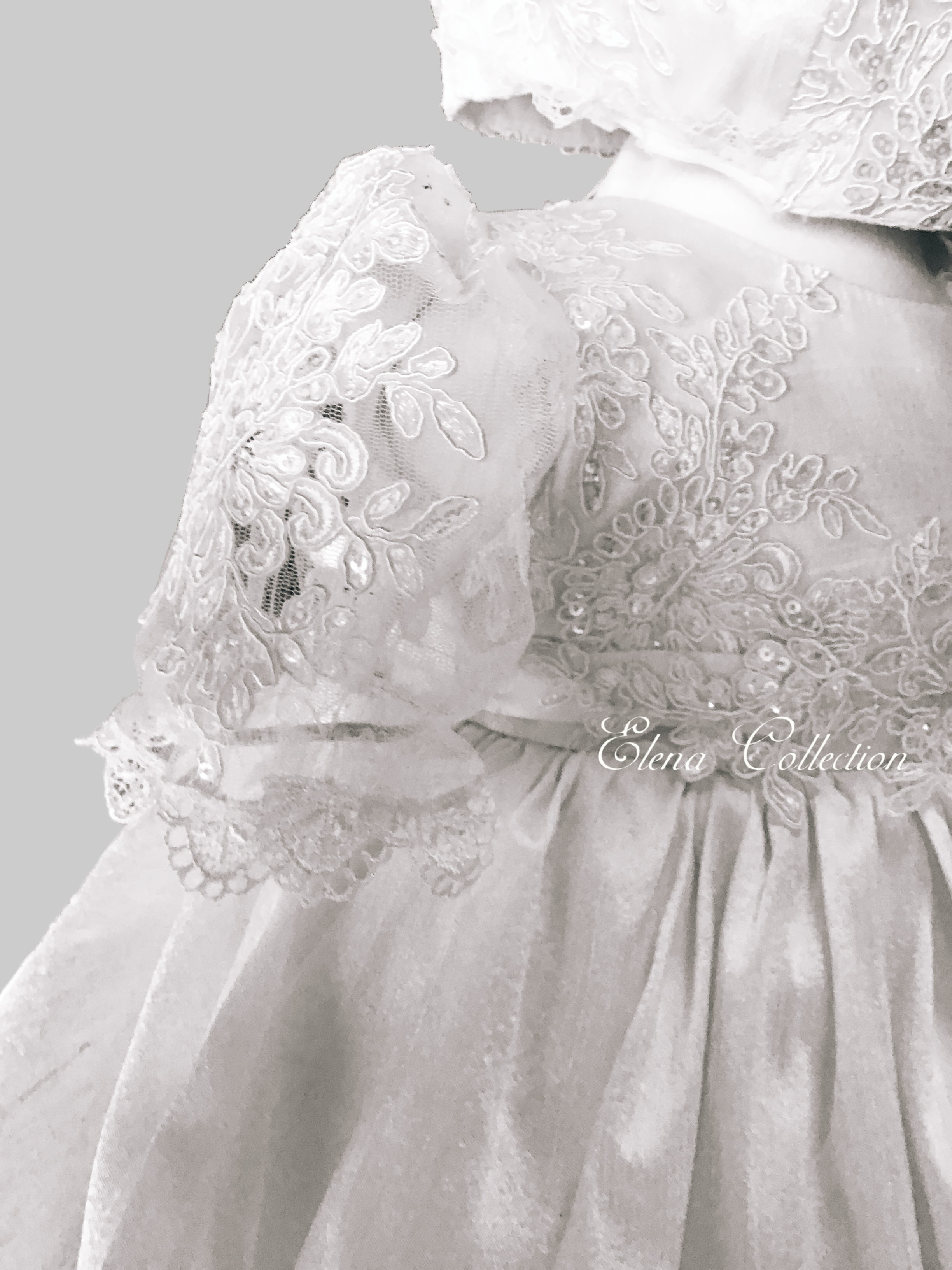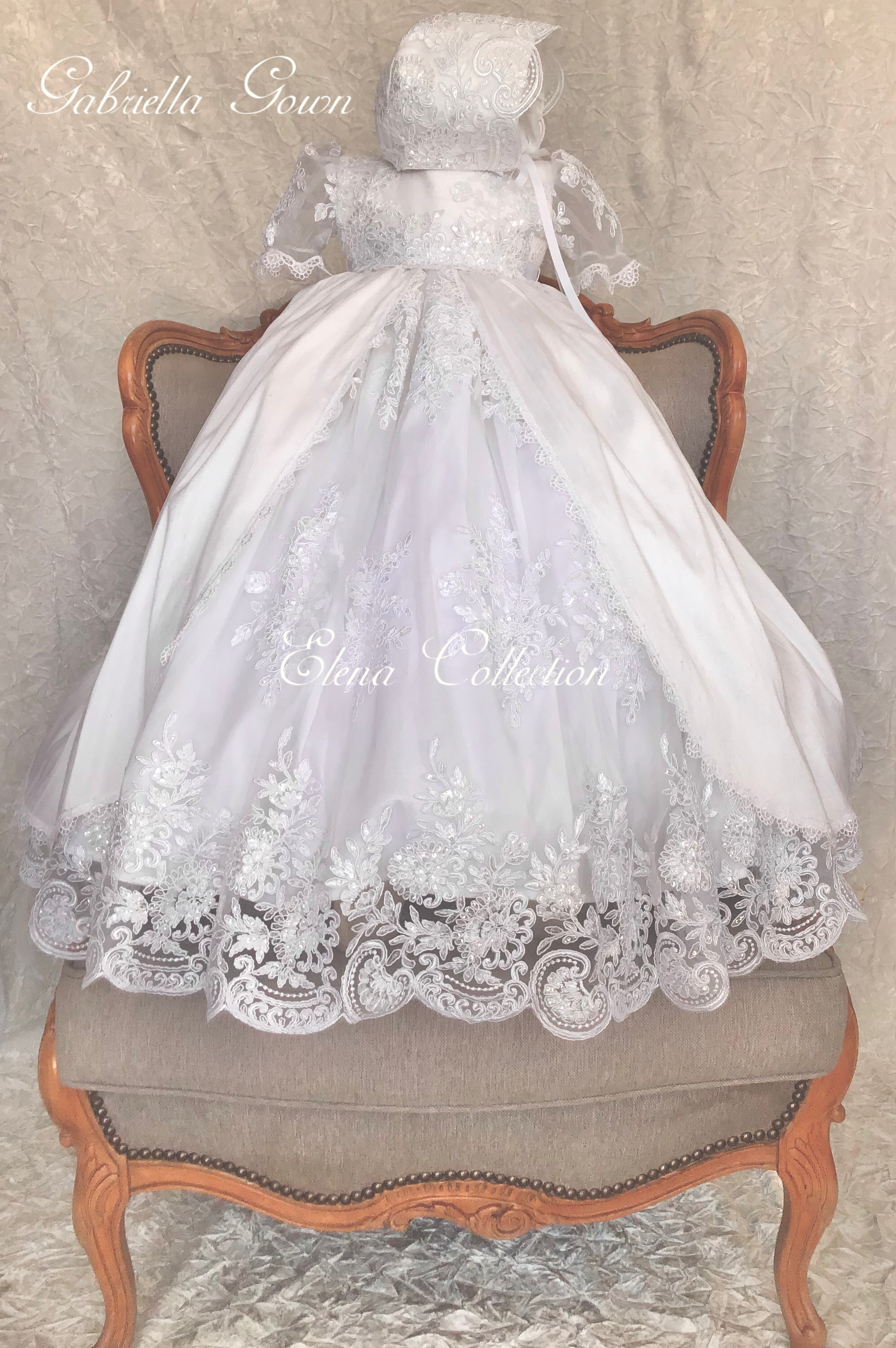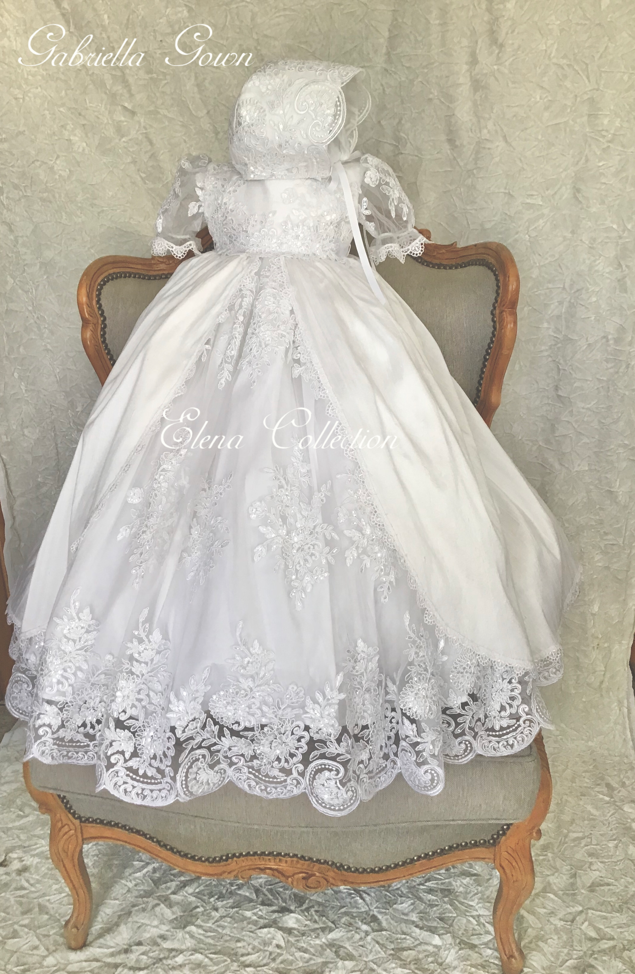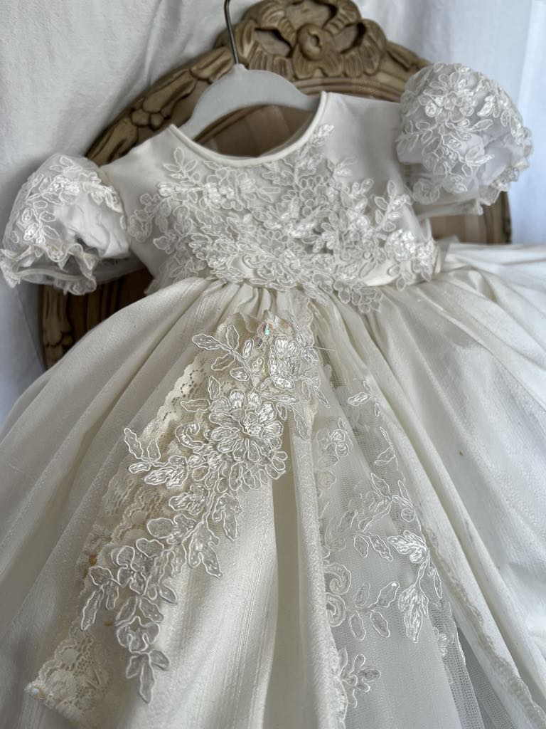 Gabriella combines classic elegance with a modern twist, featuring delicate sheer puff lace sleeves and a central sequined lace panel. The gown includes an overlay silk skirt with Venetian trim and an attached crinoline for fullness and seamless comfort. Each piece is handmade with meticulous care, creating a unique, luxurious garment meant to be cherished for generations. Fabrics: - Sheer puff lace - Lace sequins panel - Silk overlay skirt - Venetian lace trim