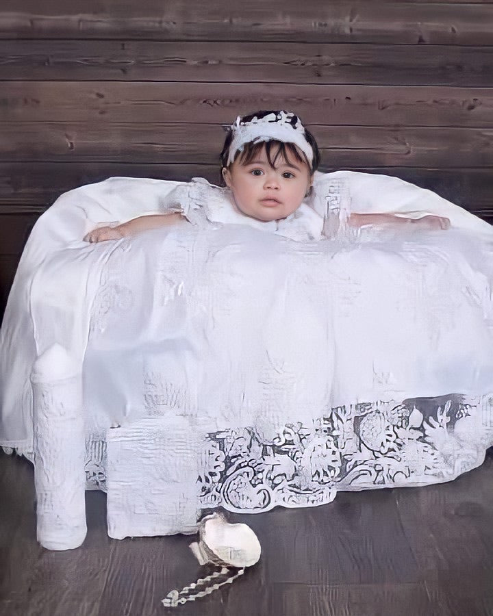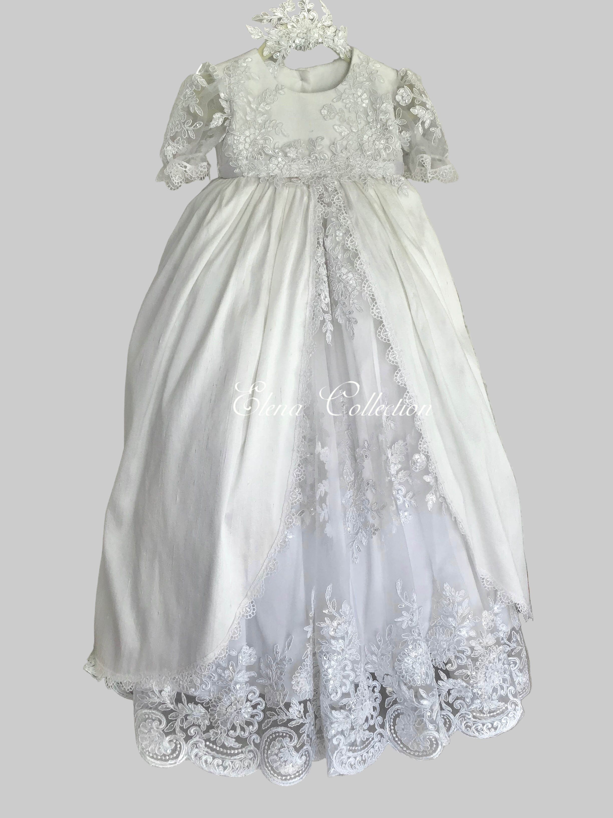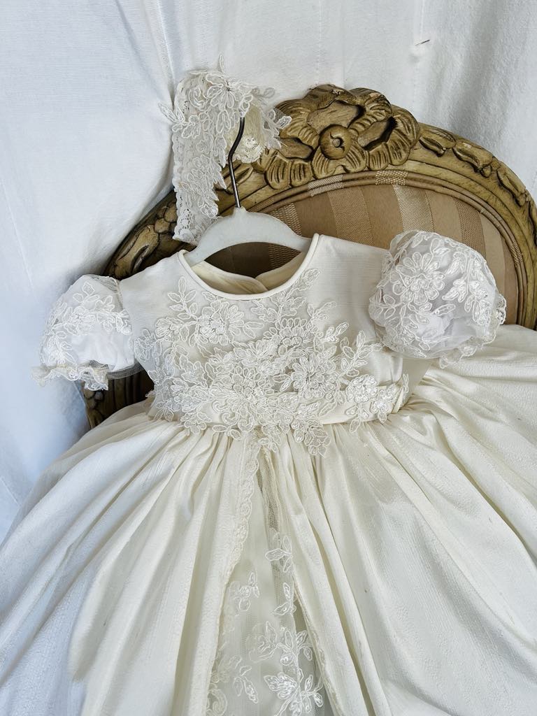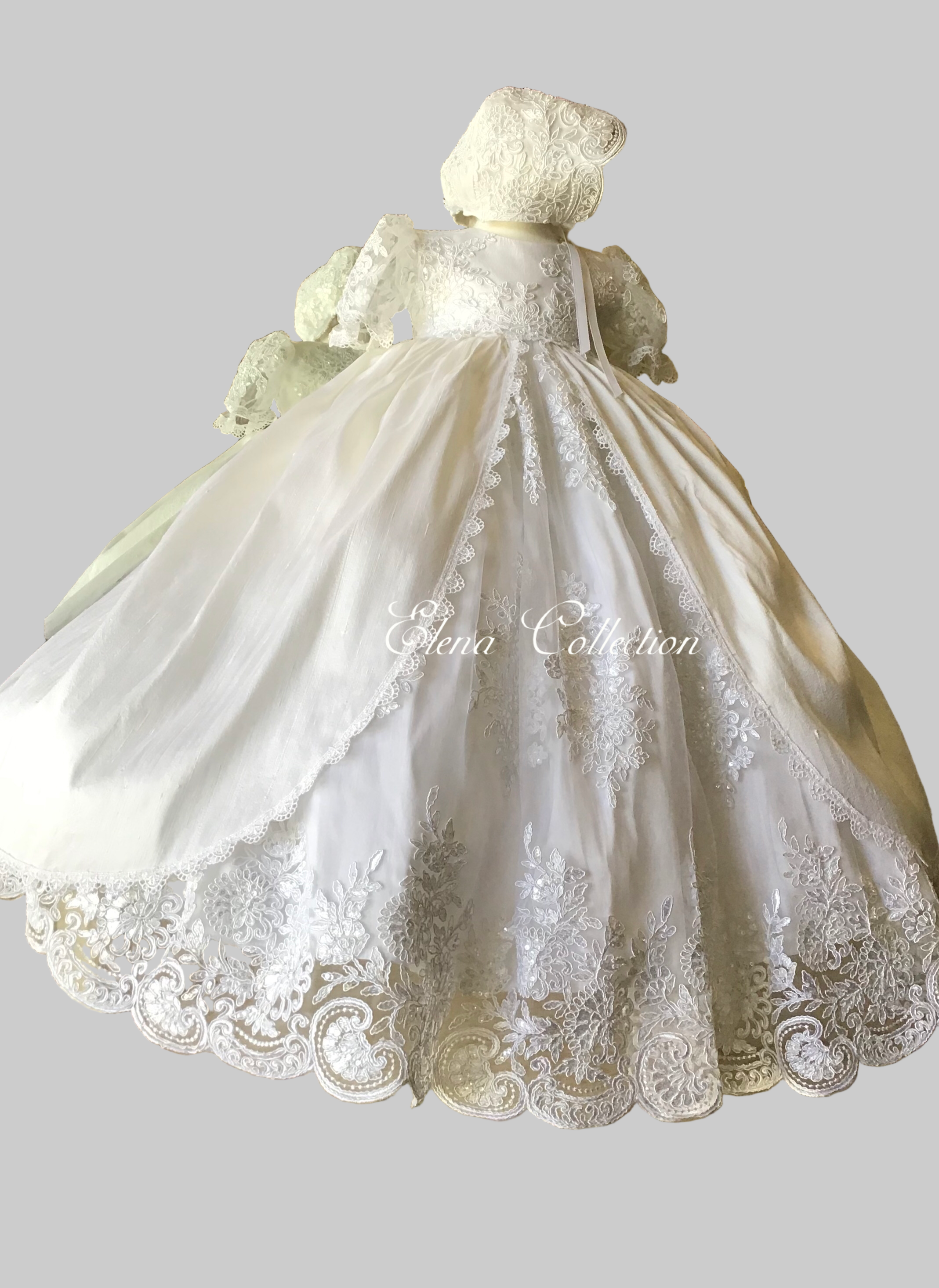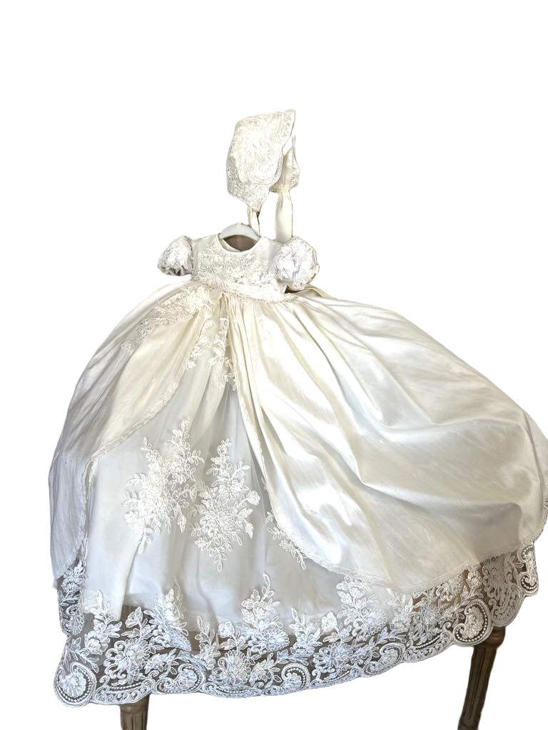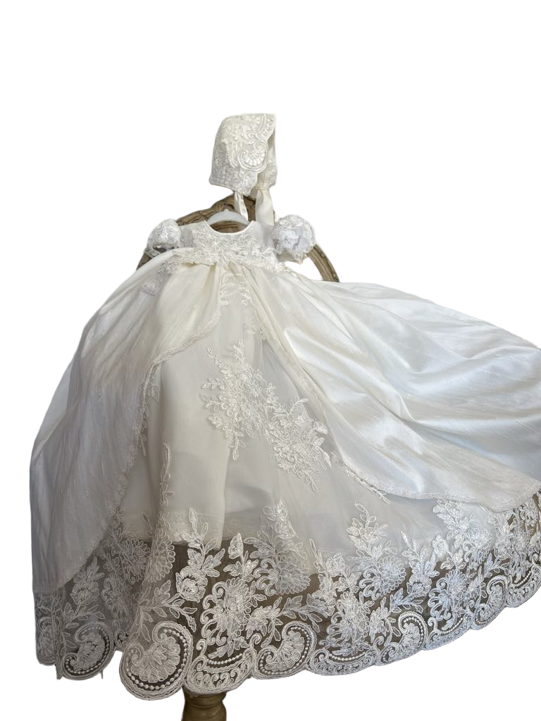Gabriella combines classic elegance with a modern twist, featuring delicate sheer puff lace sleeves and a central sequined lace panel. The gown includes an overlay silk skirt with Venetian trim and an attached crinoline for fullness and seamless comfort. Each piece is handmade with meticulous care, creating a unique, luxurious garment meant to be cherished for generations. Fabrics: - Sheer puff lace - Lace sequins panel - Silk overlay skirt - Venetian lace trim