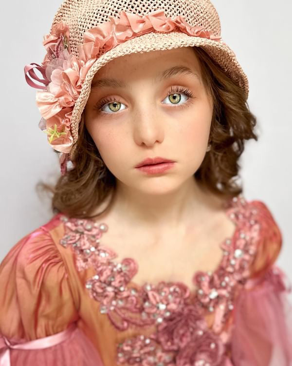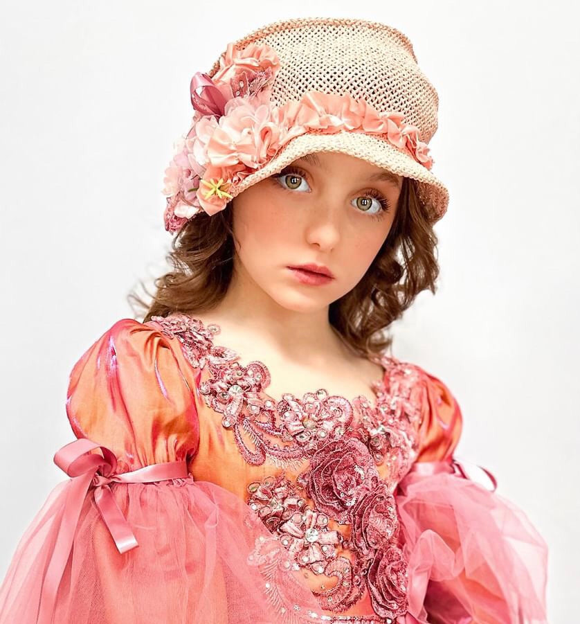 Elevate her look with this vintage-inspired girl’s hat, beautifully hand-dyed and decorated with an exquisite array of silk flowers, organza petals, and sequin accents. Each hat is a one-of-a-kind creation, blending soft blush, rose, and lavender tones for a romantic heirloom feel. The structured woven base is both lightweight and comfortable, making it ideal for portraits, weddings, tea parties, or runway-ready moments.