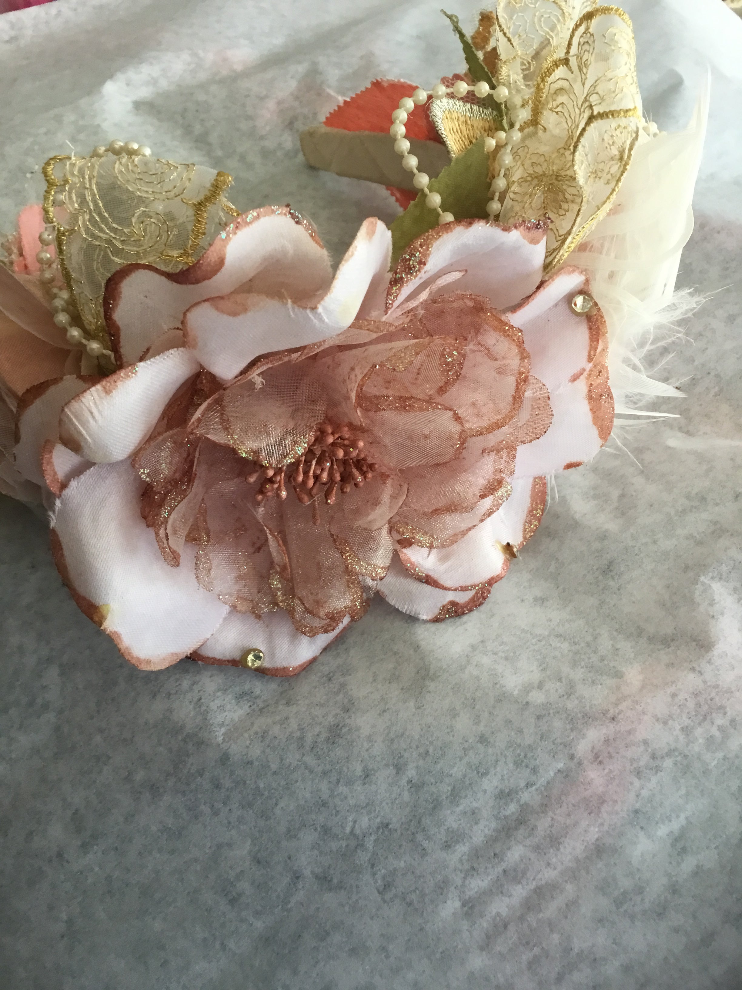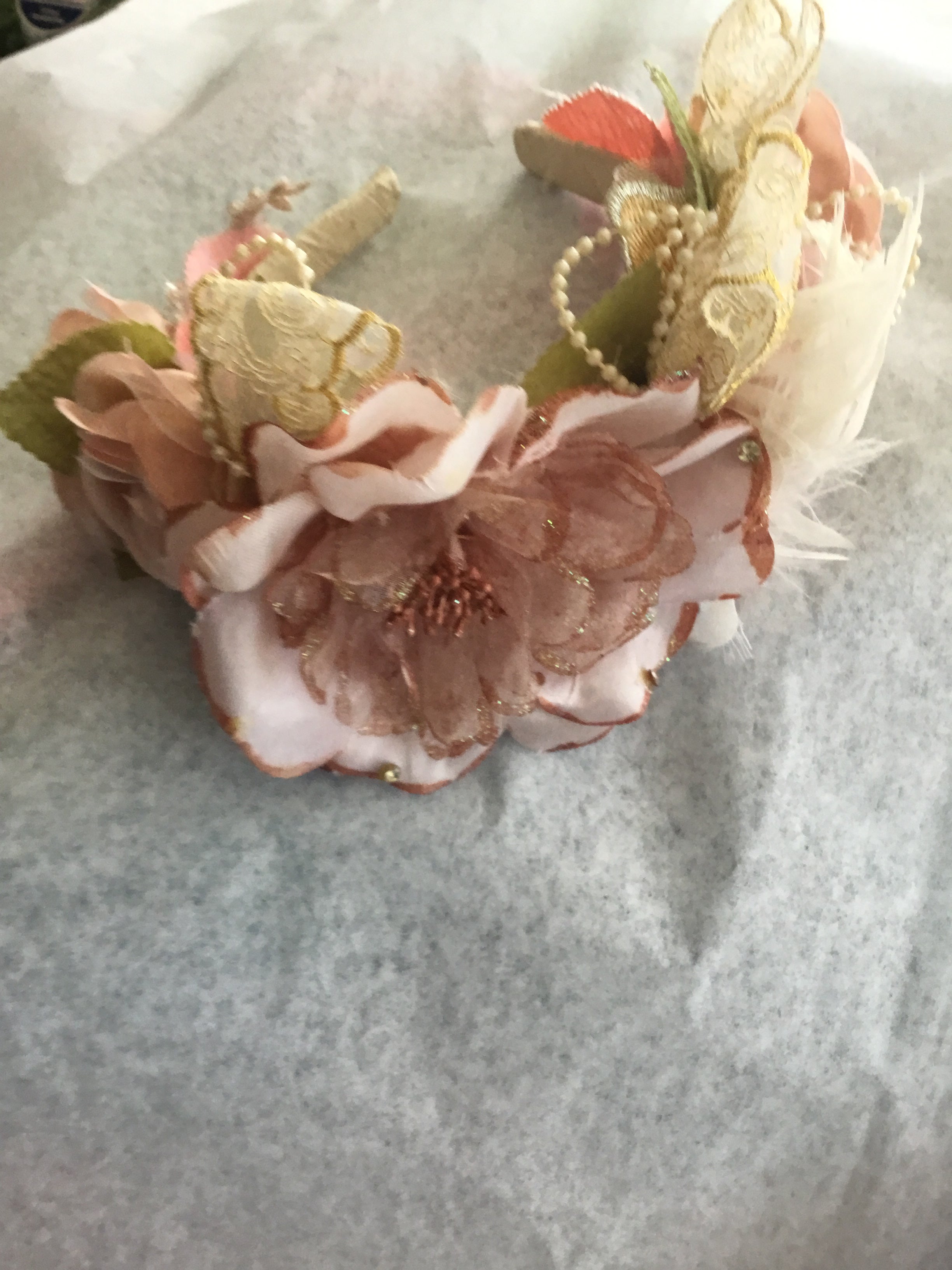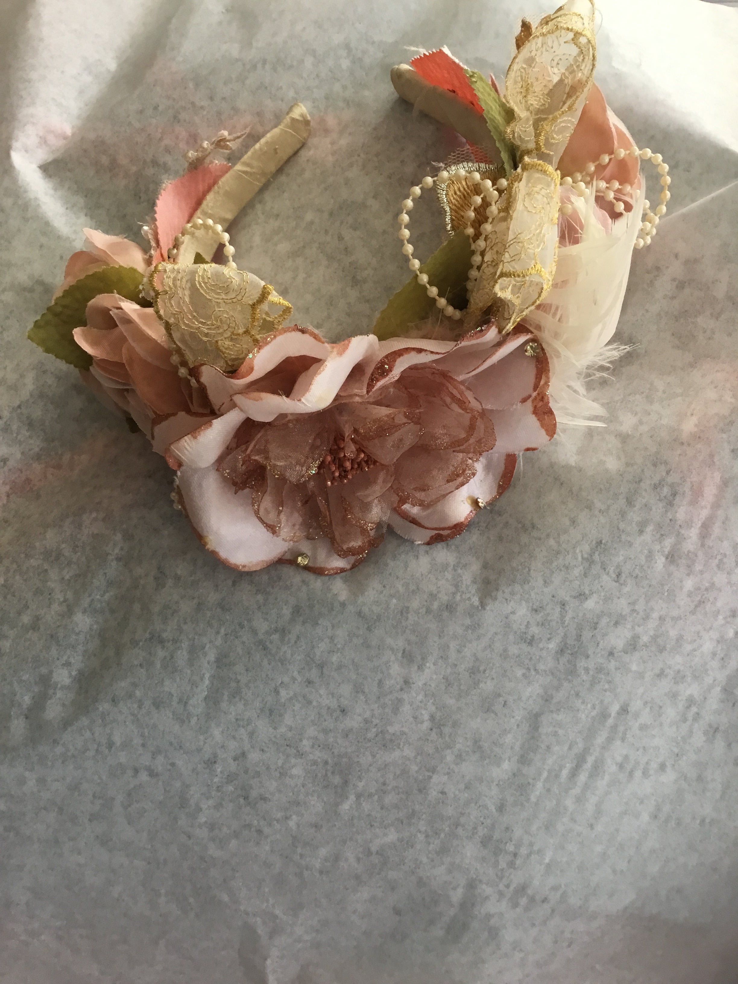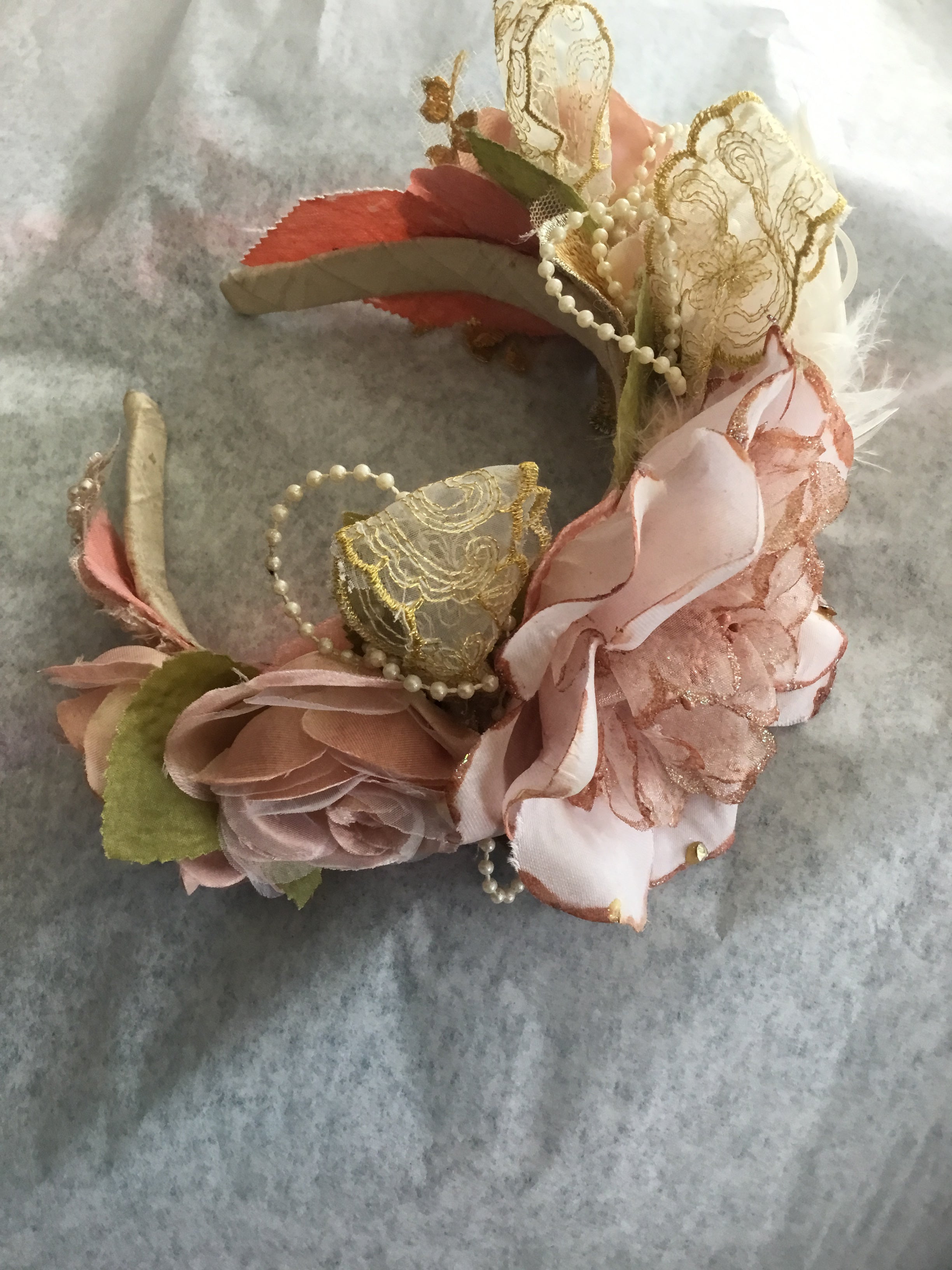 Each bloom is individually crafted from upcycled silks and lace, carefully tinted by hand to achieve soft blush and antique rose tones. Golden lace, delicate pearls, and feather details intertwine to create a crown that feels both regal and ethereal.
