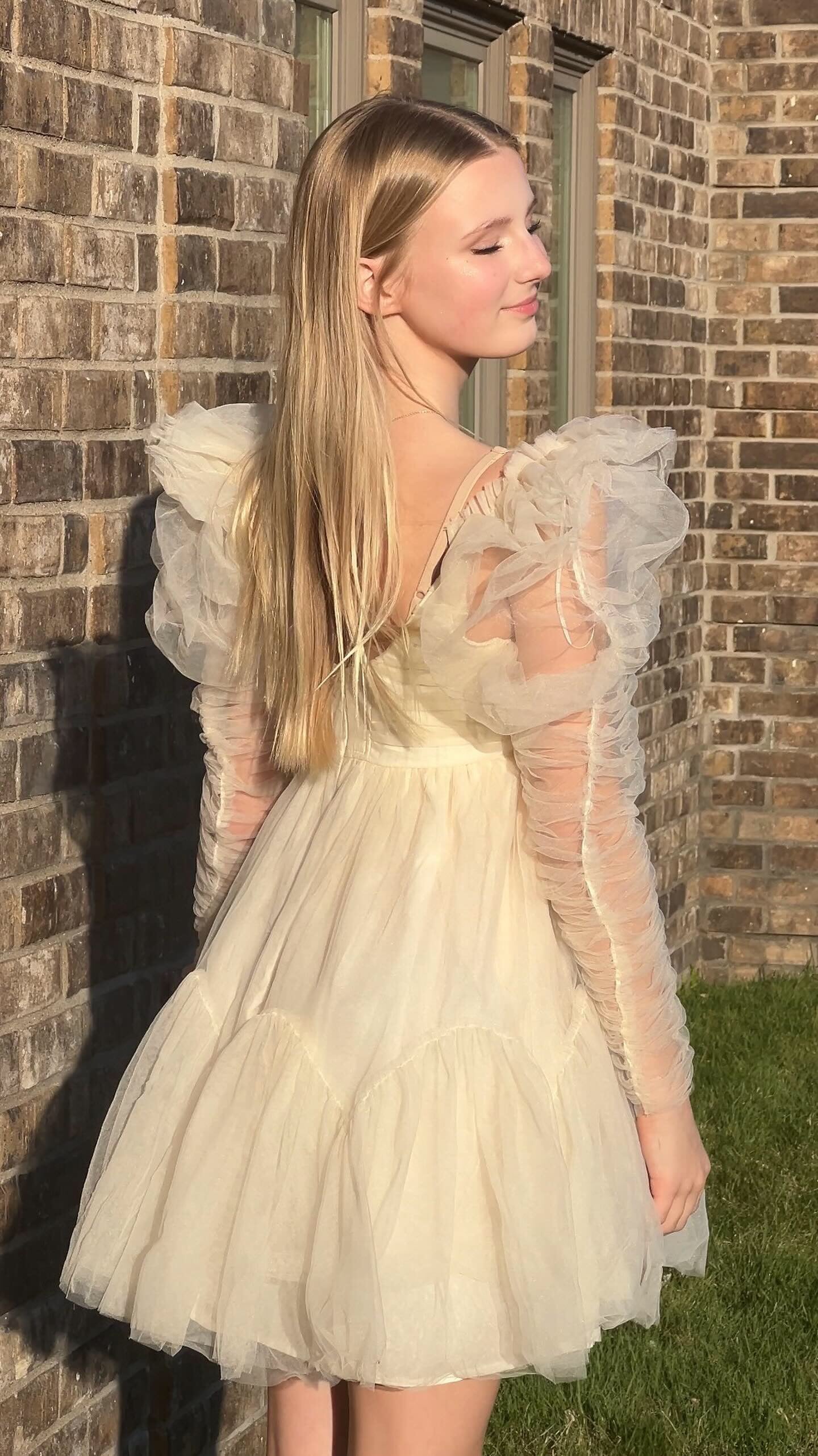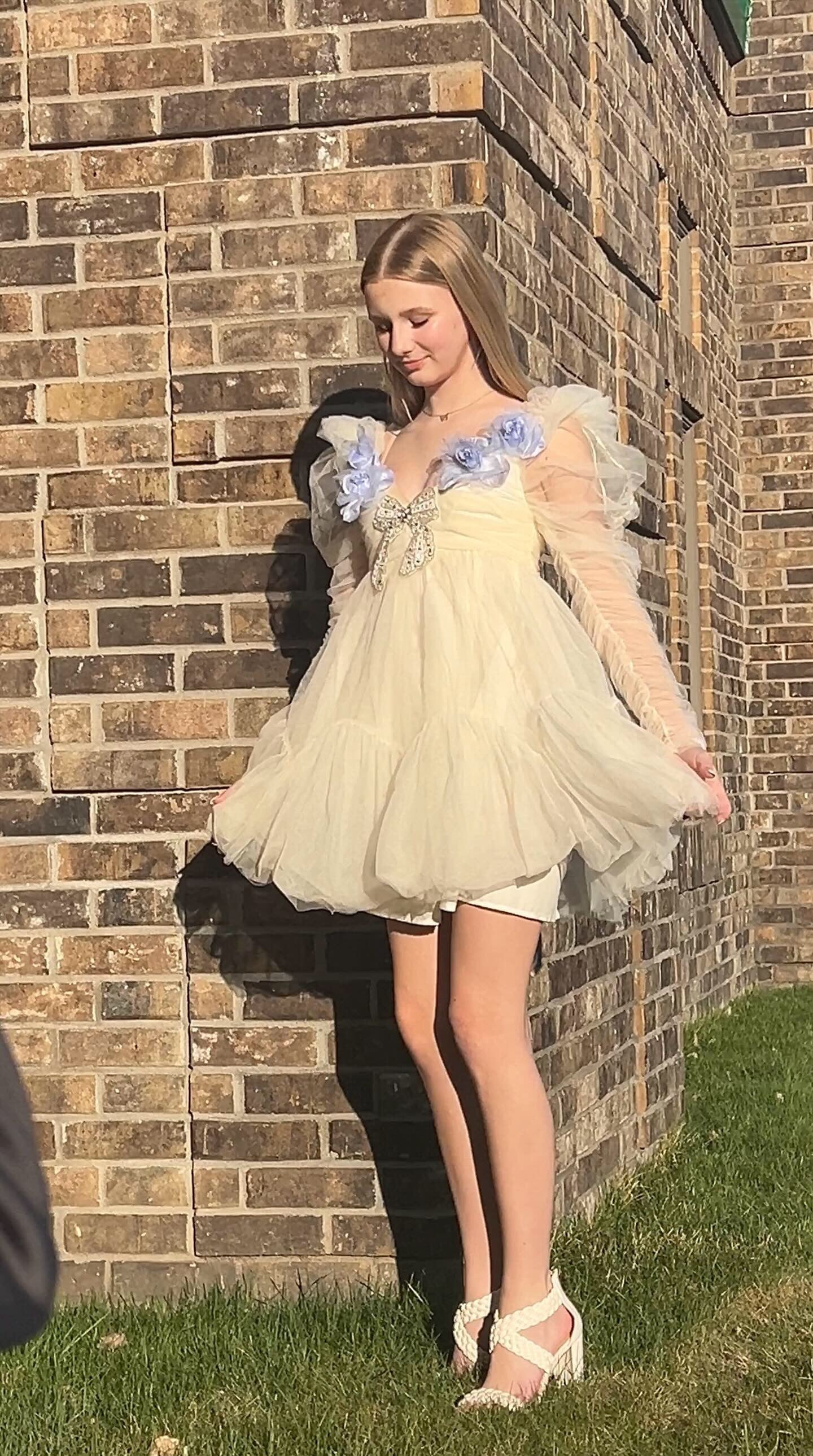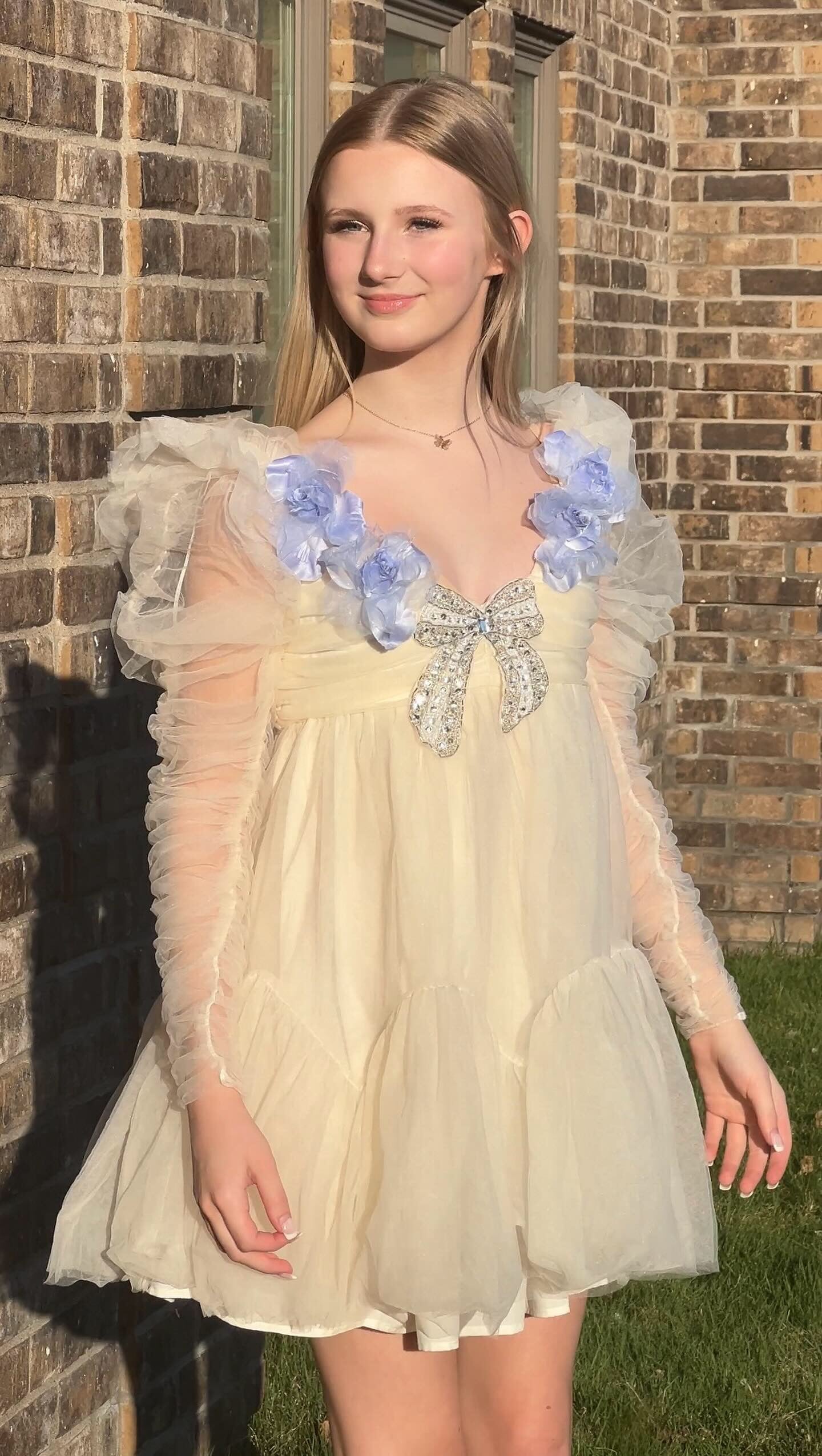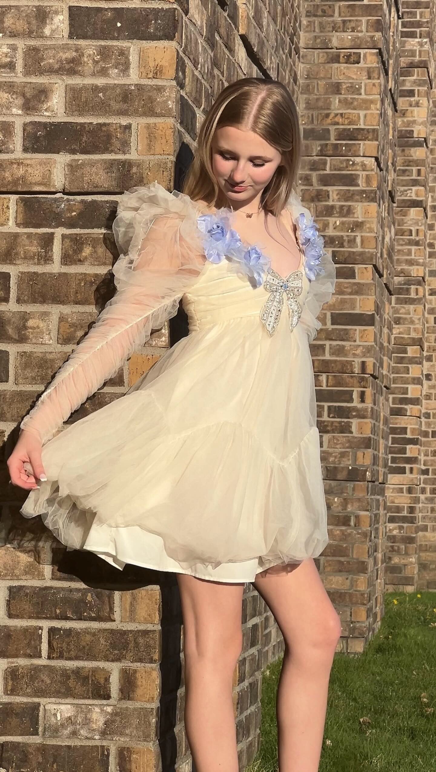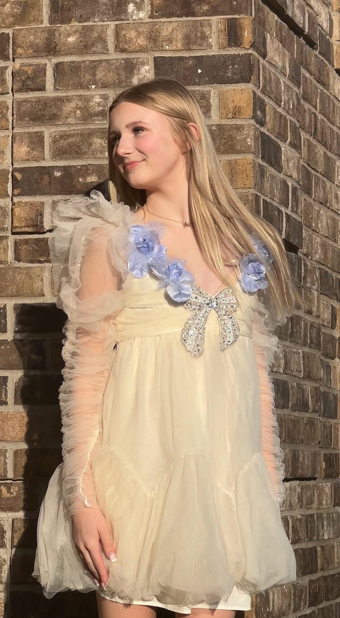 Ivory long sleeve ethereal dress with blue velvet organdy flower around the front of the neckline and a beautiful beaded had sewn beaded bow in the middle. The gorgeous dress can be worn for any special occasion by changing your shoes! Even cowboys boots can be fun with it.