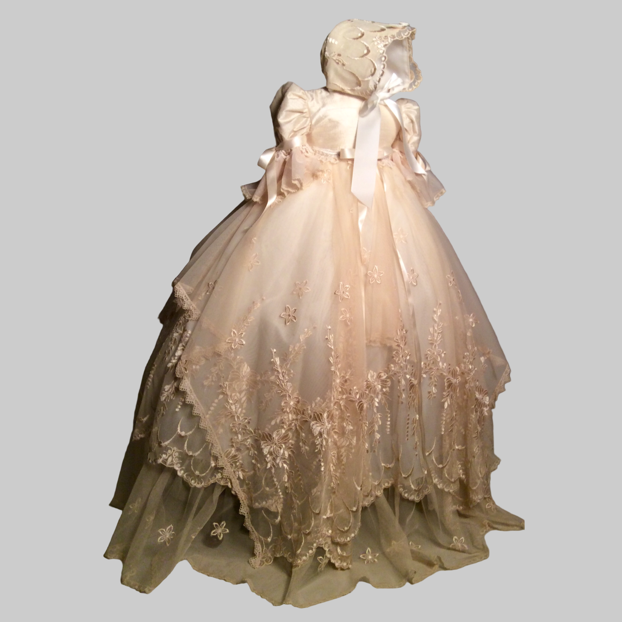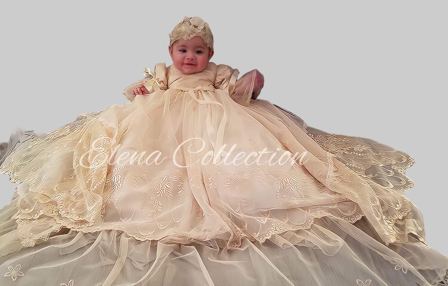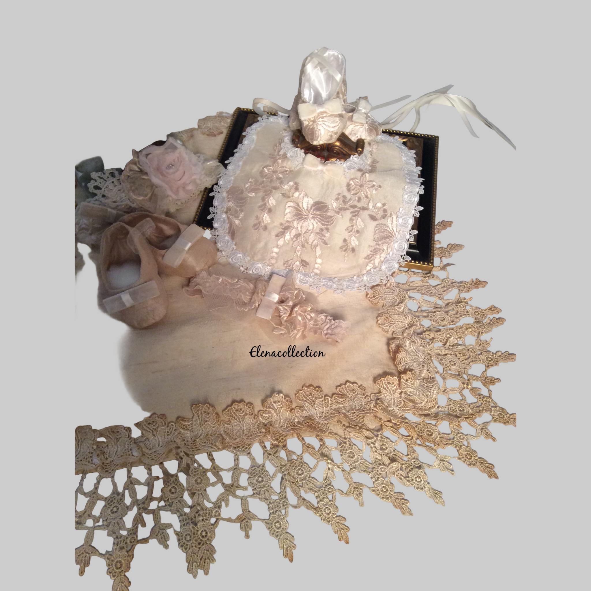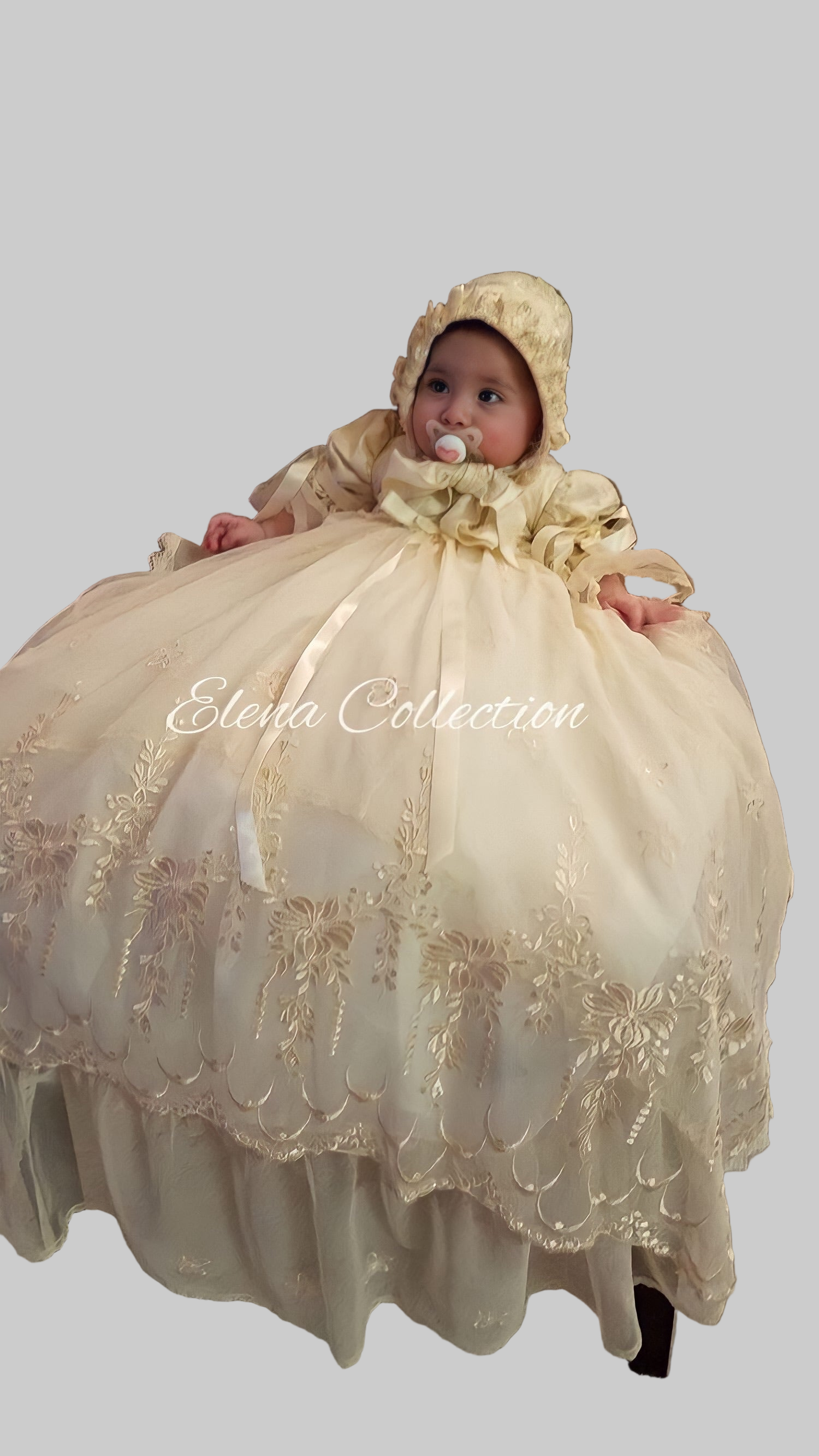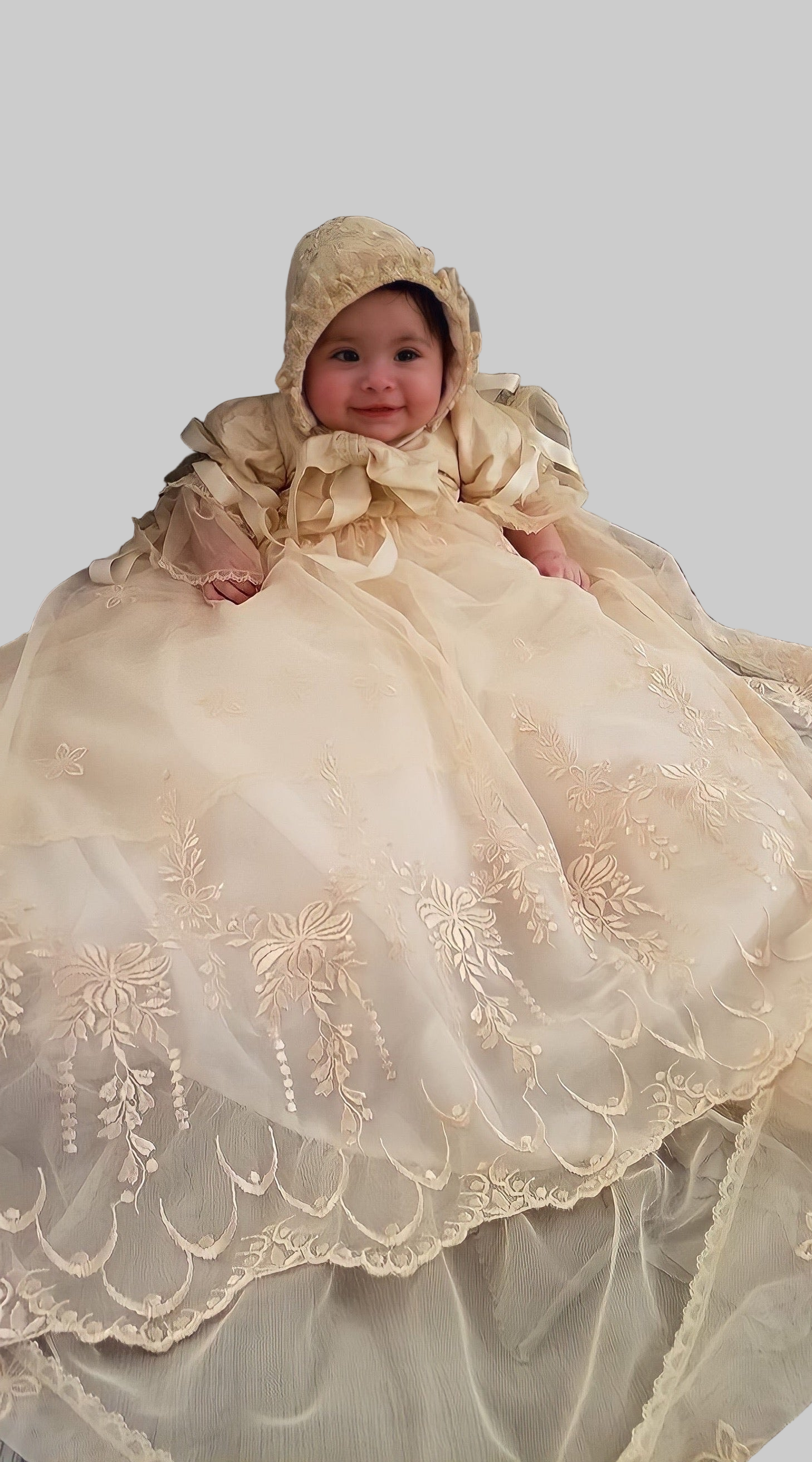 The Jessenia Christening Gown with Bonnet is a finely handmade heirloom piece inspired by vintage French designs. Crafted from soft embroidered lace and handmade silk with a delicate tulle neckline and flutter sleeves, it combines elegance with comfort. Each gown is made to order with precision sizing to ensure the perfect fit. Available in vintage Ivory, it ships worldwide from California. Accessories are sold separately. Dry clean only. Faster shipping options are available for your convenience.
