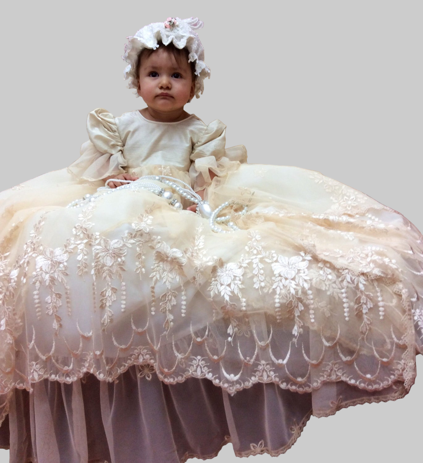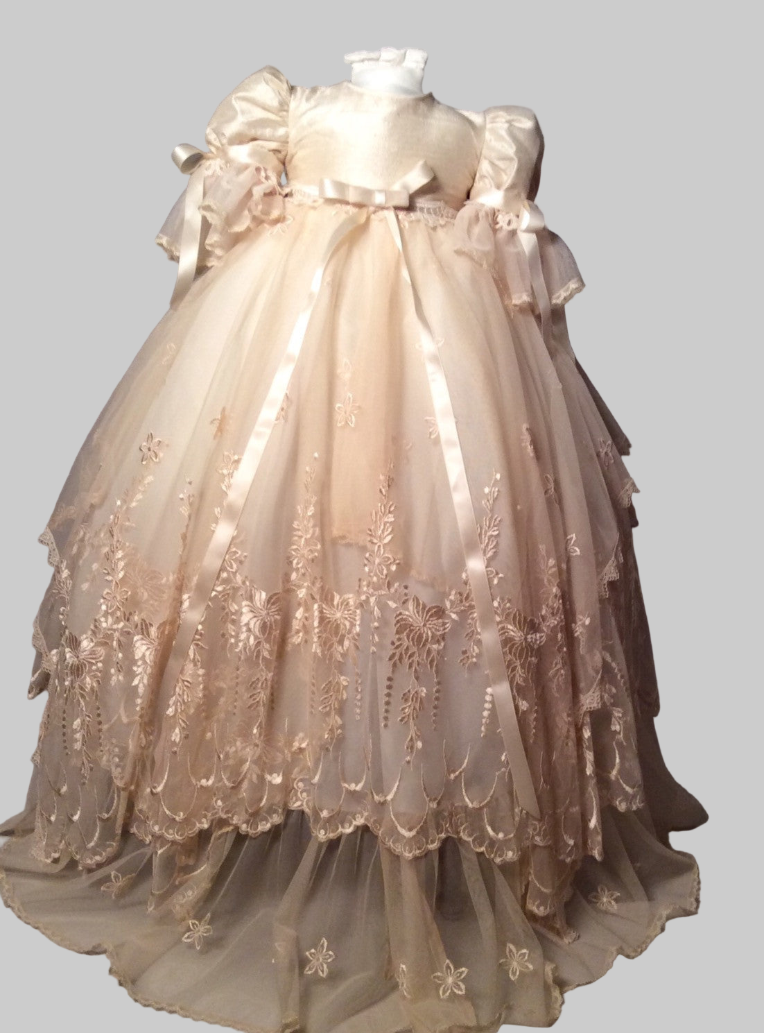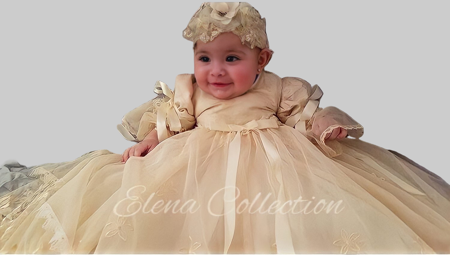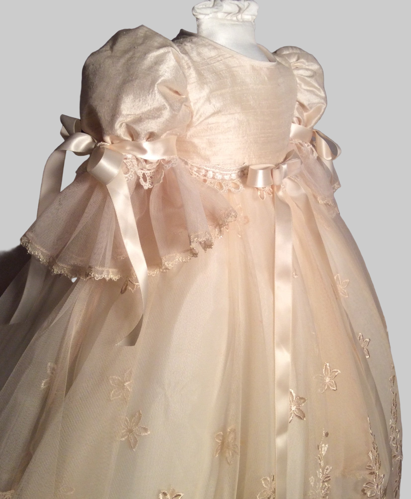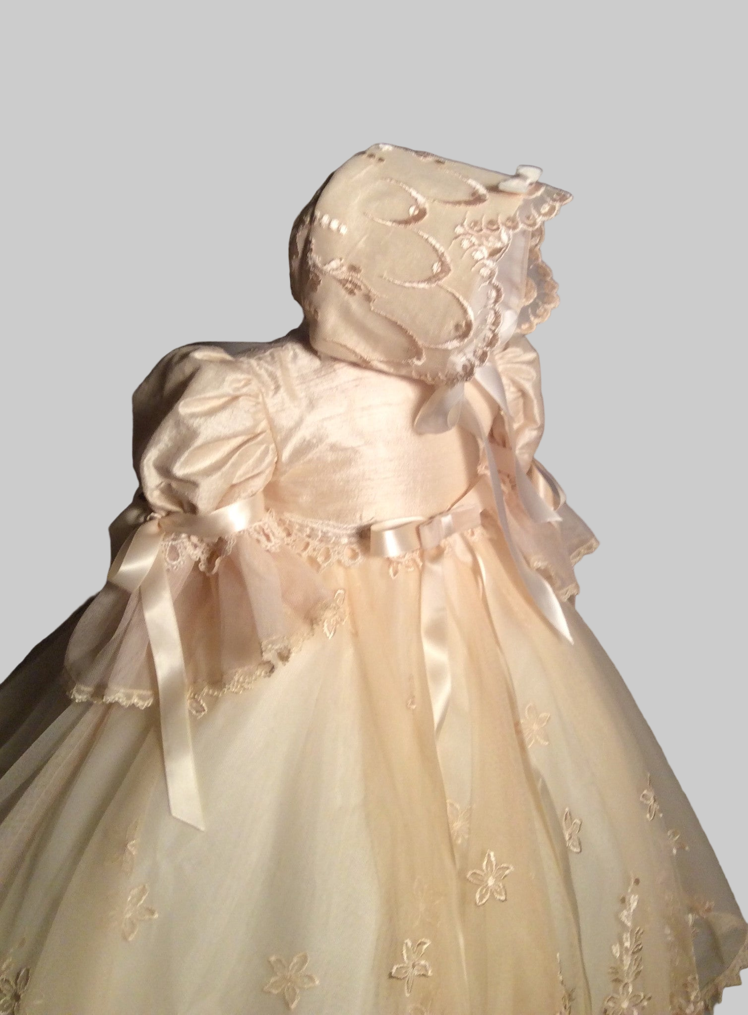 The Jessenia Christening Gown with Bonnet is a finely handmade heirloom piece inspired by vintage French designs. Crafted from soft embroidered lace and handmade silk with a delicate tulle neckline and flutter sleeves, it combines elegance with comfort. Each gown is made to order with precision sizing to ensure the perfect fit. Available in vintage Ivory, it ships worldwide from California. Accessories are sold separately. Dry clean only. Faster shipping options are available for your convenience.