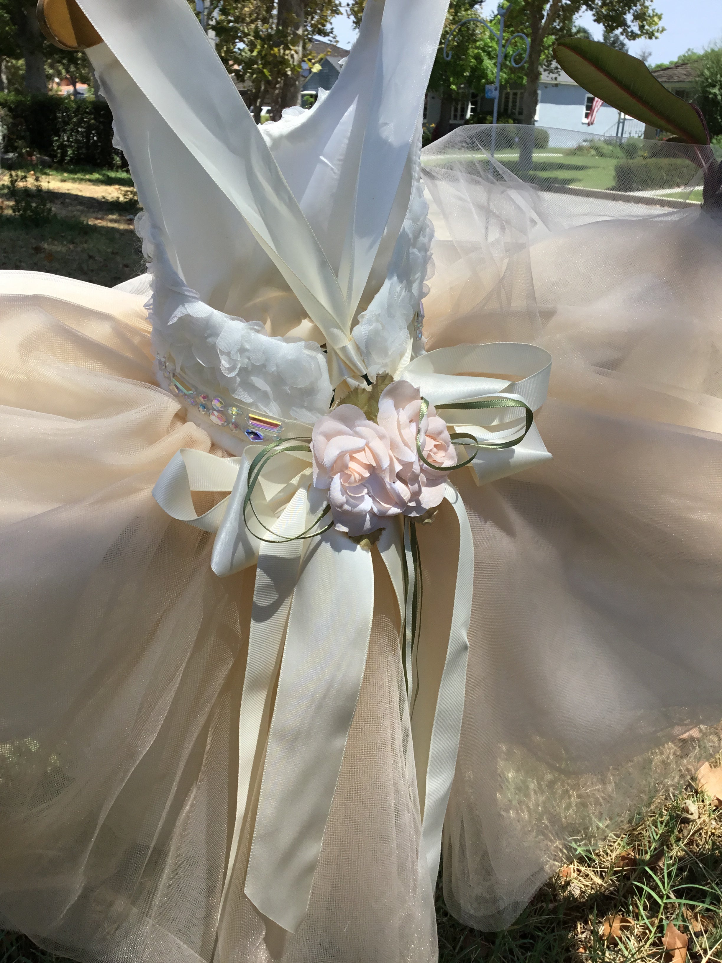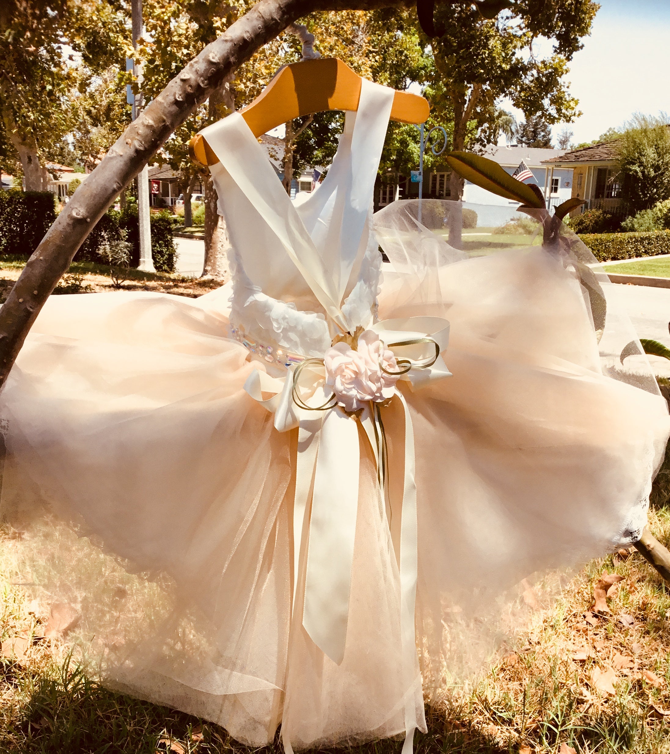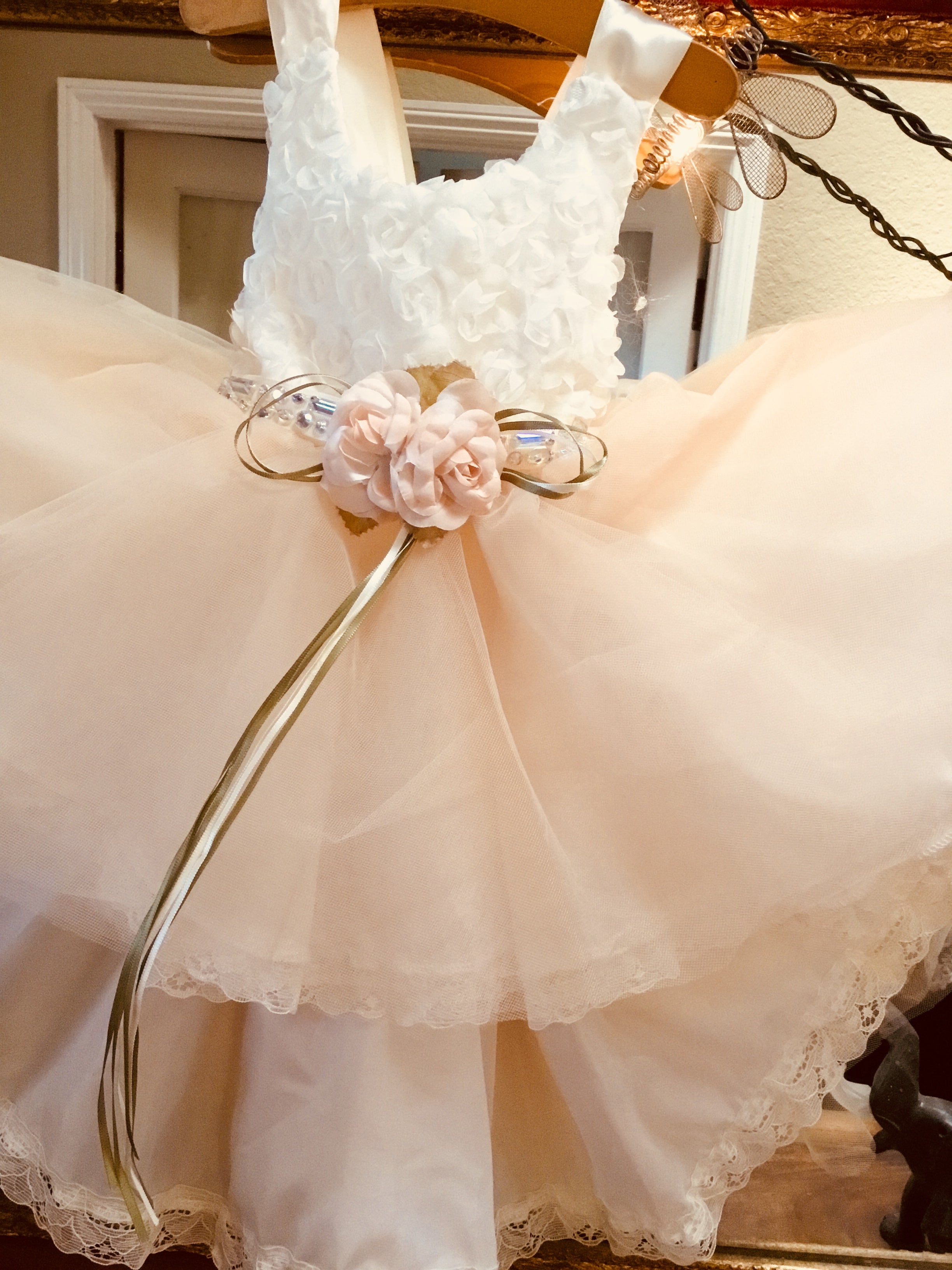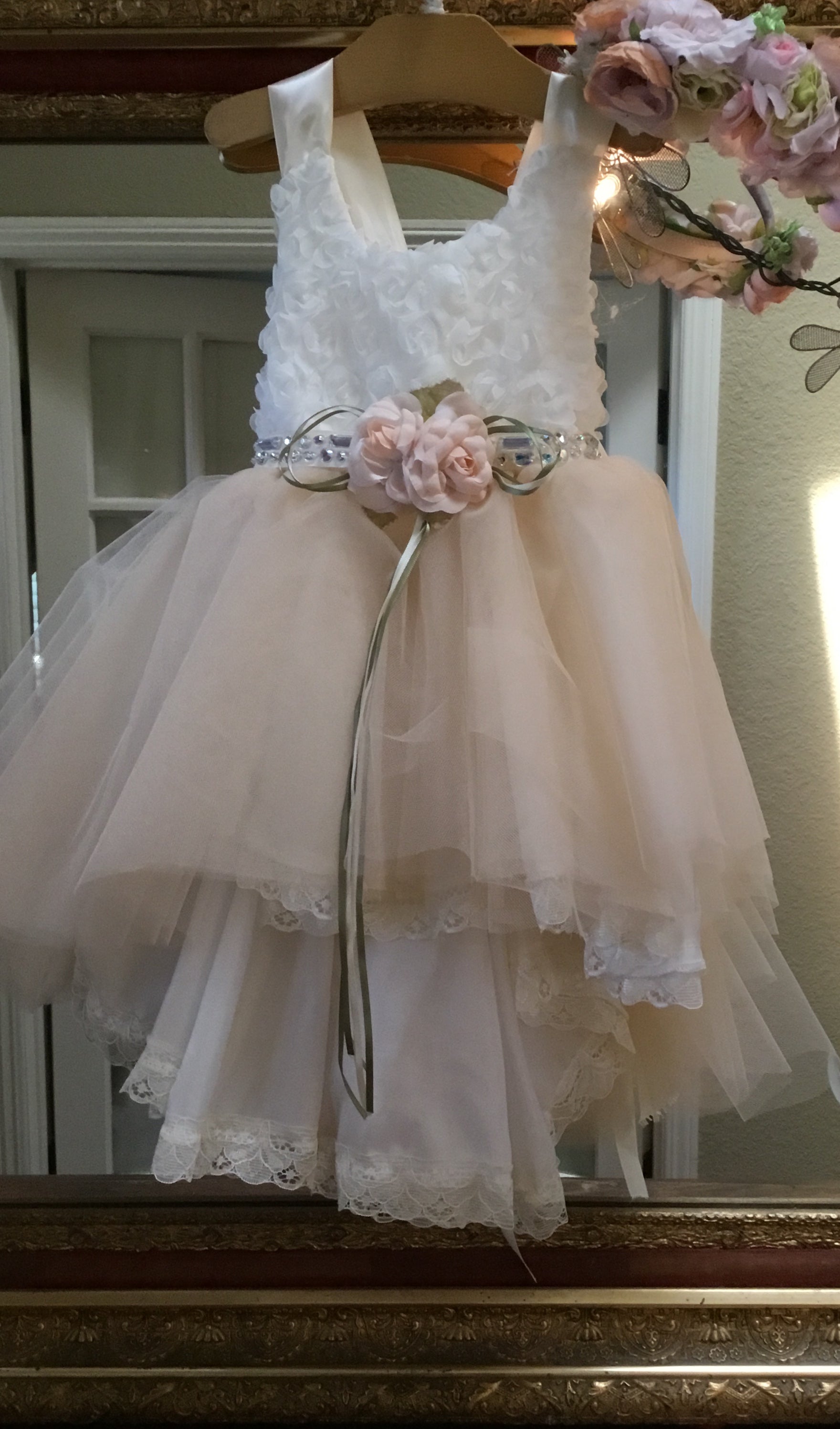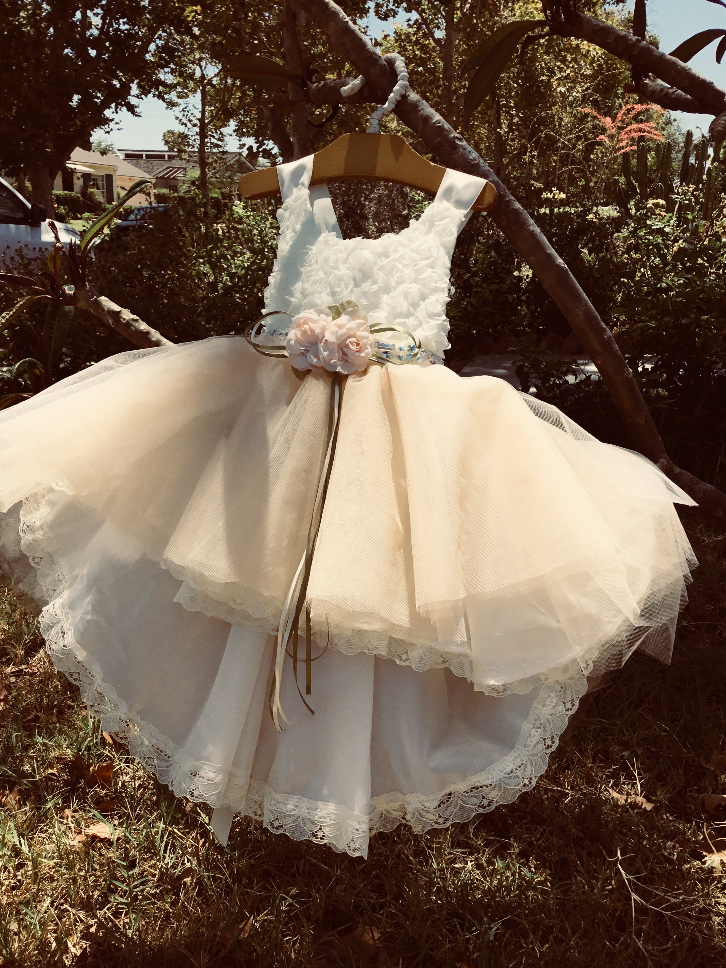 Infant dress high low tulle skirt with silk top and adjustable satin ribbon straps to adjust length and width. Perfect for newborn photography or first birthday.