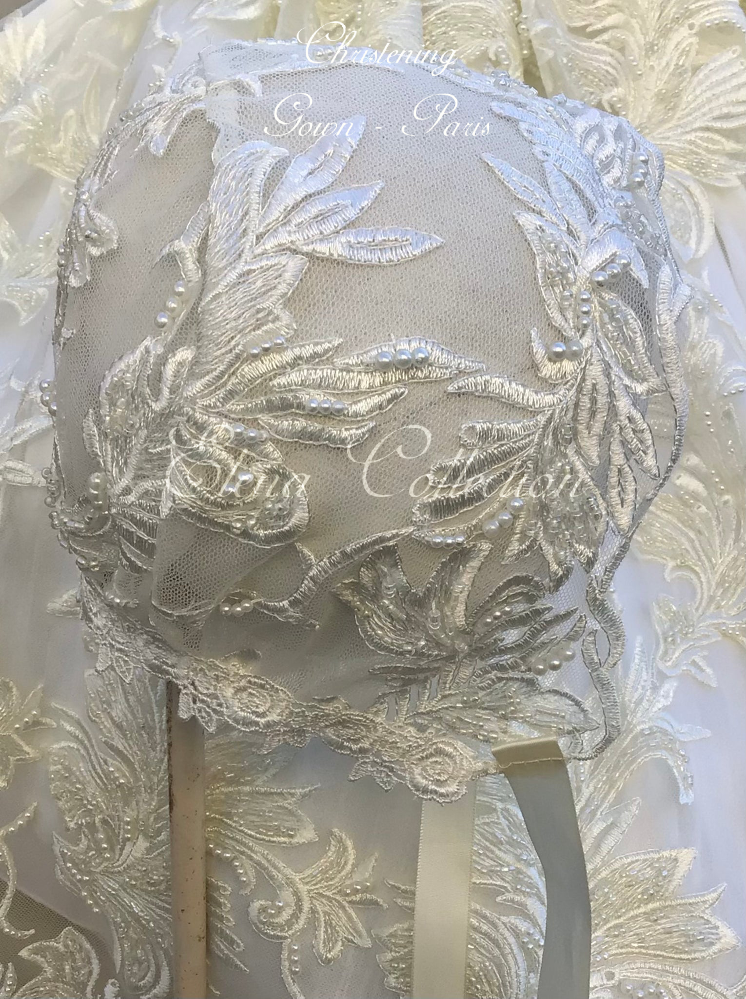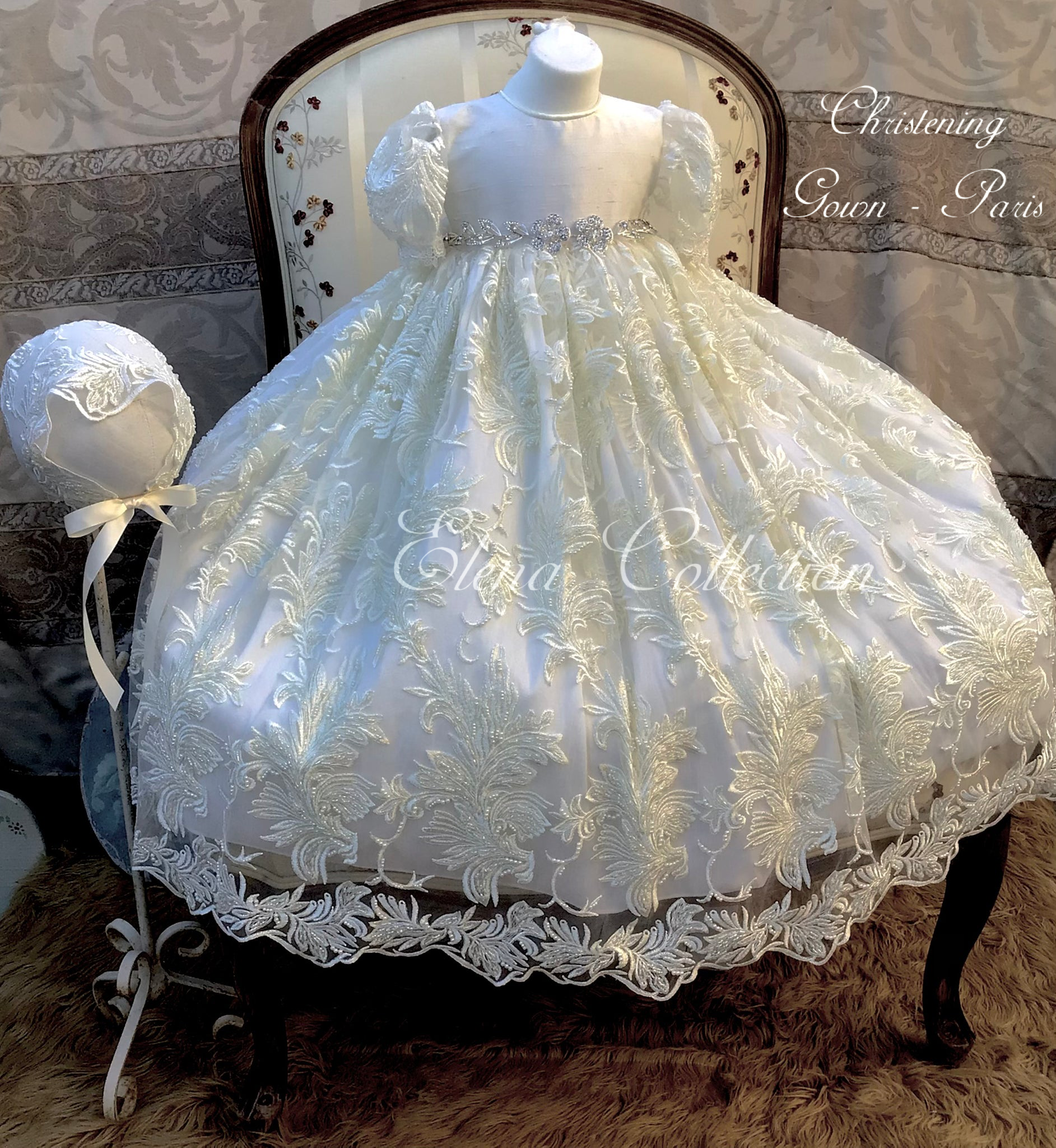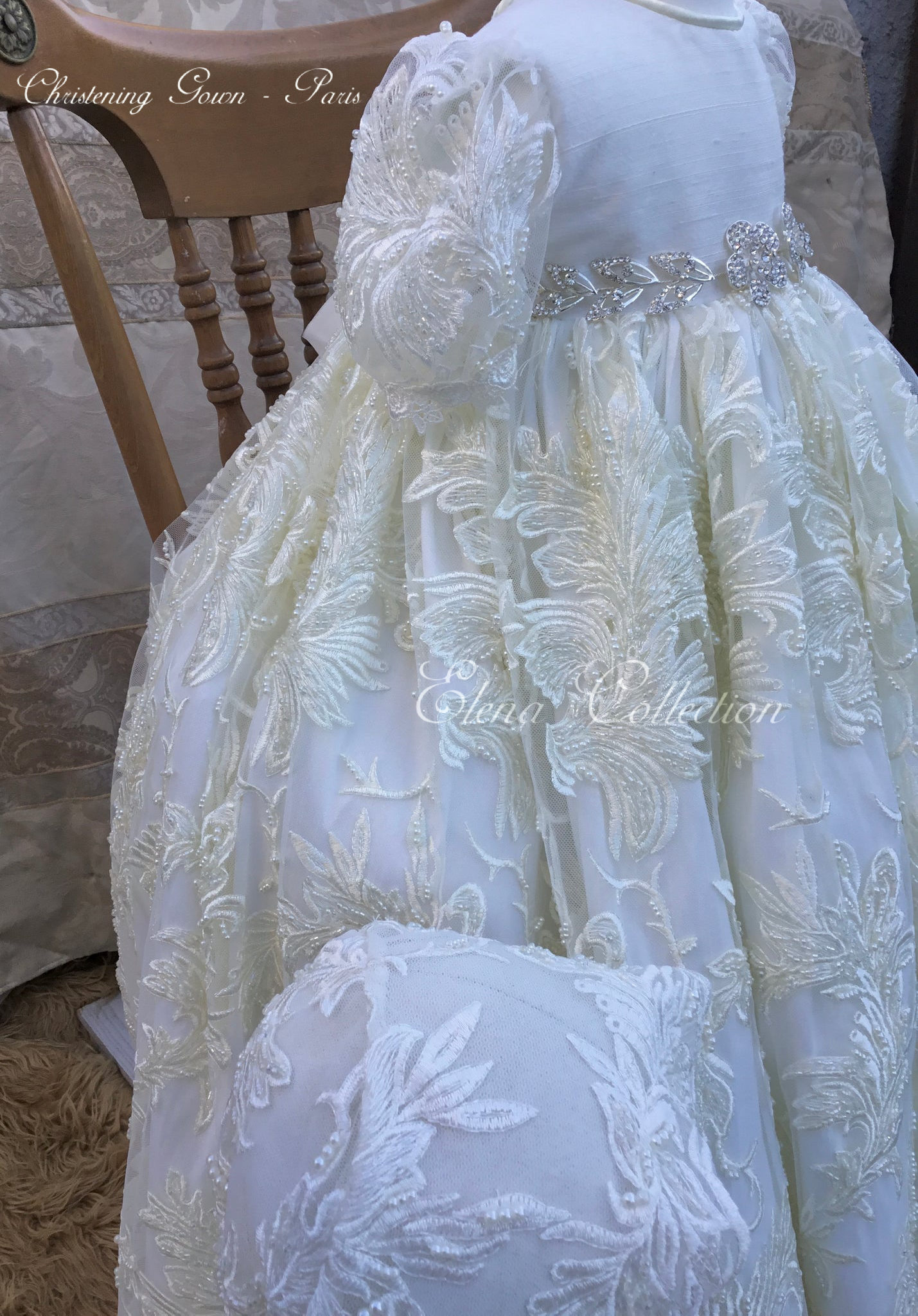 The Paris Christening Gown is a handcrafted heirloom piece made with exquisite attention to detail. Featuring delicate hand-beaded lace overlay, sheer lace sleeves, and a scalloped hem, this gown combines timeless elegance with luxurious comfort. Fully lined with pure cotton and enhanced with a crinoline petticoat for added fullness, it ensures a perfect fit and graceful drape. Made to order and shipped worldwide from California, Fabrics: • Silk • Lace • Soft Lining • Tulle • Piping • Crinoline • Fusing