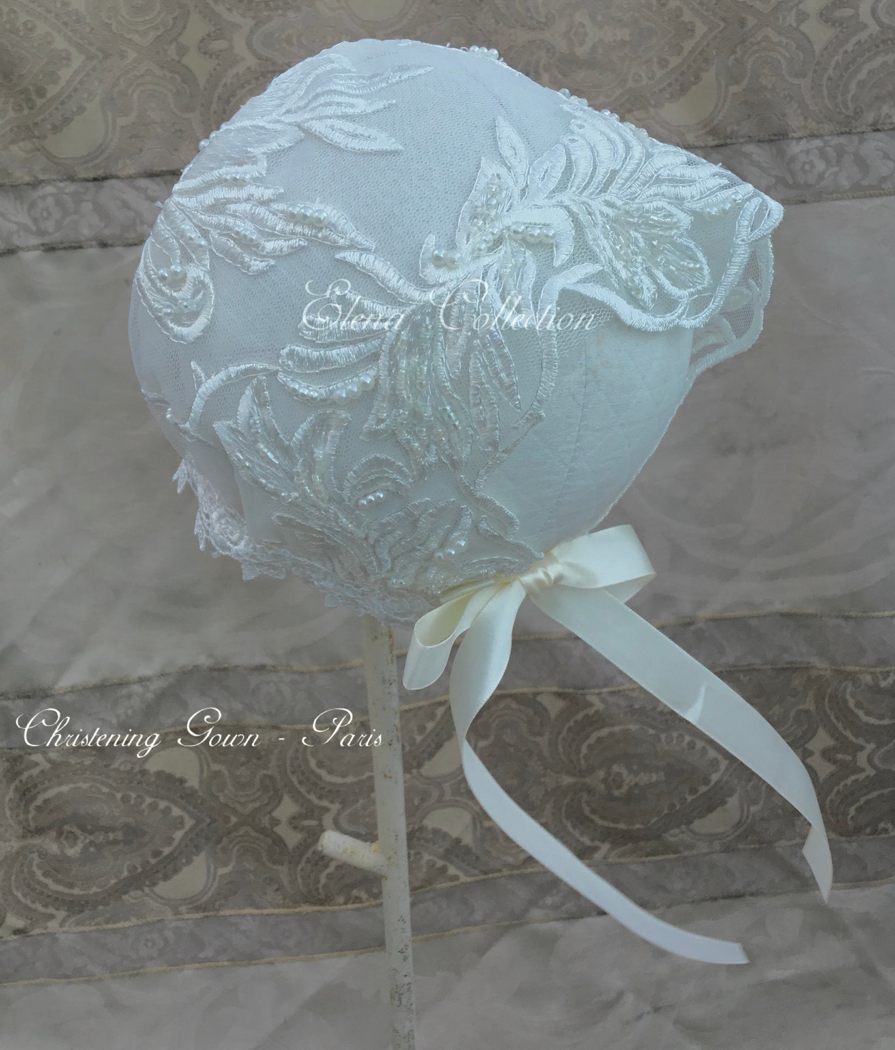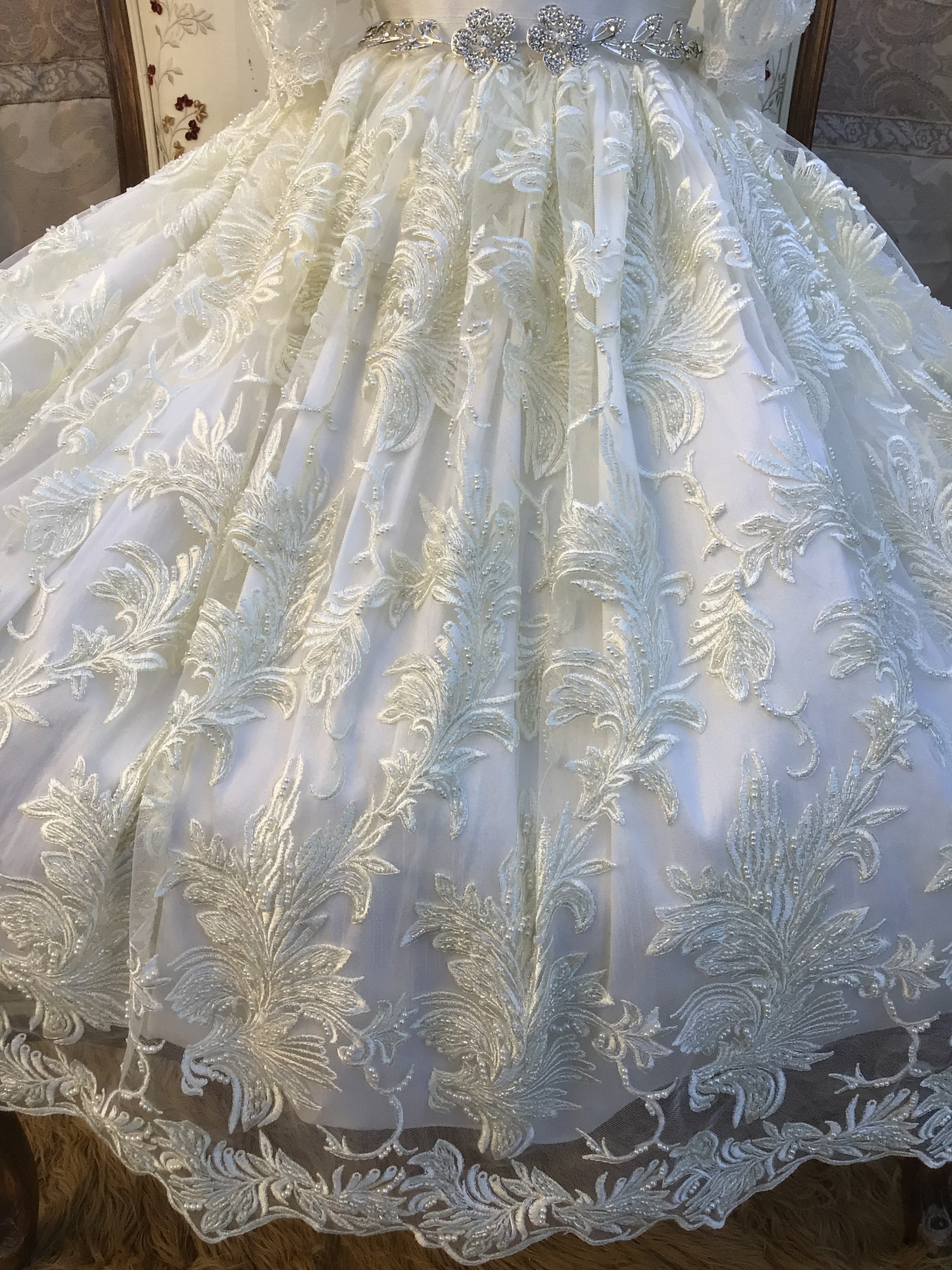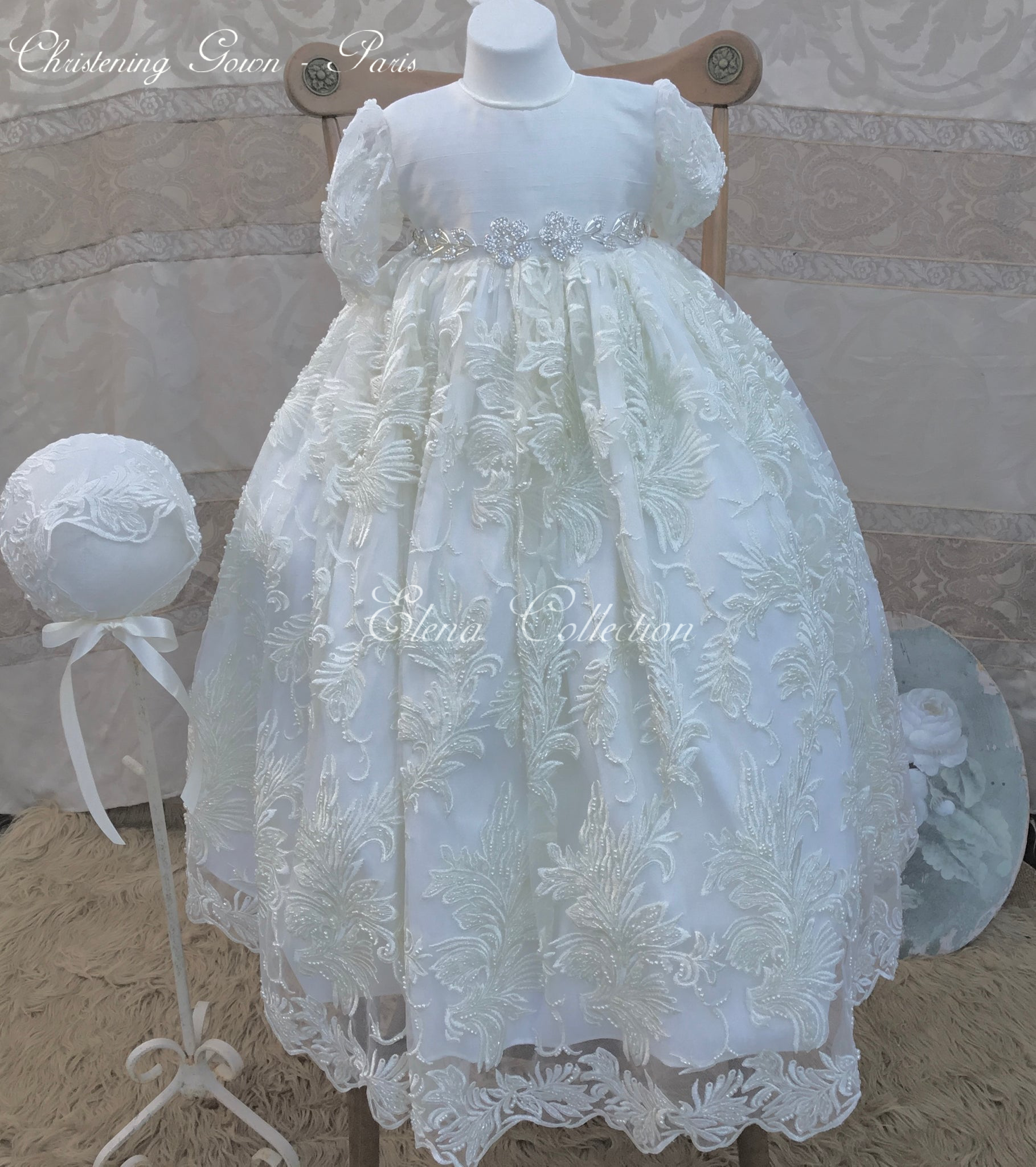 The Paris Christening Gown is a handcrafted heirloom piece made with exquisite attention to detail. Featuring delicate hand-beaded lace overlay, sheer lace sleeves, and a scalloped hem, this gown combines timeless elegance with luxurious comfort. Fully lined with pure cotton and enhanced with a crinoline petticoat for added fullness, it ensures a perfect fit and graceful drape. Made to order and shipped worldwide from California, Fabrics: • Silk • Lace • Soft Lining • Tulle • Piping • Crinoline • Fusing