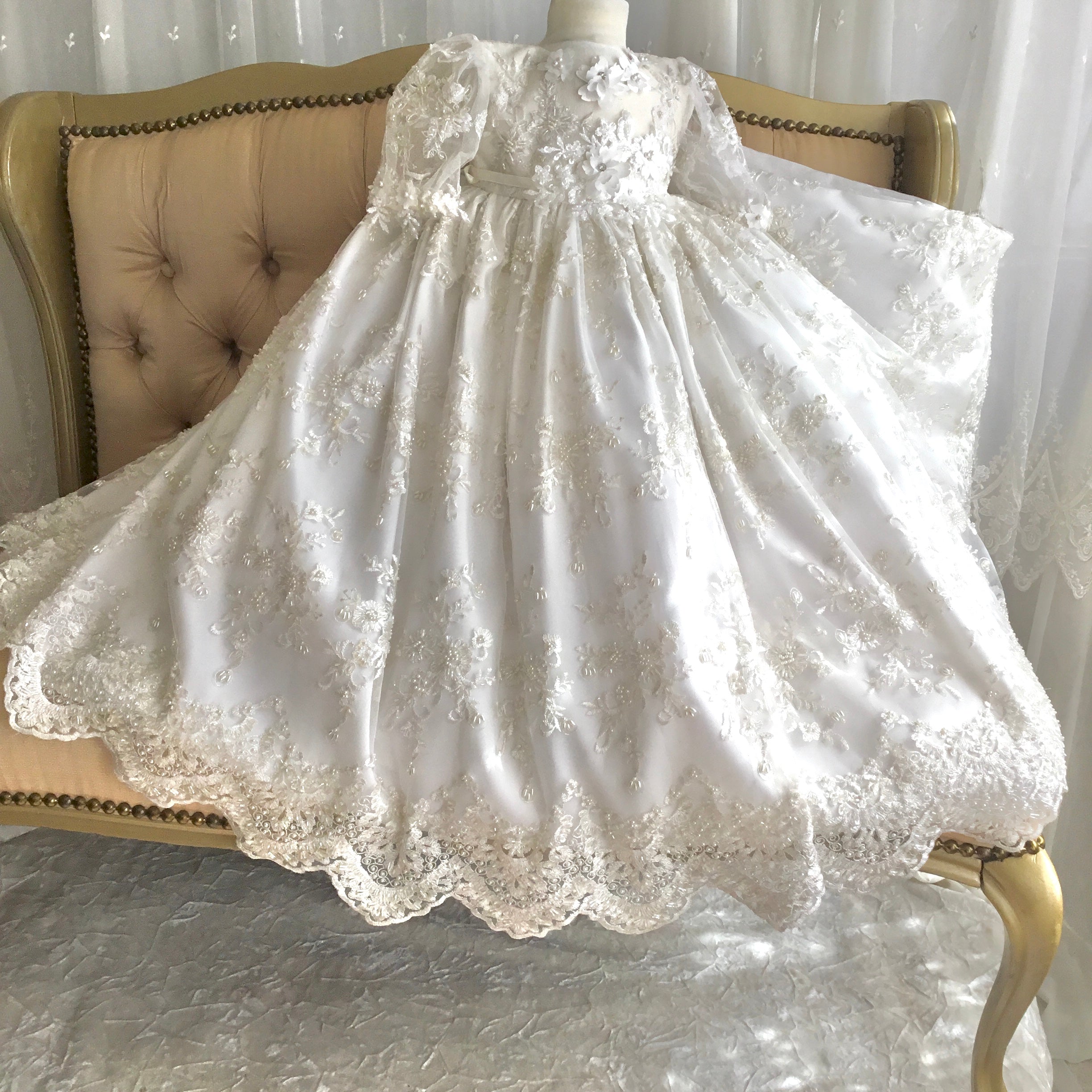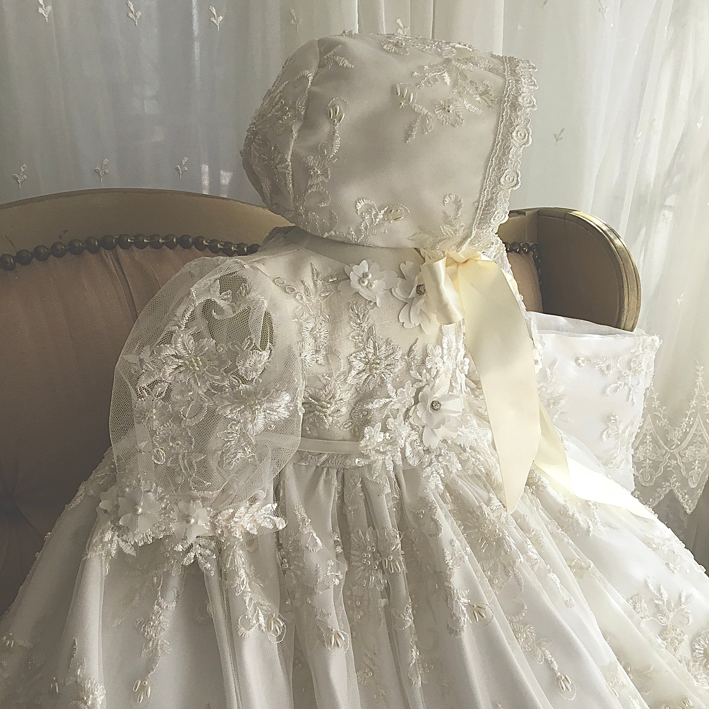 Leonor is a luxurious, vintage-inspired christening gown in Lite Ivory, featuring exquisite hand-beaded lace and a matching bonnet. This handmade heirloom set is crafted with rich materials, designed to fit true to size with a traditional 32-33 inch length. Ships worldwide from California. Dry clean only. Materials: - Polysilk - Lace (hand-beaded) - Tulle - Crinoline - Fusin