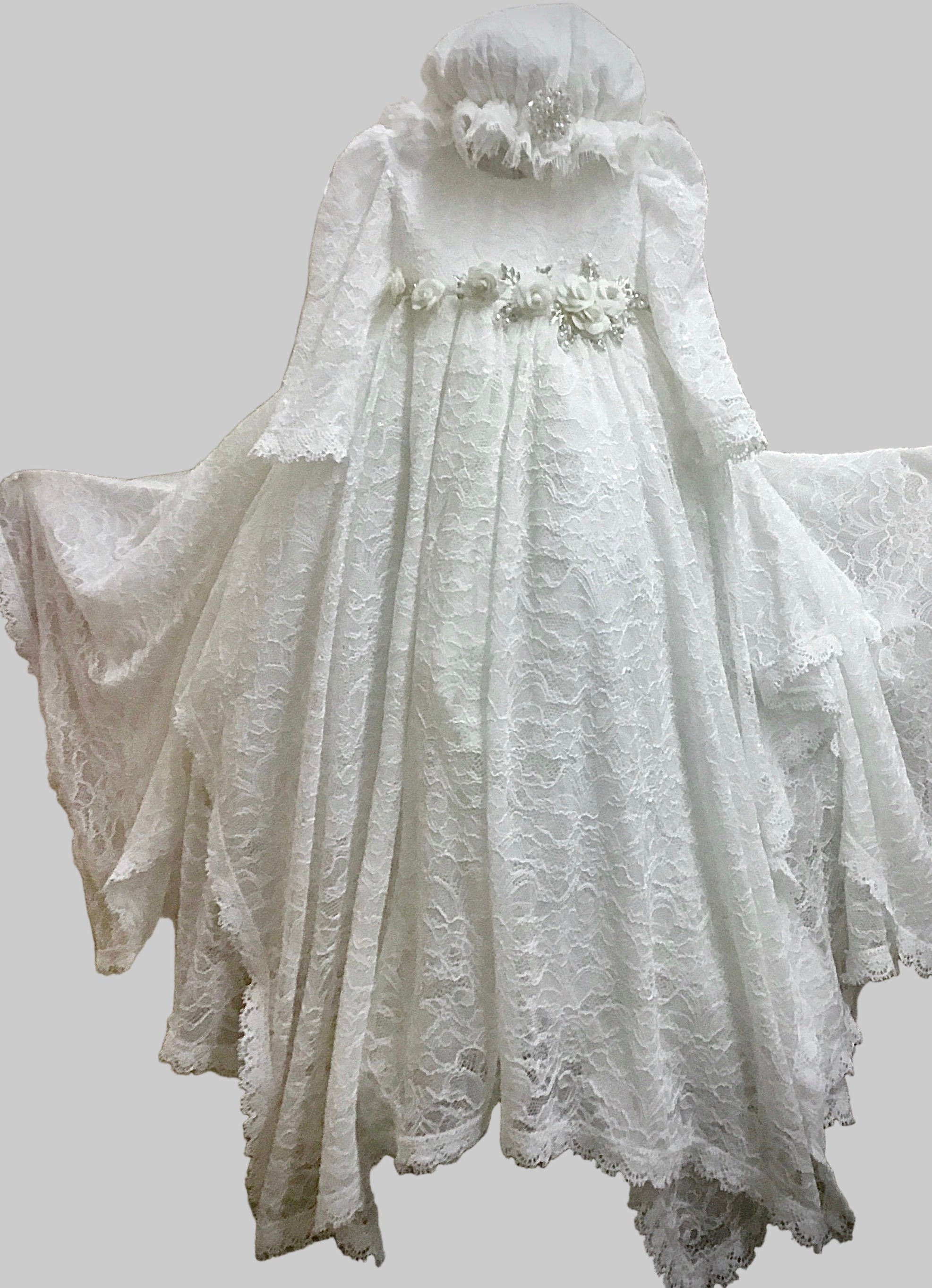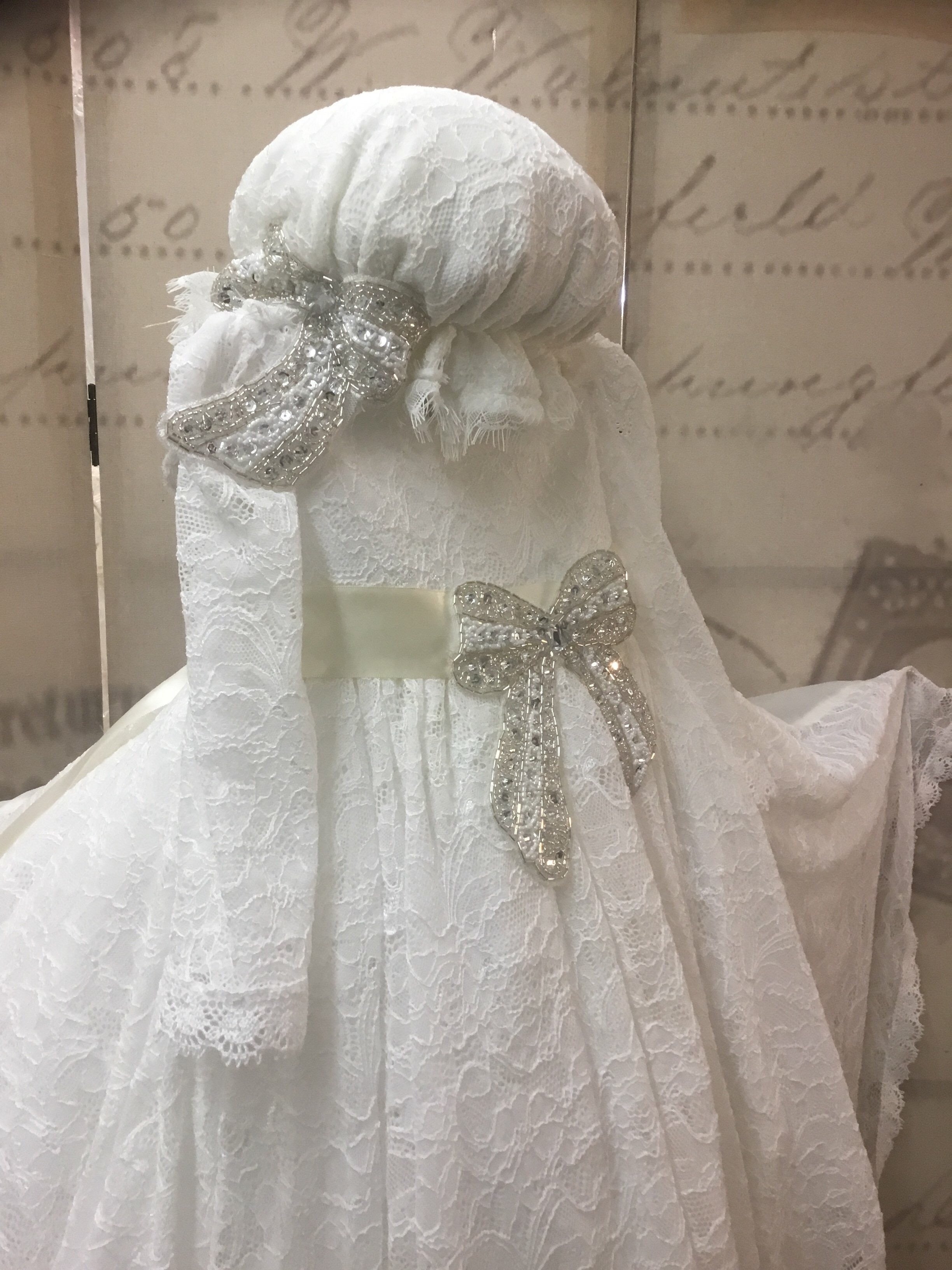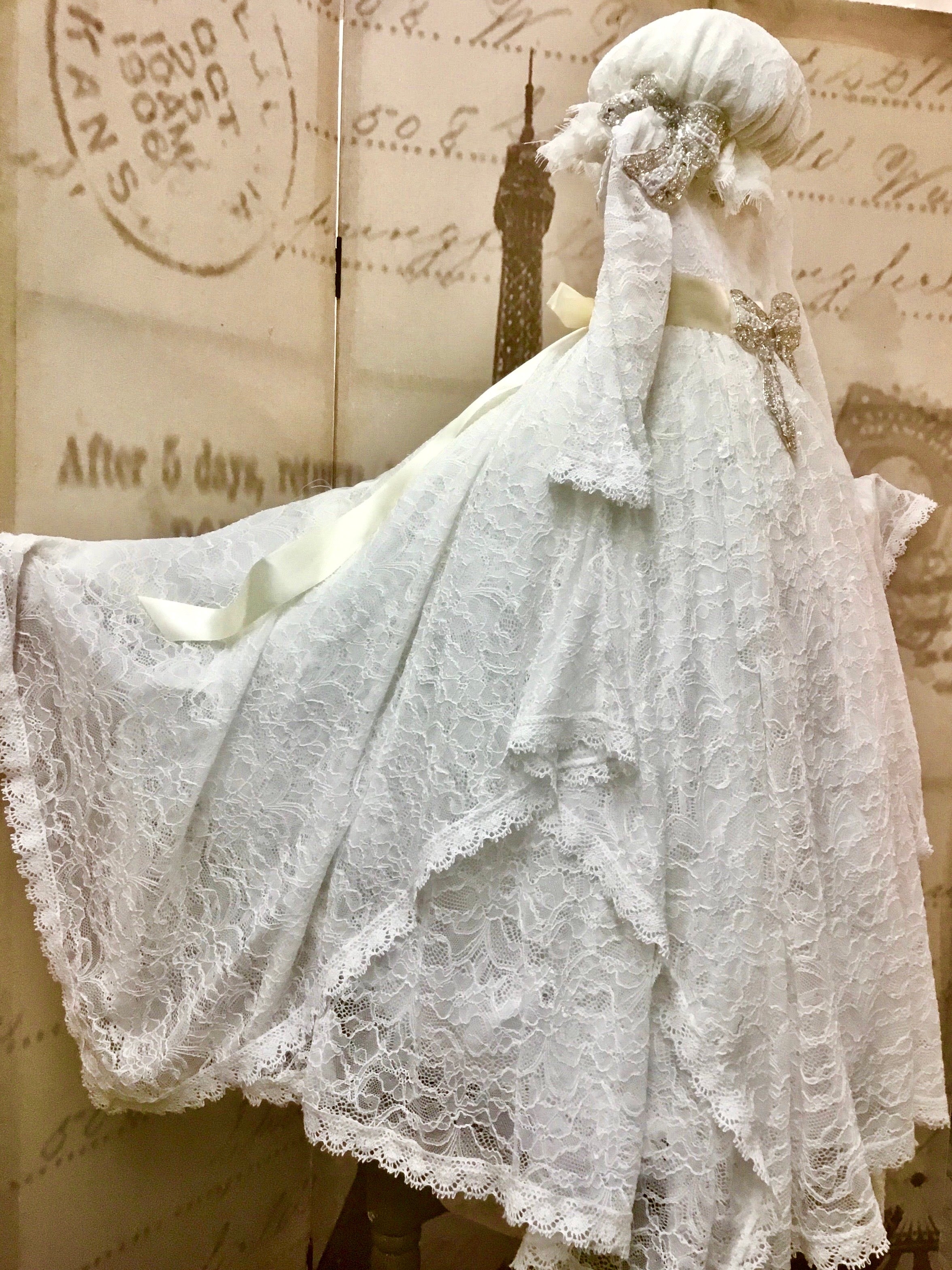 Dress your little one in timeless elegance with the Alice lace christening gown and bonnet. Featuring a flowing silhouette with softly gathered, cascading lace layers, this gown offers graceful drape and movement. Customize the long puff sleeves to short for warmer days, and choose between delicate floral appliqué or shimmering bow accents. A matching vintage-inspired bonnet, available in traditional or modern styles, completes this exquisite ensemble. Handmade with care in the USA, this gown is a cherished heirloom. Fabrics and details: - Romantic antique white floral corded lace - Soft cotton lace trim at hem - Fully lined with light crinoline for shape - Matching bonnet included