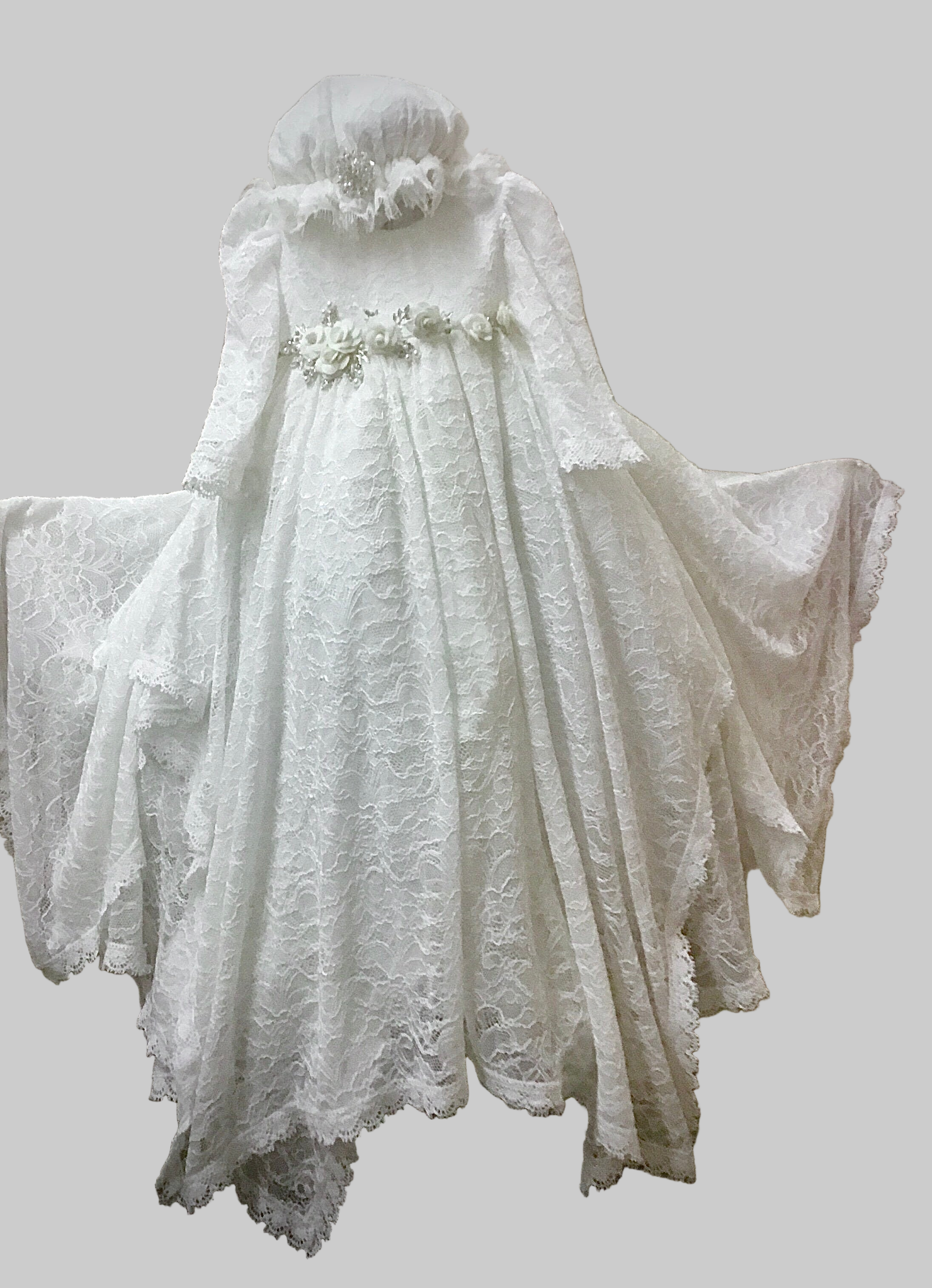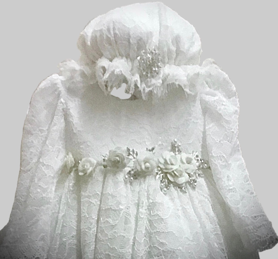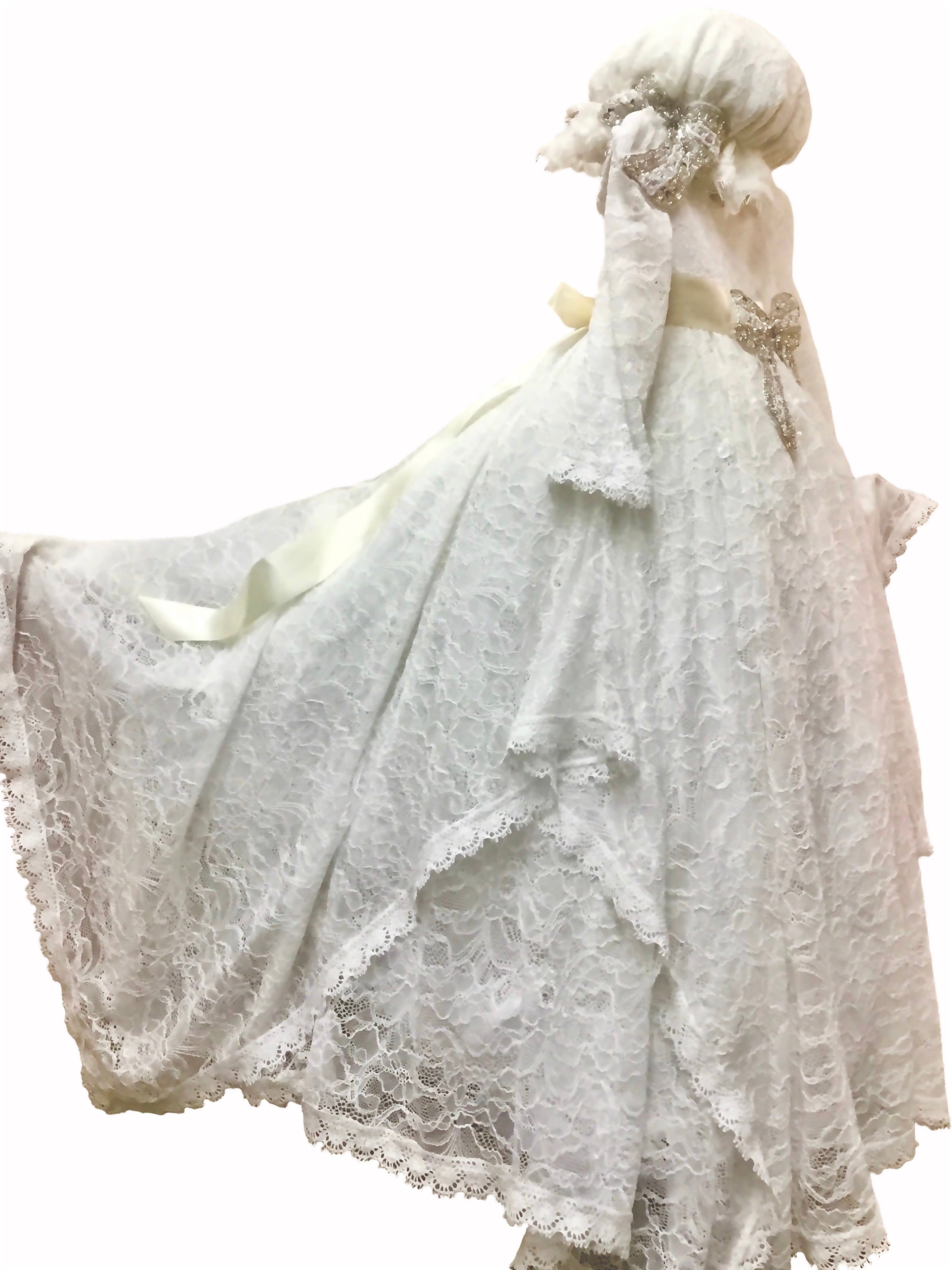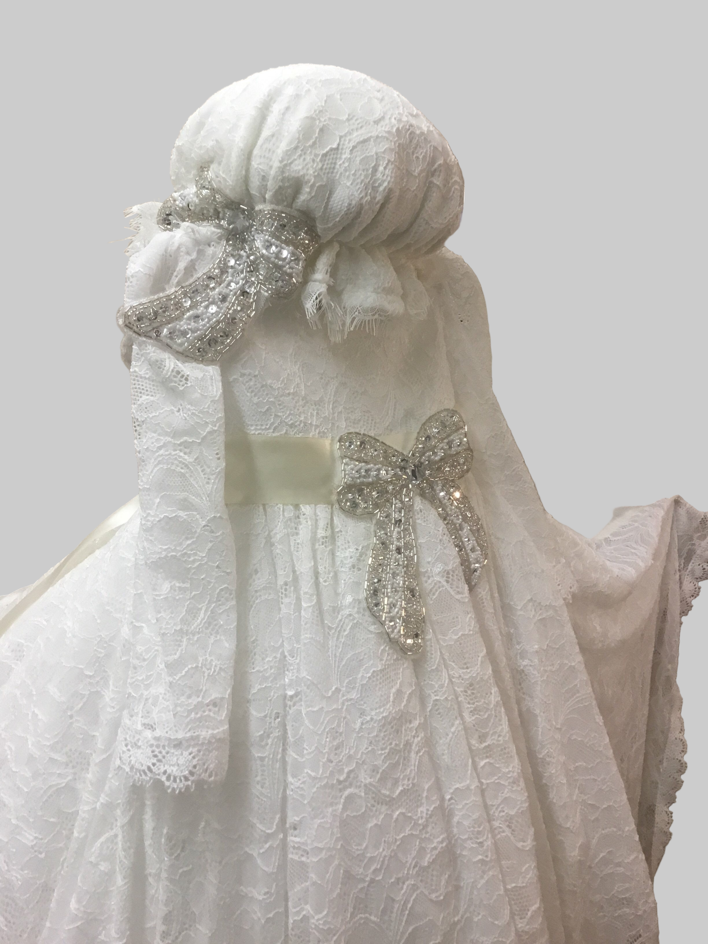 Dress your little one in timeless elegance with the Alice lace christening gown and bonnet. Featuring a flowing silhouette with softly gathered, cascading lace layers, this gown offers graceful drape and movement. Customize the long puff sleeves to short for warmer days, and choose between delicate floral appliqué or shimmering bow accents. A matching vintage-inspired bonnet, available in traditional or modern styles, completes this exquisite ensemble. Handmade with care in the USA, this gown is a cherished heirloom. Fabrics and details: - Romantic antique white floral corded lace - Soft cotton lace trim at hem - Fully lined with light crinoline for shape - Matching bonnet included