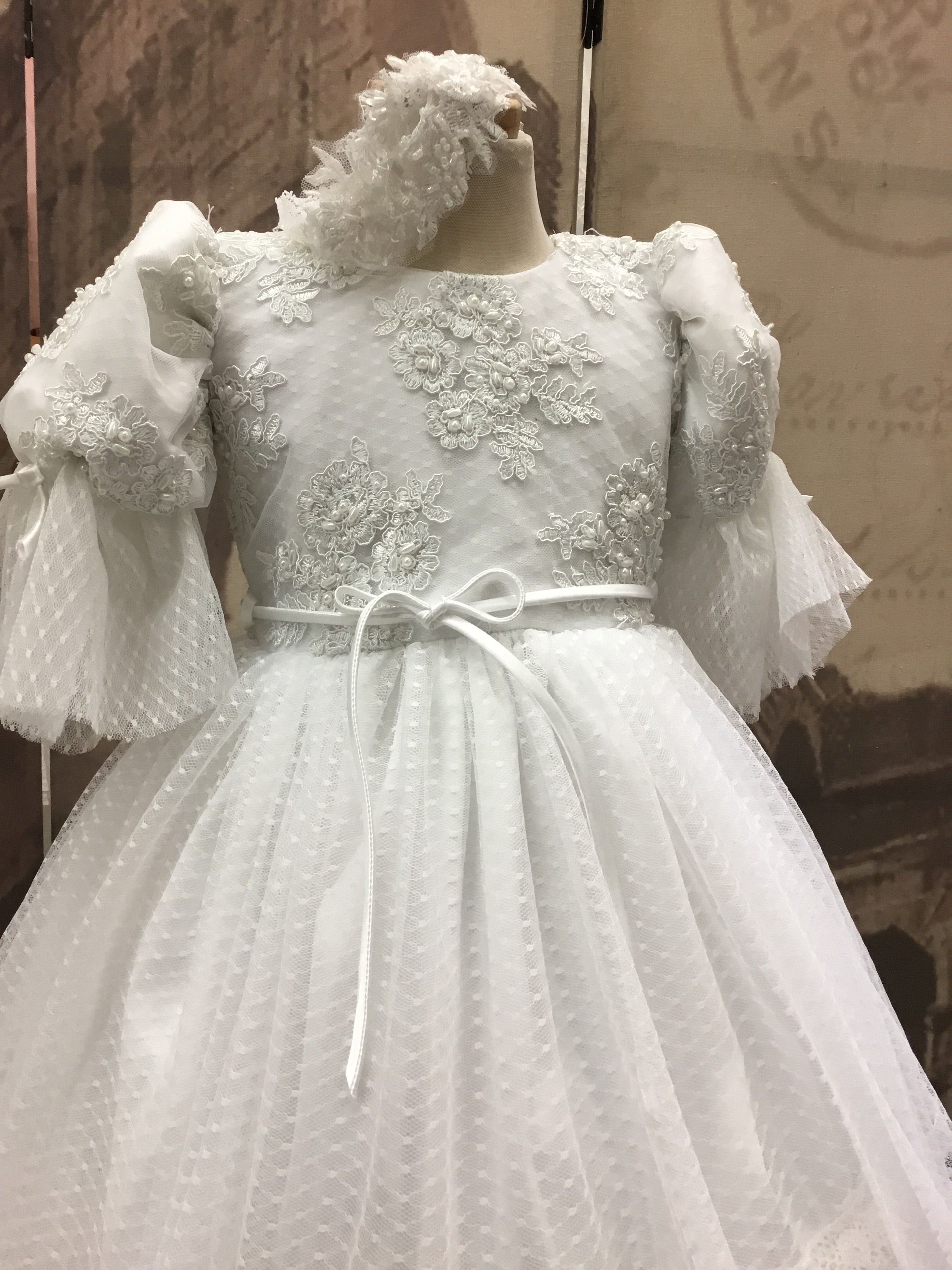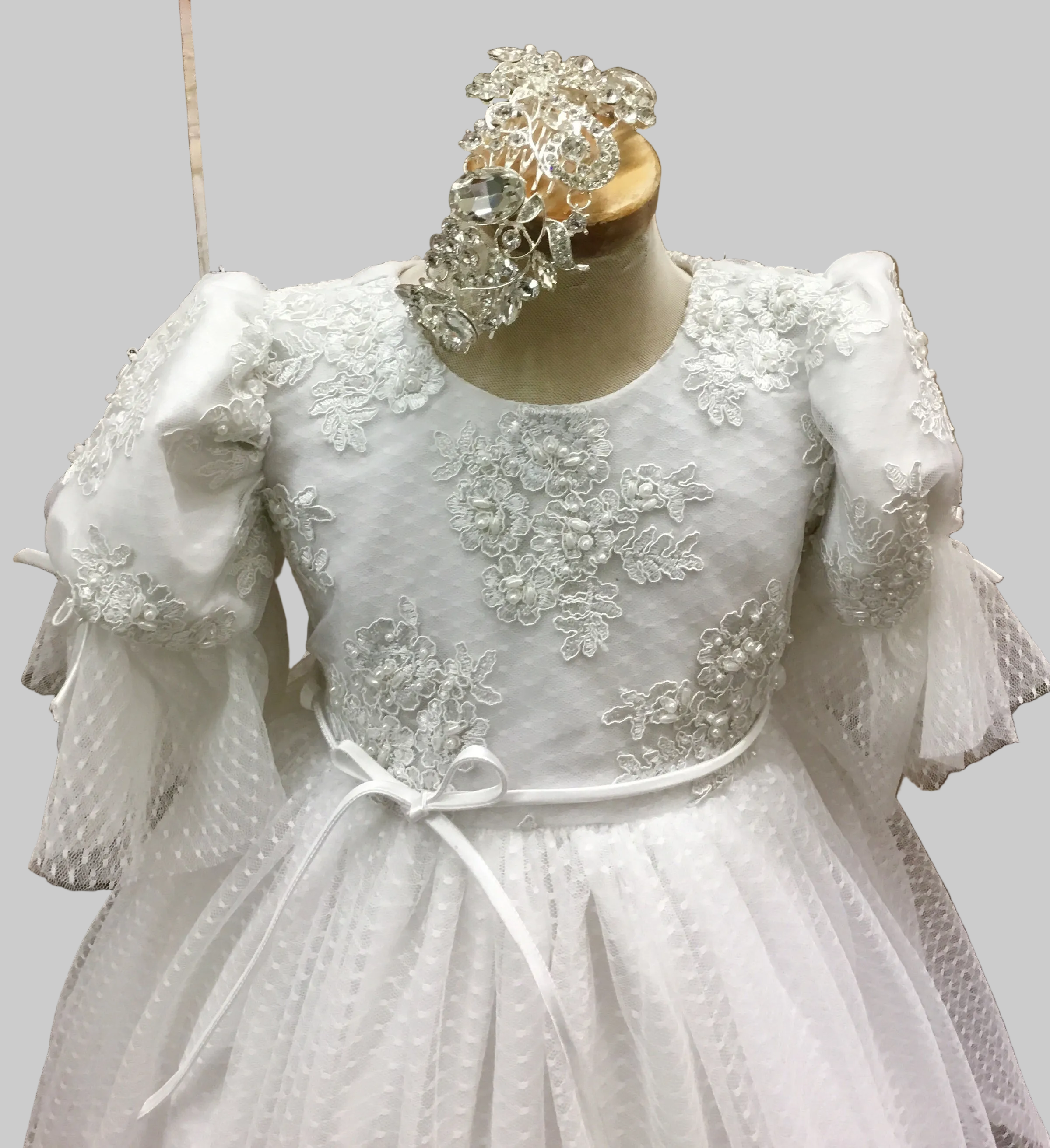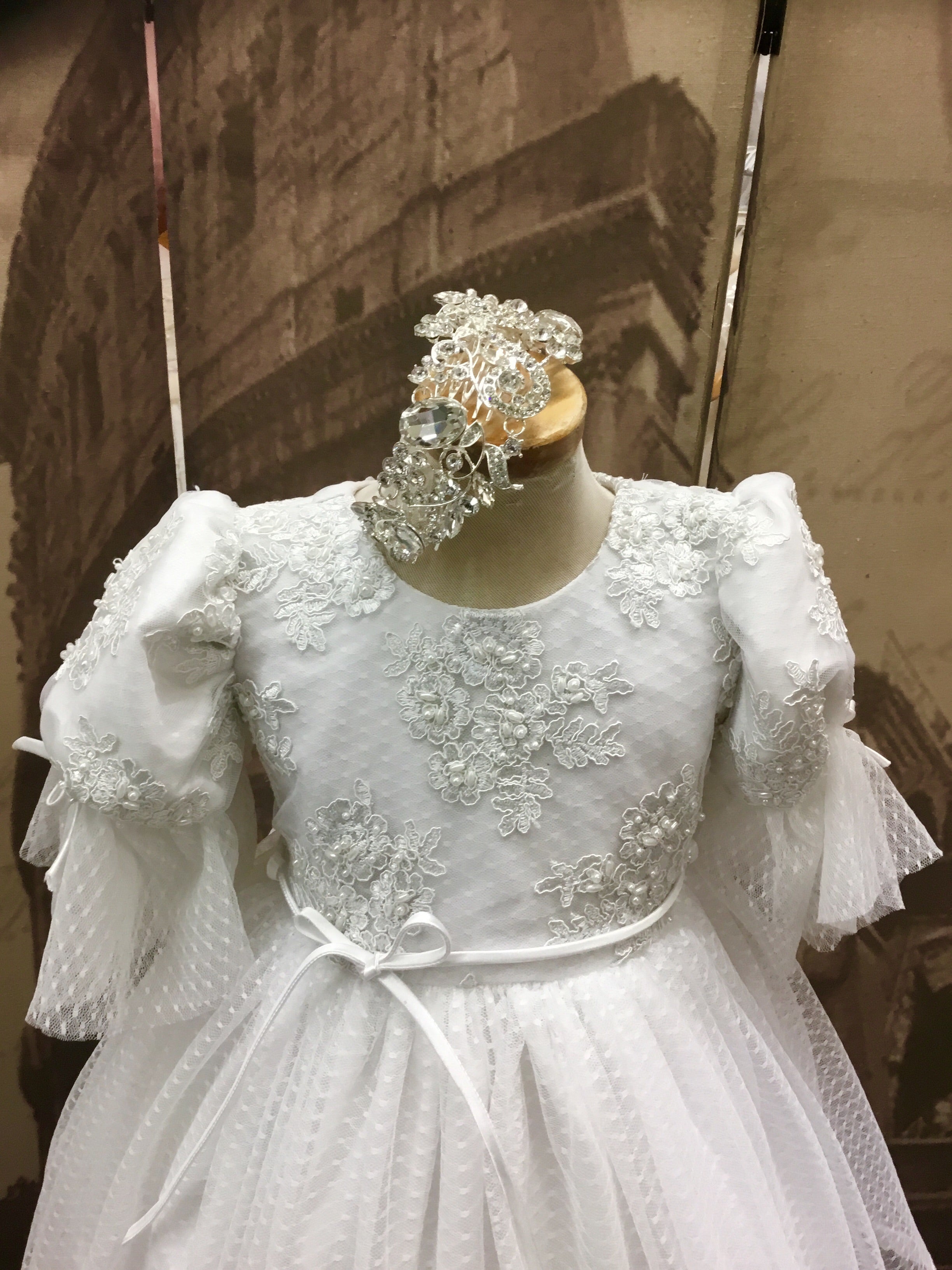 Lauren Communion Lace Dress in white features: • Soft English dotted lace • Full lining • Attached crinoline for volume Designed with concealed seams for comfort and a zipper back closure. Rhinestone comb available separately.