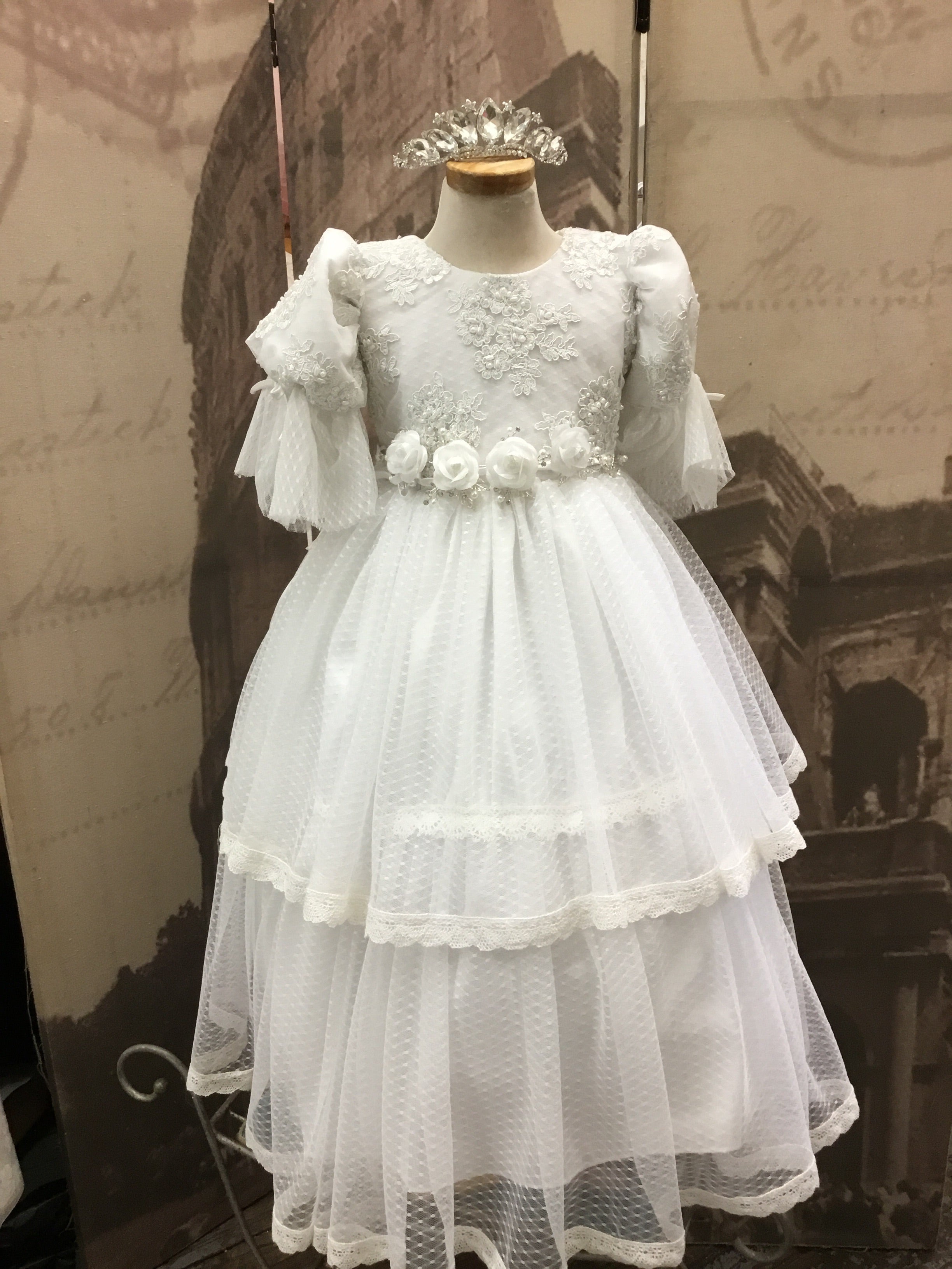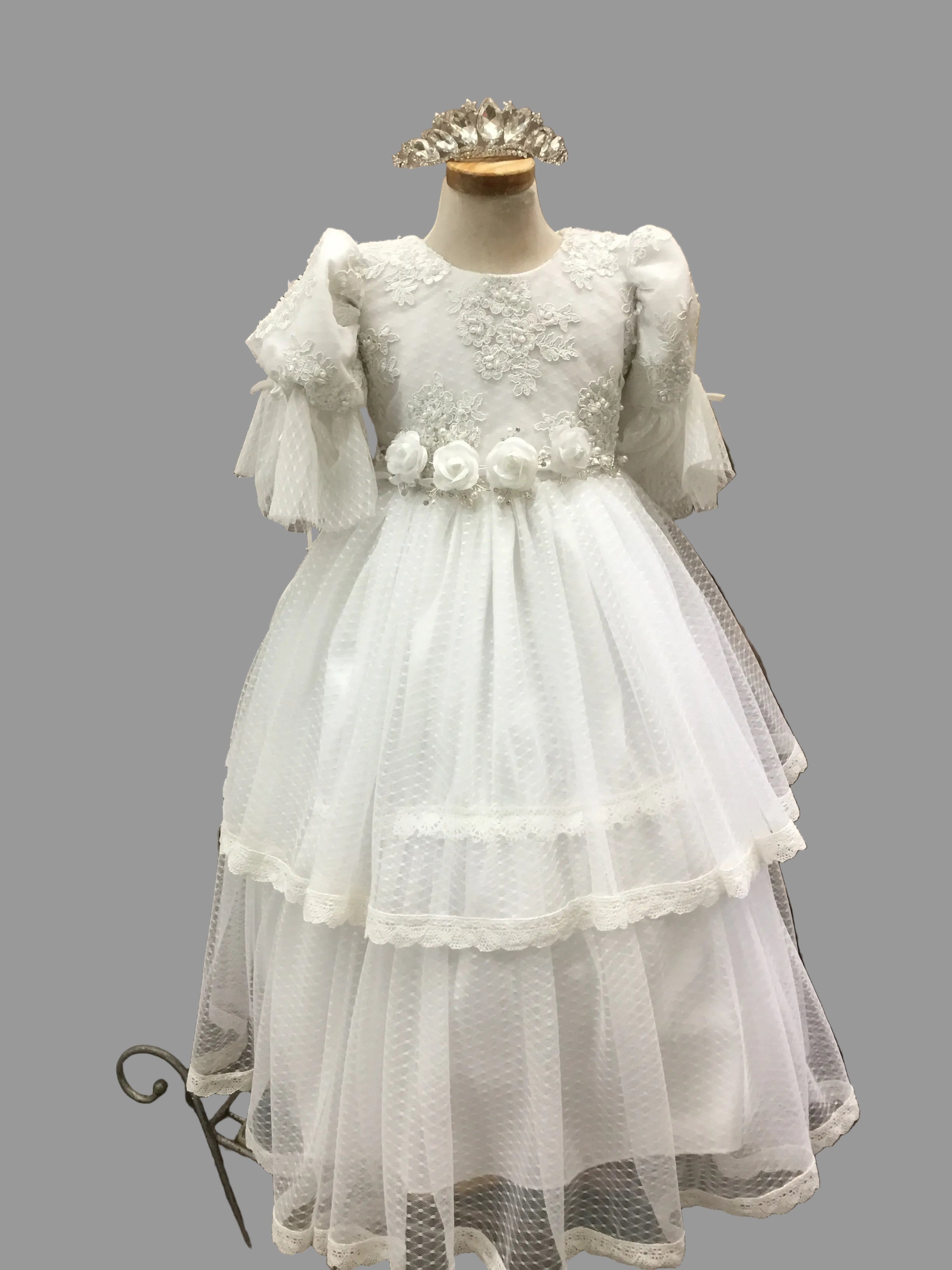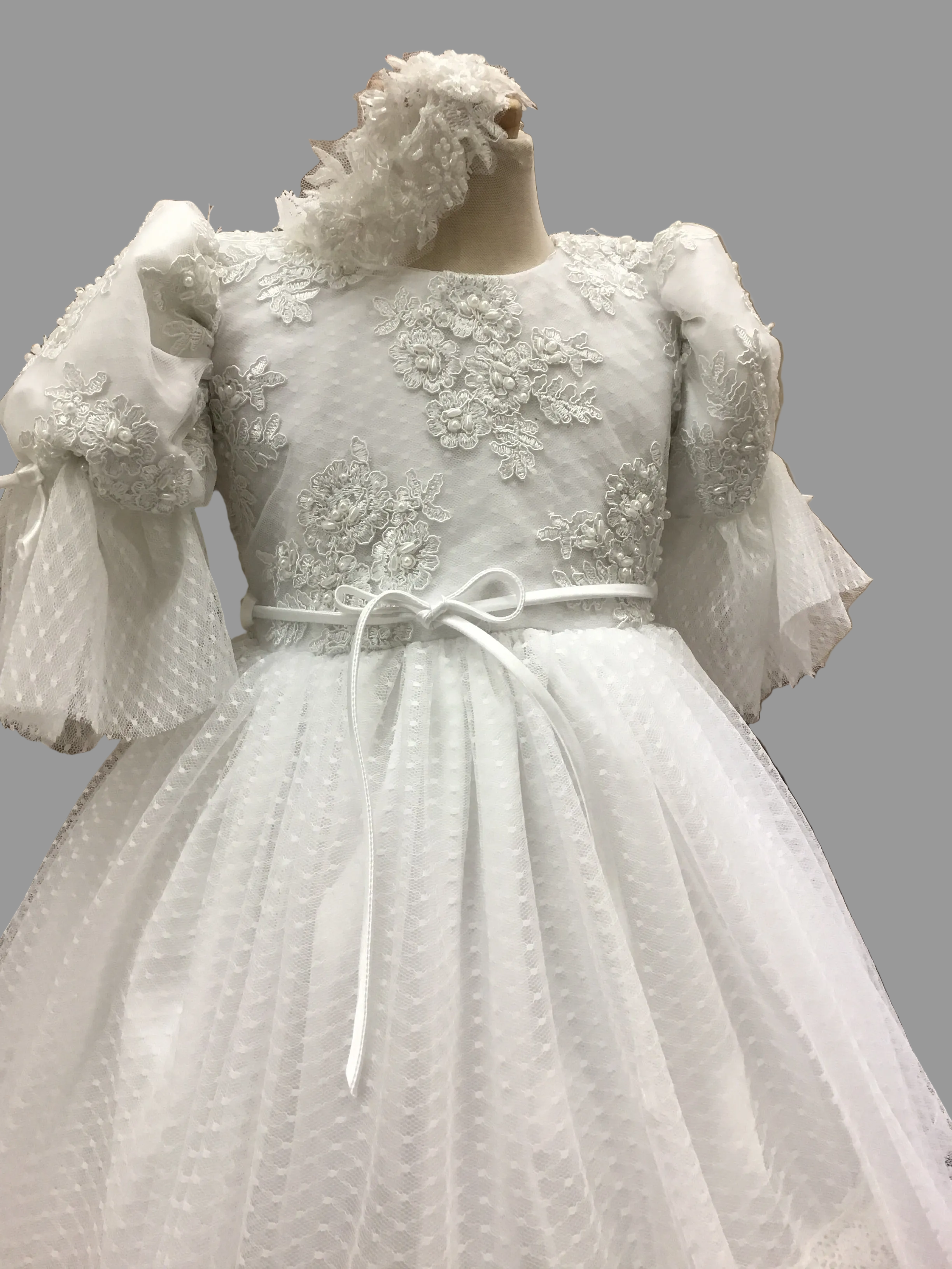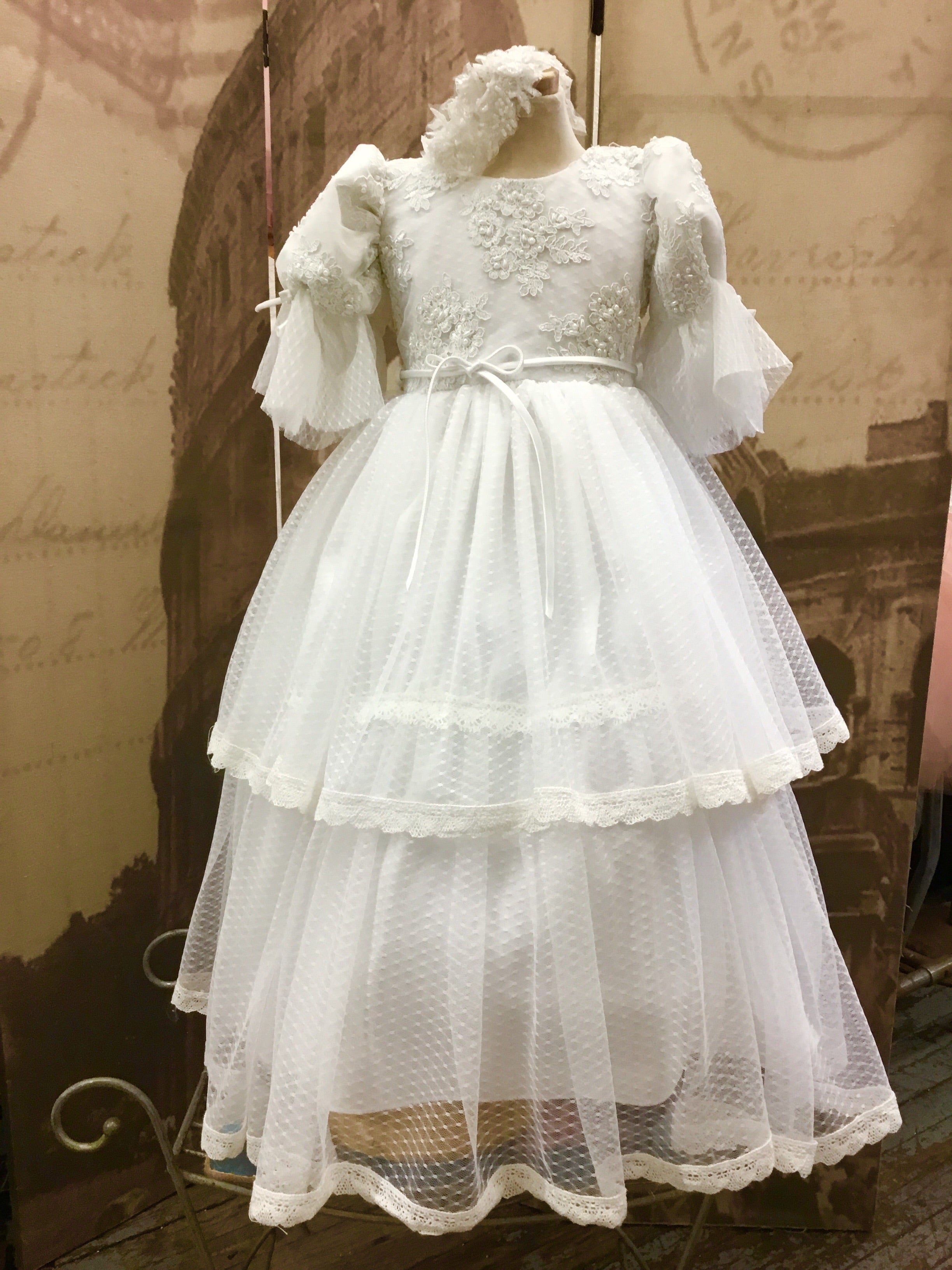 Lauren Communion Lace Dress in white features: • Soft English dotted lace • Full lining • Attached crinoline for volume Designed with concealed seams for comfort and a zipper back closure. Rhinestone comb available separately.