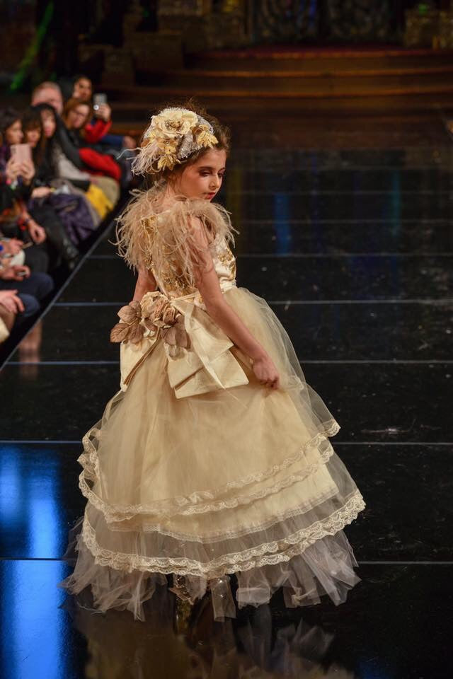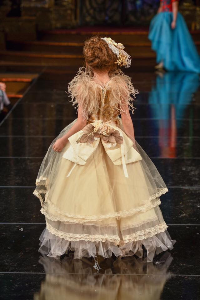 Flower girl tutu dress straight from the runway! This beautiful couture dress is full of details, featuring feather ostrich adornments on the shoulders and hand cut applicates adorn the front bodice! It is perfect for a wedding or a wedding attendance a photoshoot.