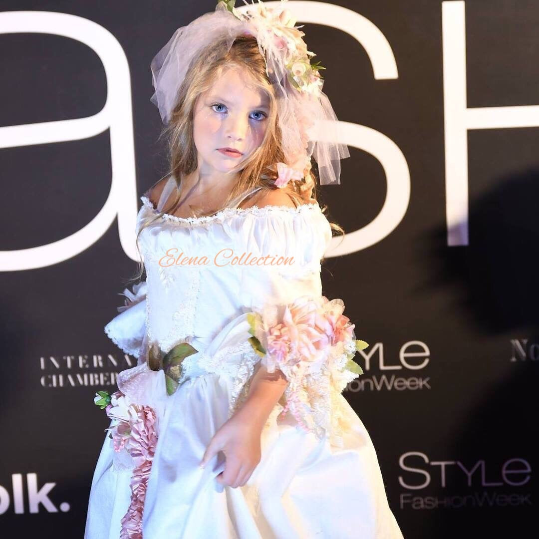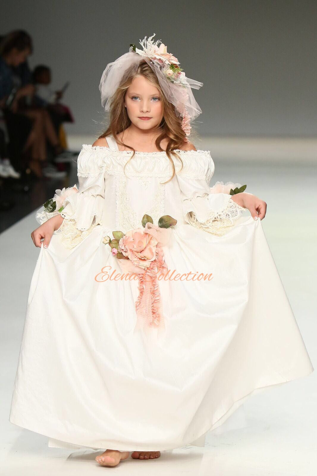 Beautiful and unique silk first communion dress or flower girls gown with blush floral details on sleeves and a handmade detachable flower brooch. ( floral details available in Ivory )