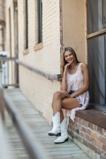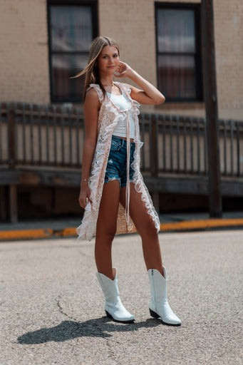 Long Lace Vest with a tulle ruffle trim all around the front and long ties closure you can adjust or leave it open.