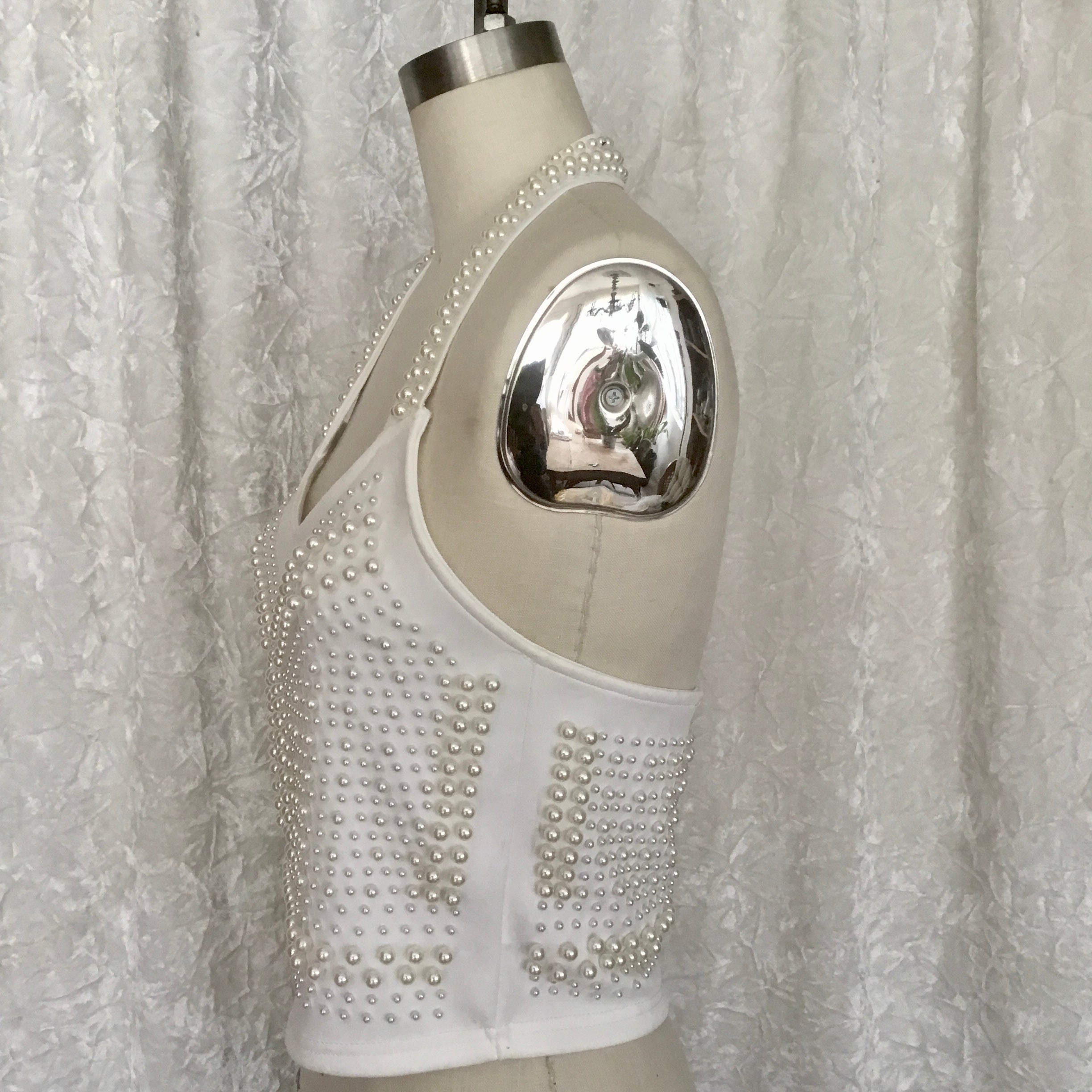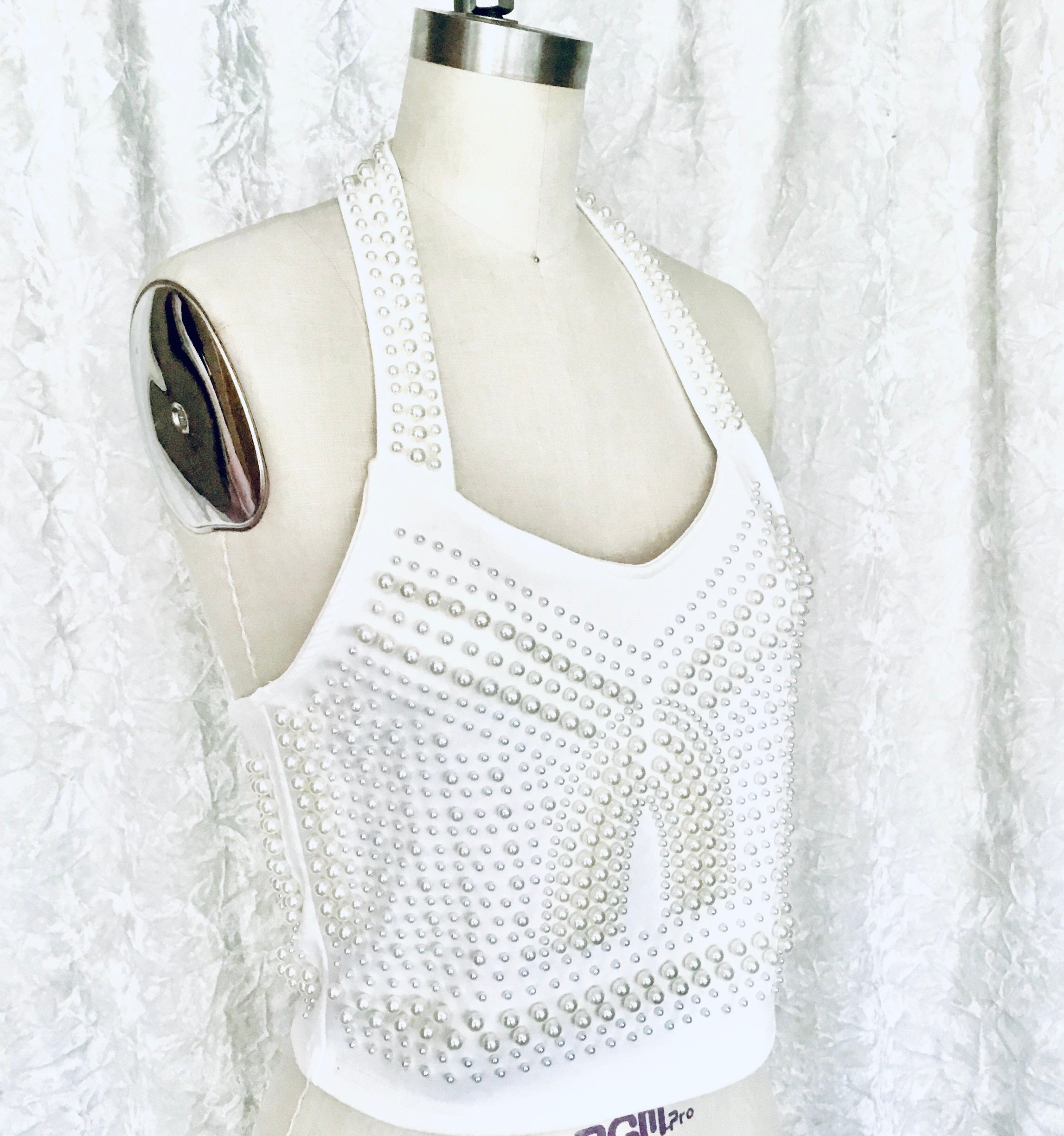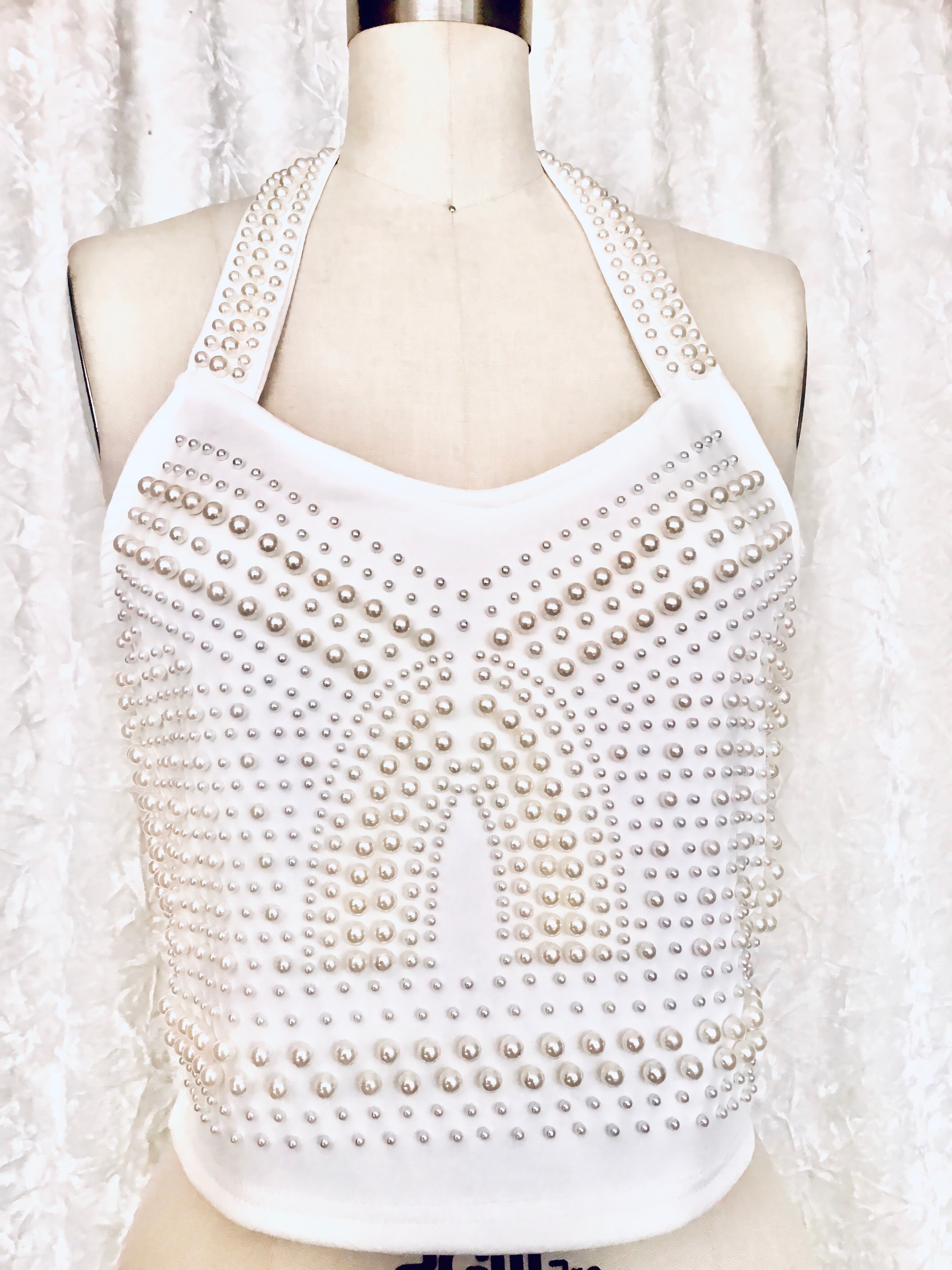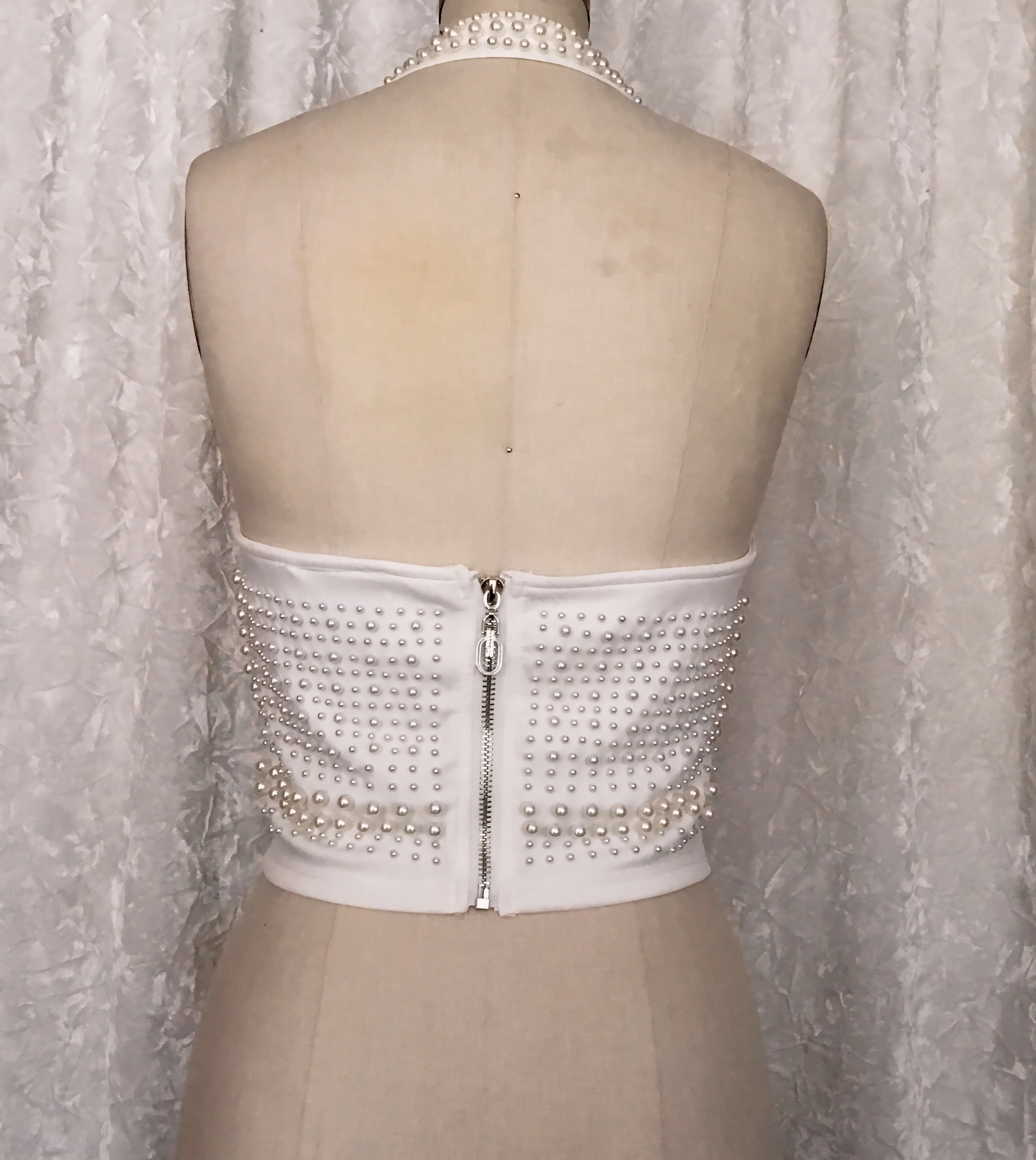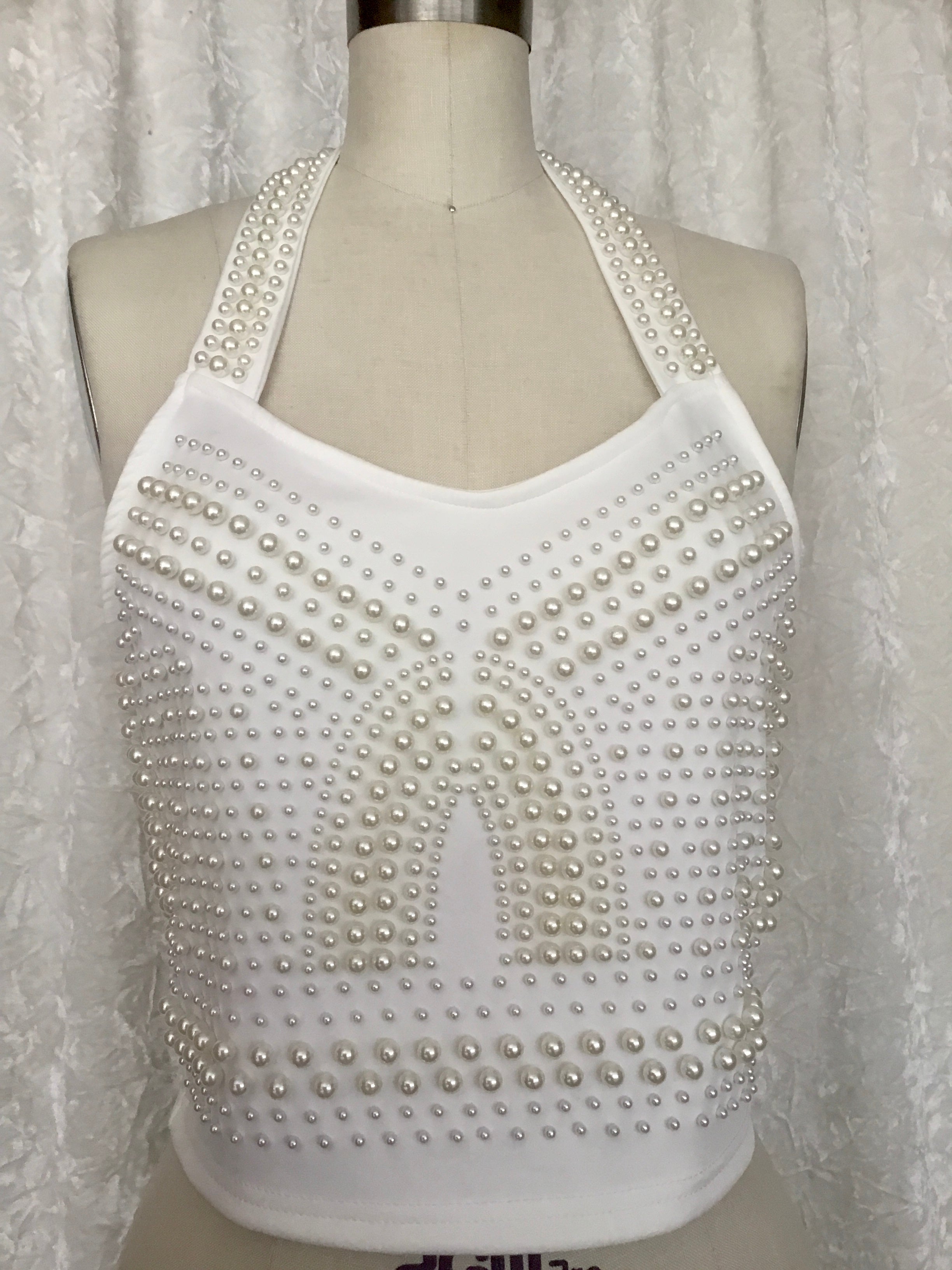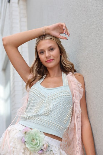 A trendy pearl halter top with a zipper back closure. Style it many different ways - we love pairing it with our athleisure jacket, our floral cargo shorts, or our lace fringe skirt.