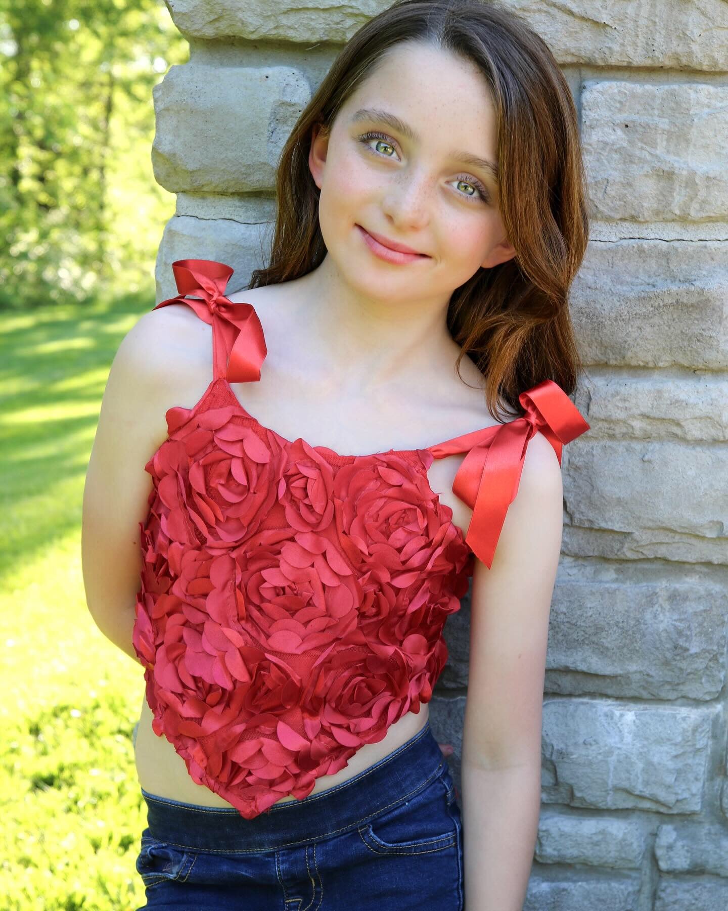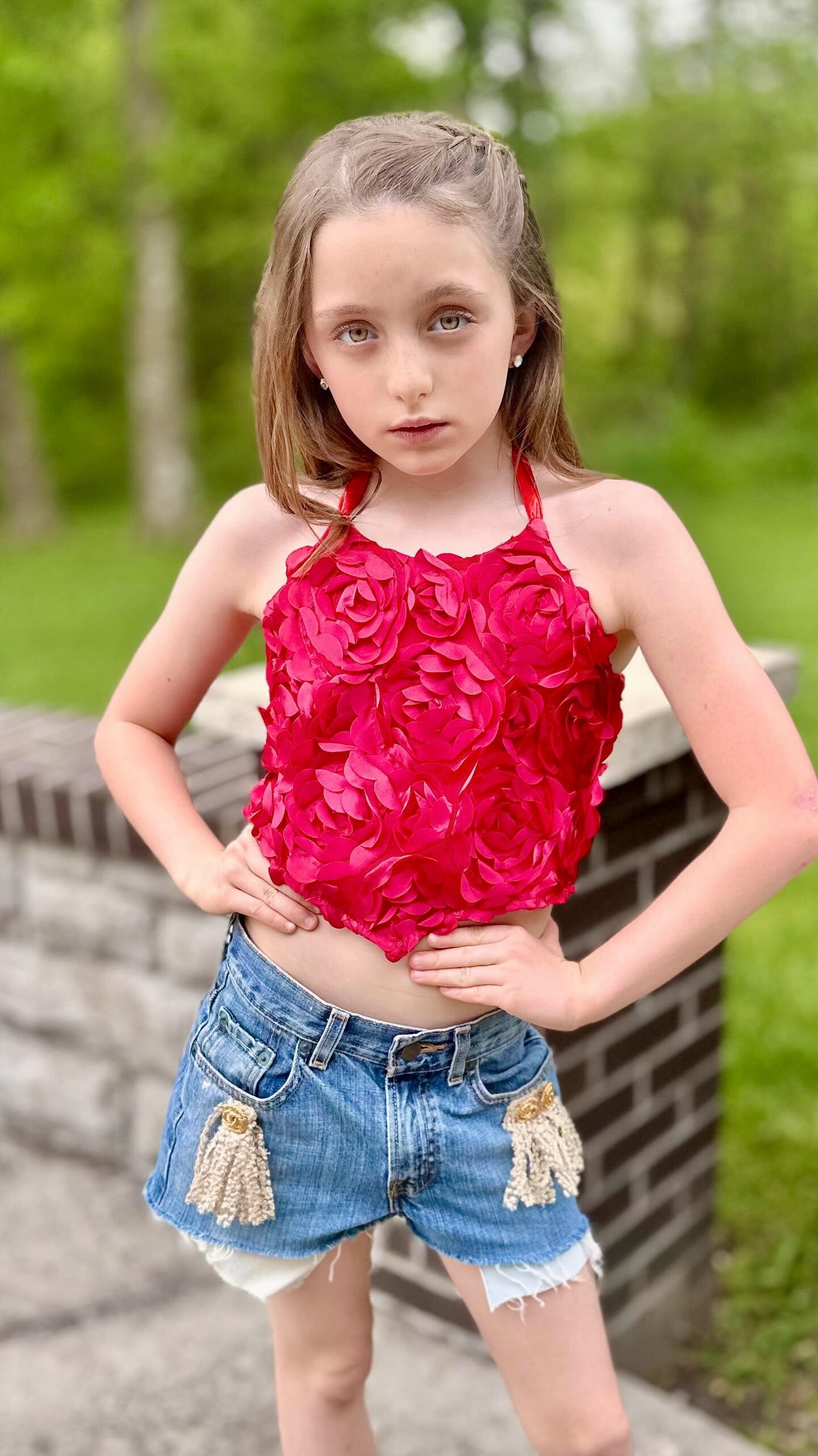 A handcrafted couture top featuring a textured floral bodice and fully adjustable back corset with soft ribbon ties. Designed with adjustable shoulder and back ribbons for a customizable fit and length, this versatile piece offers comfort, elegance, and timeless style. Perfect for special occasions, portraits, or elevated everyday wear.