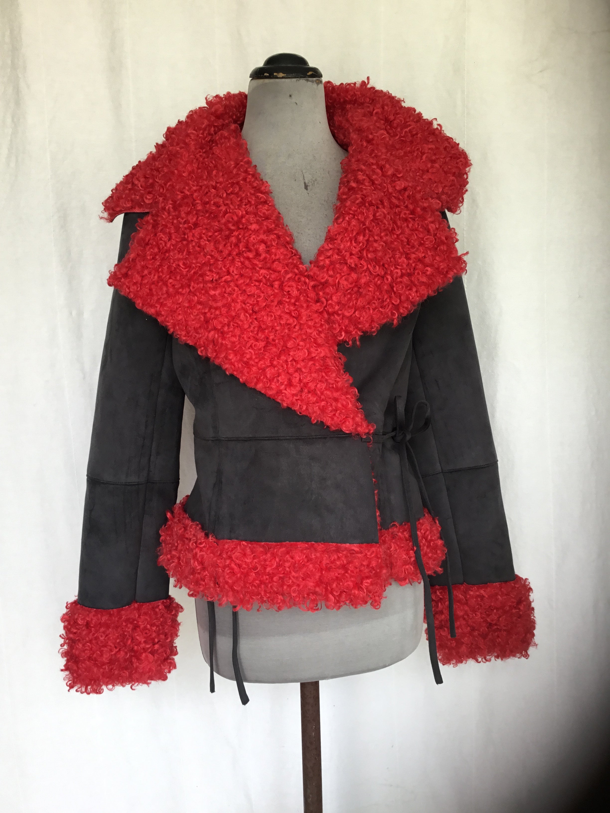 Make a bold statement with this stunning faux suede wrap jacket featuring vibrant red curly faux shearling trim. Designed to turn heads, this structured yet cozy jacket blends retro glamour with modern edge. The oversized shawl collar and dramatic cuffs add volume and warmth, while the belted waist flatters your figure with adjustable elegance.