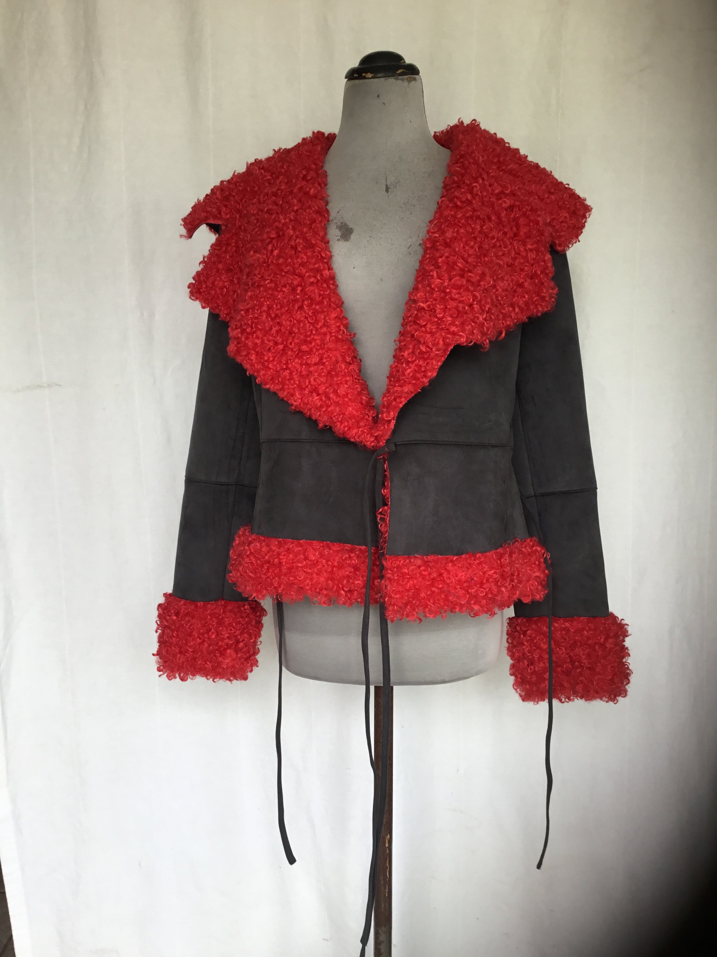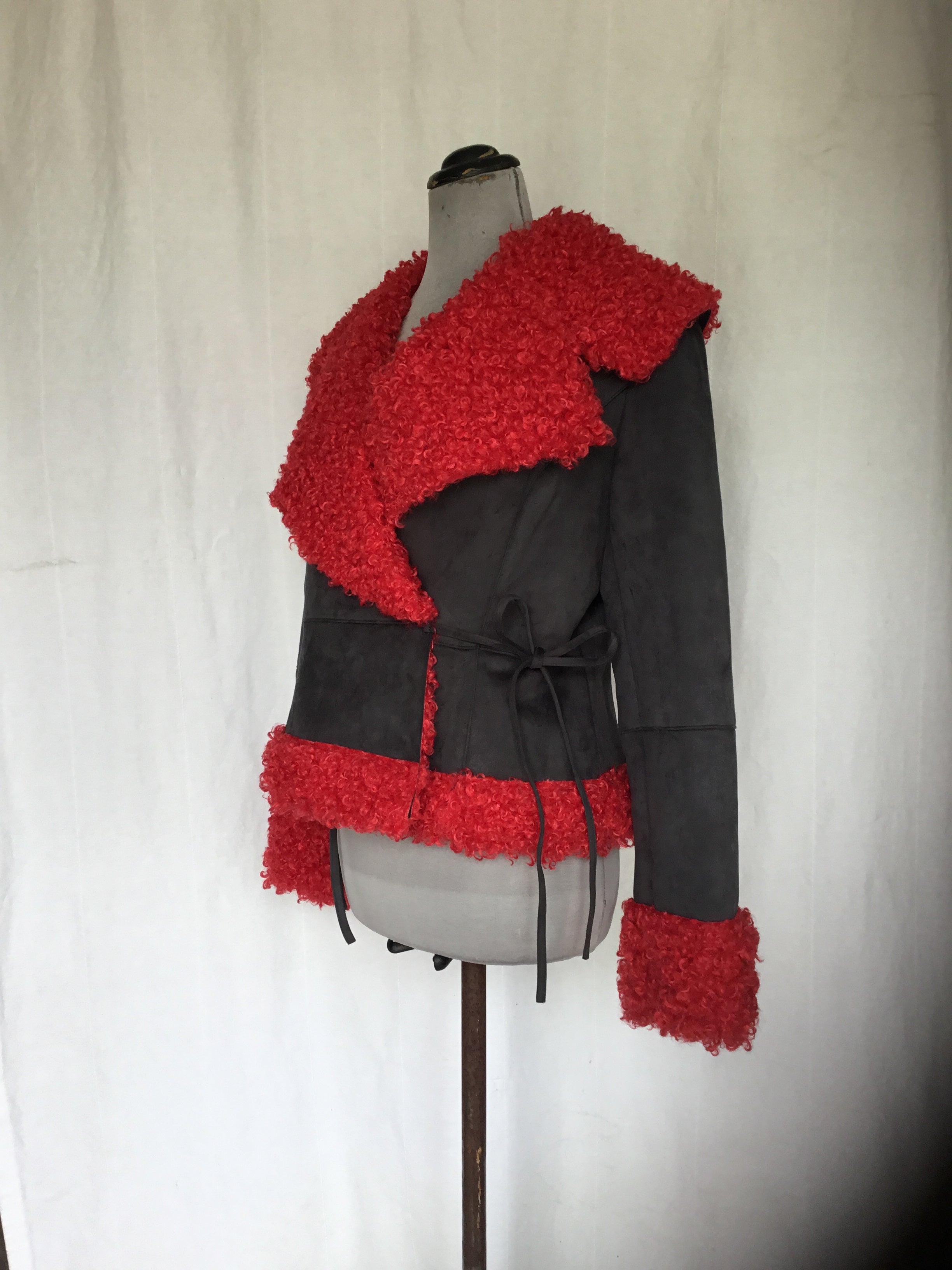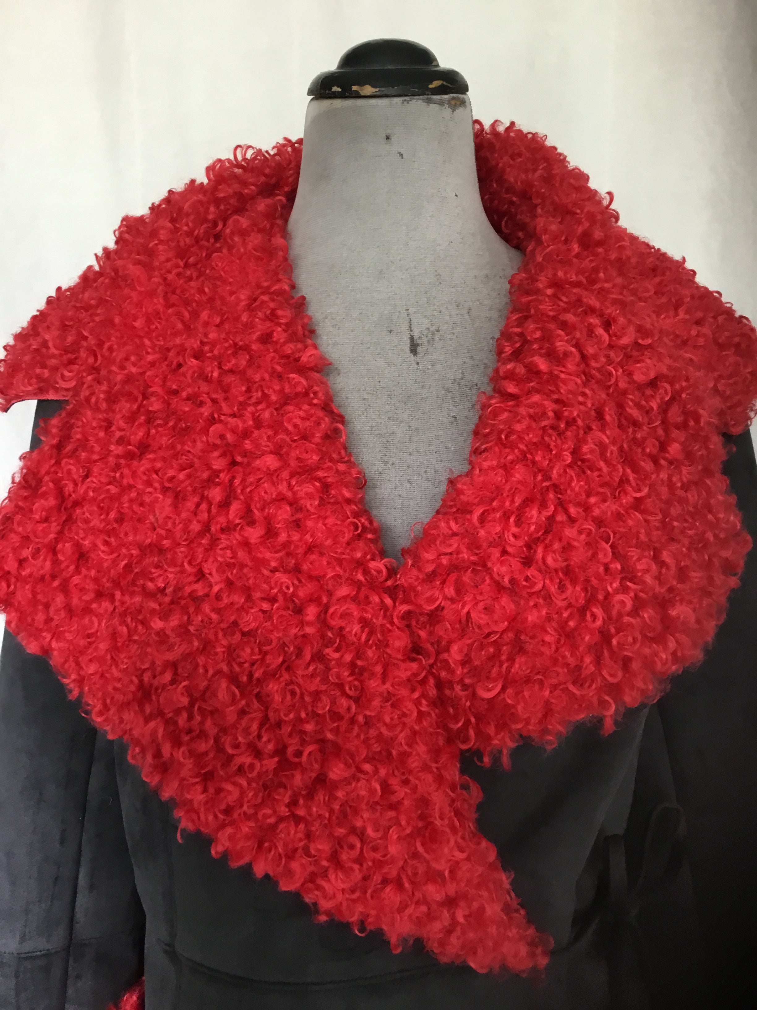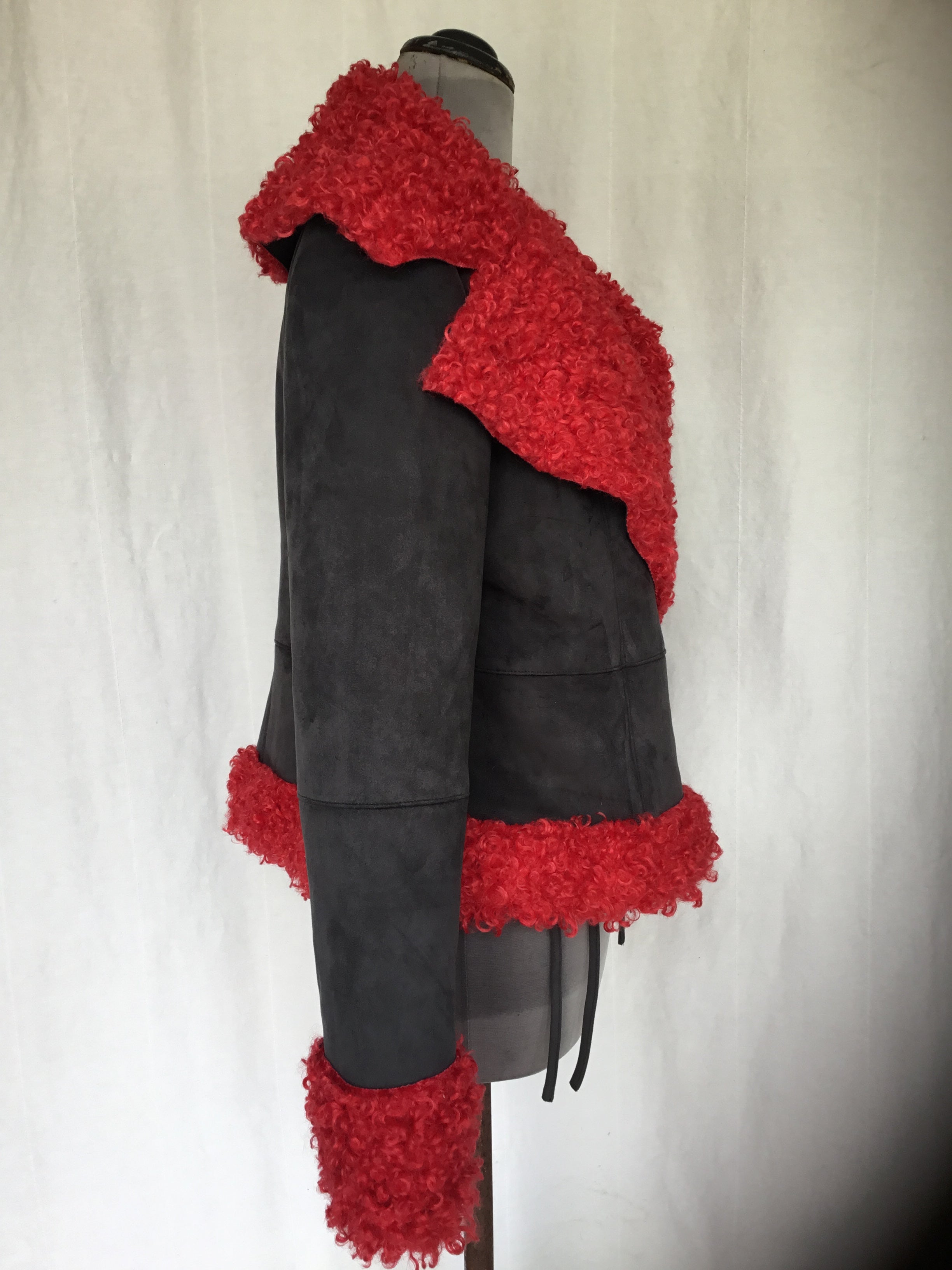 Color: Charcoal black body with fiery red curly faux shearling trim