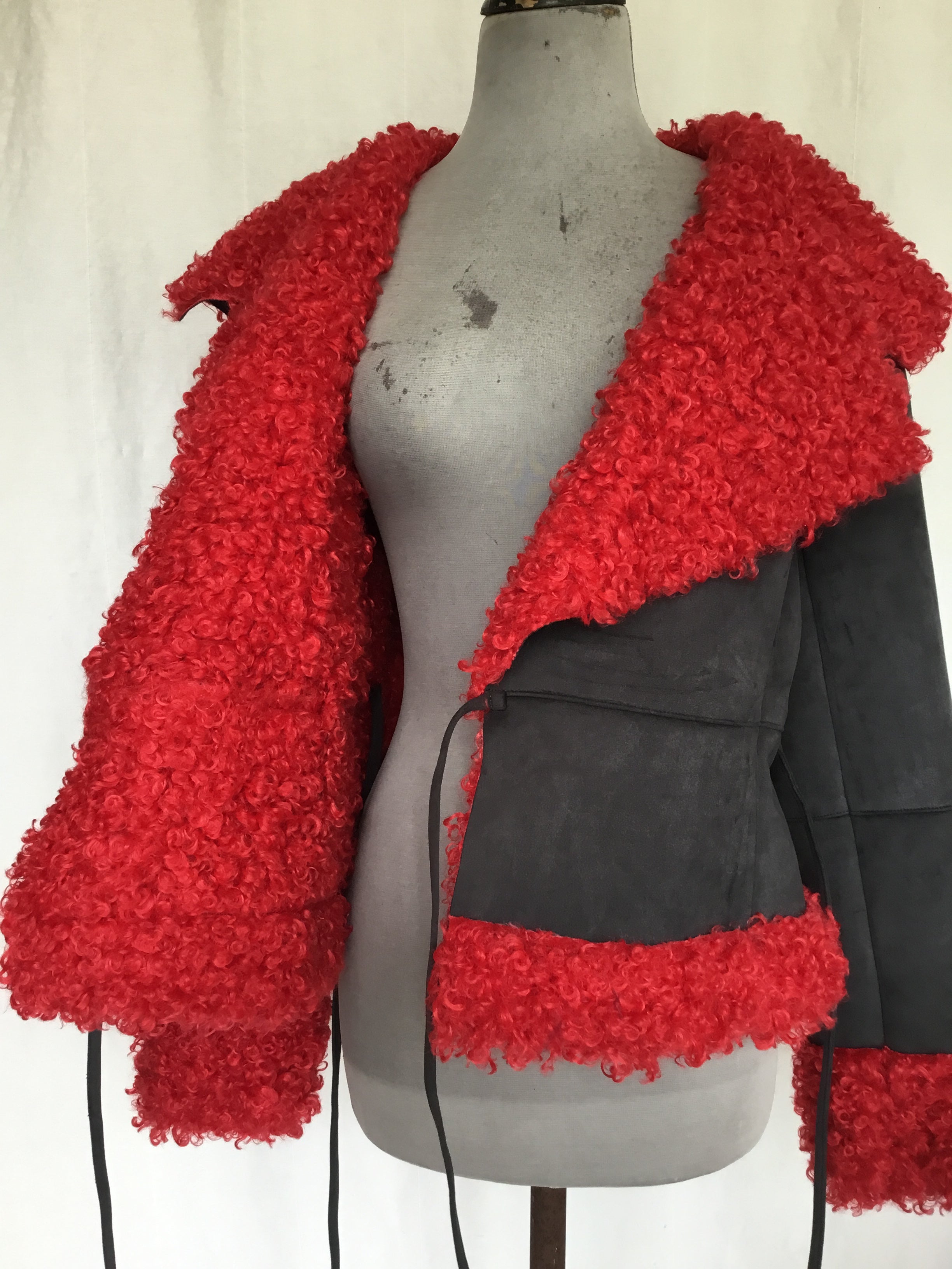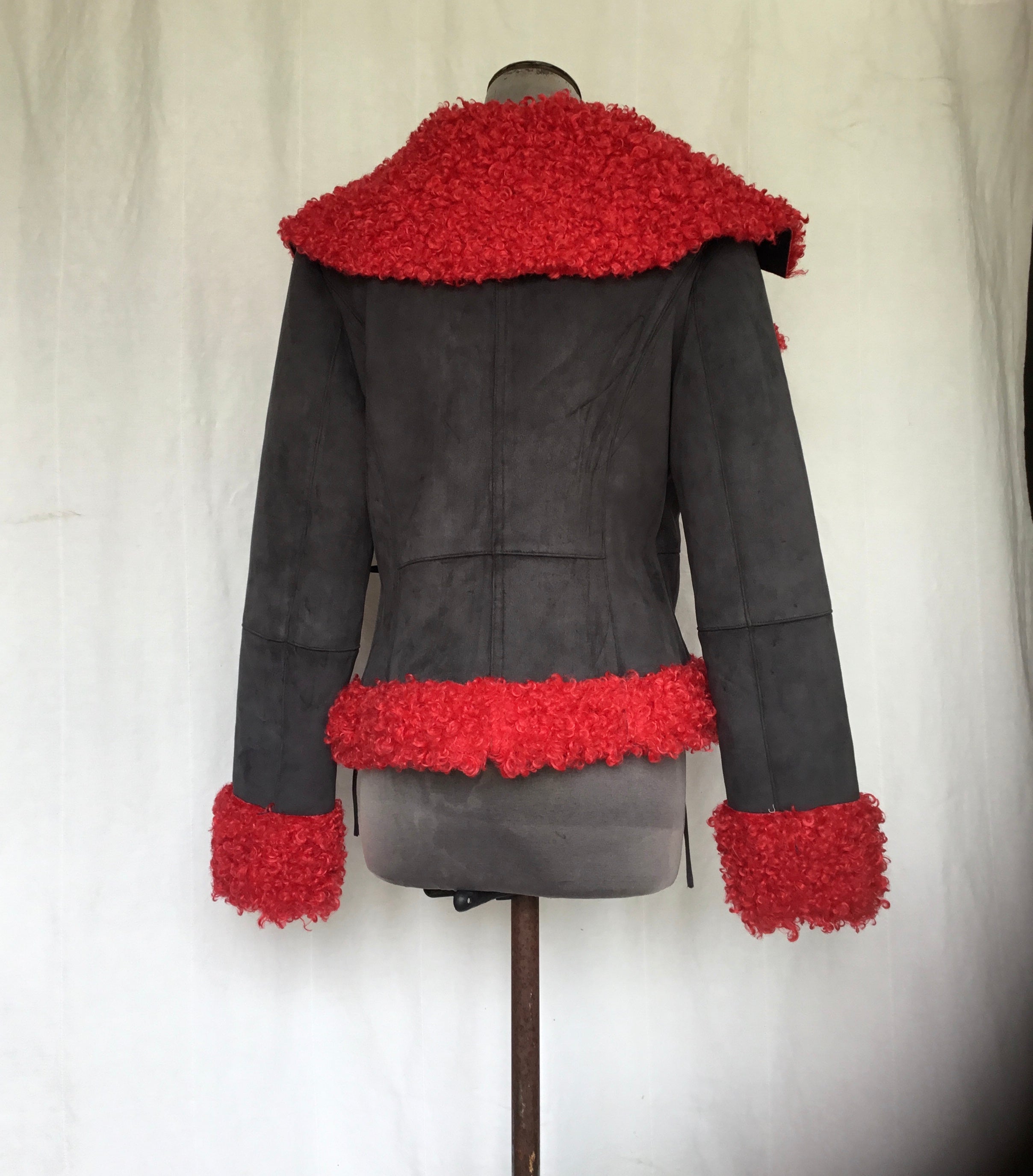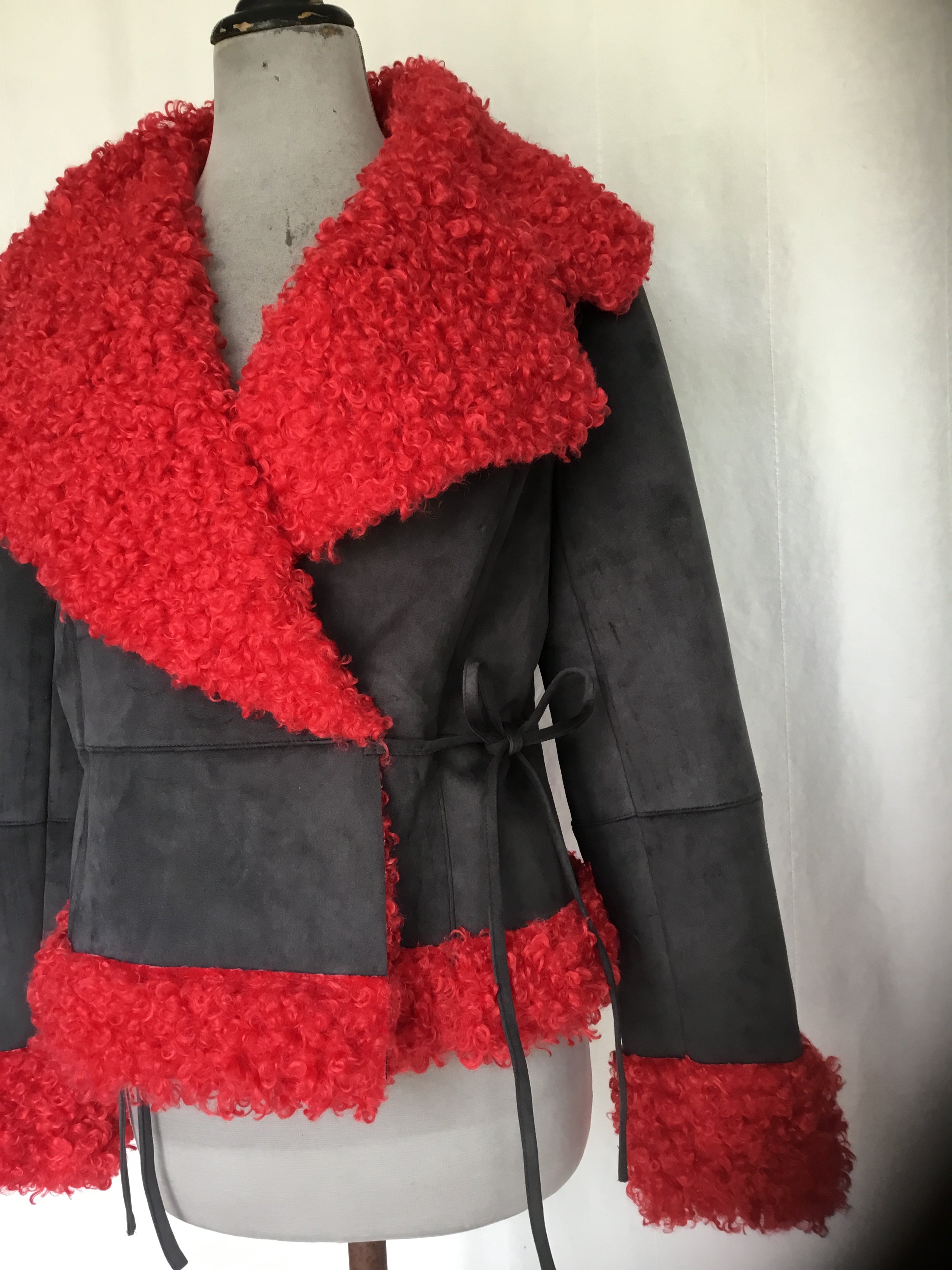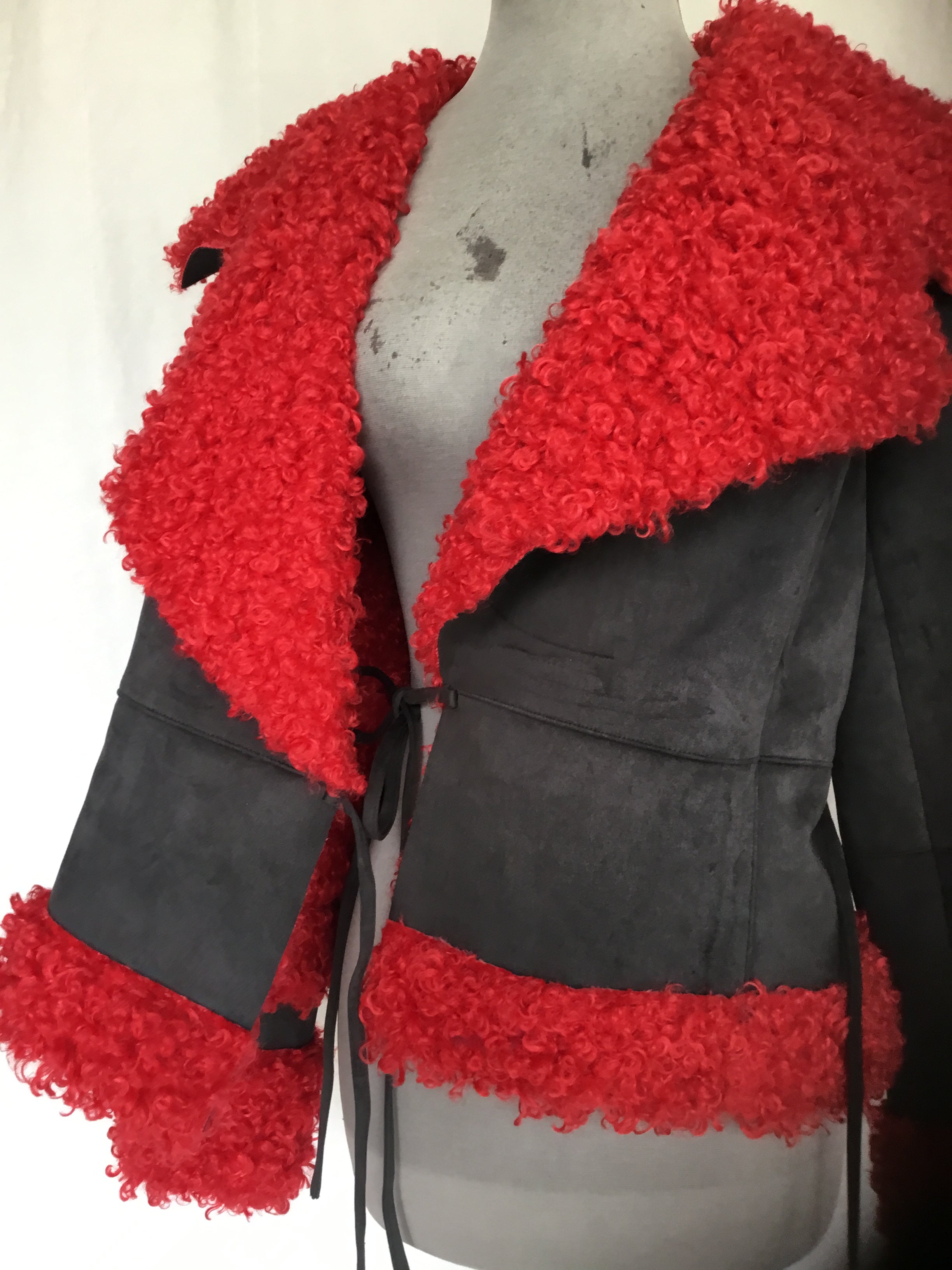 Color: Charcoal black body with fiery red curly faux shearling trim