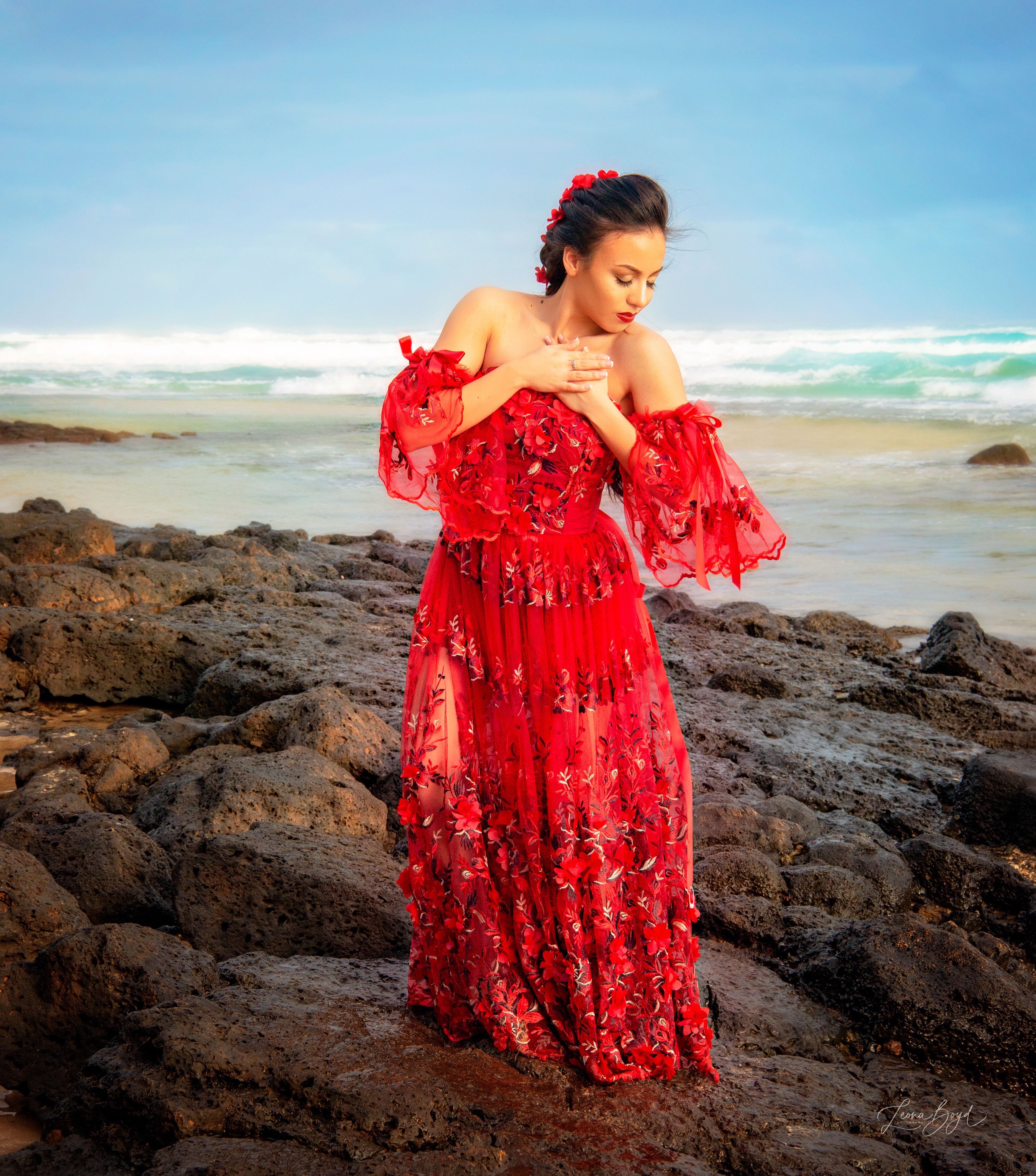 Red ball gown 3d lace sweet hart shape corset top and corset back to adjust to your comfort full skirt. This dress is sure to make a statement at your next special event. Featuring removable sleeves.