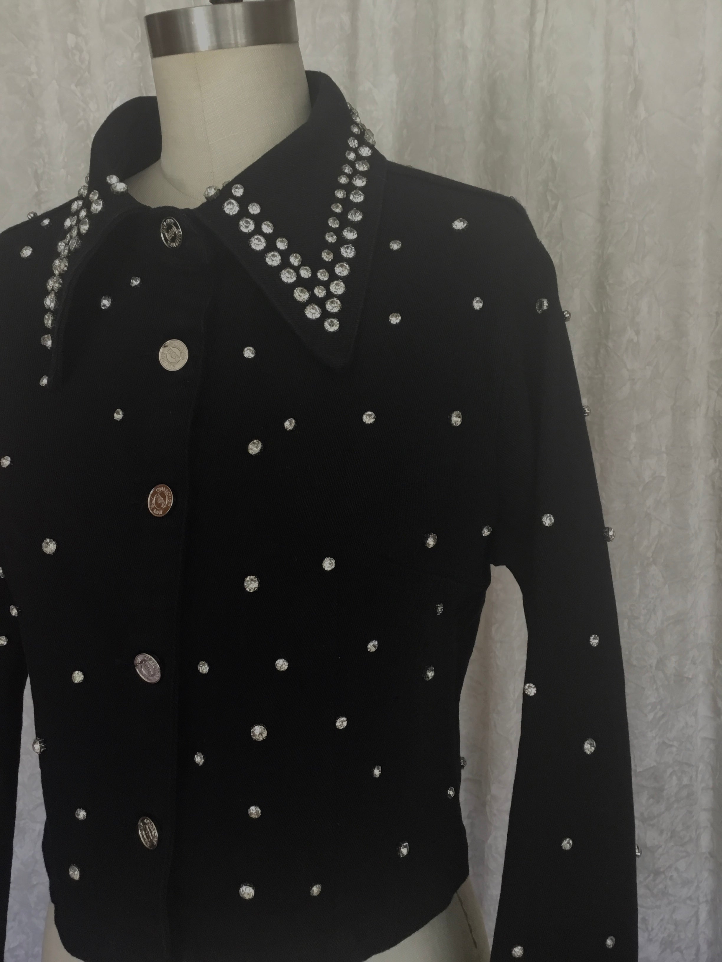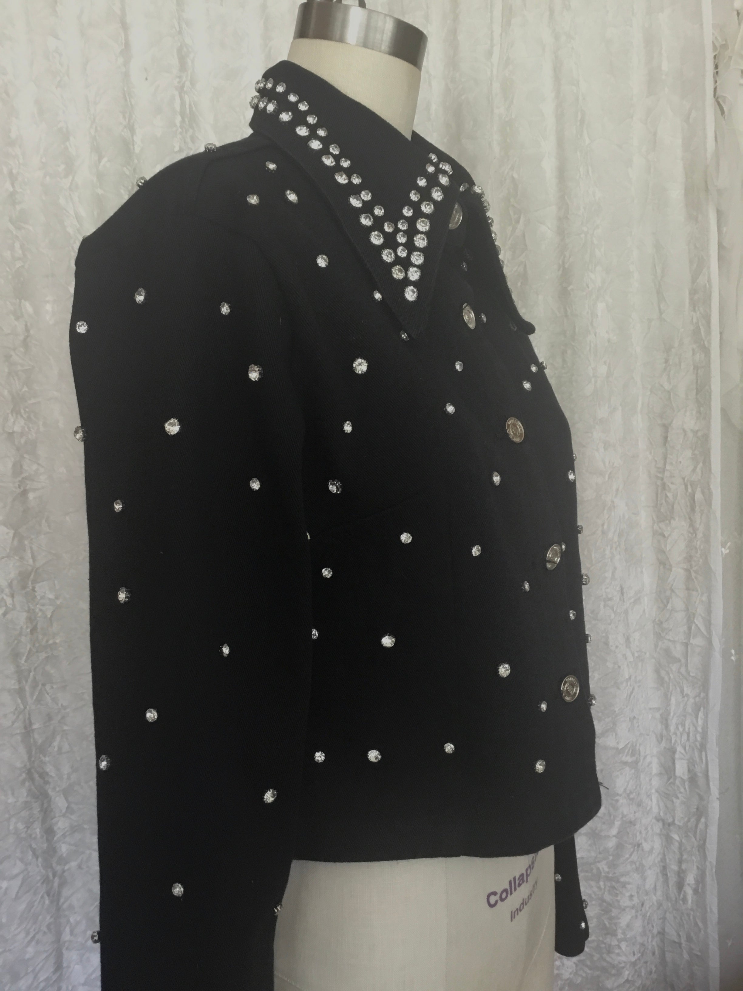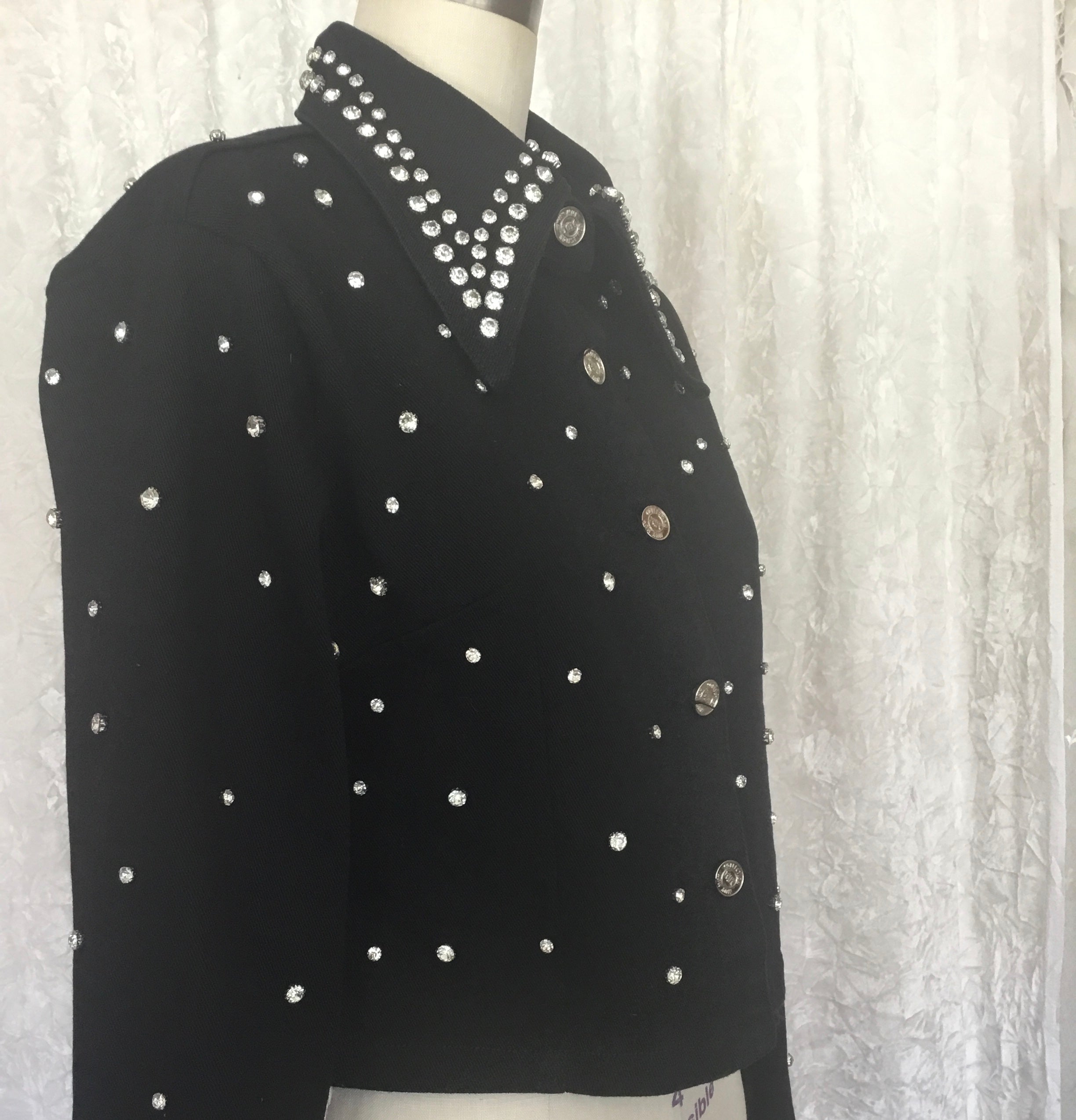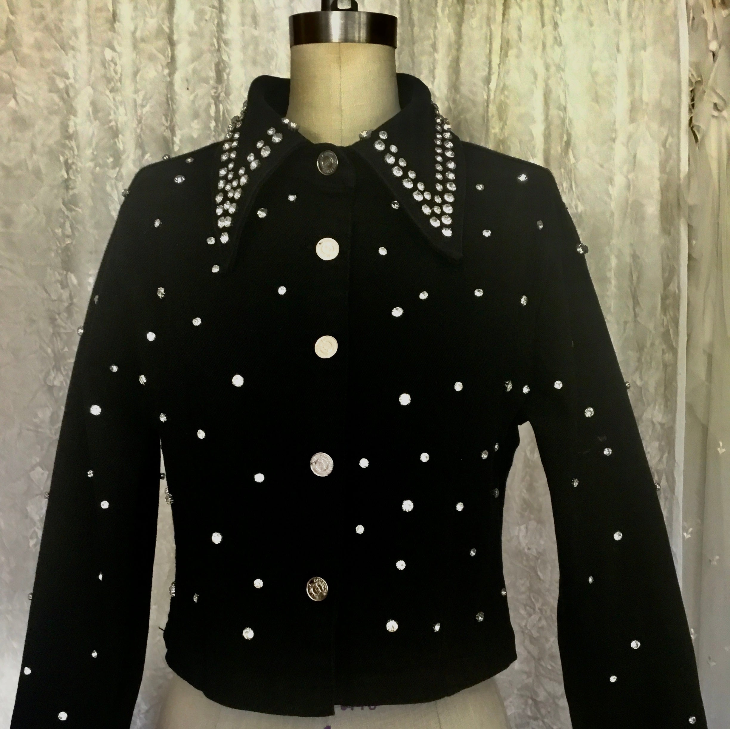 Rhinestone black denim jacket with studded rhinestones all over and beautiful heavier rhinestones details on collar.