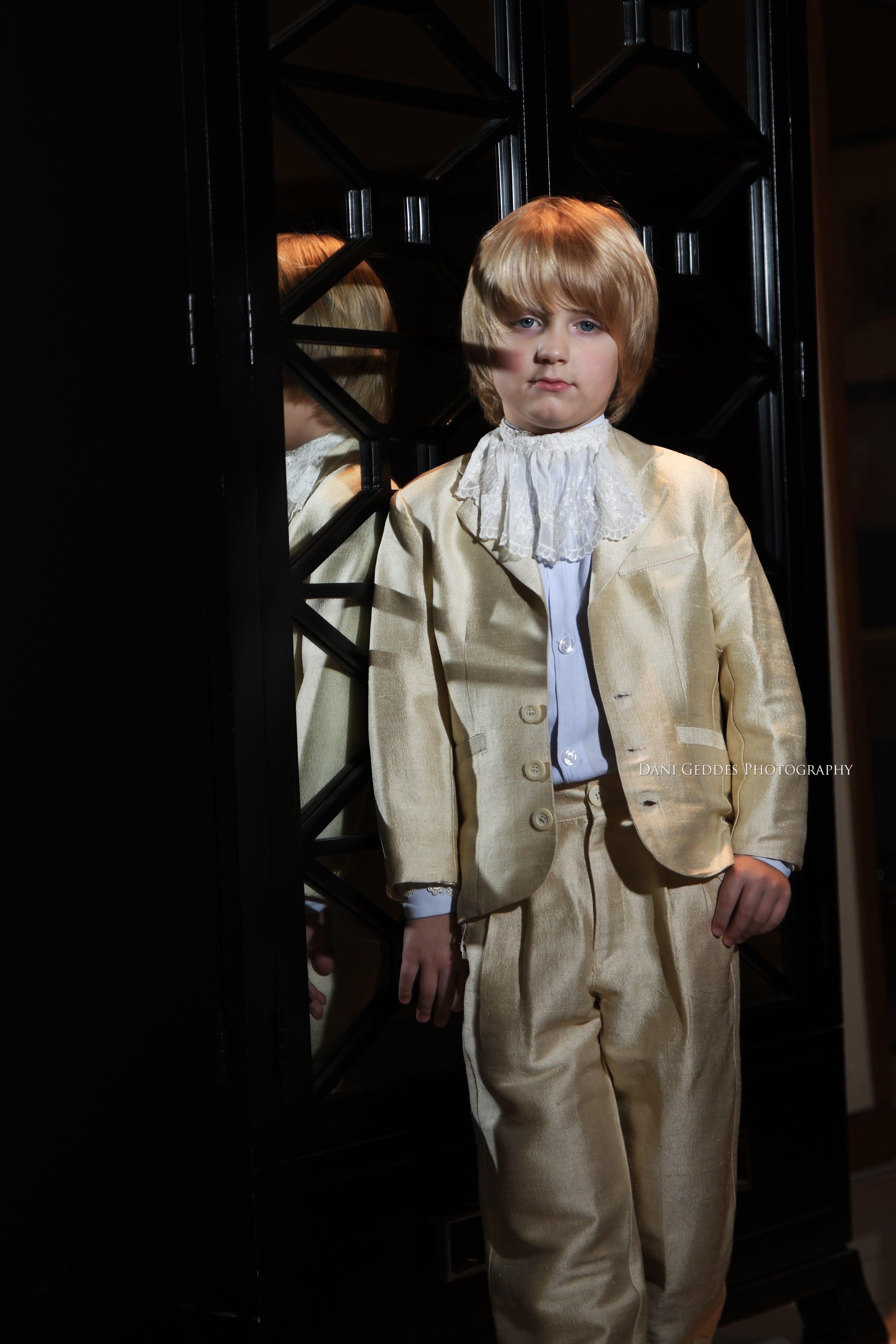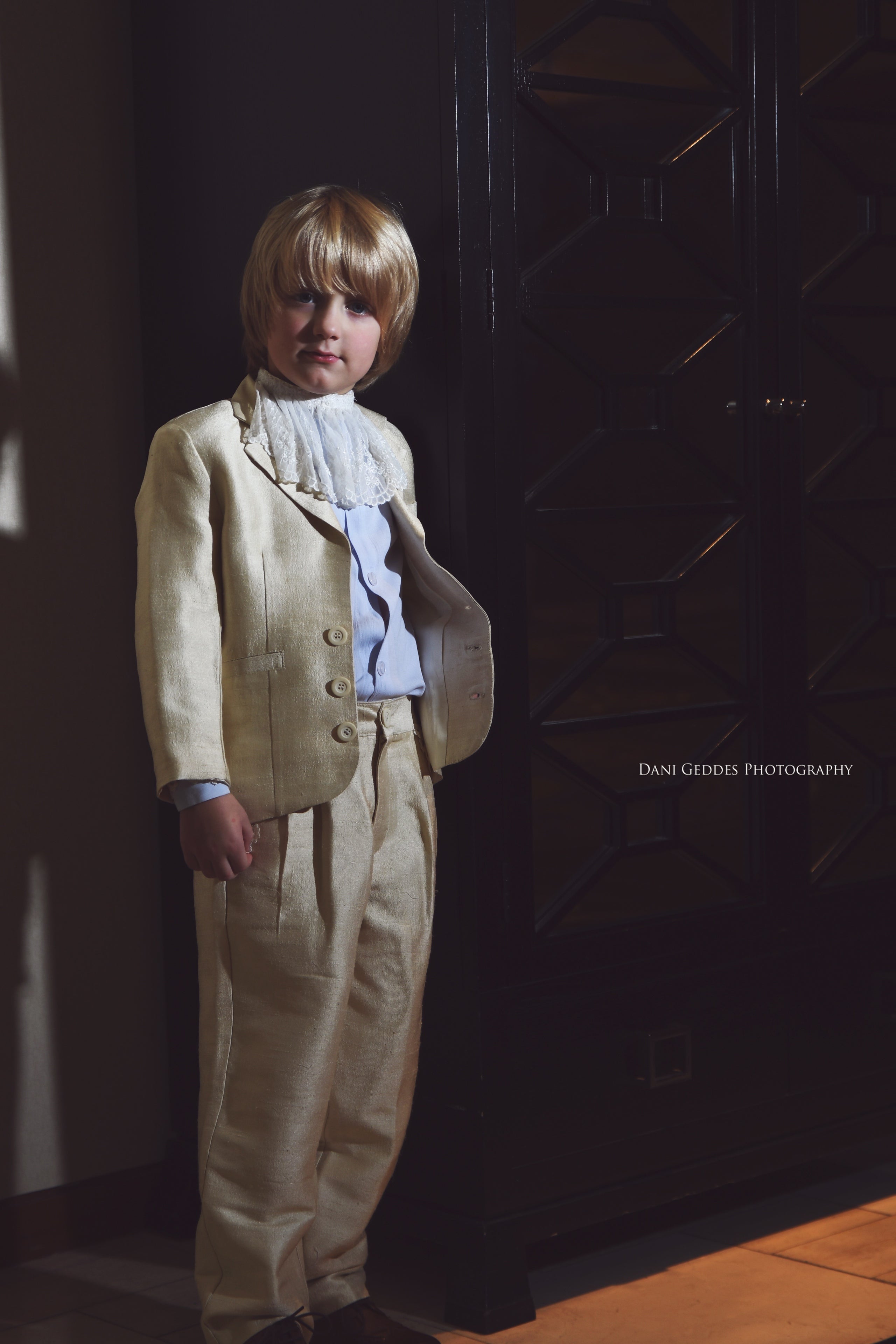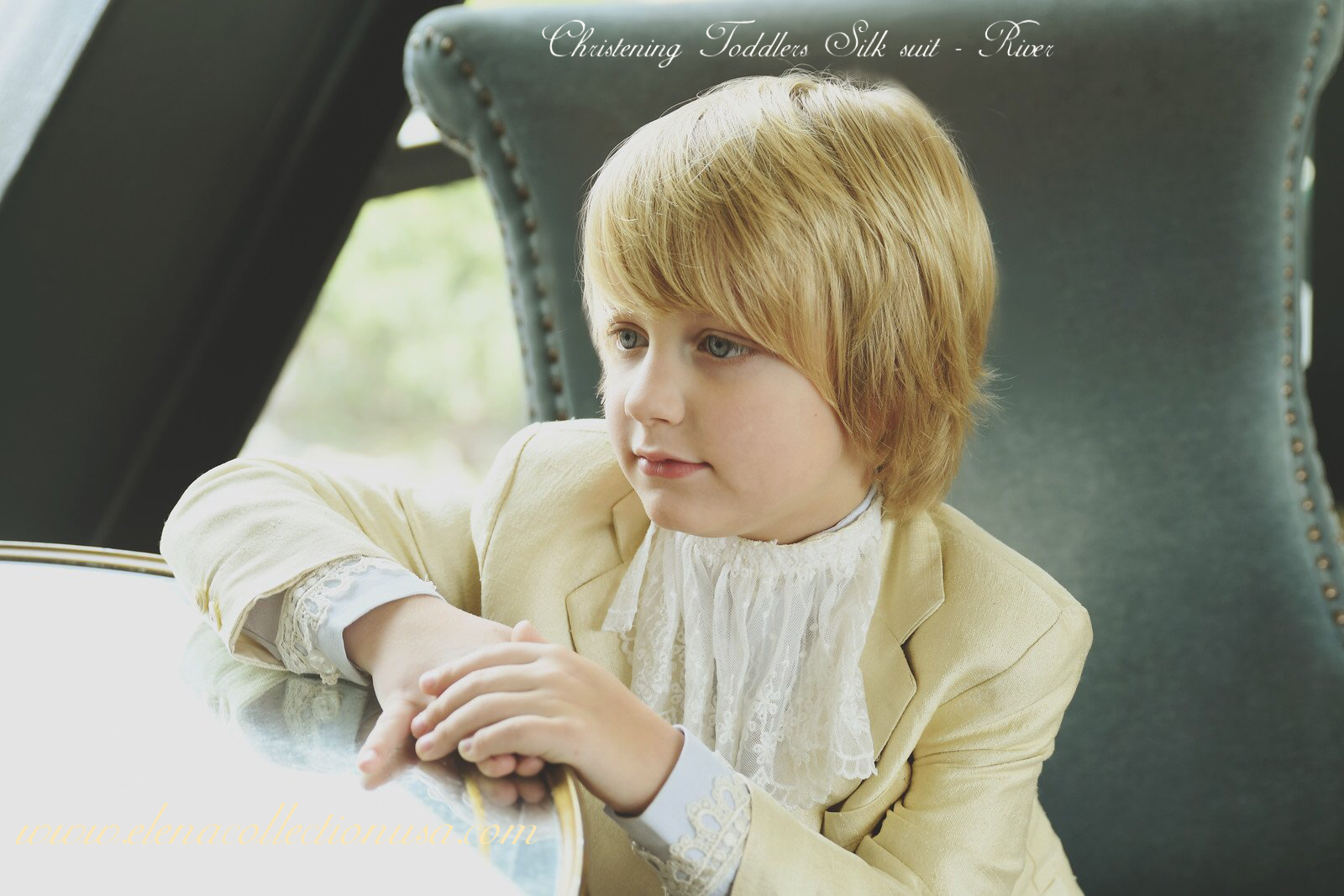 Ring Baerer boy suit made of a beautiful raw silk tan color with a shirt adorn with lace cuffs and a matching ruffle lace tie for a stunning Victorian complete look that is suitable for ring bearers, baptisms and any special occasion.