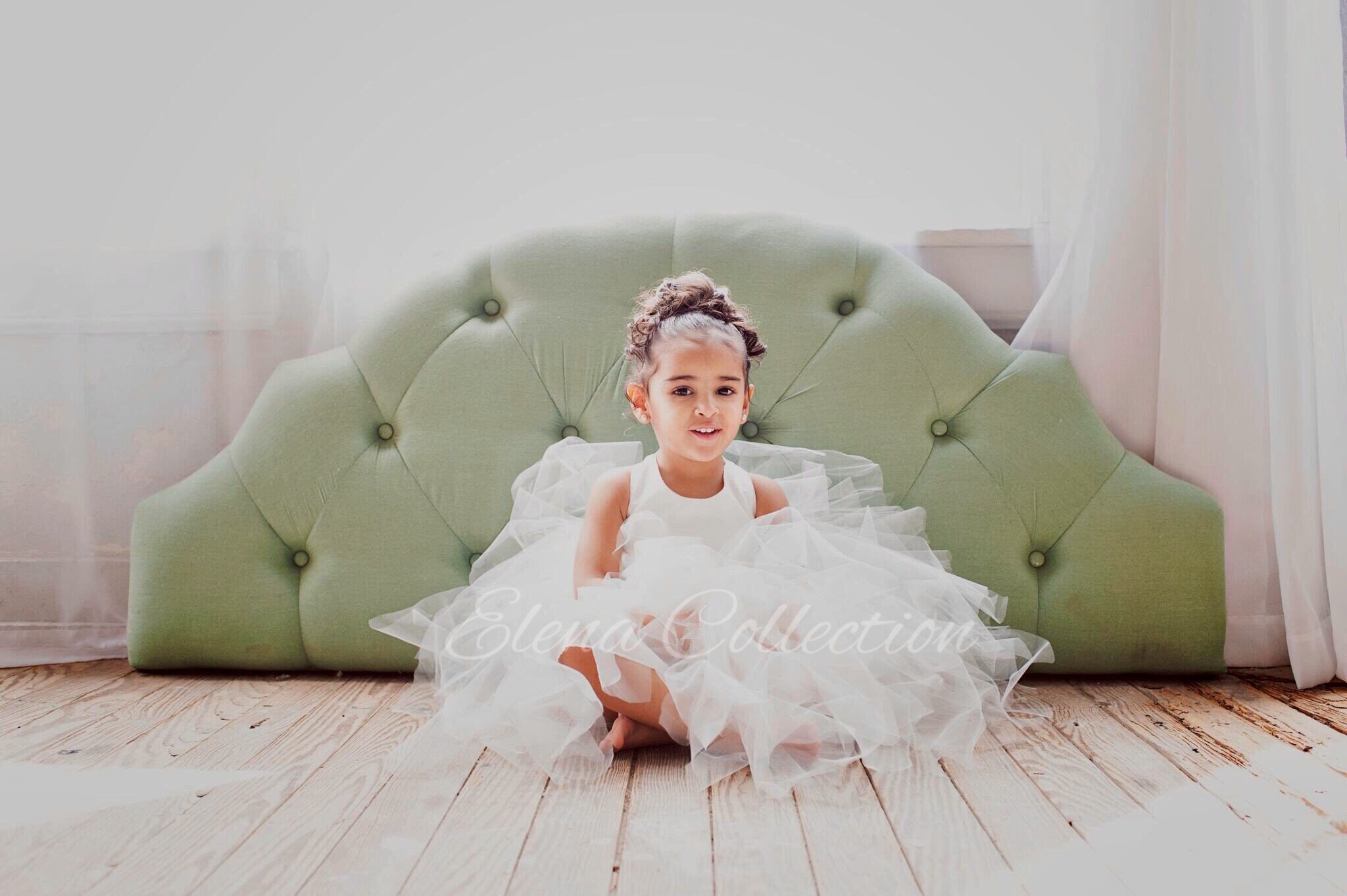 A Sweet open back tutu dress. With adjustable corset back you can adjust to your princess comfort. Feature a tain you can move to the side of the dress or the back for different looks!