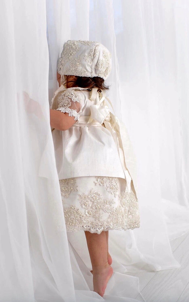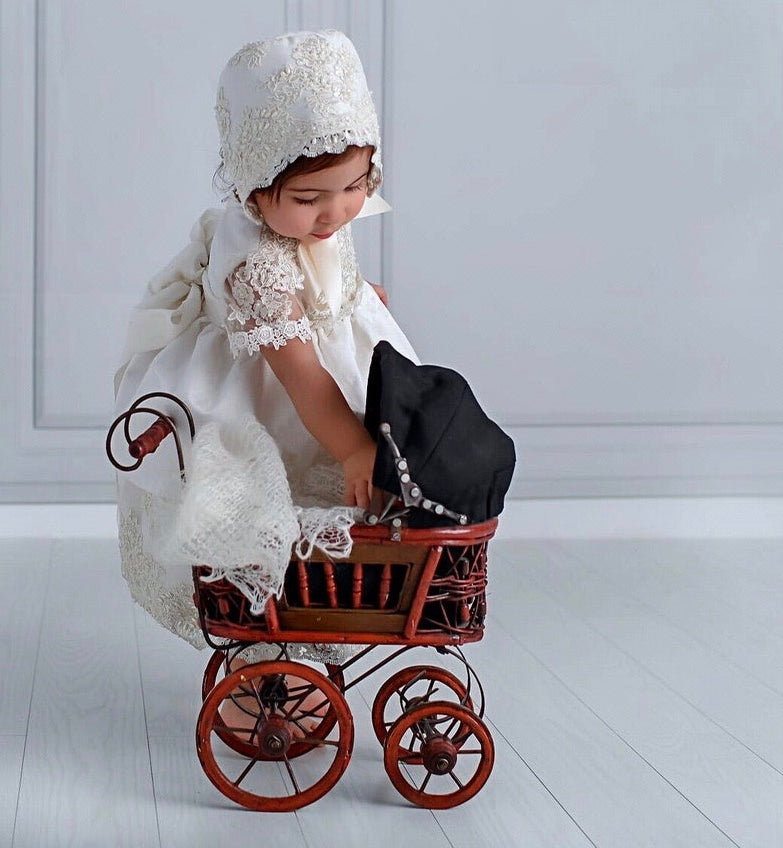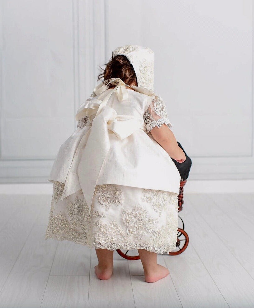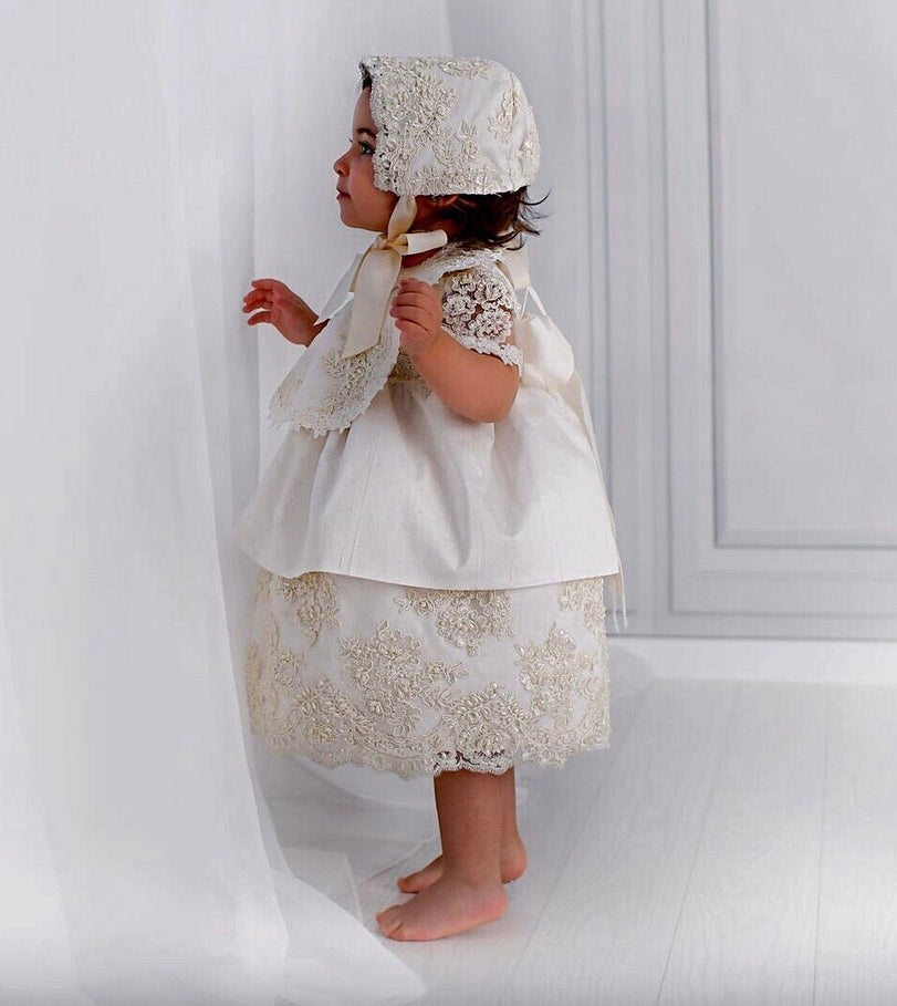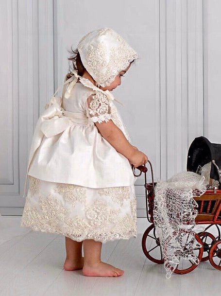 The Daisy Christening Dress is a luxurious handmade gown designed for your baby's special day. It features delicate hand-beaded lace, sheer short lace sleeves, and a smooth 100% cotton lining for comfort. The dress closes with a zipper at the back and includes a matching bonnet. Made to order in California and shipped worldwide, this heirloom piece ensures timeless elegance. Materials: - Lace - Tulle - Piping - Fusing - Cotton