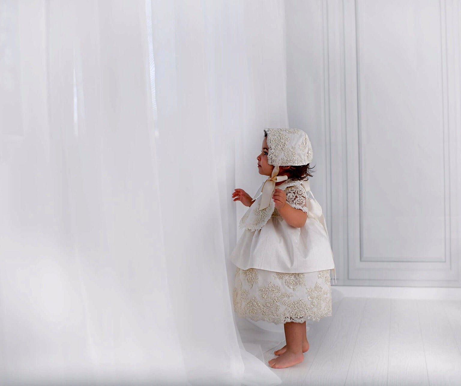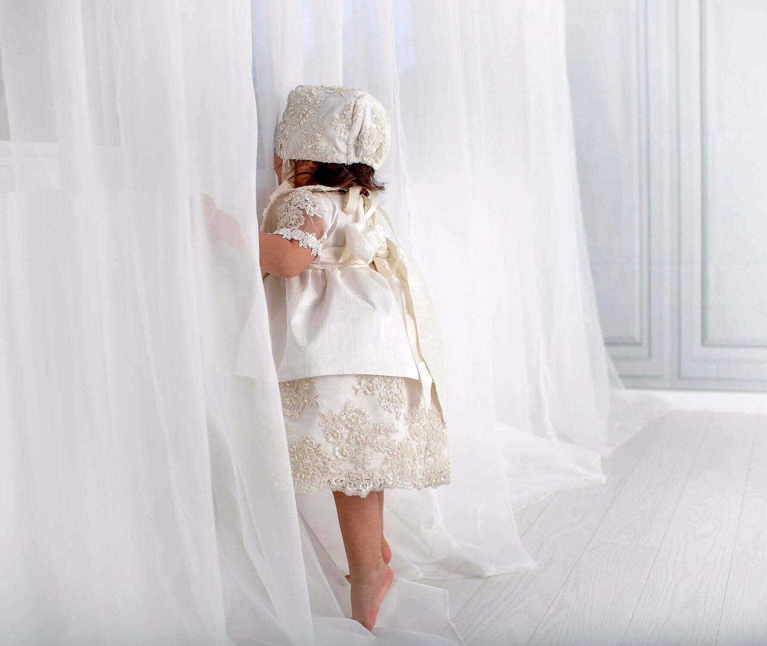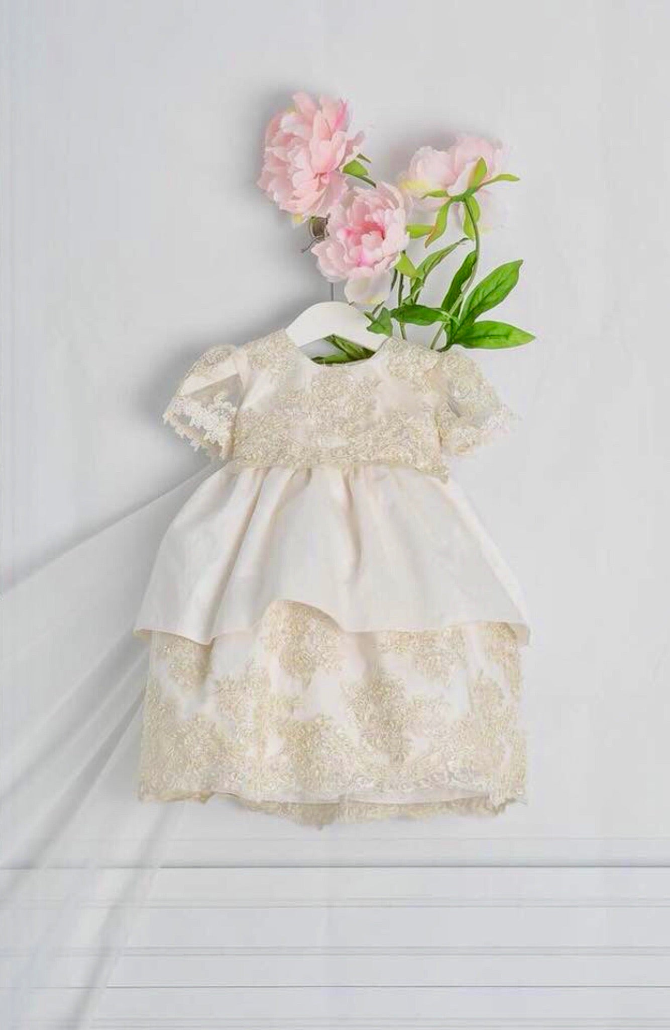 The Daisy Christening Dress is a luxurious handmade gown designed for your baby's special day. It features delicate hand-beaded lace, sheer short lace sleeves, and a smooth 100% cotton lining for comfort. The dress closes with a zipper at the back and includes a matching bonnet. Made to order in California and shipped worldwide, this heirloom piece ensures timeless elegance. Materials: - Lace - Tulle - Piping - Fusing - Cotton