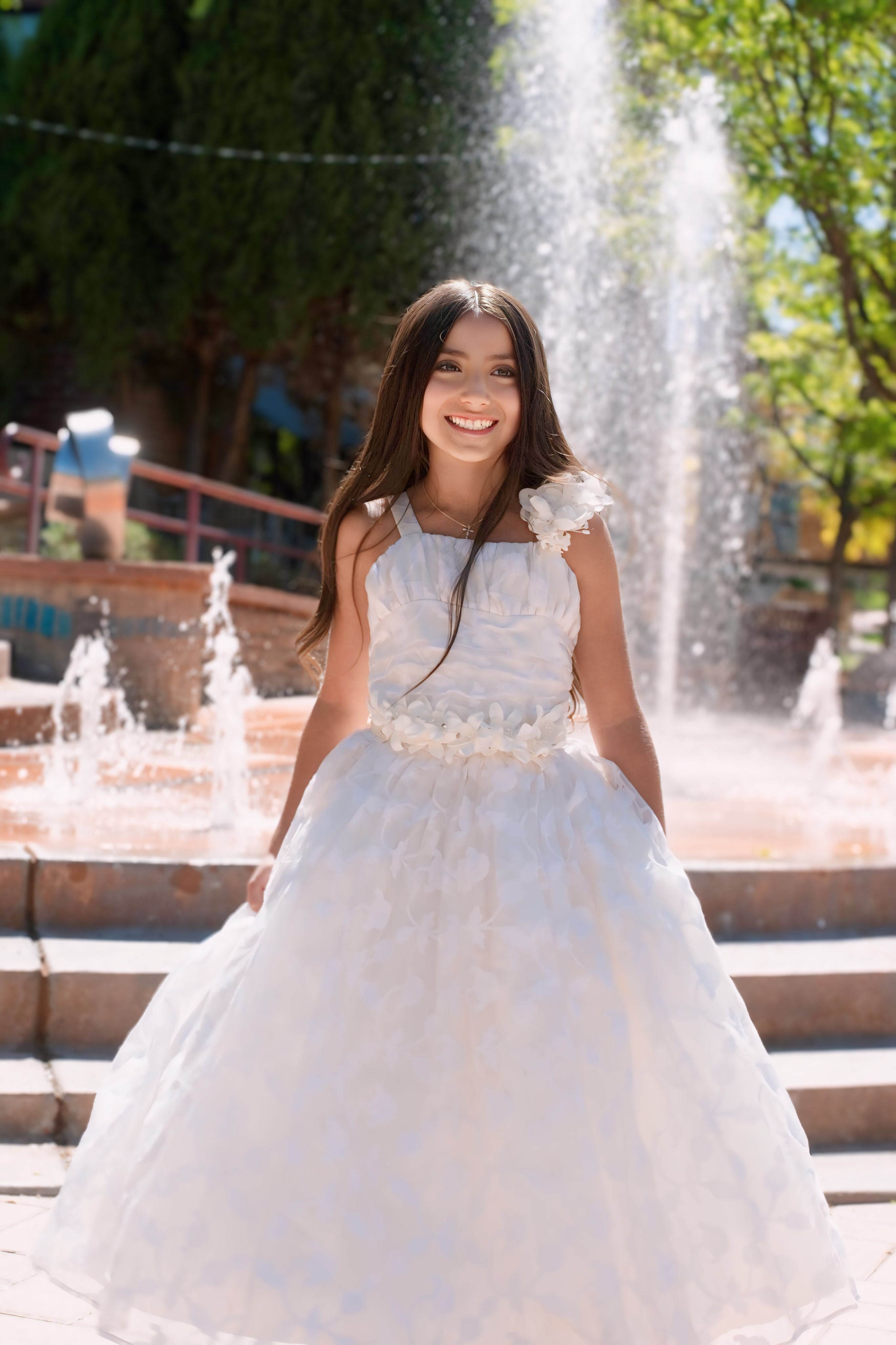 Silk embroidery damask organza communion or flower girl dress with 3D floral accent on the shoulder and floral Belt (sells separately) on waist to coordinate.