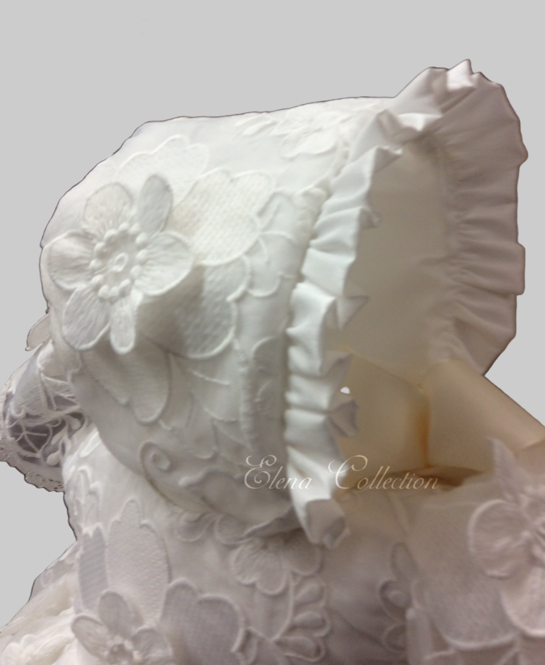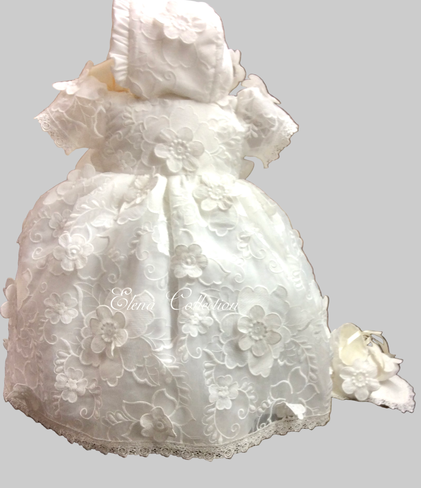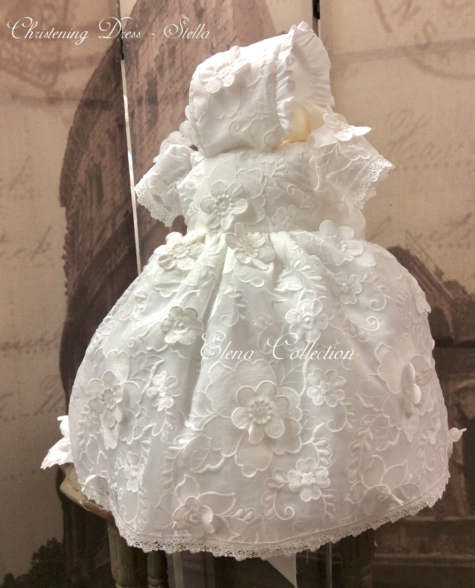 The Stella christening dress, crafted with exquisite 3D flower motifs, is perfect for baptism and special occasions. Handmade with care, it features floral details on the sleeves and bodice for a refined look. Fabrics include: - Beautiful fabric with 3D flower motifs - Carefully cut sleeves highlighting the floral design Pair it with matching accessories like shoes, bib, blanket, or headband. This luxurious, made-to-order gown is designed to be treasured for generations.