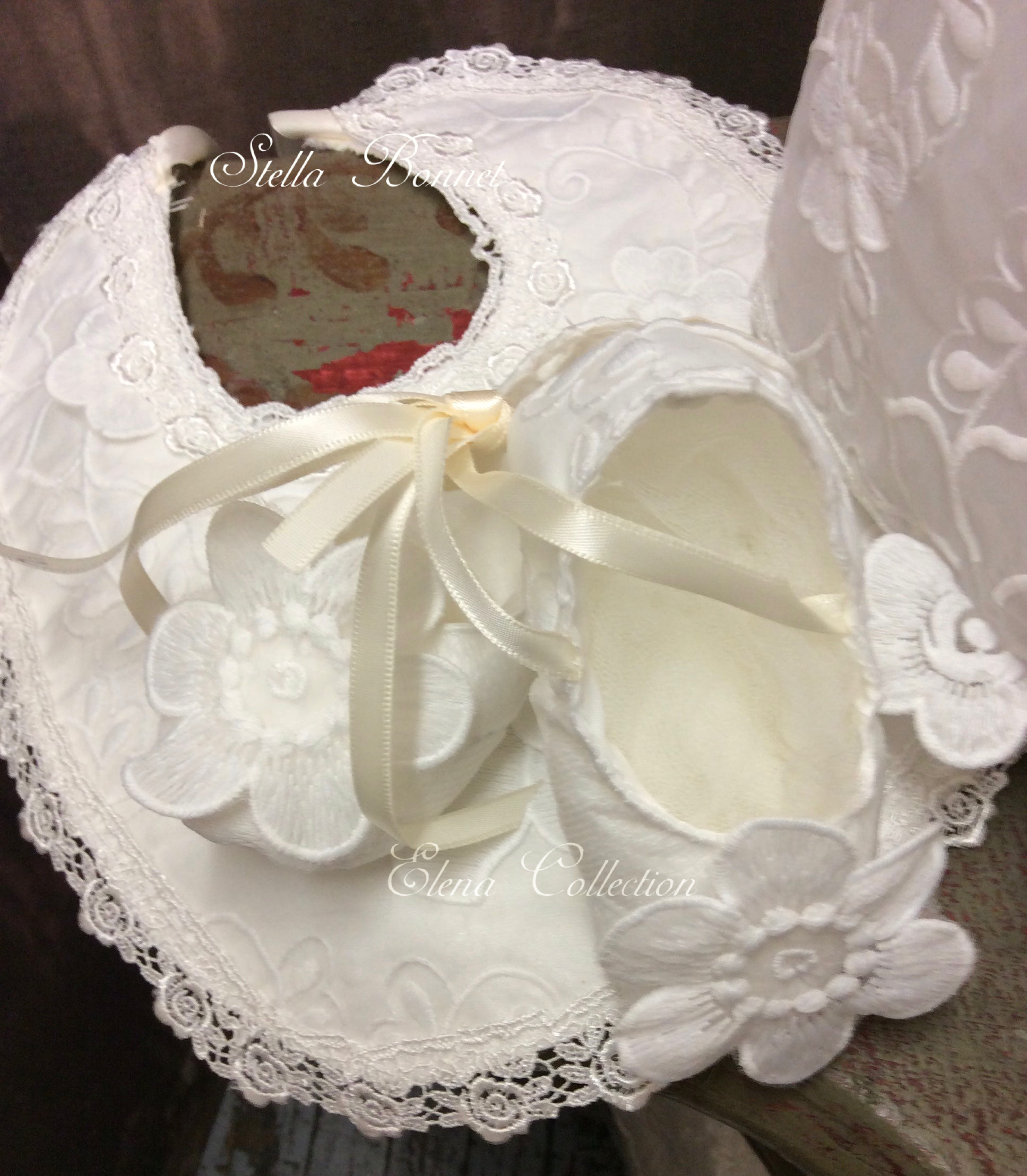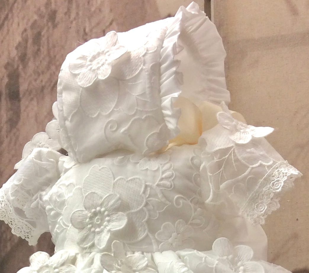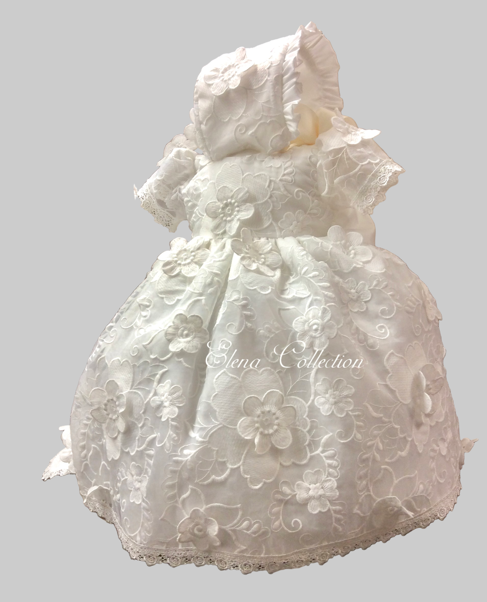 The Stella christening dress, crafted with exquisite 3D flower motifs, is perfect for baptism and special occasions. Handmade with care, it features floral details on the sleeves and bodice for a refined look. Fabrics include: - Beautiful fabric with 3D flower motifs - Carefully cut sleeves highlighting the floral design Pair it with matching accessories like shoes, bib, blanket, or headband. This luxurious, made-to-order gown is designed to be treasured for generations.