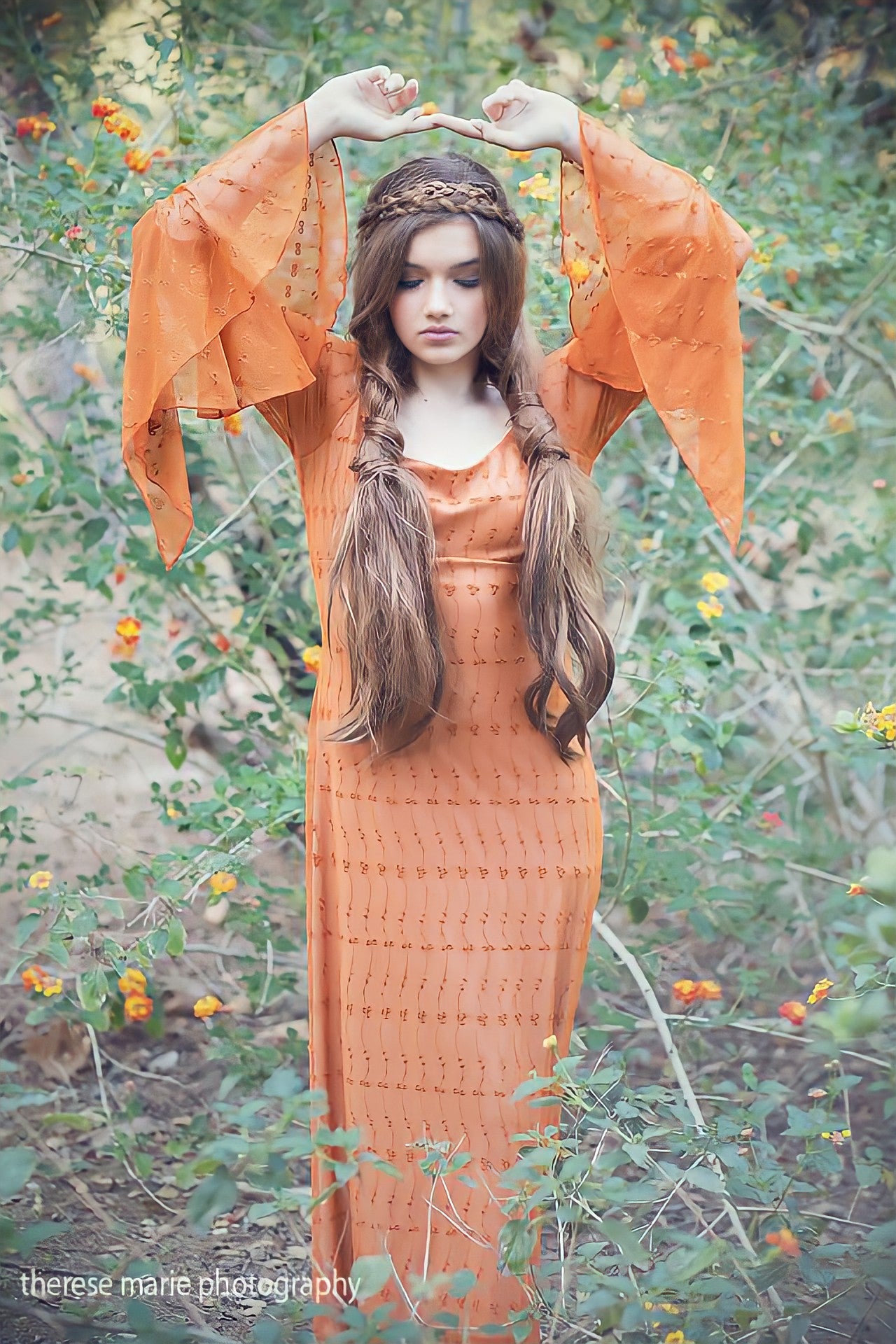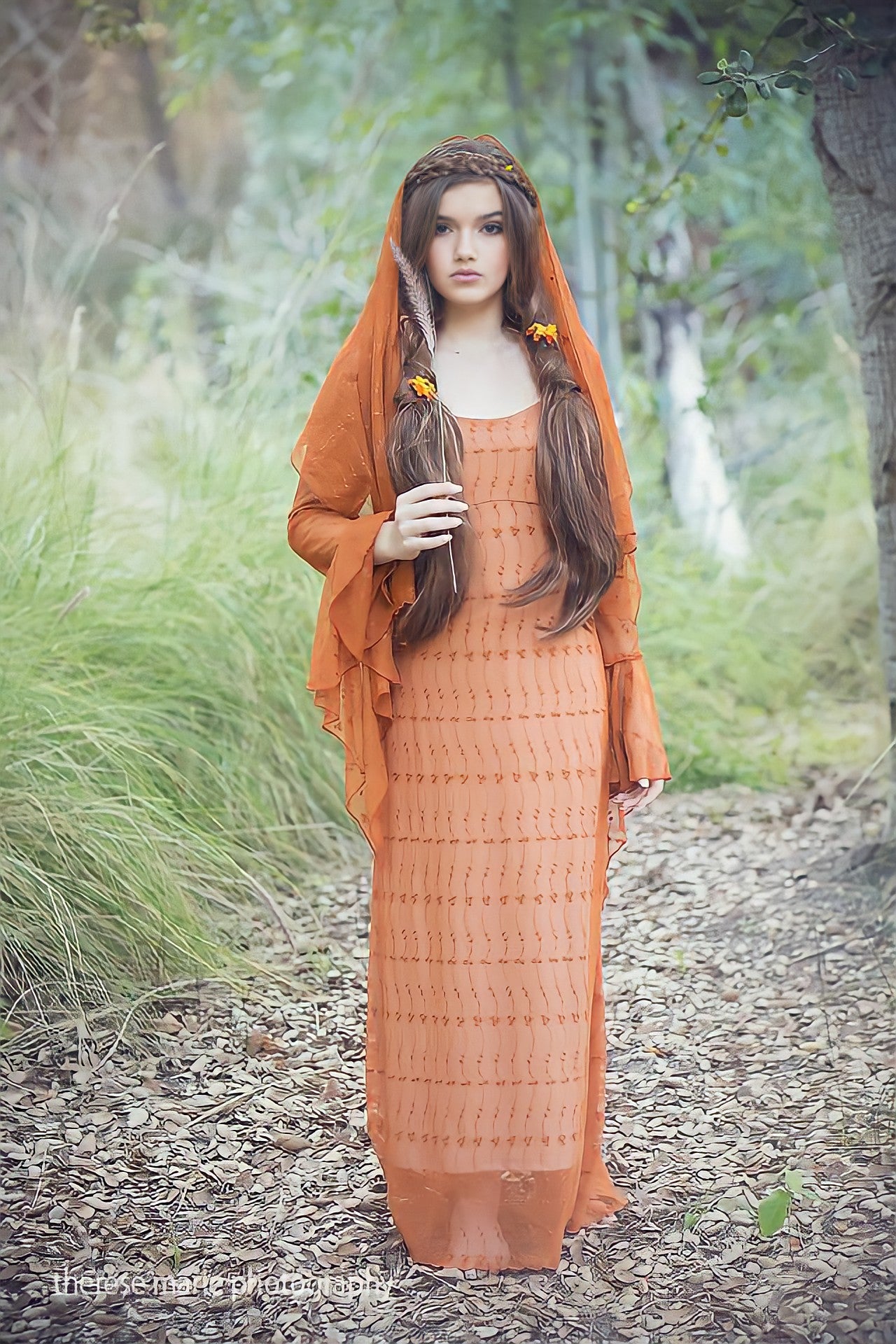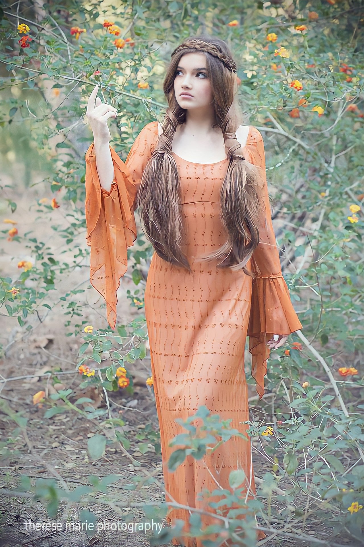 Bridesmaid Burnt Orange color empire waist maxi dress featuring sheer bell sleeves and scollop hem.